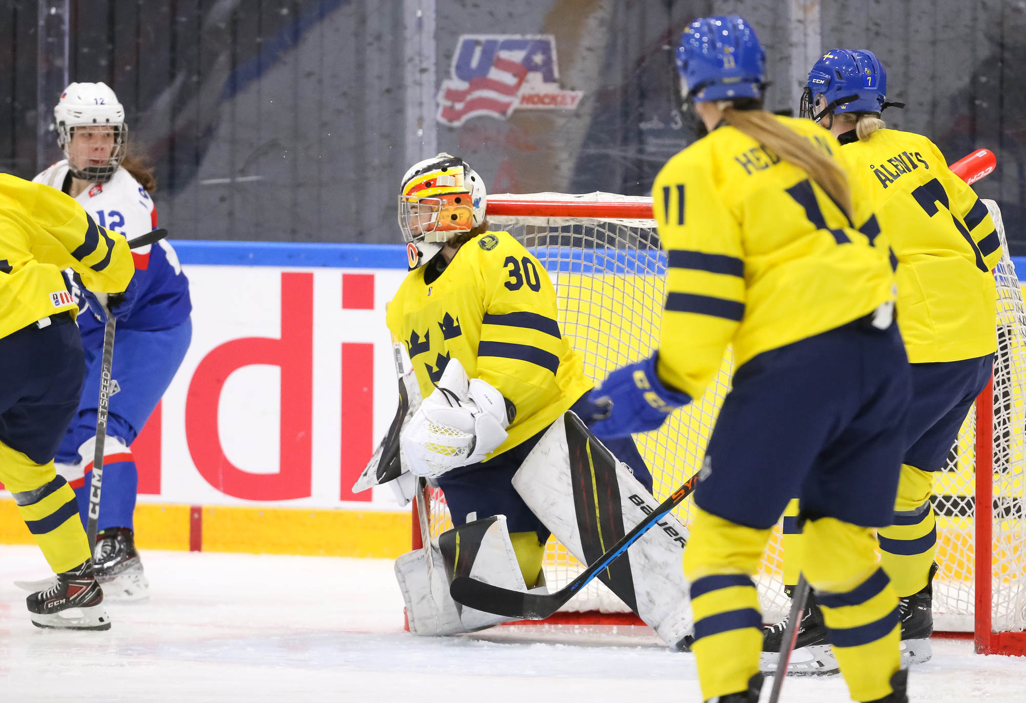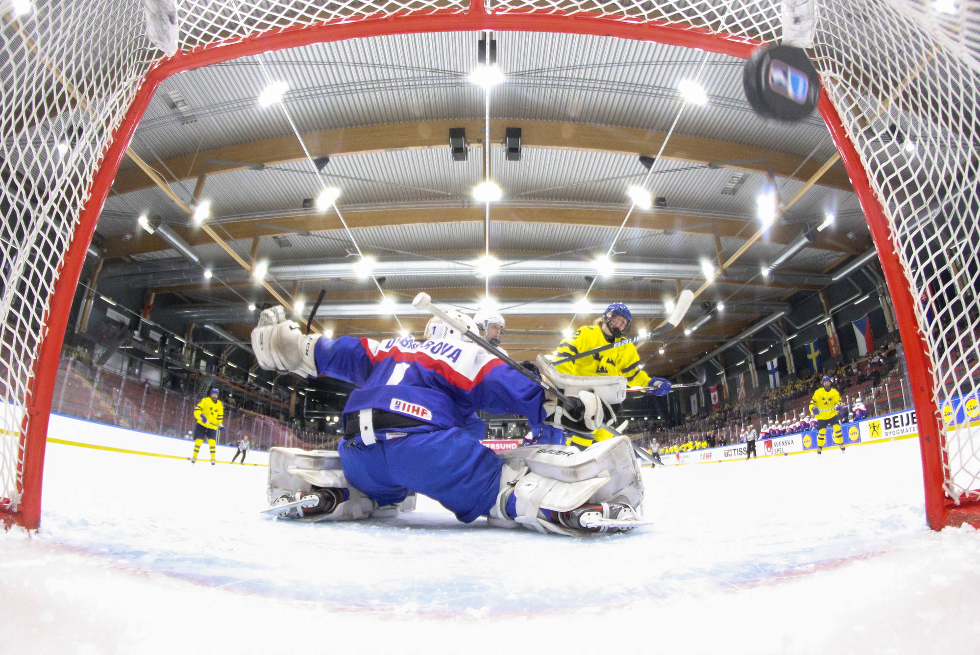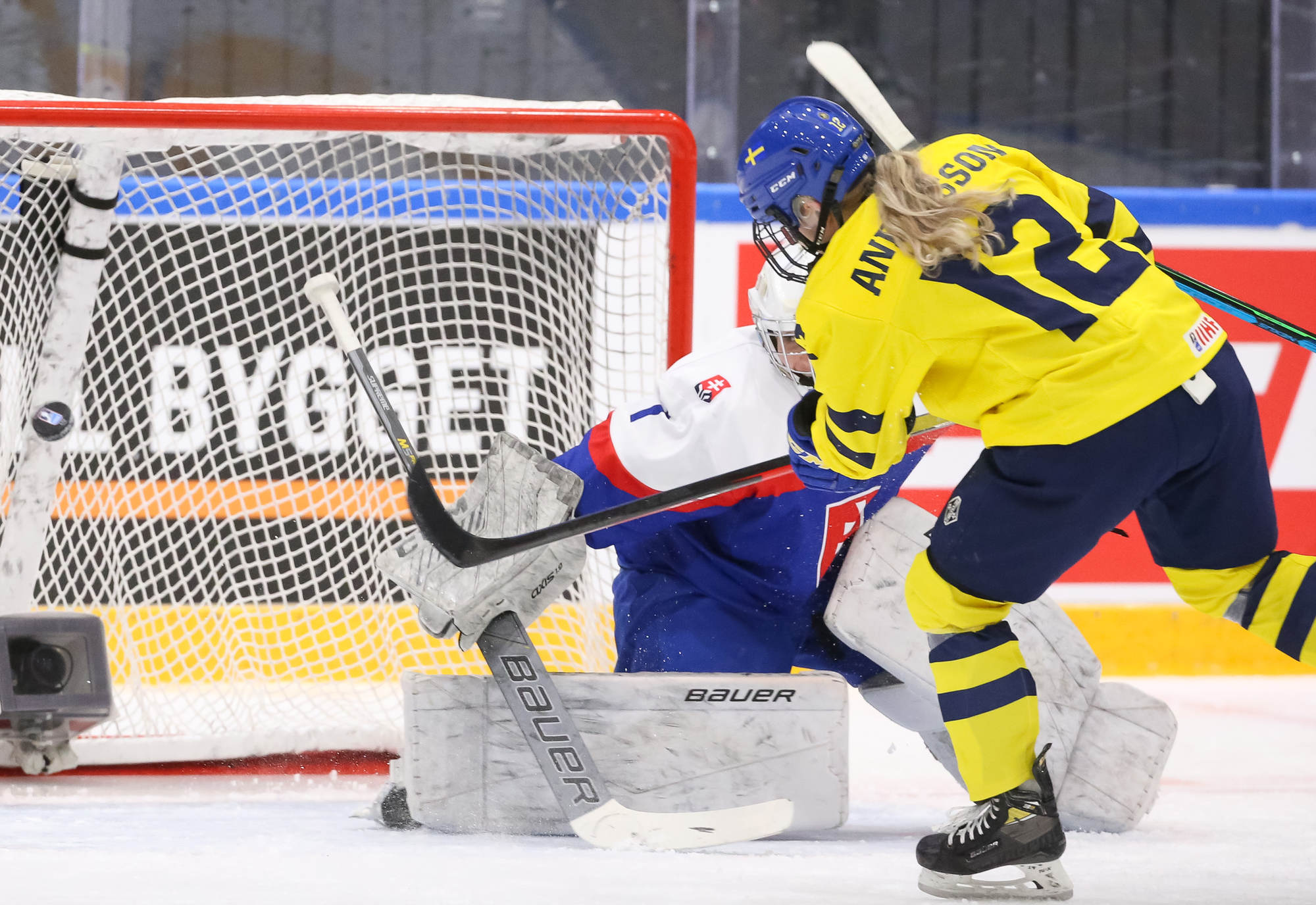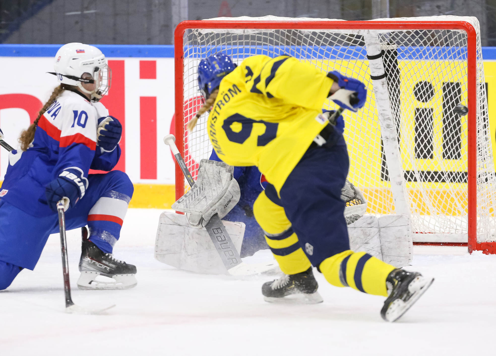 Sweden's leading scorer, Hilda Svensson, also got on the scoresheet halfway through the period when she connected with Mia Markstrom who flipped the puck to her from behind the bet. Svensson patiently waited out Debnarova and backhanded the puck into the net for 6-1 at 7.50.