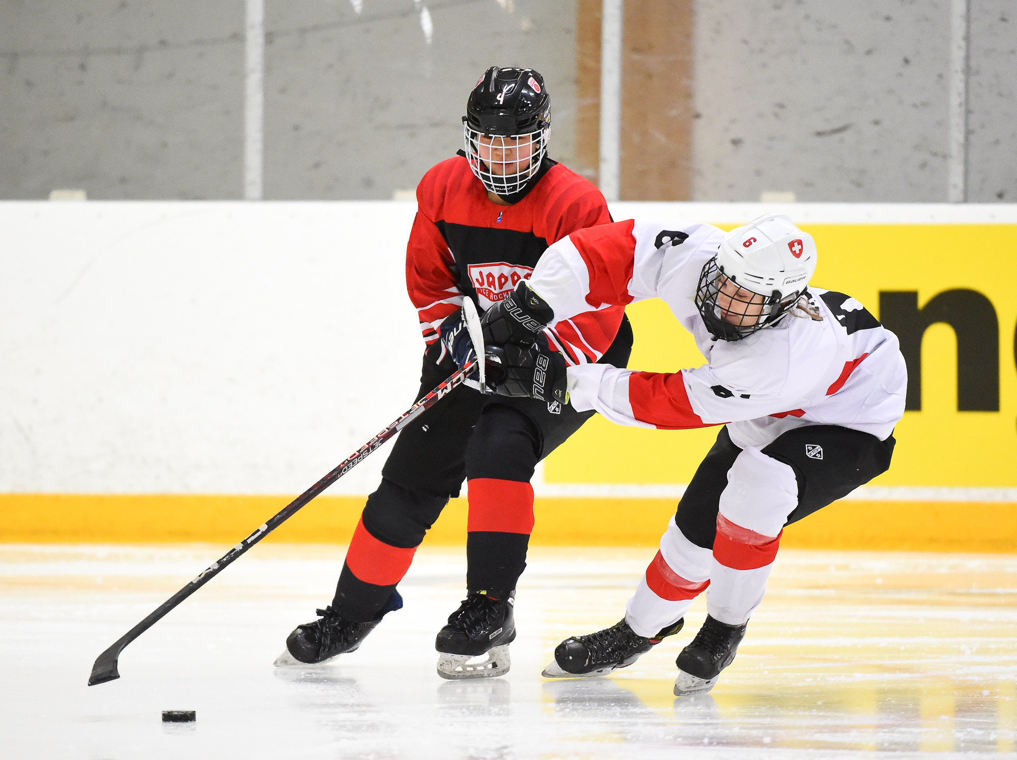 Japan dominated first-period play with relentless speed to the point where Switzerland's players could be seen bending over from exhaustion halfway through the period.