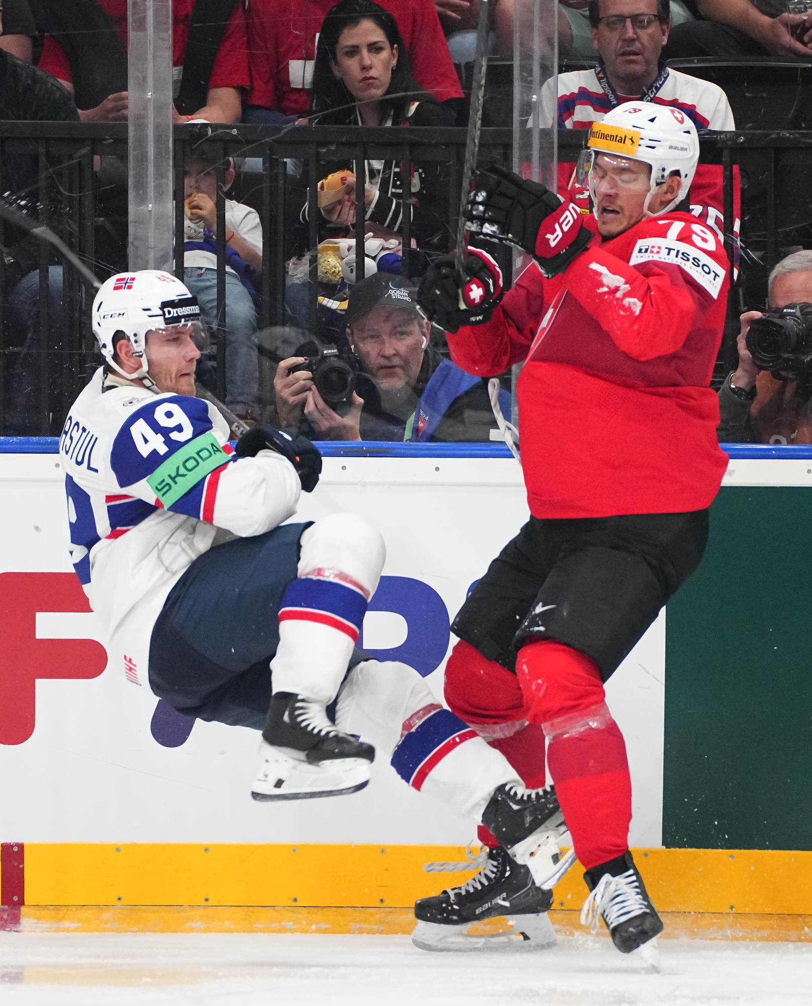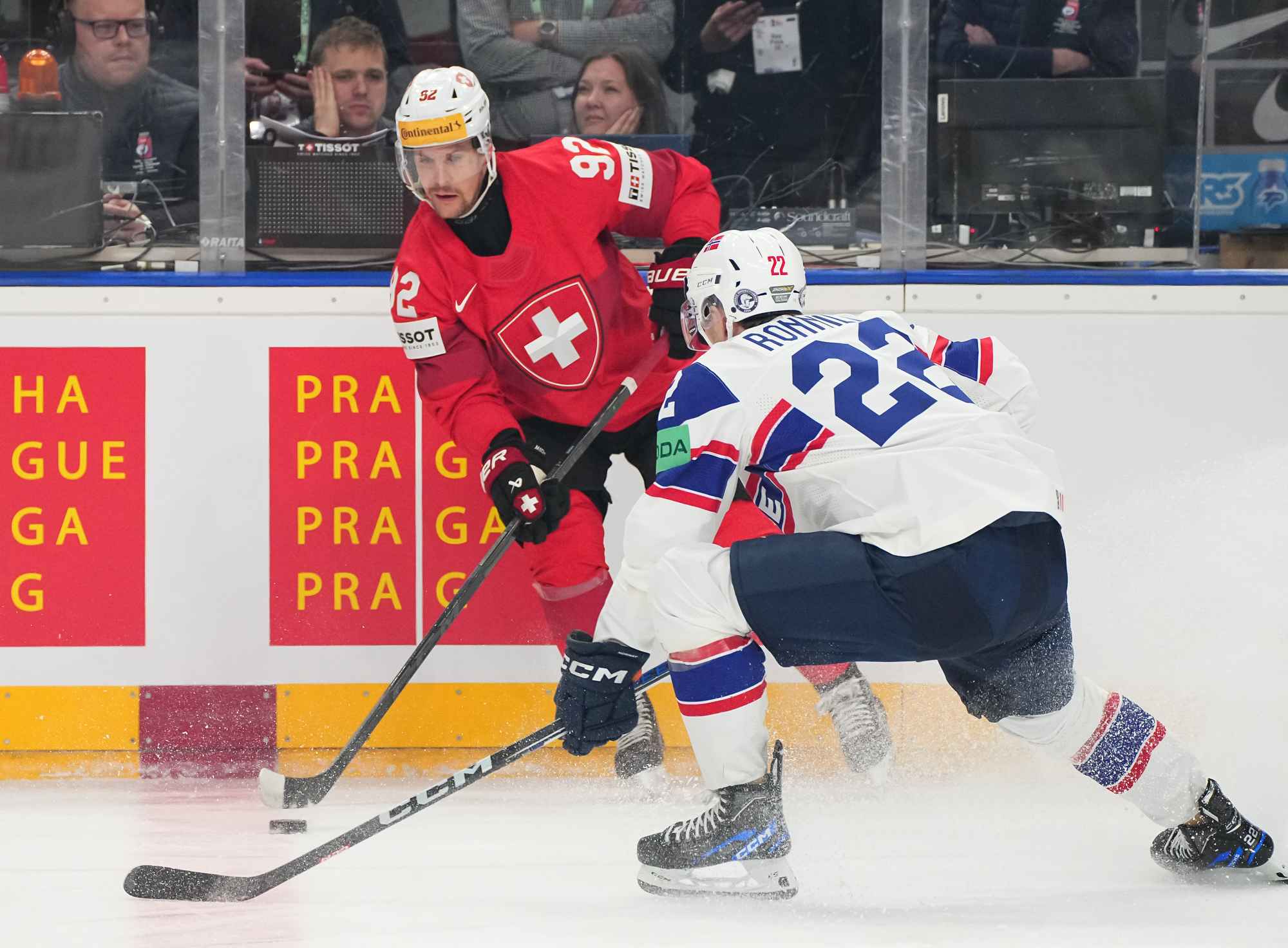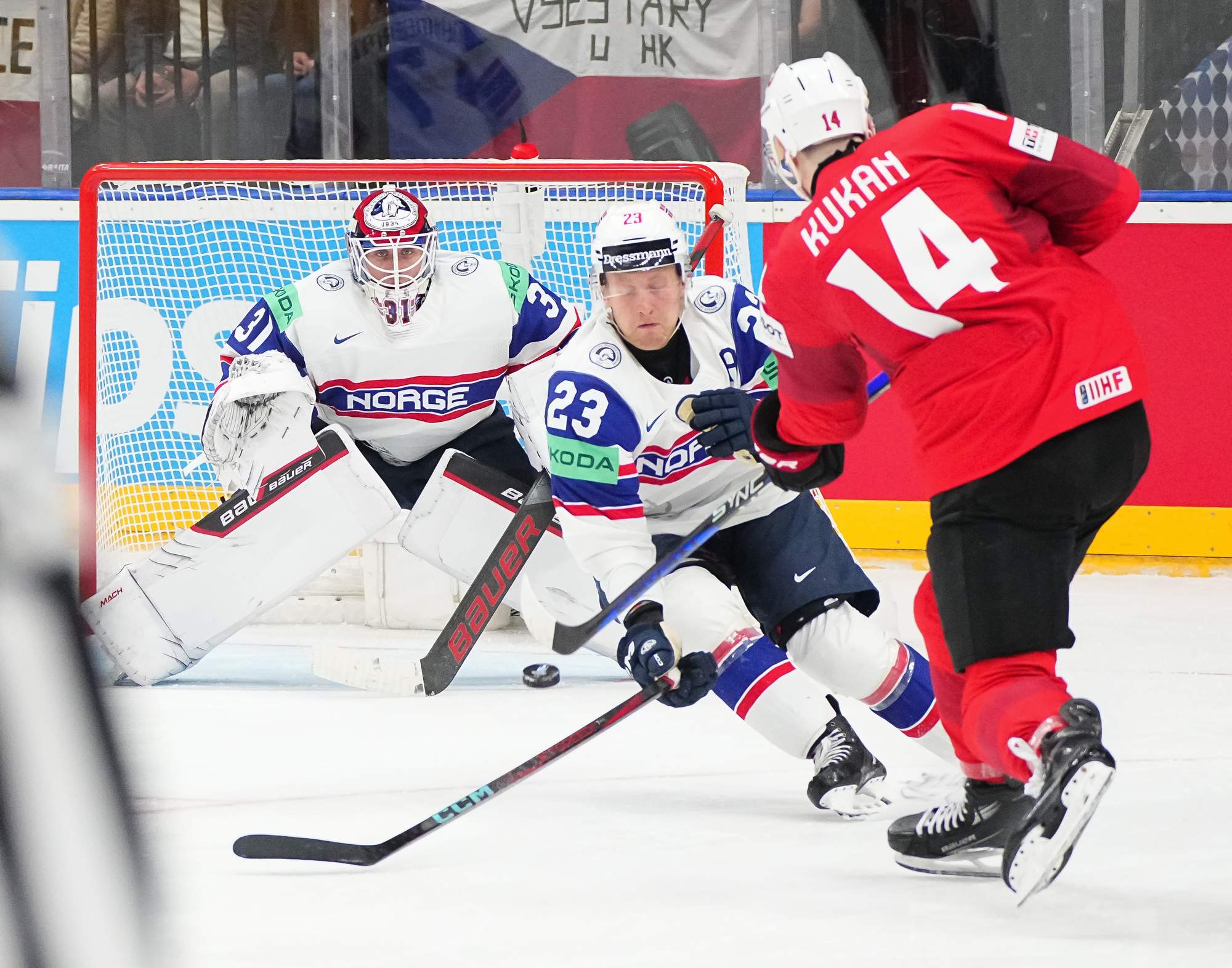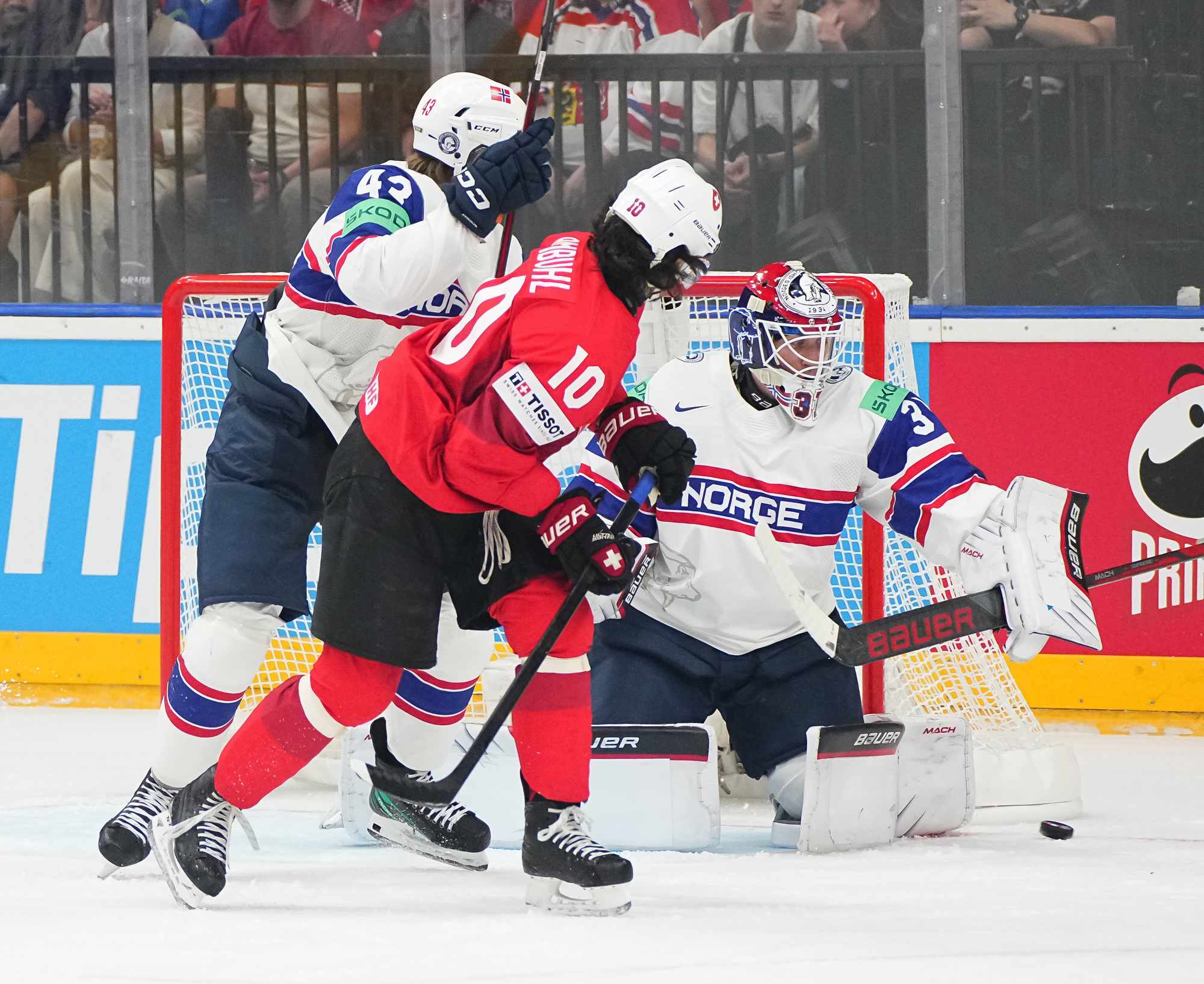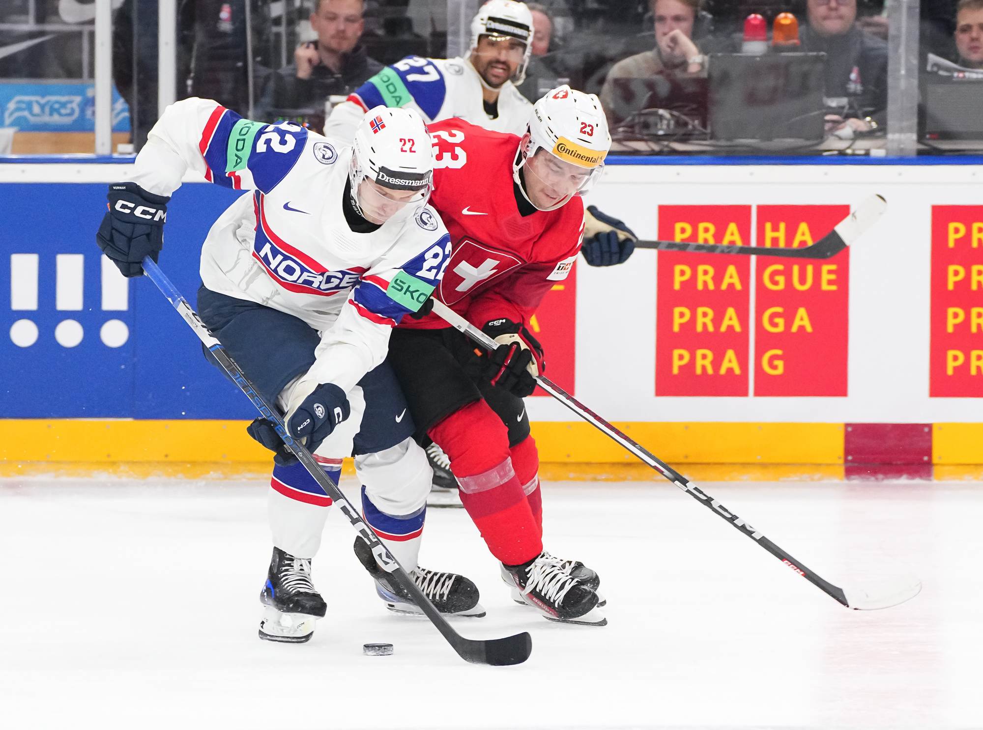 In the middle frame, Switzerland turned its puck possession into goals. Four minutes in, Romain Loeffel unleashed a shot from centre point. His effort evaded Thomas Berg-Paulson’s attempted block and dinged the post on its way into the top corner. The Swiss D-man then made a key intervention at the other end, getting in front of a shot from Stian Solberg as the young defender dithered when well placed.
