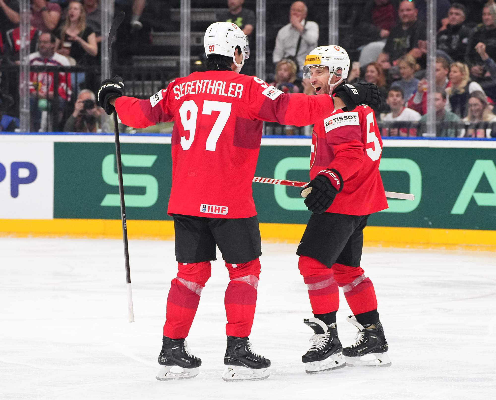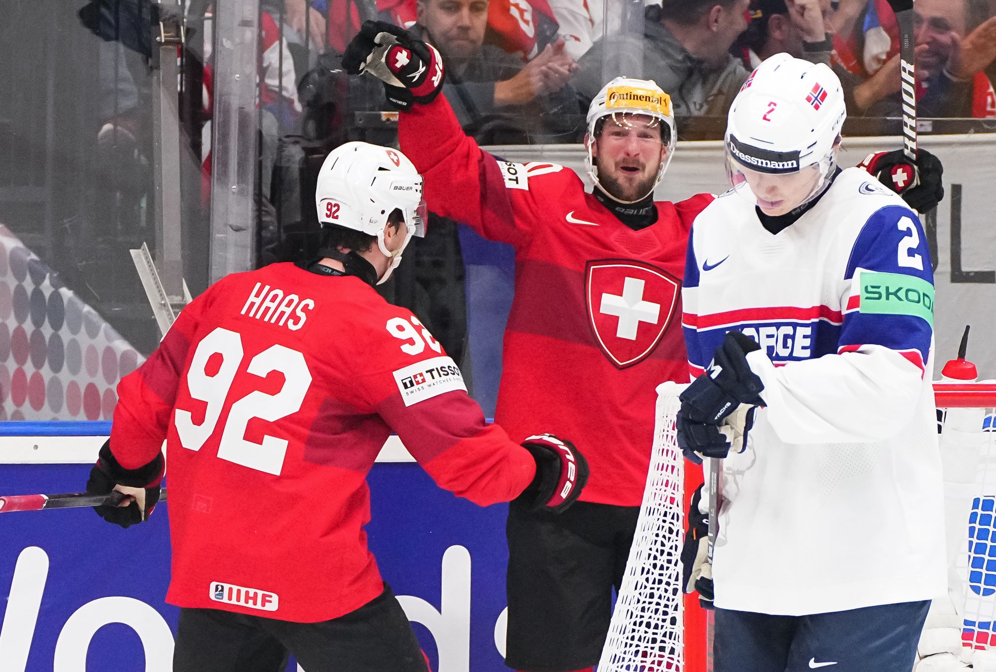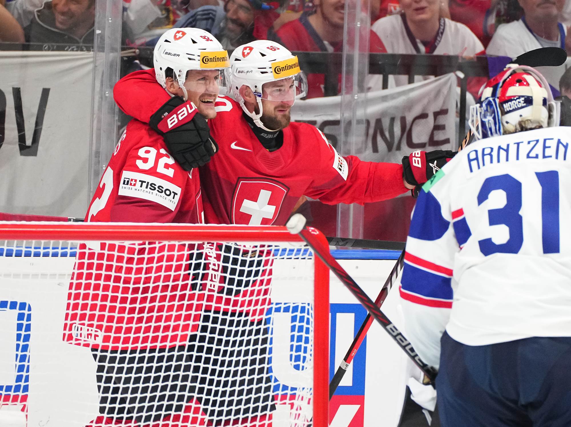 Switzerland's Gaetan Haas (#92) and Tristan Scherwey (#60) celebrate their team's fourth goal on Norway at the 2024 IIHF World Championship in Prague.