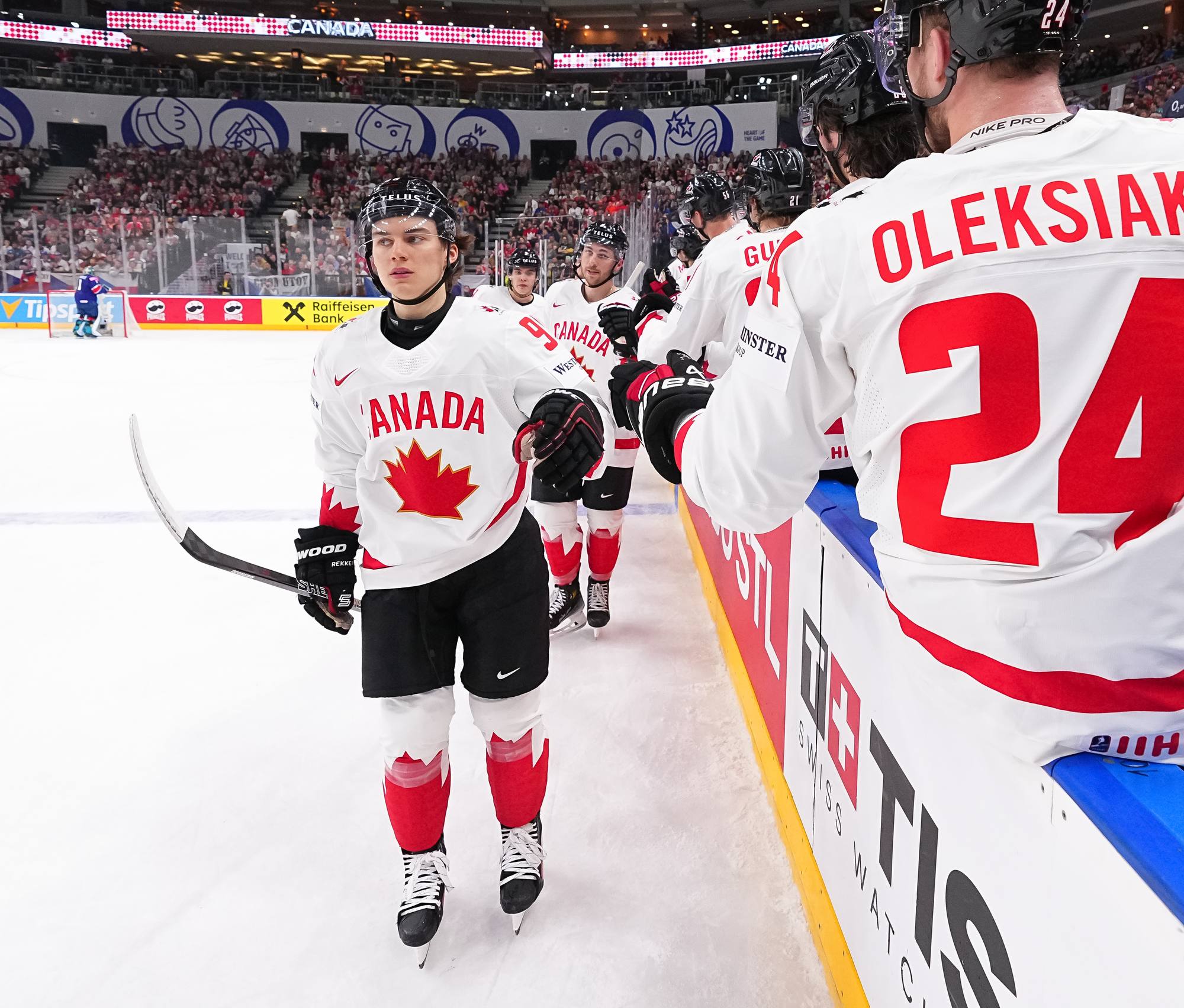 Canada's Connor Bedard receives the congratulations of his team-mates after scoring on Great Britain during a 2024 IIHF World Championship game in Prague.