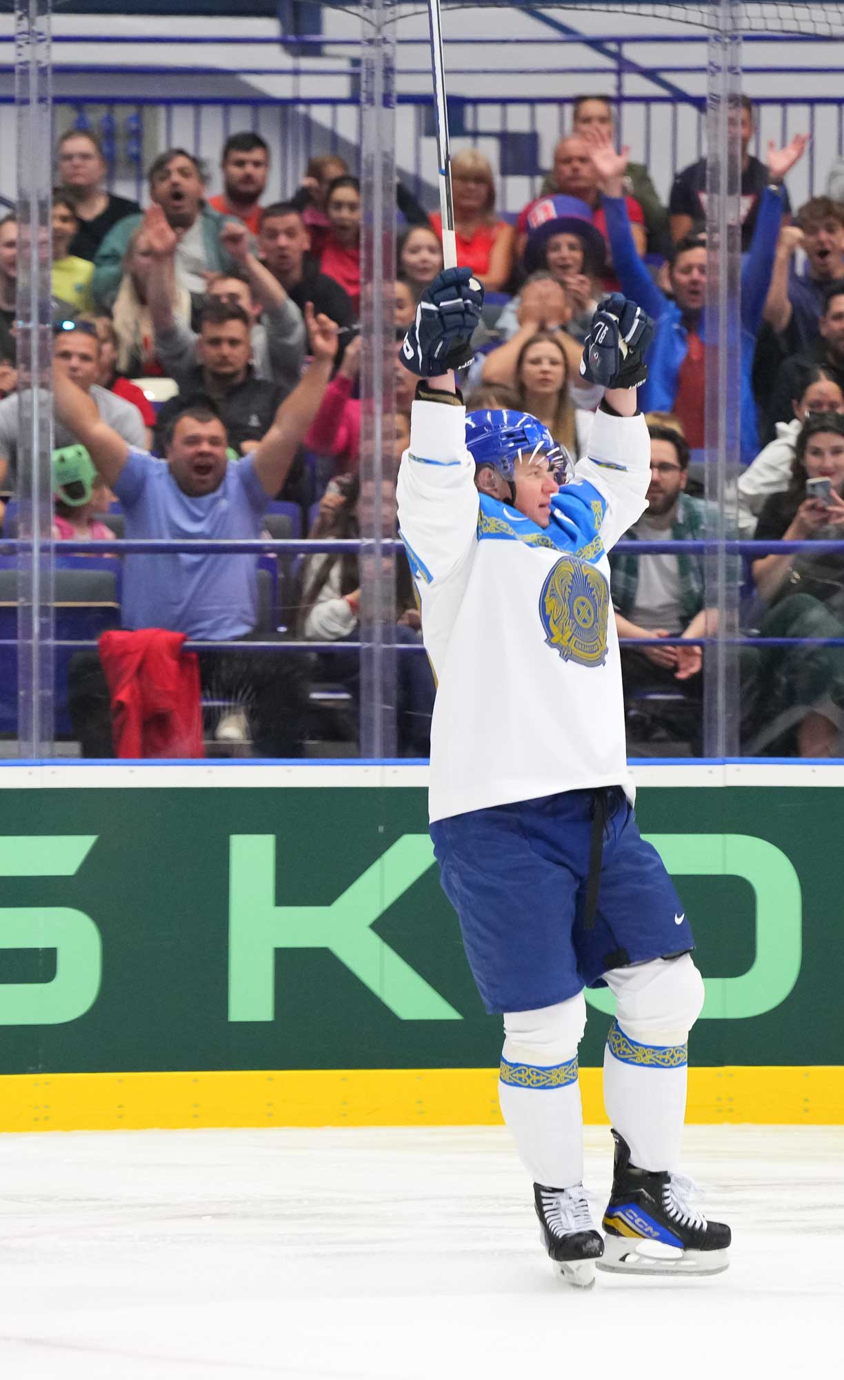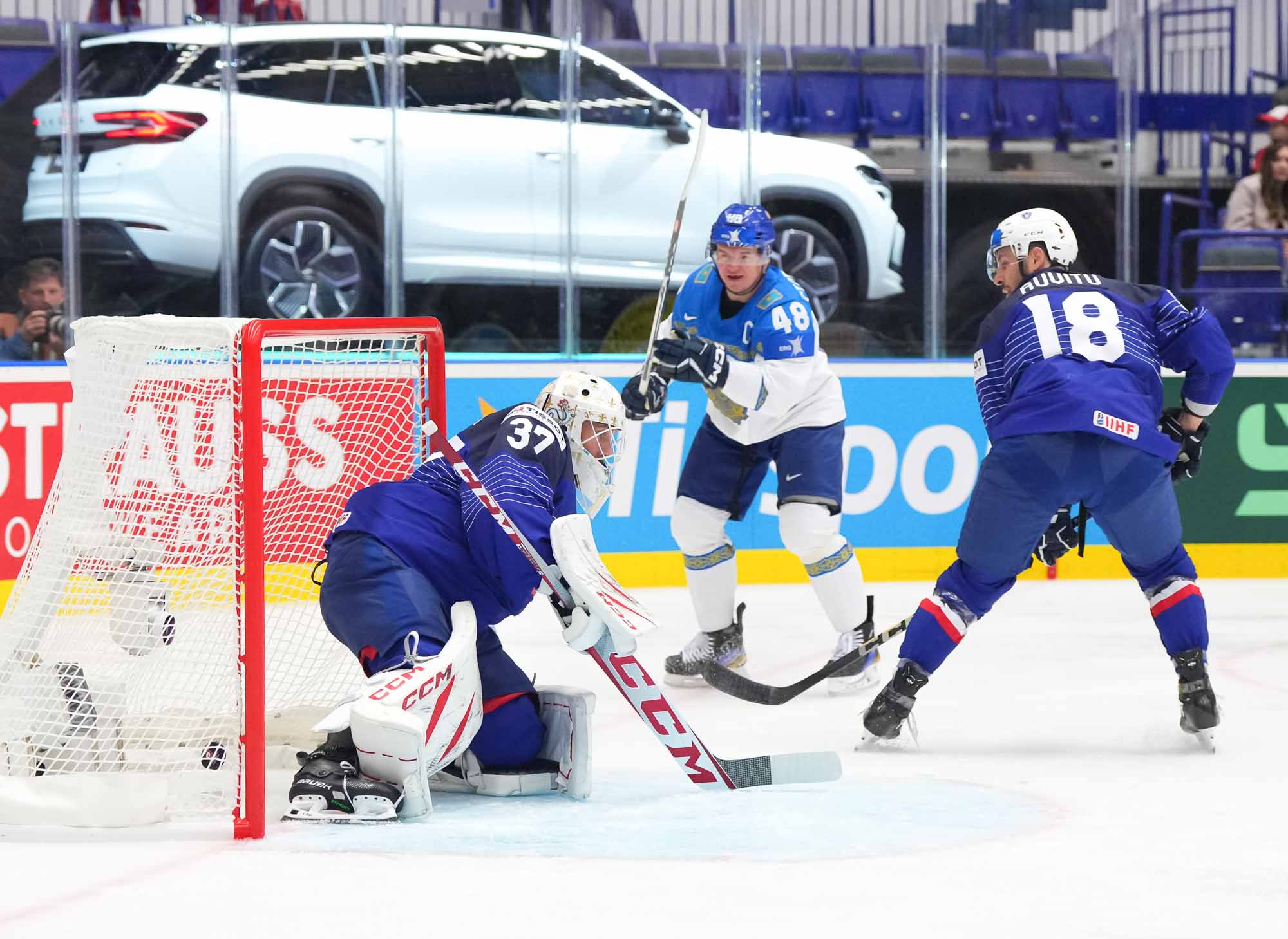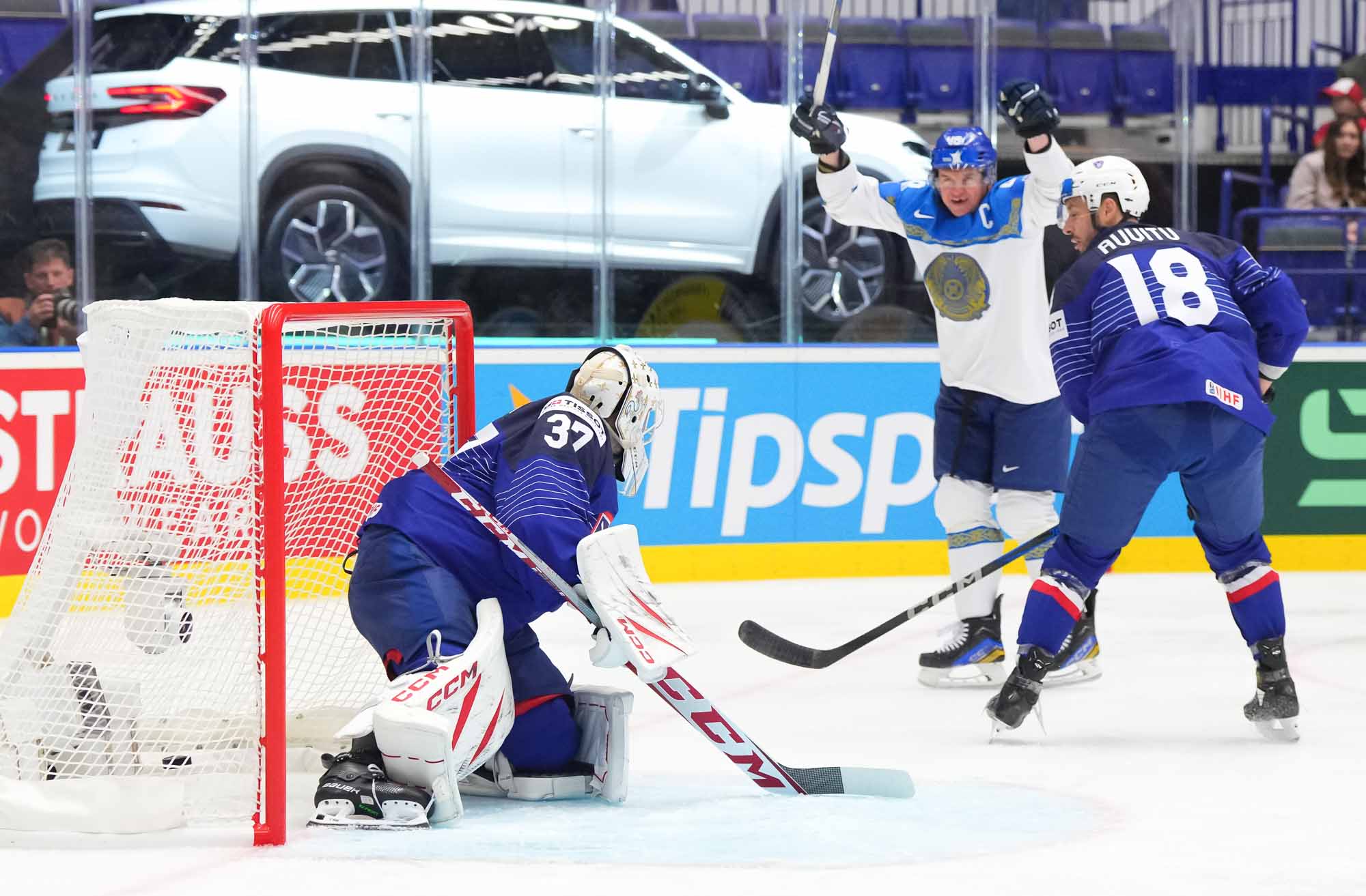Kazakhstan tied the score just 66 seconds later off a clever play by captain Roman Starchenko. Cradling the puck behind the net and seeing little else, he came out in front and banked a shot off the side of goalie Sebastian Ylonen.