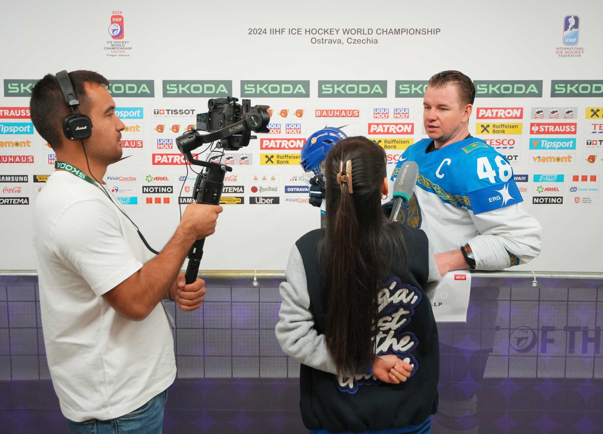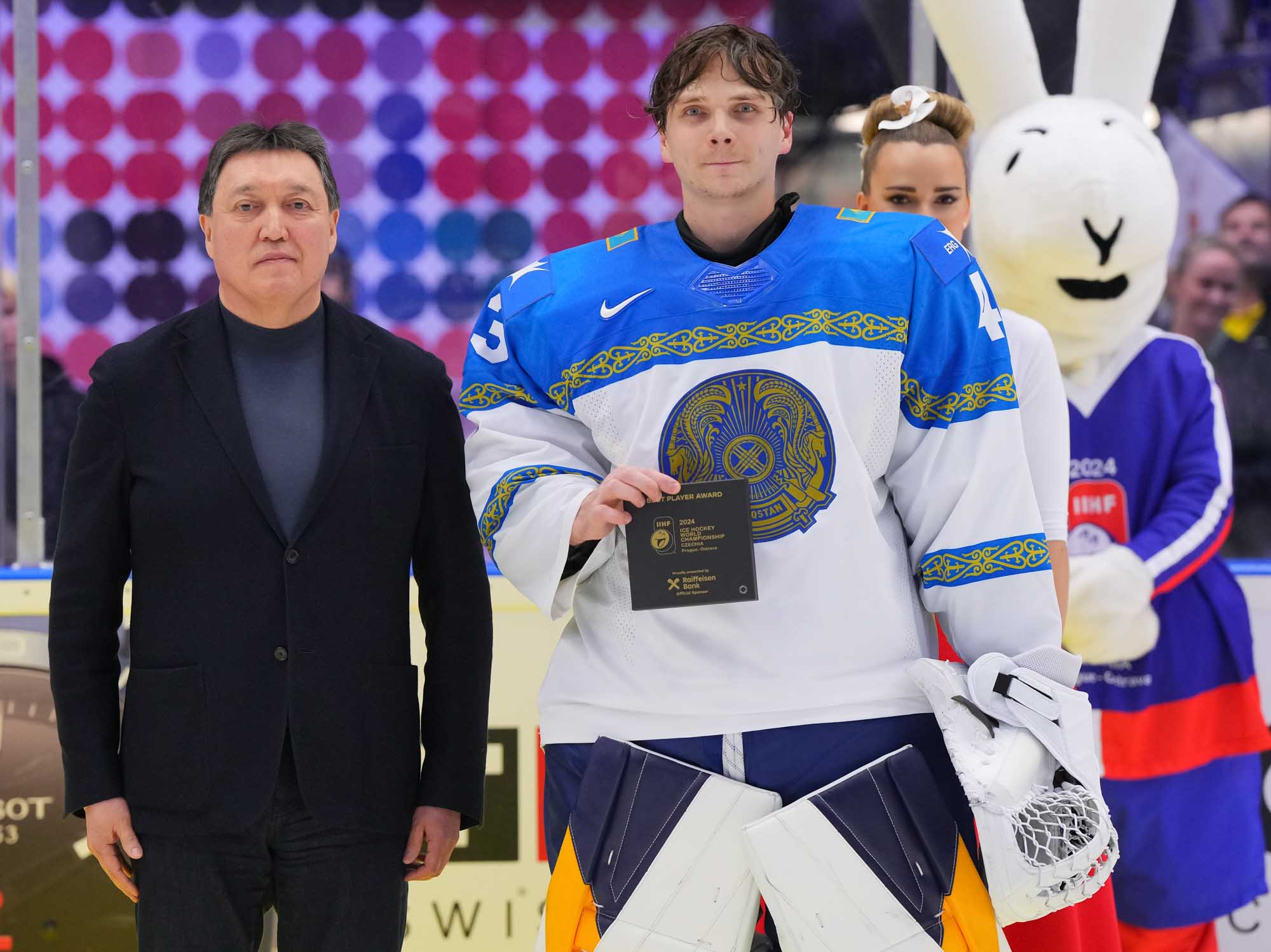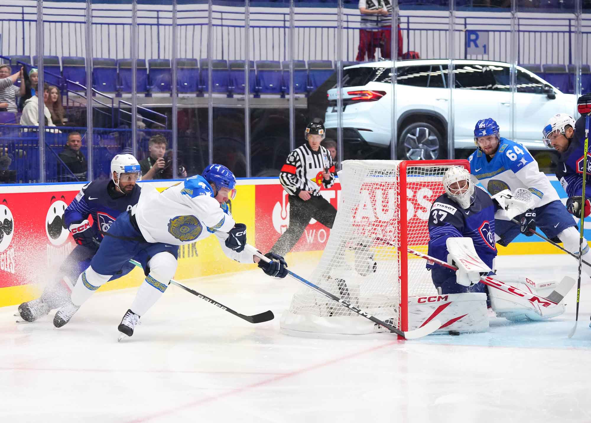 Kazakhstan tied the score just 66 seconds later off a clever play by captain Roman Starchenko. Cradling the puck behind the net and seeing little else, he came out in front and banked a shot off the side of goalie Sebastian Ylonen.