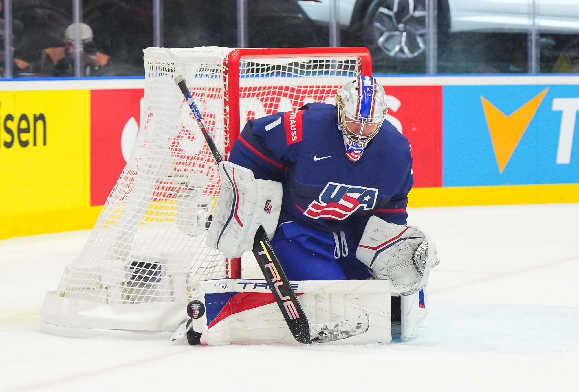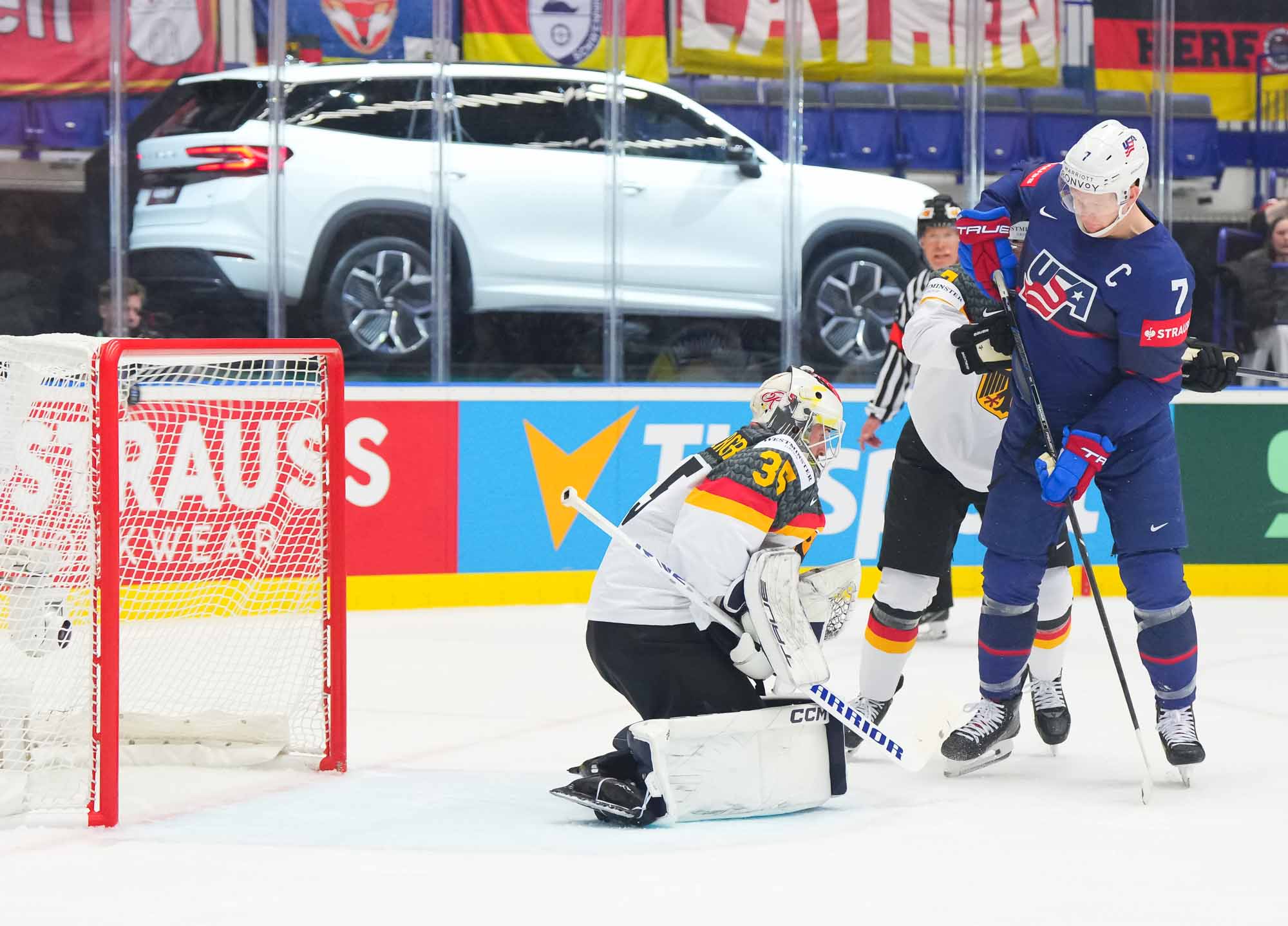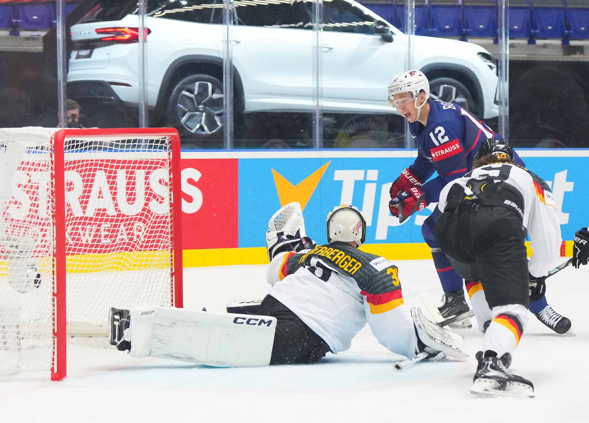 A cautious start by both sides was punctured by the opening goal by the Americans midway through the first period. Kesserling’s quick point shot was perfectly tipped by captain Brady Tkachuk in front, over the glove of Niederberger.