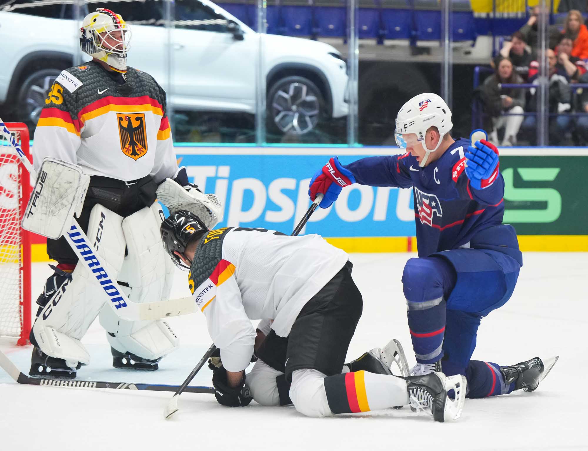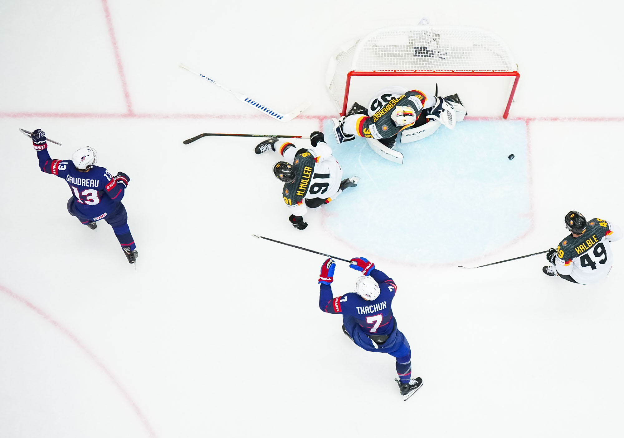 The Americans upped the score to 3-0 at 12:23 when Johnny Gaudreau knocked in a rebound ono the power play, and then Ehliz got that back for the Germans a minute and a half later, jamming the puck over the goal line on a mad scramble in the blue ice.