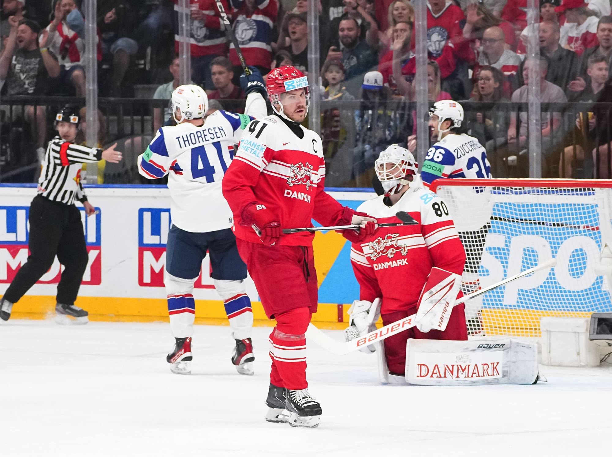 At 7:15, just as the Danish fans had begun to chant their support, the top Norwegian line opened the scoring on the rush. Zuccarello found Brandsegg-Nygard in the middle for a one-timer that soared past Dichow's glove. It was the second goal of these Worlds for the 18-year-old forward, who plays for Sweden's Mora IK.
