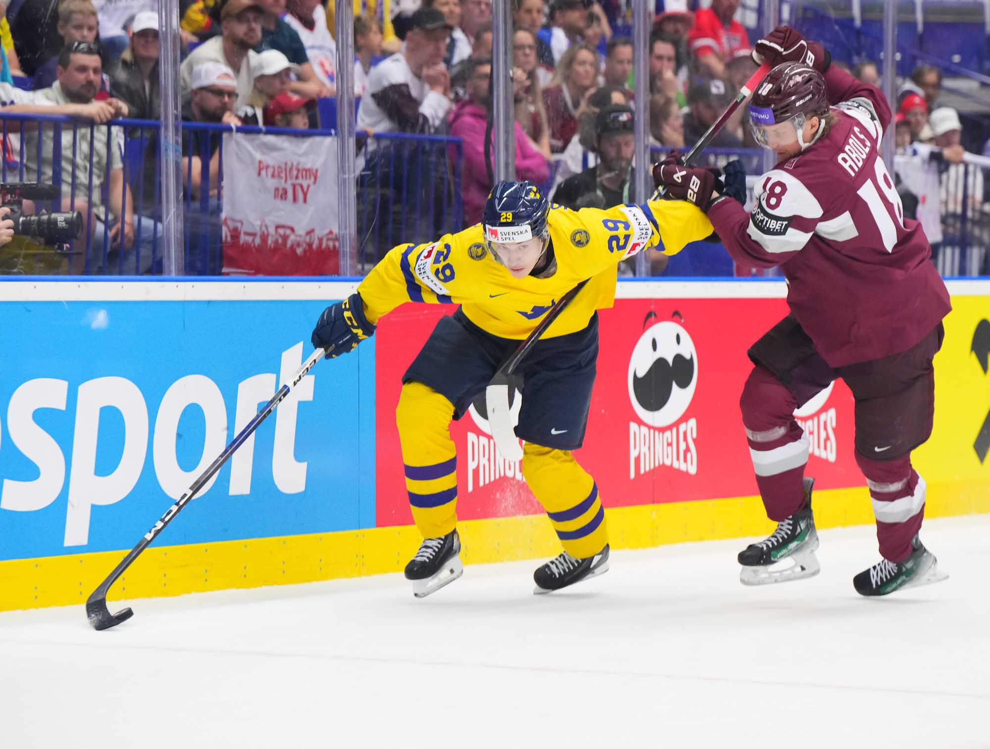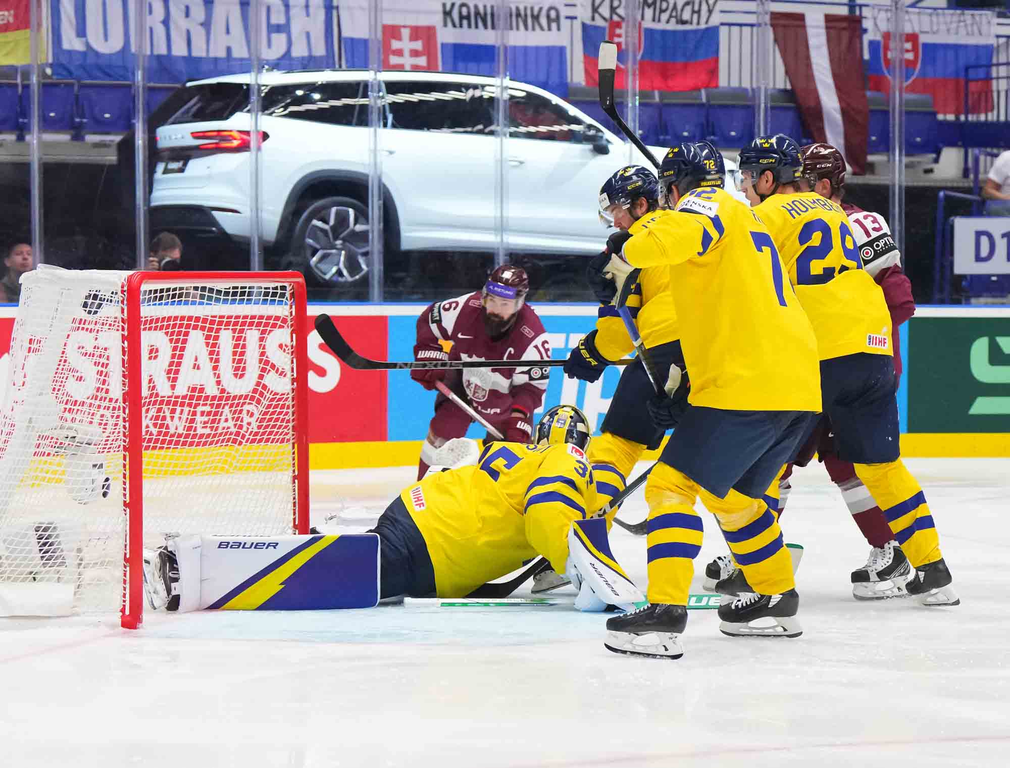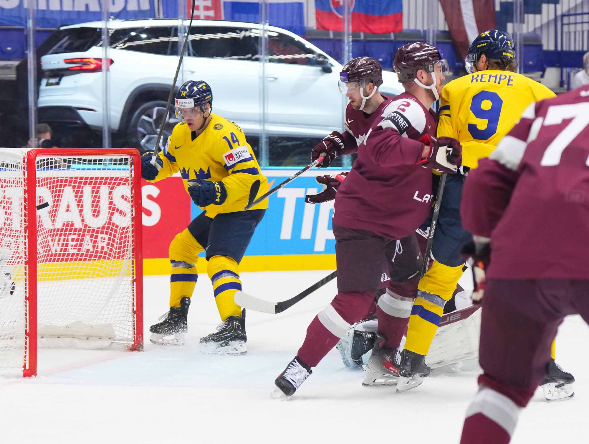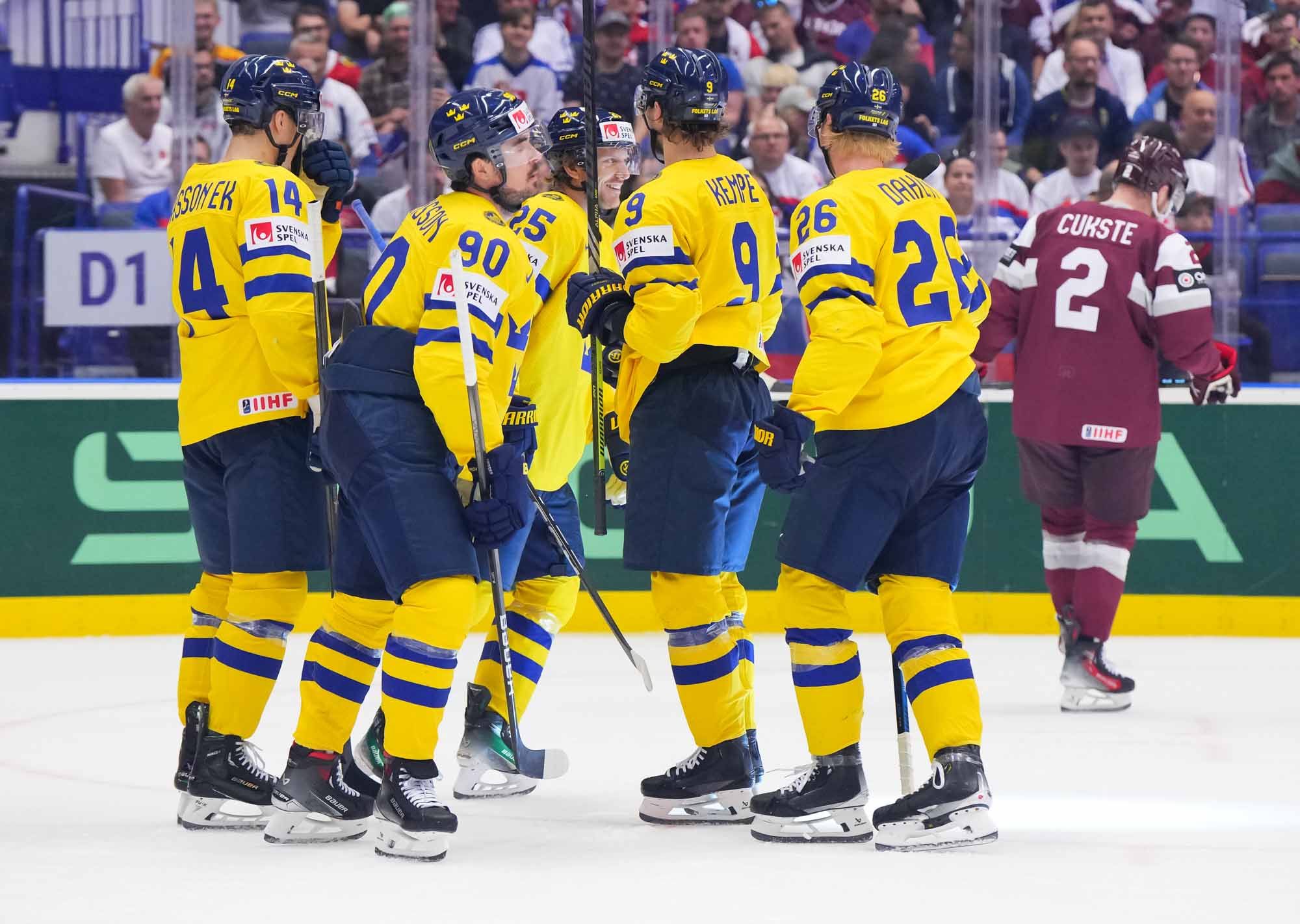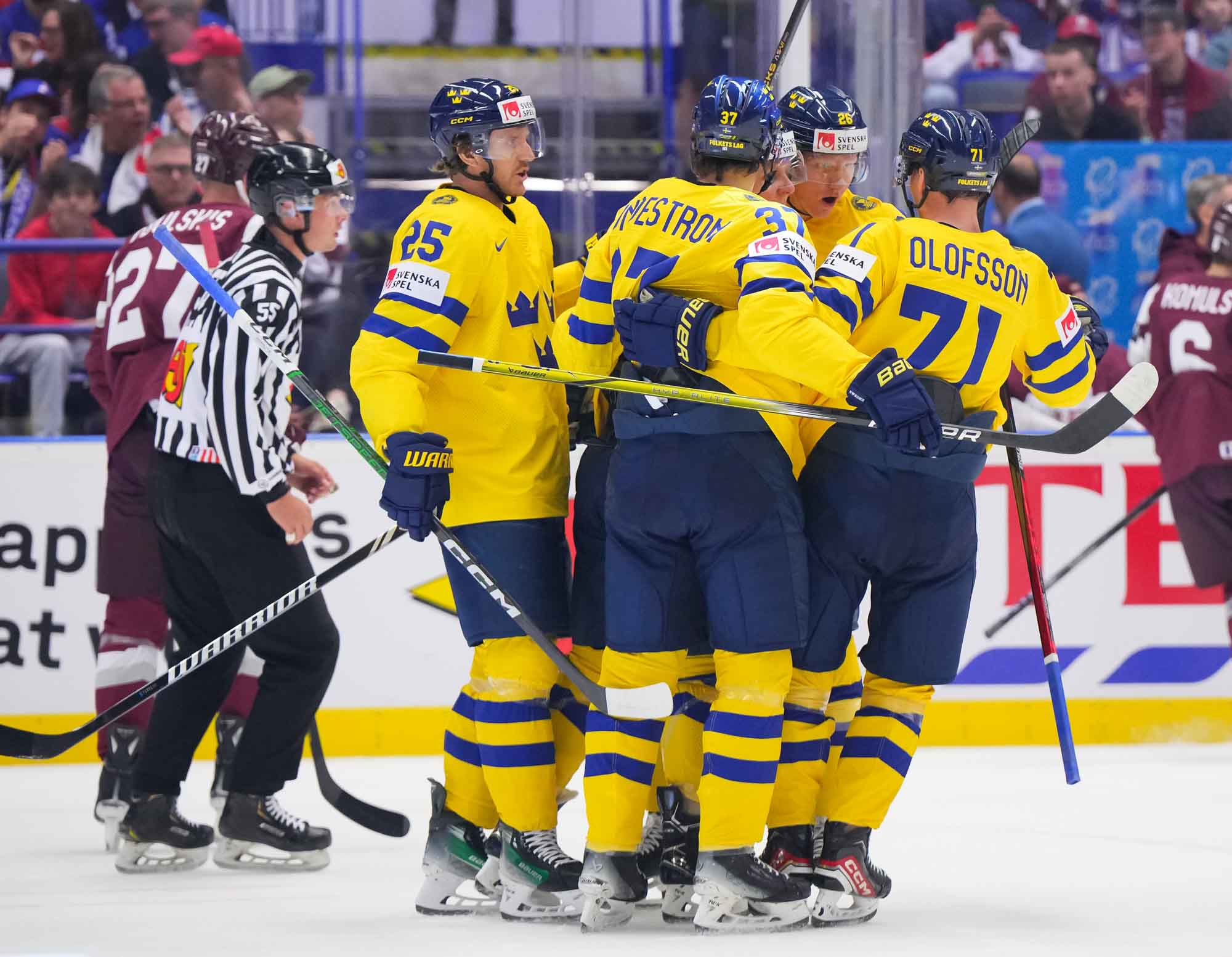 Sweden defeated Latvia 7-2 this afternoon in Ostrava to remain a perfect 5-0 atop the Group B standings. The win clinches a playoff spot for Tre Kronor, which now has 15 points and two games remaining. Key to the win was killing a five-minute major to Rasmus Sandin early in the second period.