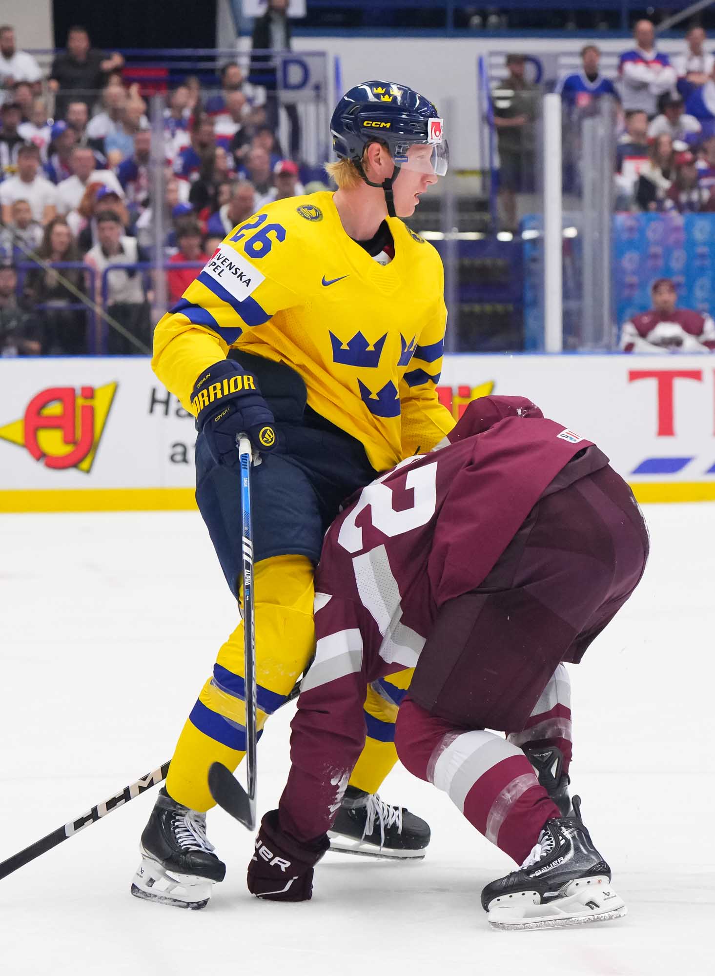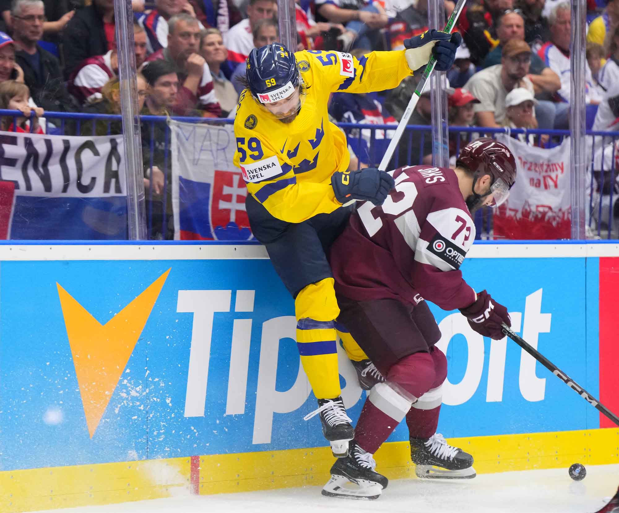 But then something happened that doesn’t happen often—the Swedes lost their cool. Dahlin hit Haralds Egle high along the glass, producing a scrum with all ten skaters, and after a video review Dahlin was given a major and game misconduct penalty for charging. It easily could have been called elbowing or a hit to the head.