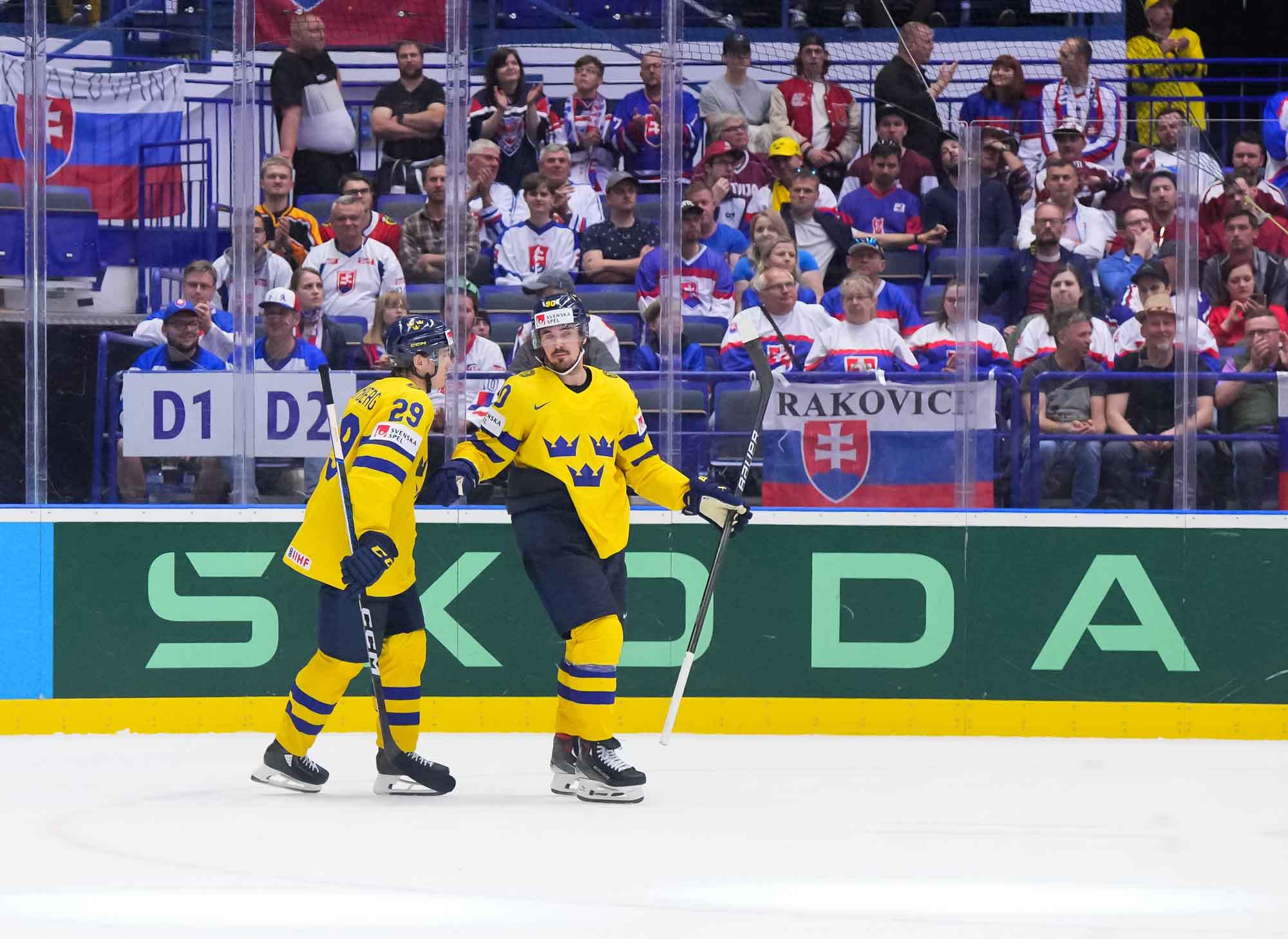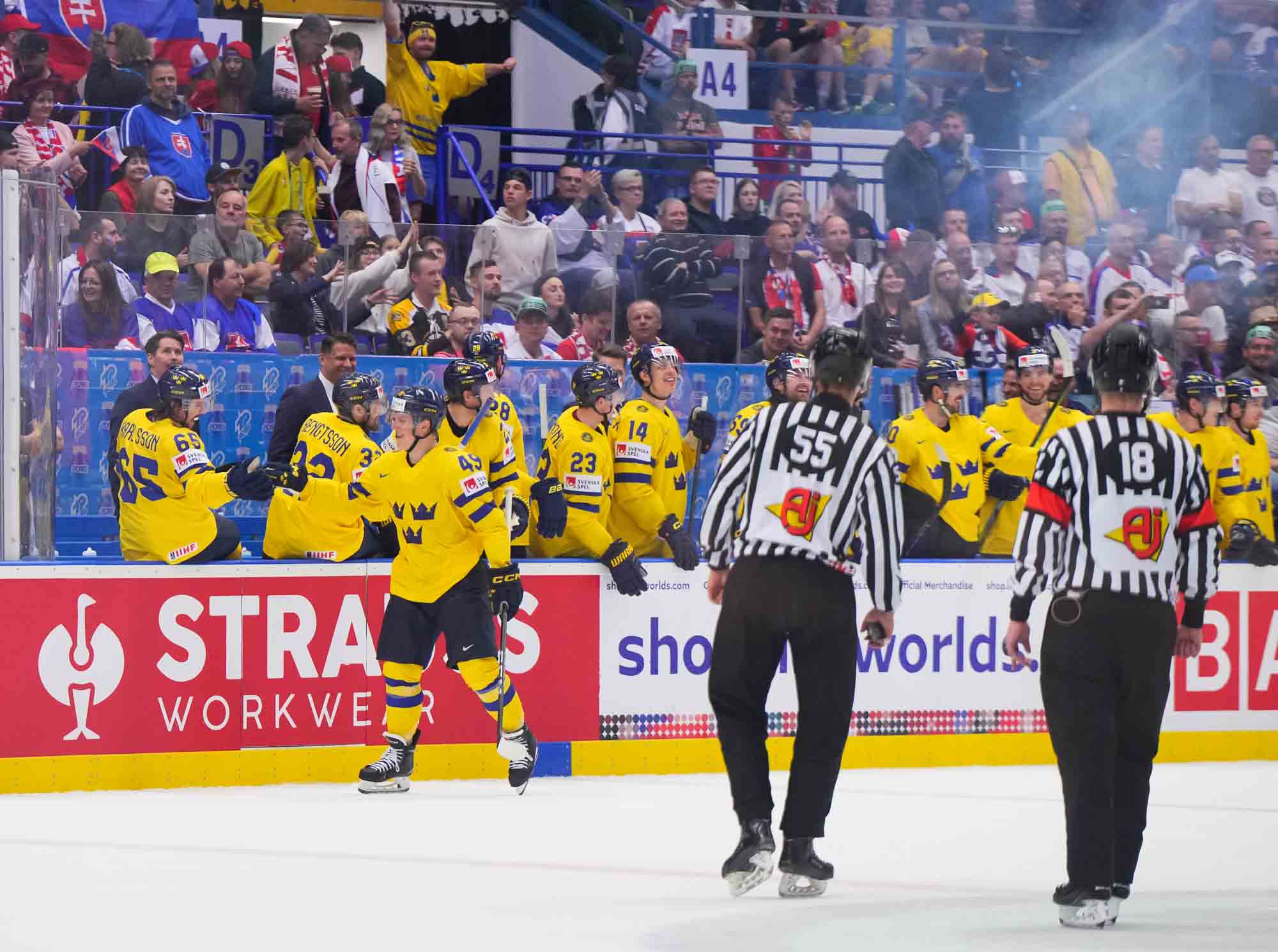The Swedes opened the scoring at 4:50 off a Dahlin one-timer from a sharp angle. The feed from the point came from Victor Olofsson. Two minutes later, Tre Kronor doubled its lead on a Brodin goal, his first of the tournament. He snapped a high shot from the slot over Elvis Merzlikins’s glove at 6:58.