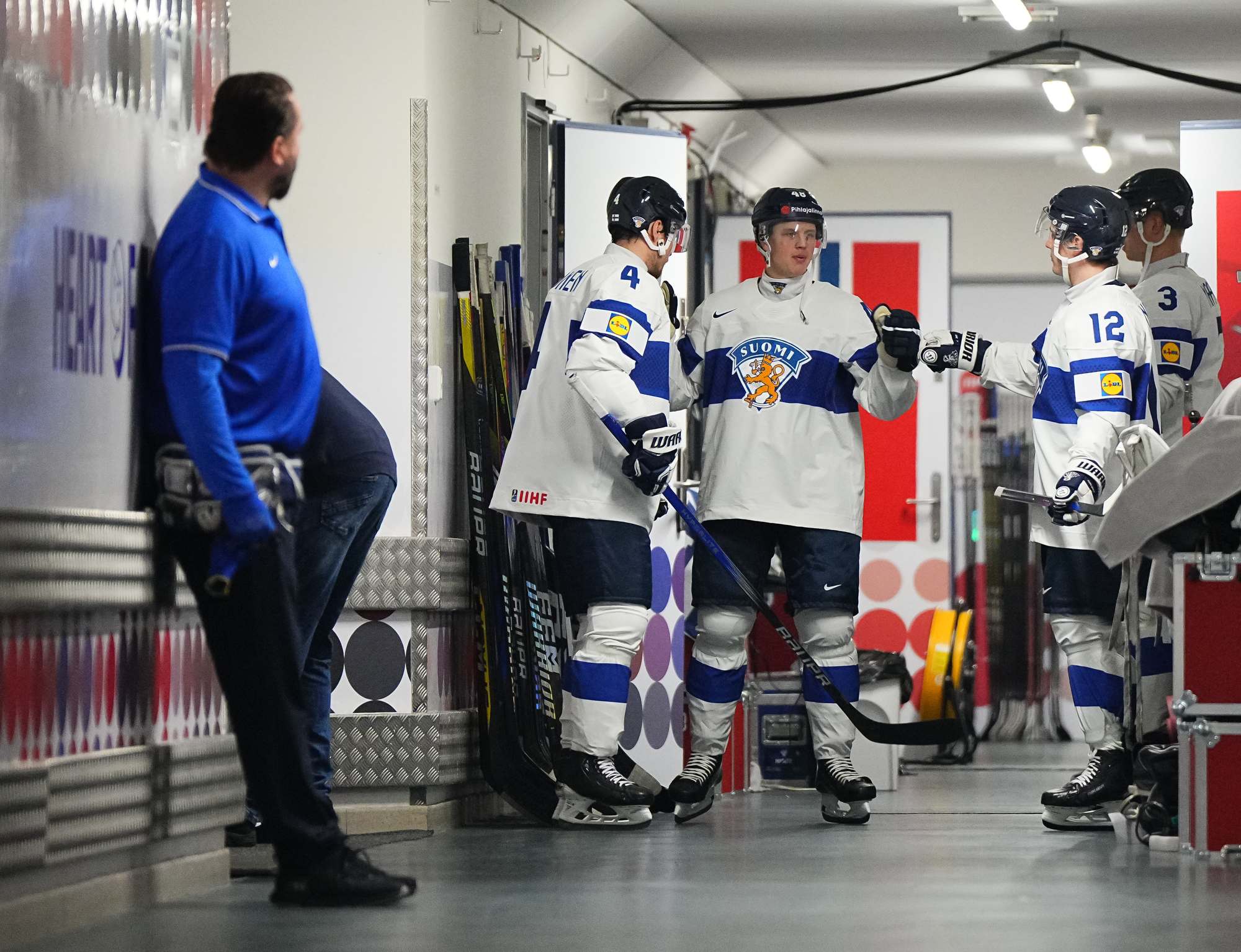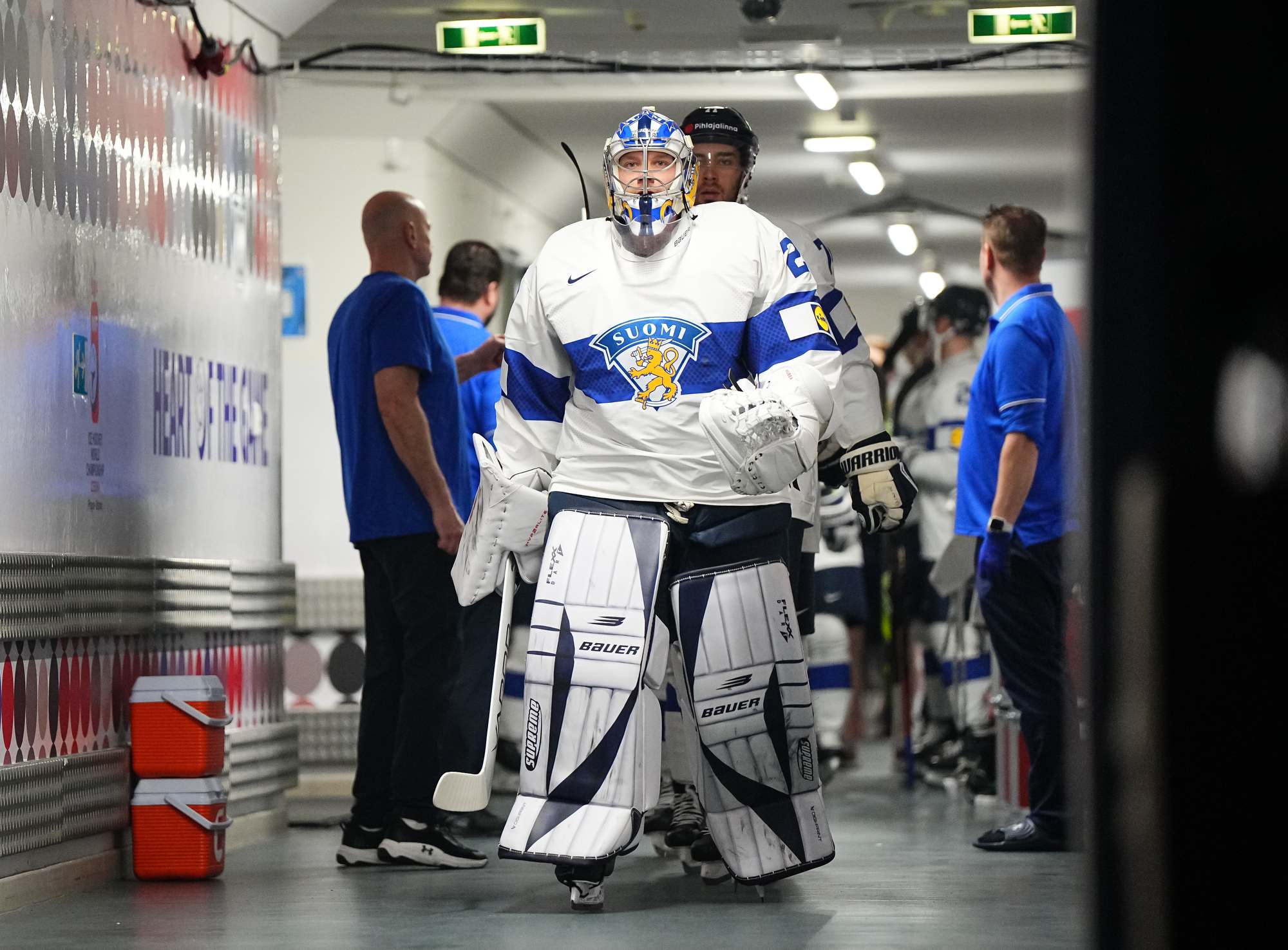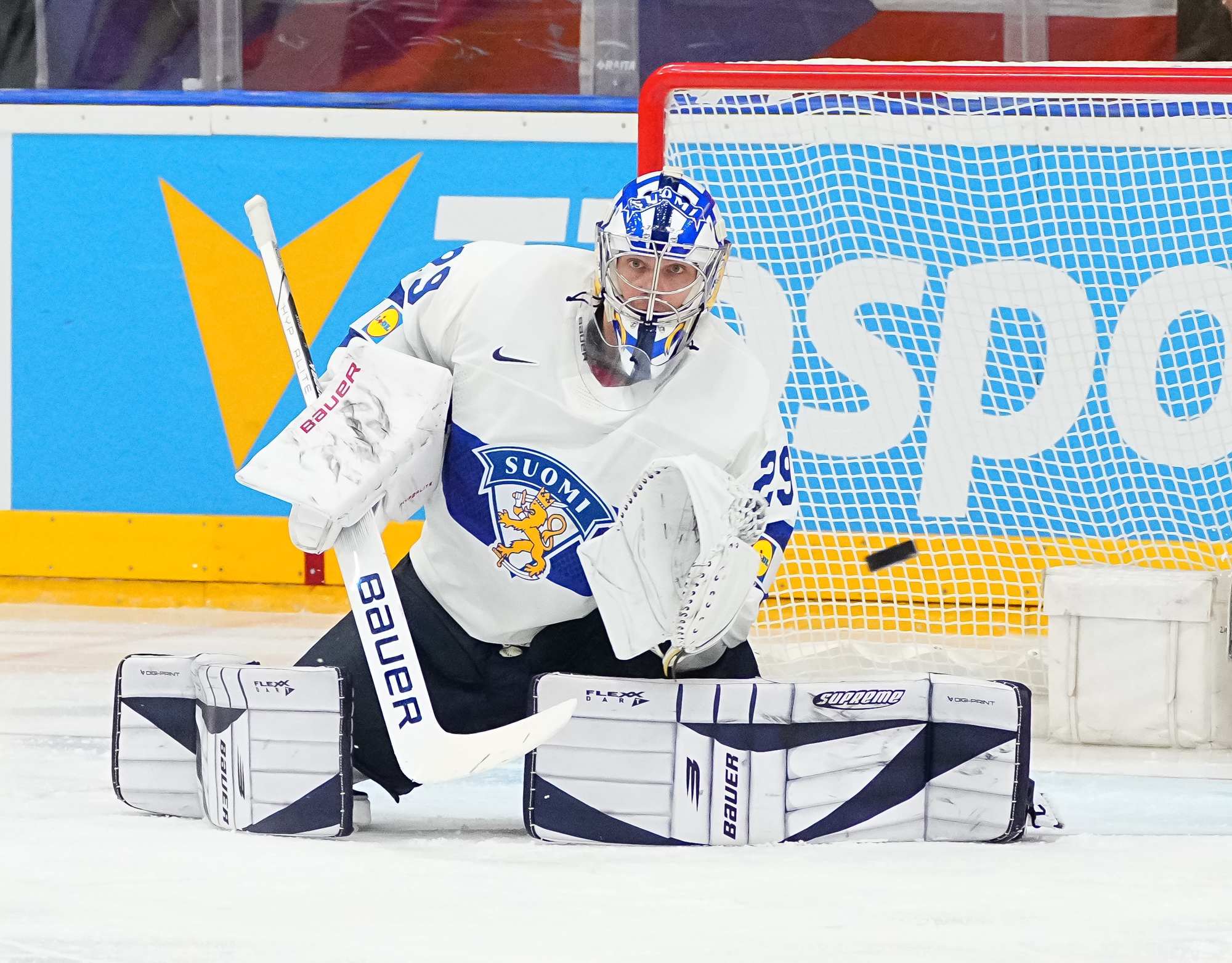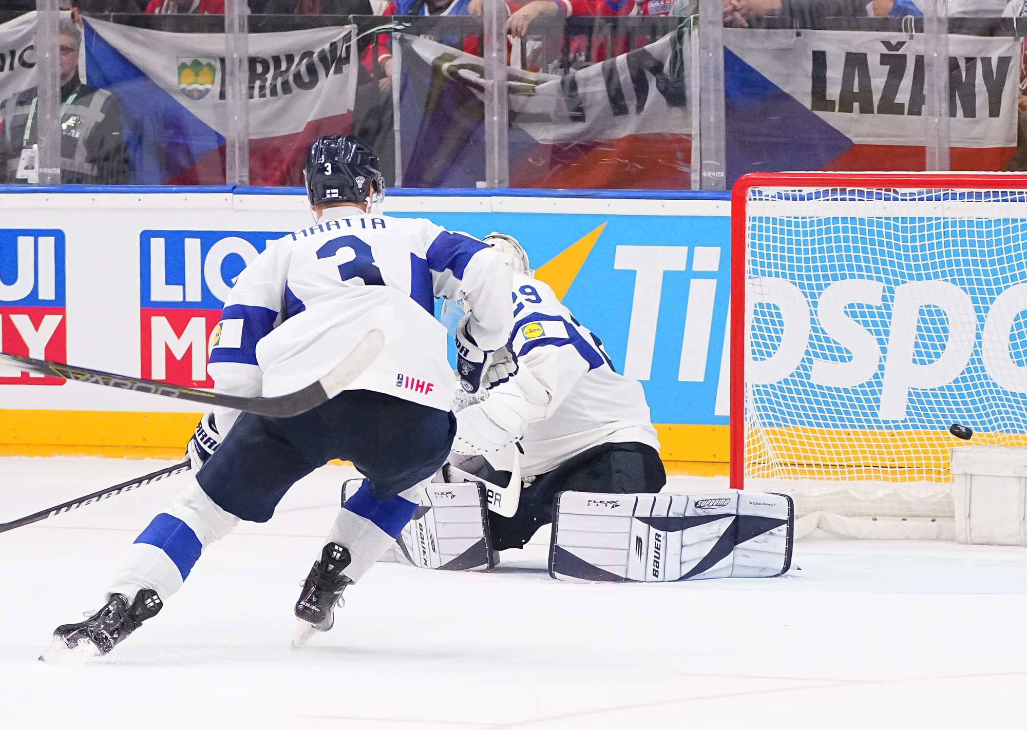 With Bedard off for slashing, the Finnish power play made it 2-0 at 3:51. Villi Saarijarvi zipped the puck cross-ice to Arttu Hyry, who bunted it back to Valtteri Puustinen in the slot for a quick release.