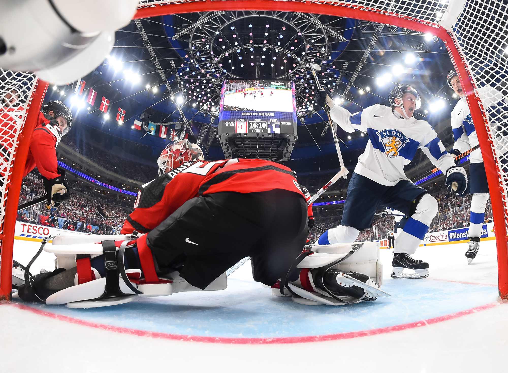 Canada tied it up at 16:30 on a video-reviewed play. An odd-man rush saw Tavares finding Brandon Tanev in front, and while Sateri blocked Tanev initially, the goalie then tried to cover the puck and inadvertently put it over the goal line with his own stick.