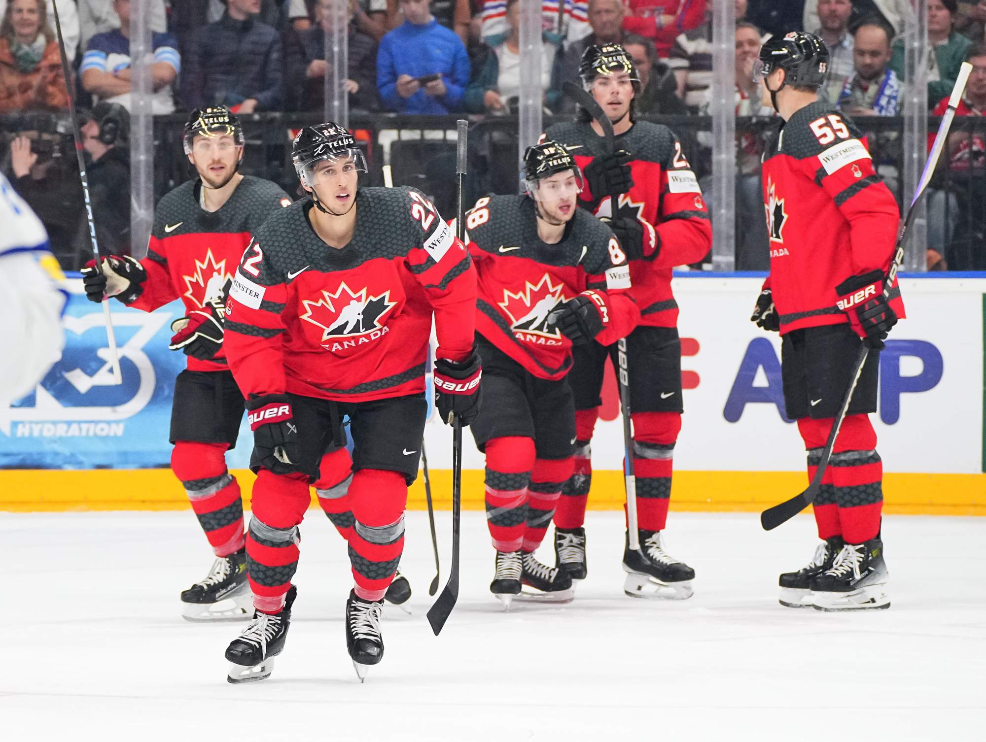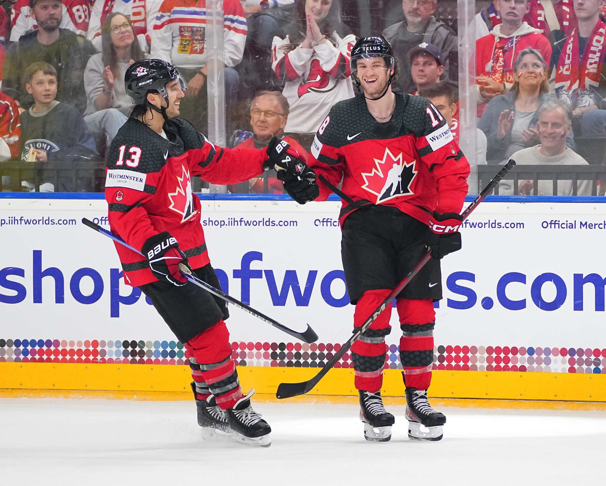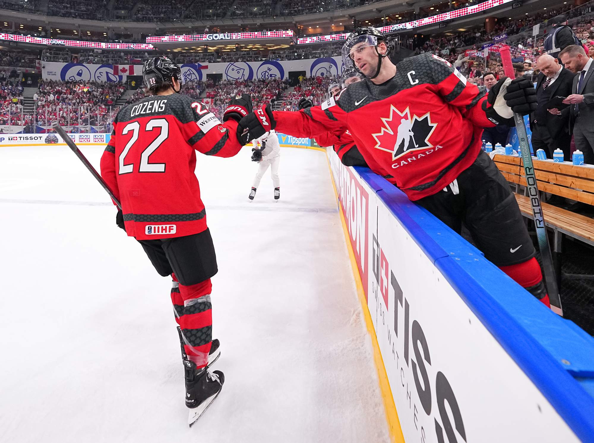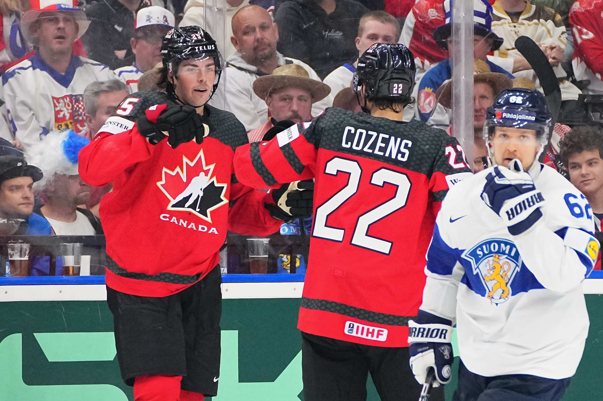 Dylan Cozens (#22) gets a high-five from Canadian captain John Tavares after scoring a first-period goal in a 5-3 win over rival Finland at the 2024 IIHF Ice Hockey World Championship in Prague.