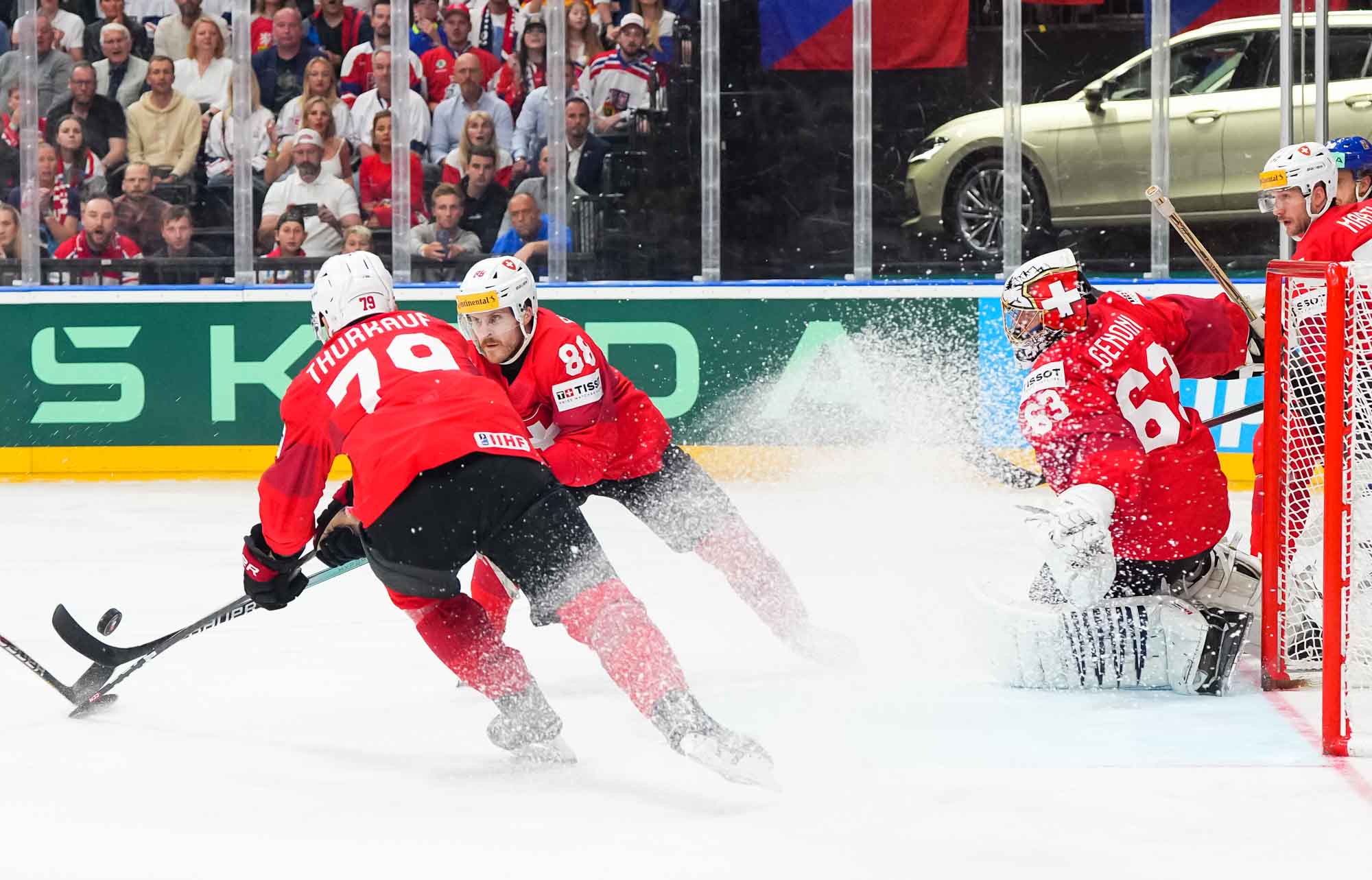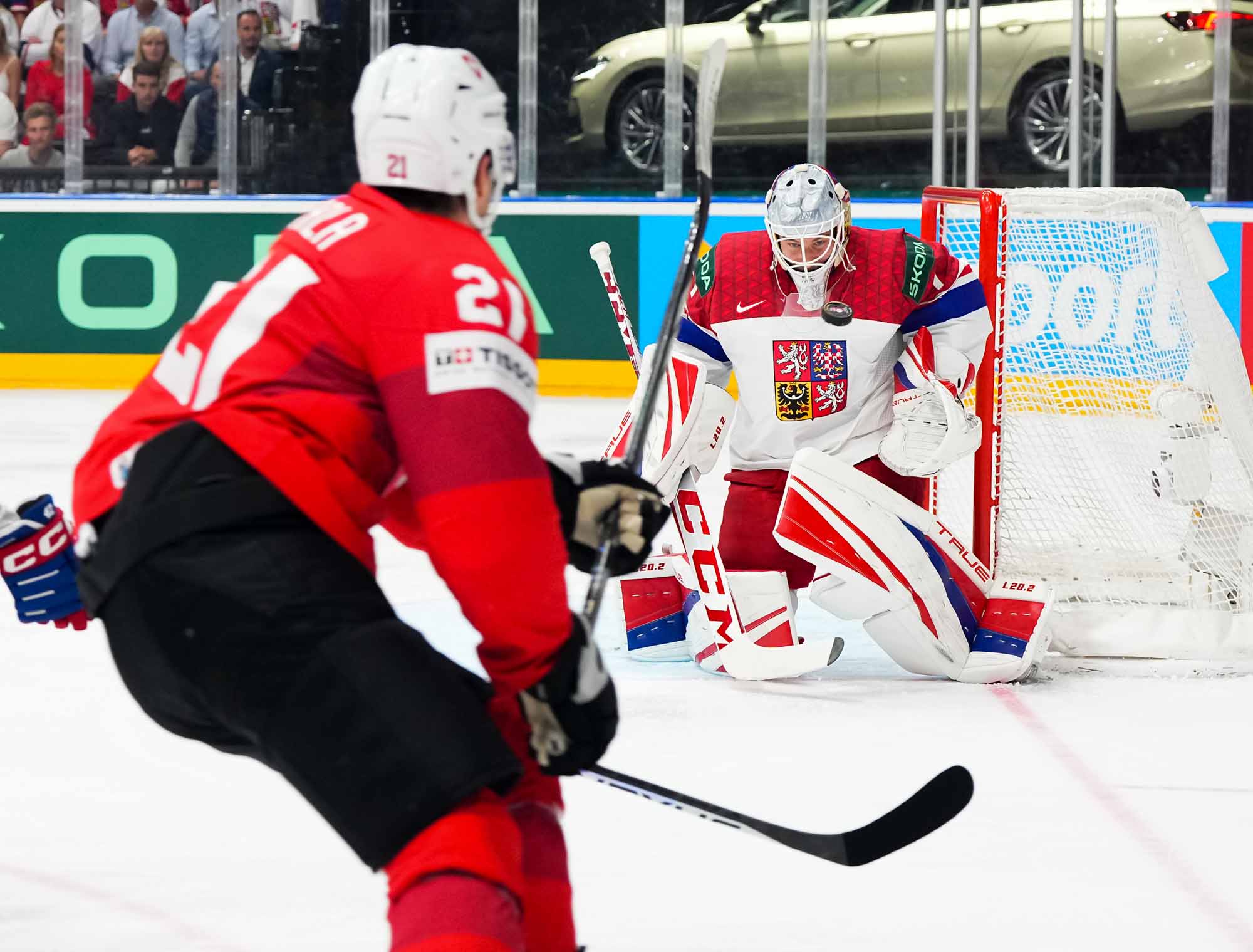 The Czechs continued to press, but Genoni’s vigilance was undeniable. Meanwhile, on a savvy Swiss counterattack, Christoph Bertschy sizzled a shot off Dostal’s right post.