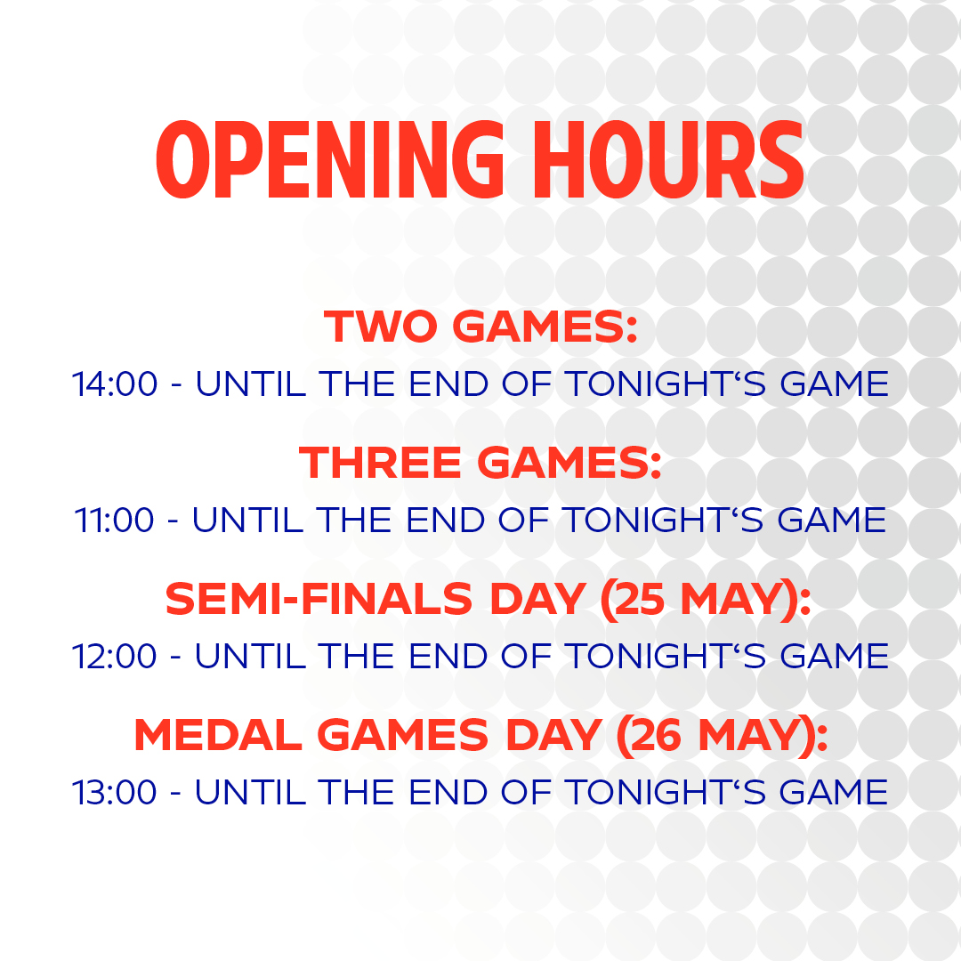 TWO GAMES 14:00 – until the end of the evening game (13.00 on 25 May for the semi-final games, and 12:00 on 26 May for the bronze medal and gold medal games) THREE GAMES 11:00 – until the end of the