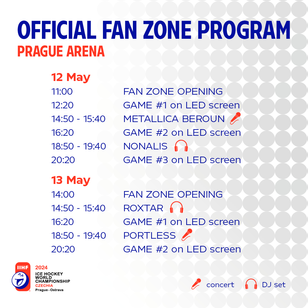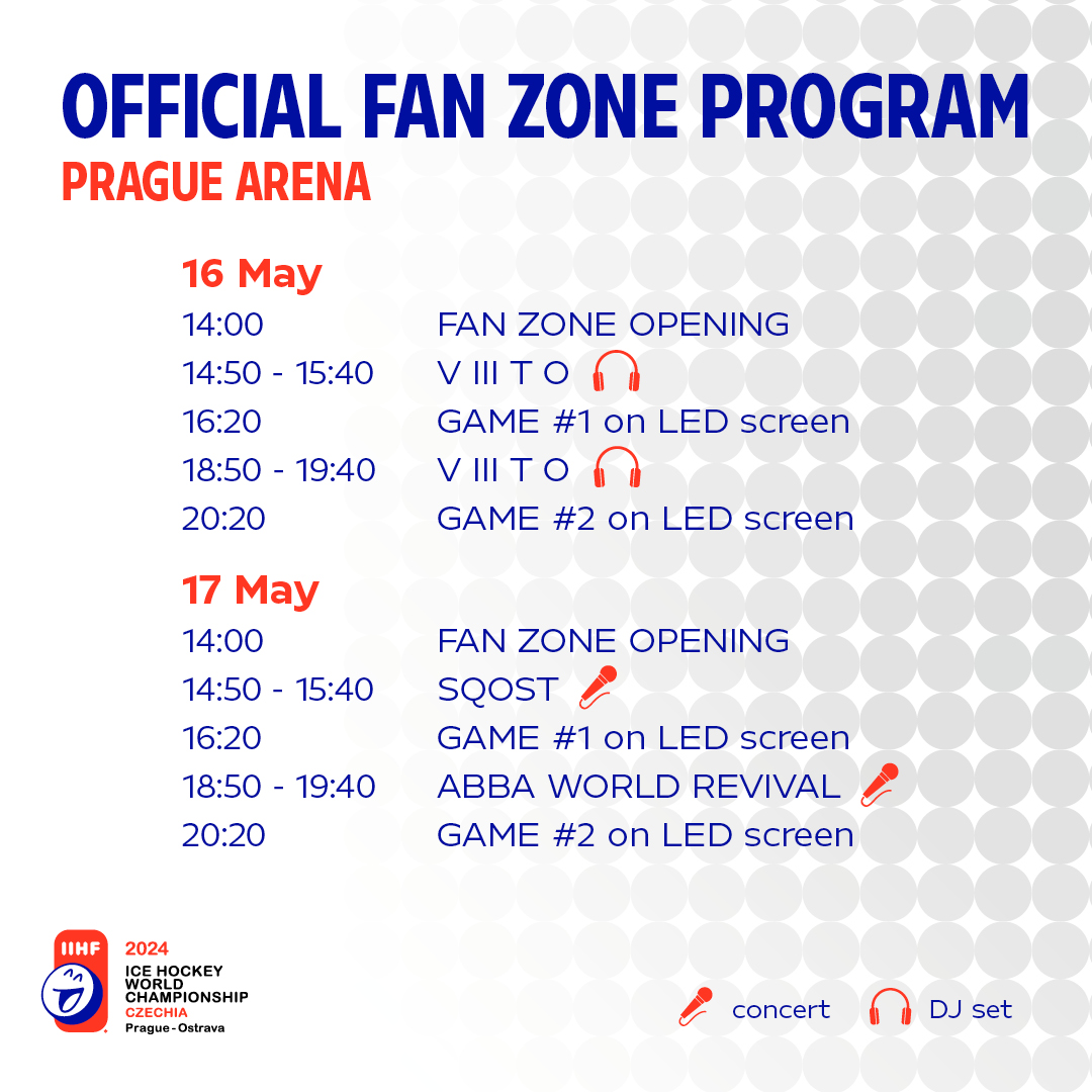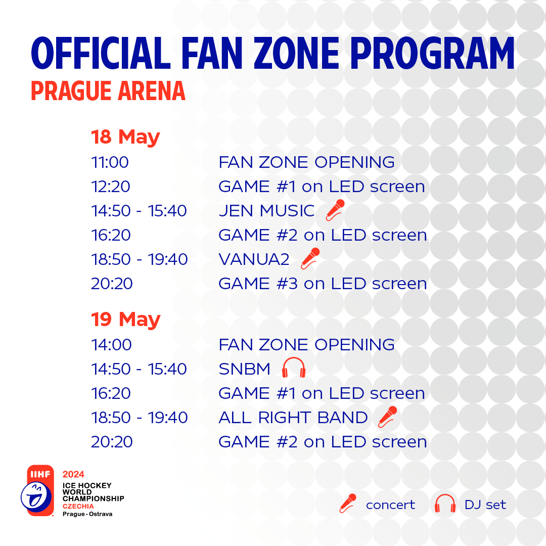 The Official Fan Zone outside the Prague Arena is primarily for you, the fans to thoroughly enjoy the 2024 IIHF Ice Hockey World Championship! Every day, we'll be broadcasting ice hockey games on a large screen. Once again, there will be exciting ice hockey-themed activities for you, as well as a major exhibition by the Official Main Sponsor Skoda, the Official Merchandise store, and activities organized by Official Sponsors and Official Partners. You can also look forward to concerts by popular bands, plenty of good food and drinks. You will also have the opportunity to participate in activation games, win exciting prizes or purchase souvenirs.