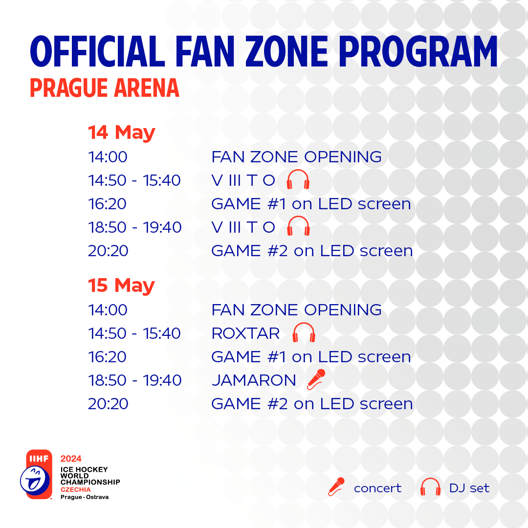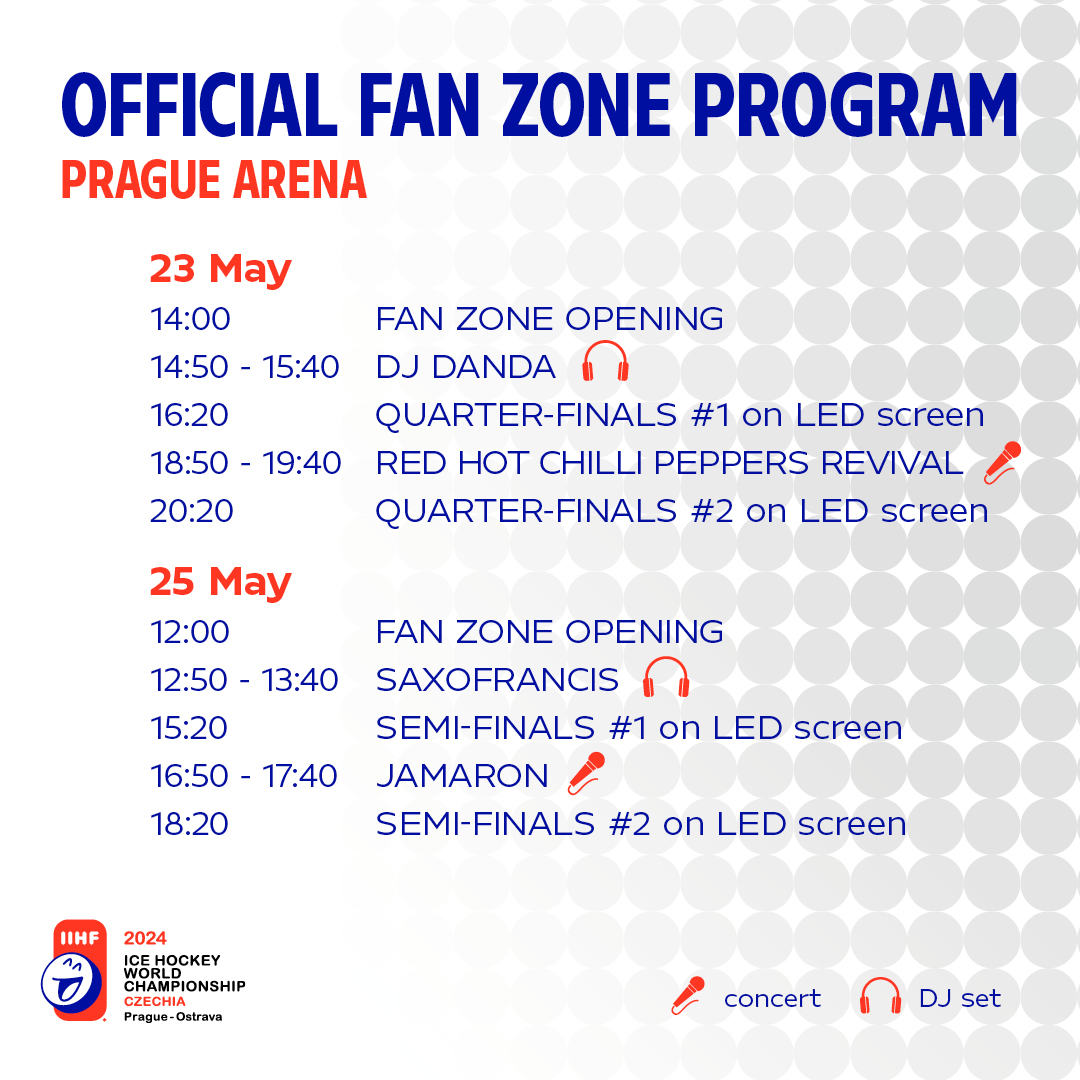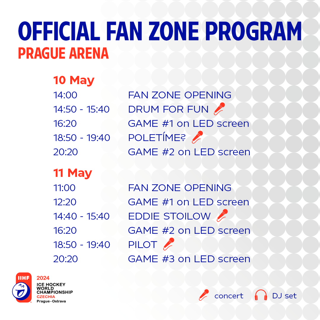 The Official Fan Zone outside the Prague Arena is primarily for you, the fans to thoroughly enjoy the 2024 IIHF Ice Hockey World Championship! Every day, we'll be broadcasting ice hockey games on a large screen. Once again, there will be exciting ice hockey-themed activities for you, as well as a major exhibition by the Official Main Sponsor Skoda, the Official Merchandise store, and activities organized by Official Sponsors and Official Partners. You can also look forward to concerts by popular bands, plenty of good food and drinks. You will also have the opportunity to participate in activation games, win exciting prizes or purchase souvenirs.