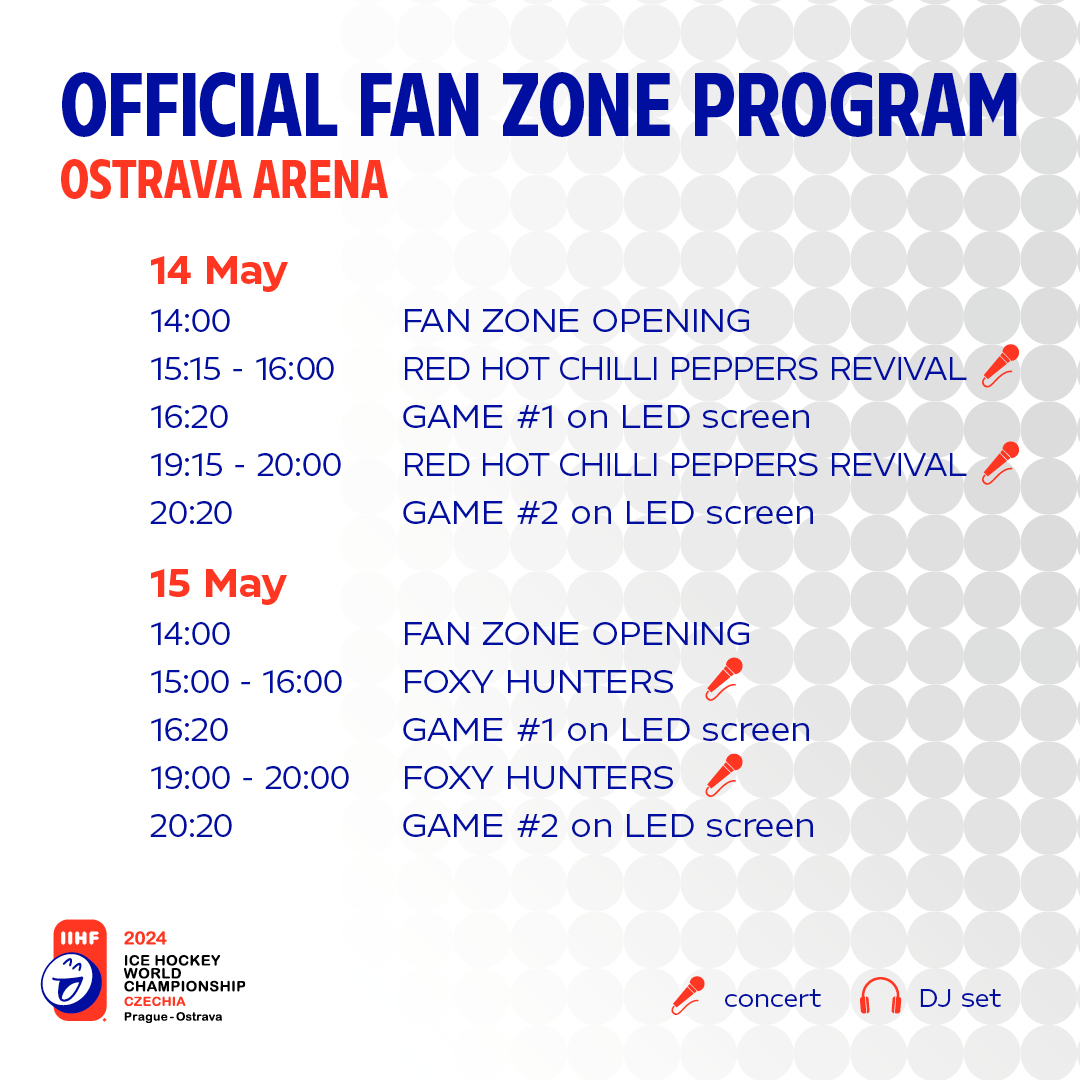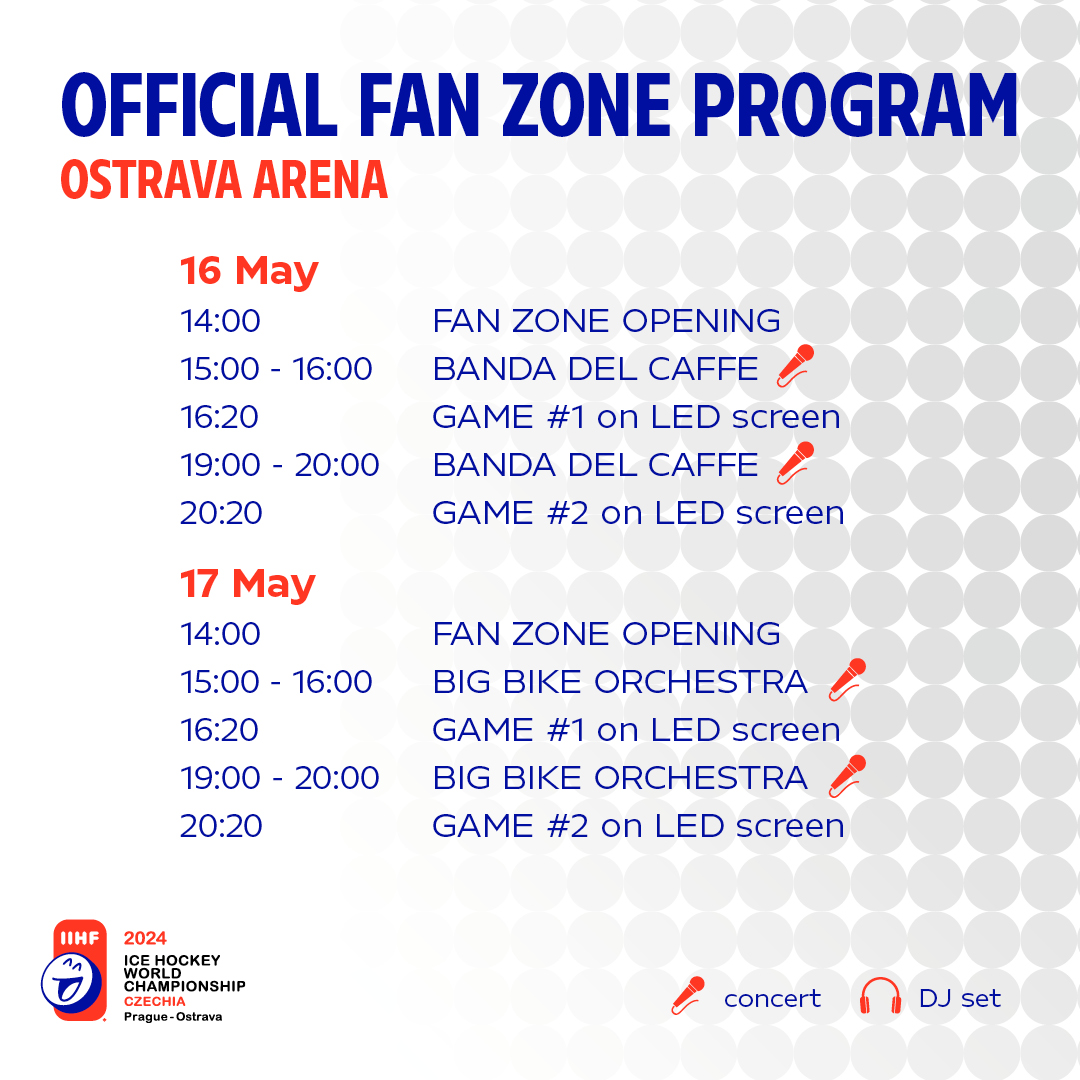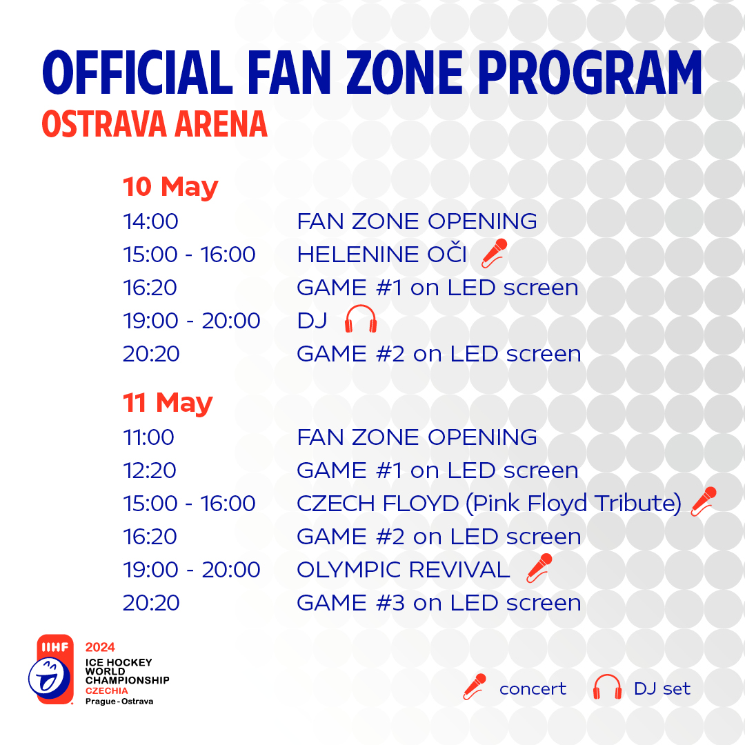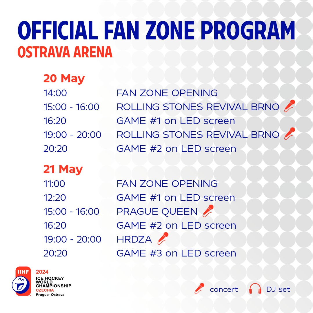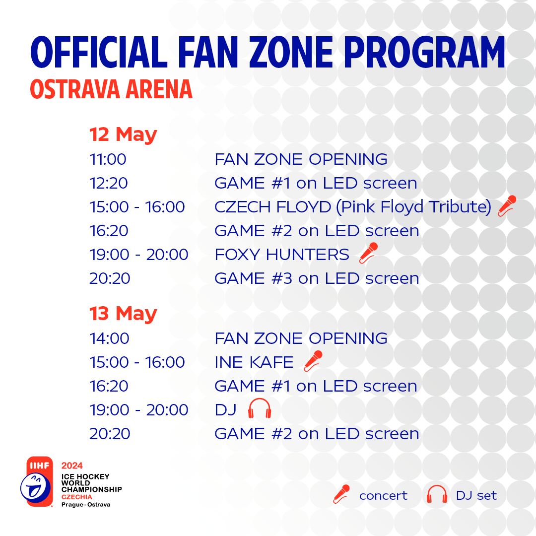 The Official Fan Zone outside the Ostrava Arena is primarily for you, the fans to thoroughly enjoy the 2024 IIHF Ice Hockey World Championship! Every day, we'll be broadcasting ice hockey games on a large screen. Once again, there will be exciting ice hockey-themed activities for you, as well as a major exhibition by the Official Main Sponsor Skoda, the Official Merchandise store, and activities organized by Official Sponsors and Official Partners. You can also look forward to concerts by popular bands, plenty of good food and drinks. You will also have the opportunity to participate in activation games, win exciting prizes or purchase souvenirs.OPENING HOURS (only on game days):