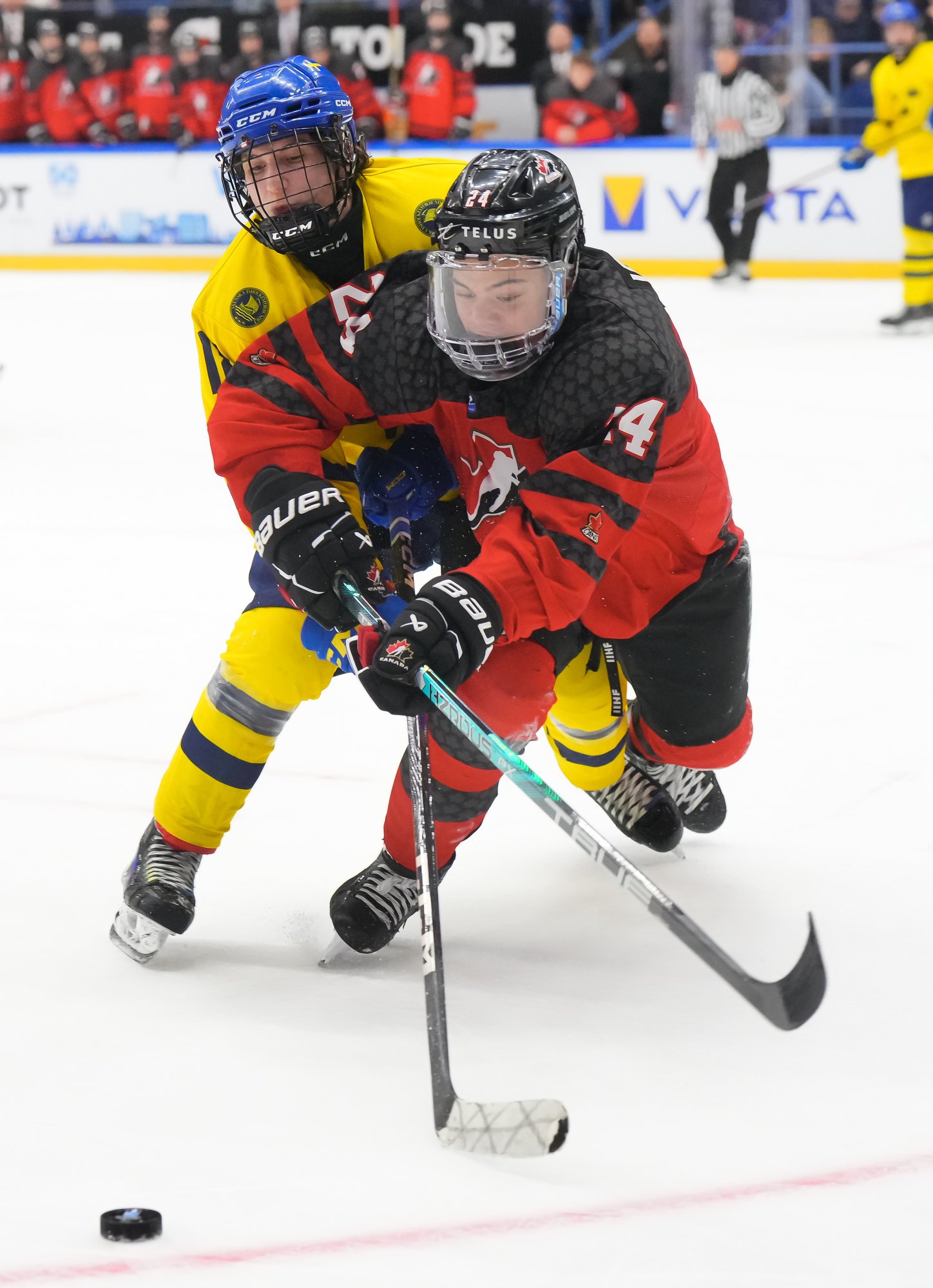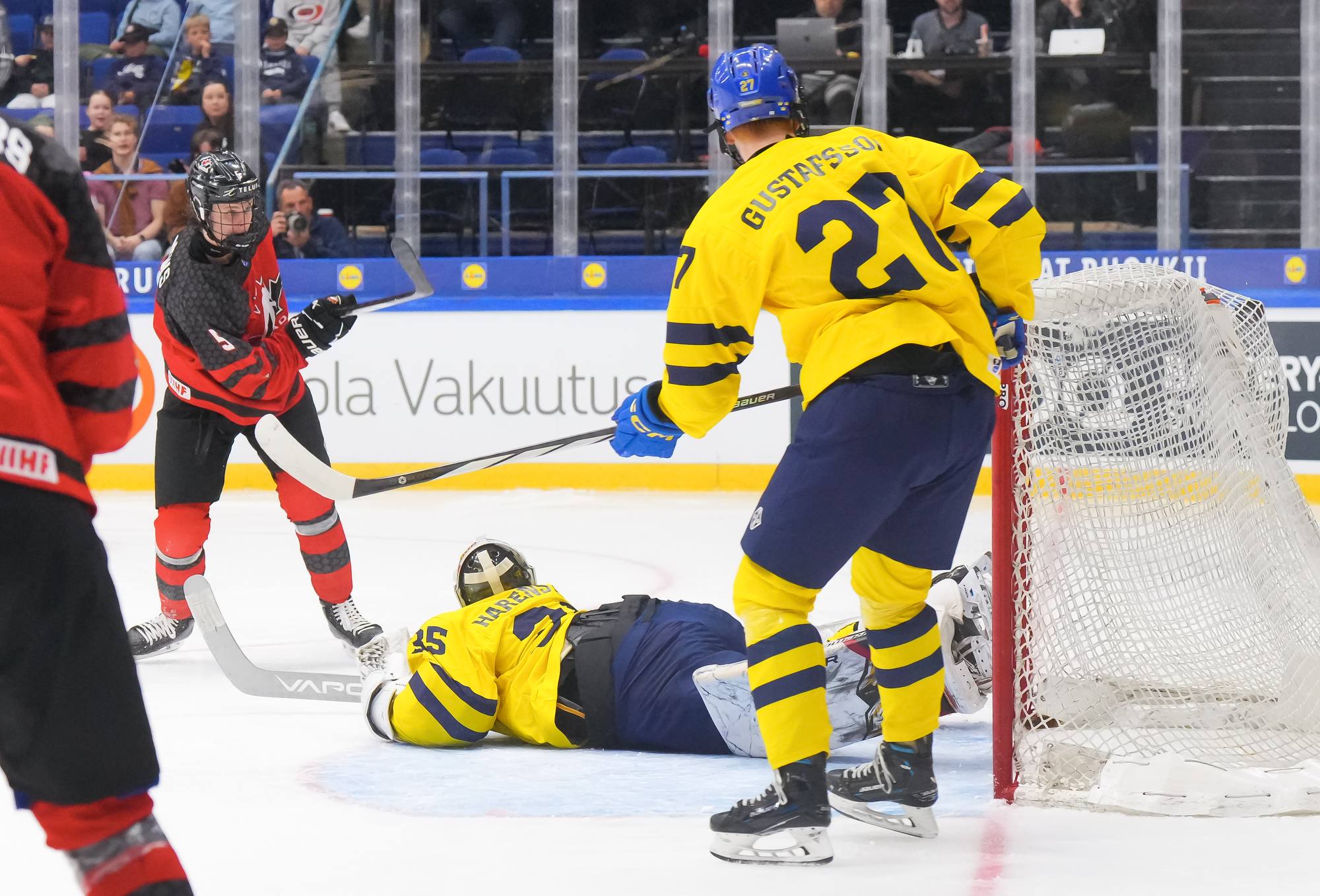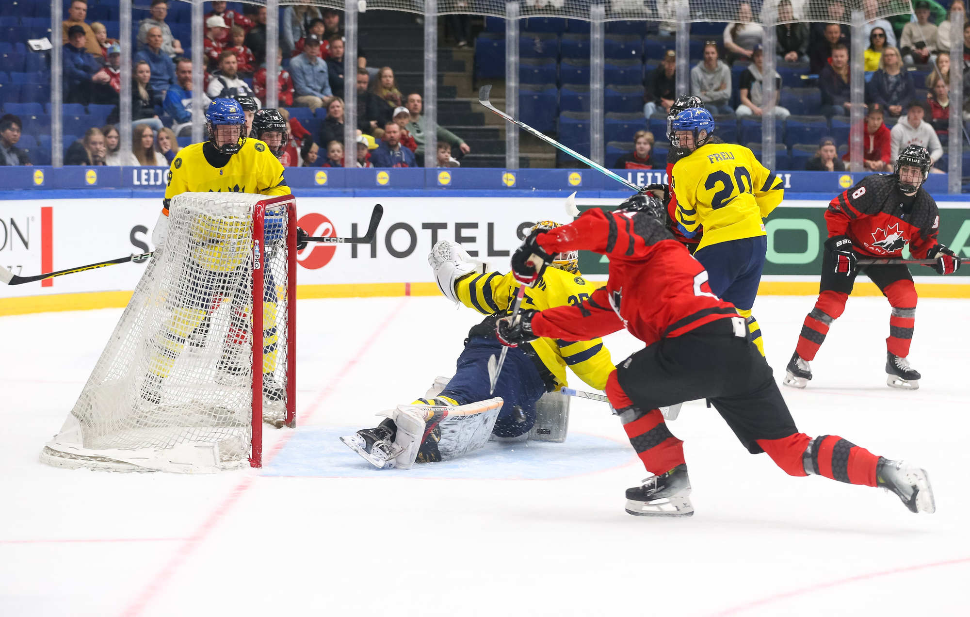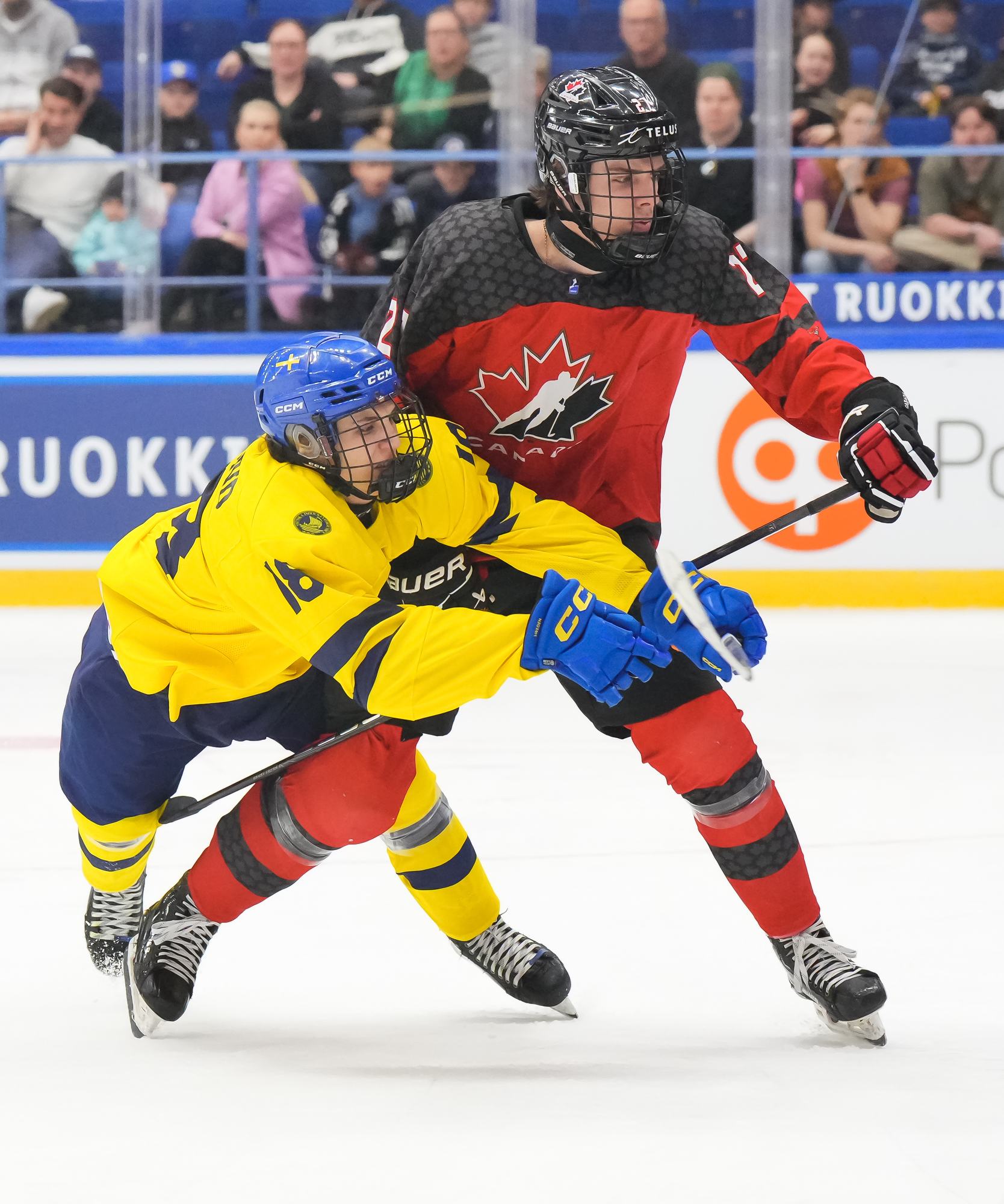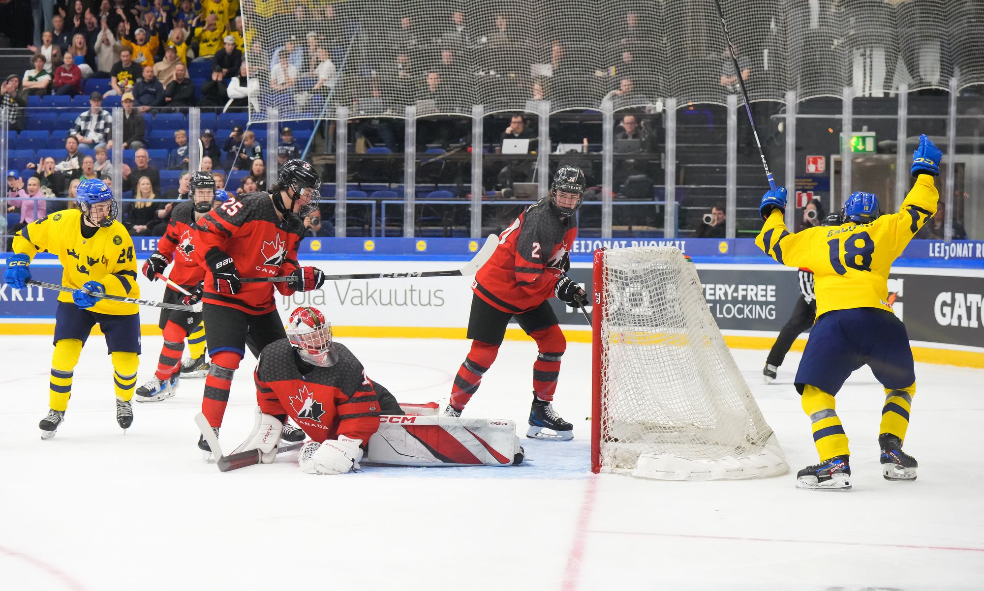 Canada jumped out to a 4-0 first period lead and led 5-1 in the second but had to defend a one-goal lead late in the game as the Swedes never went away. Canada held on for a 5-4 win and a berth in the gold medal game at the 2024 IIHF U18 World Championship.