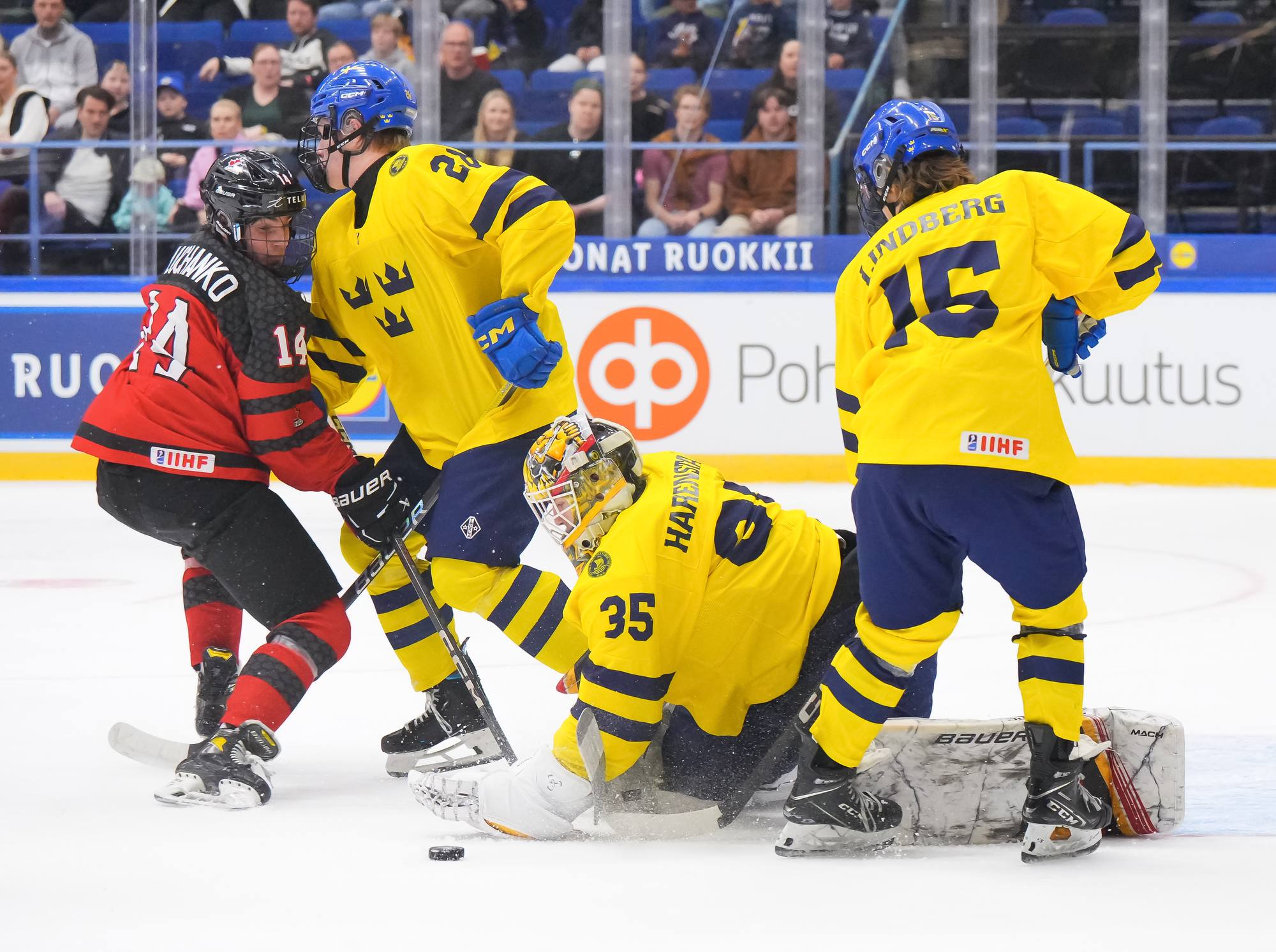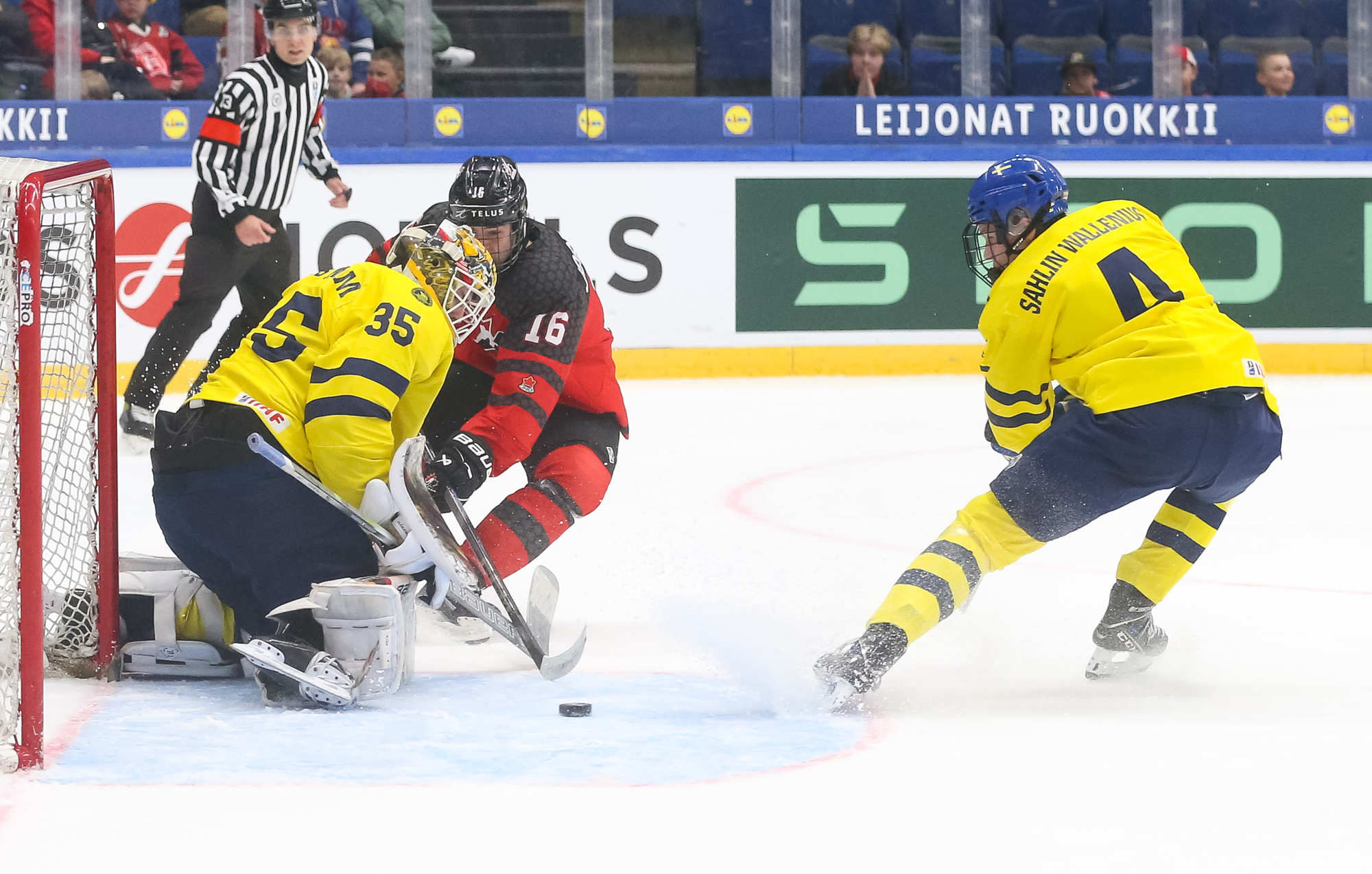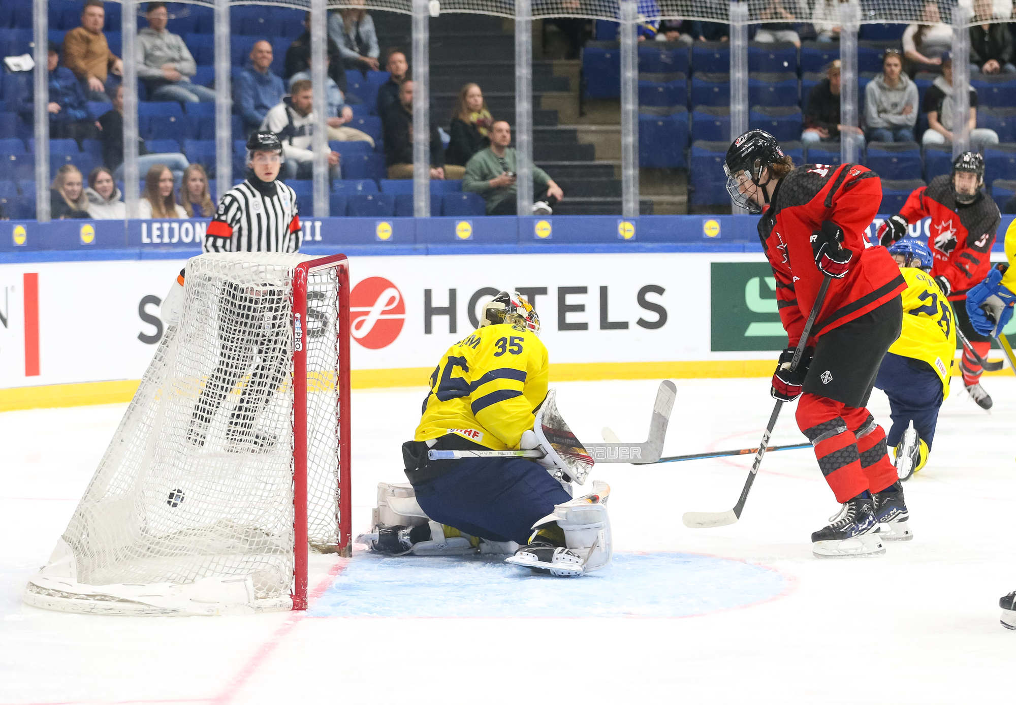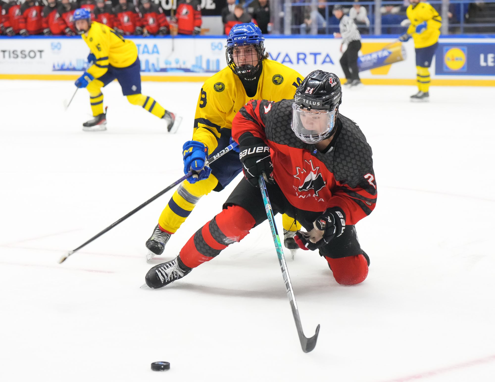 Canada jumped out to a 4-0 first period lead and led 5-1 in the second but had to defend a one-goal lead late in the game as the Swedes never went away. Canada held on for a 5-4 win and a berth in the gold medal game at the 2024 IIHF U18 World Championship.