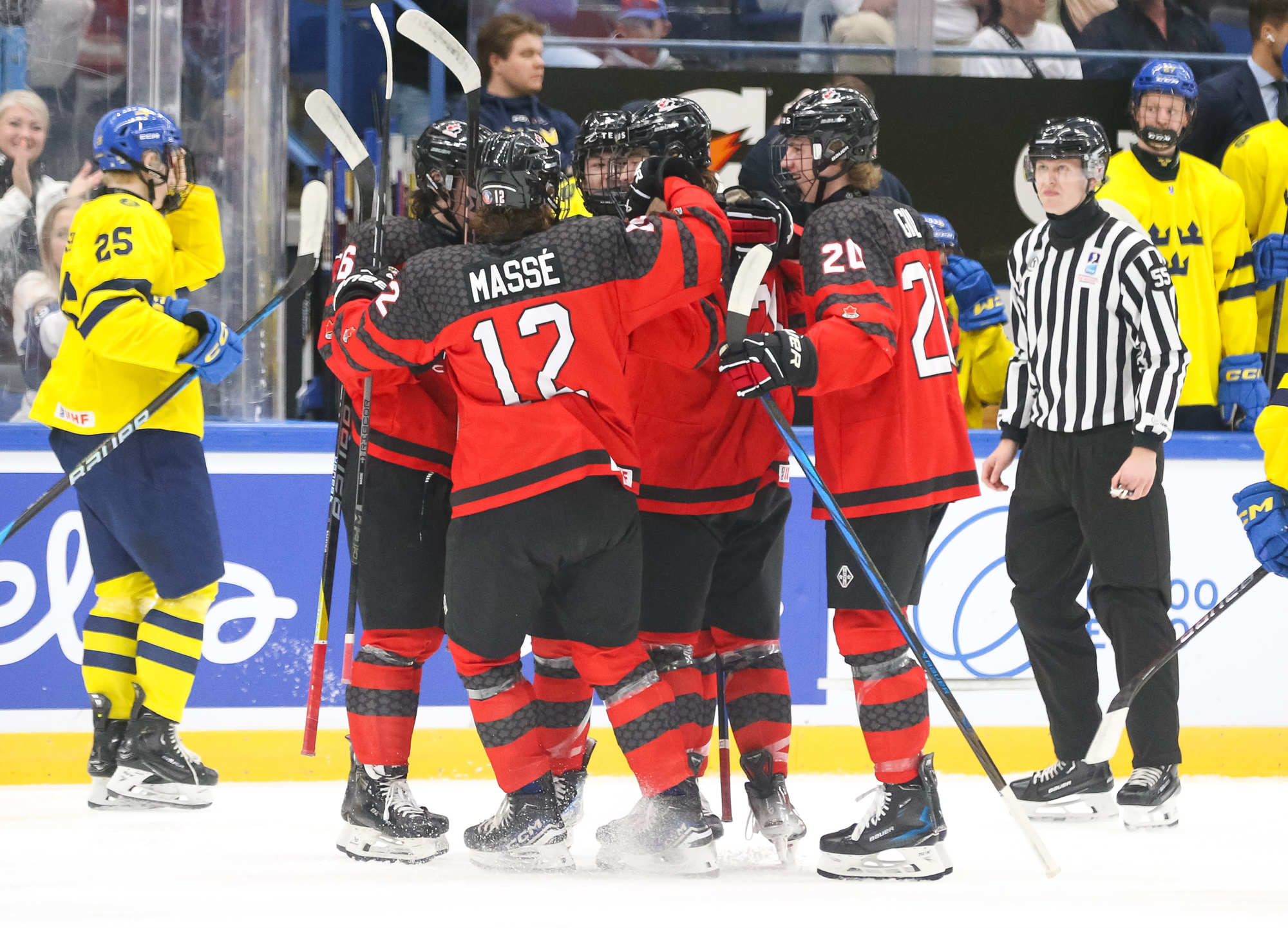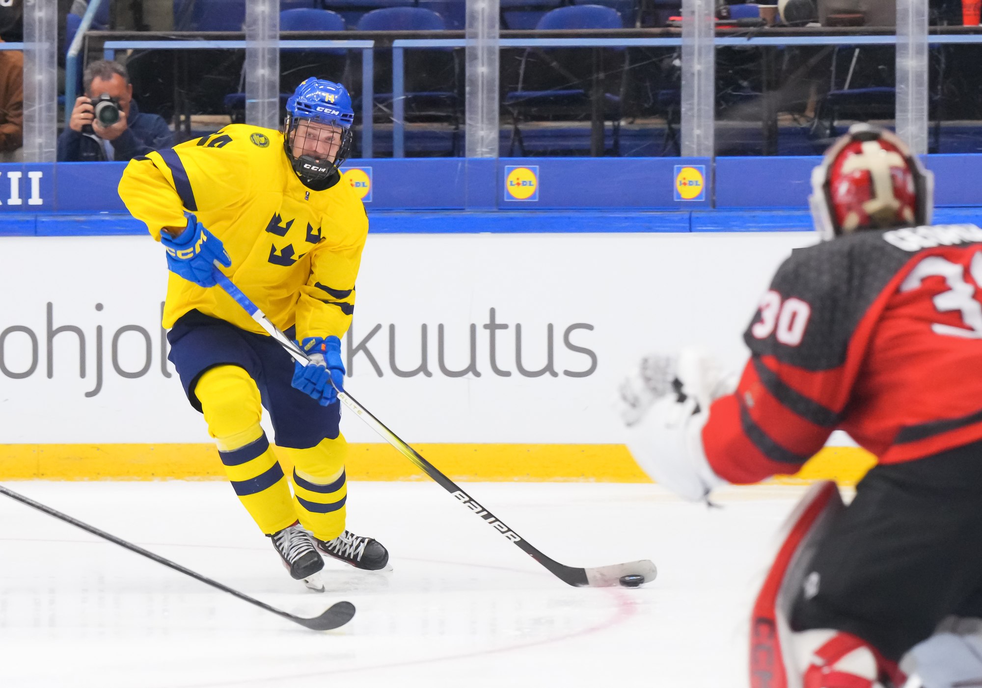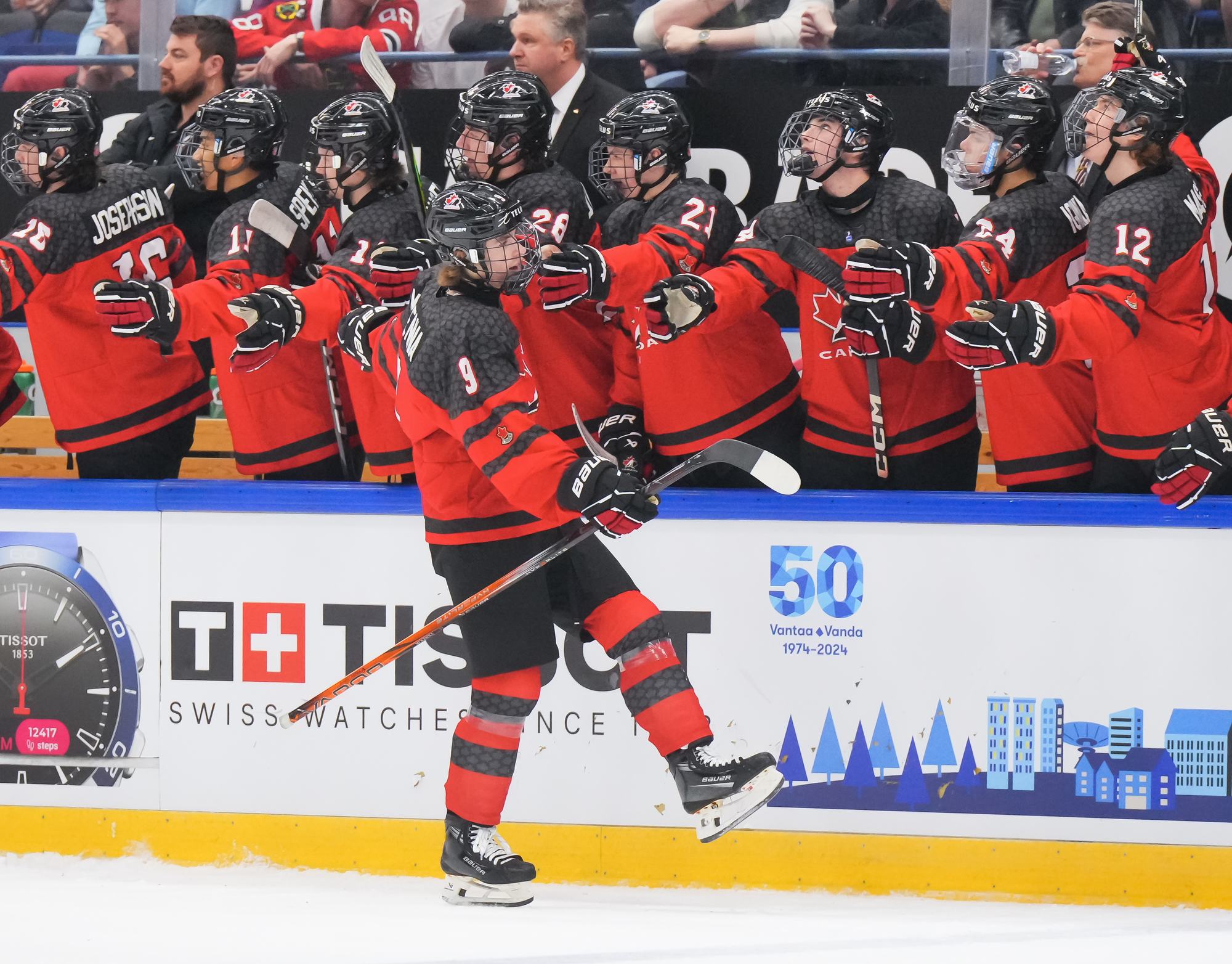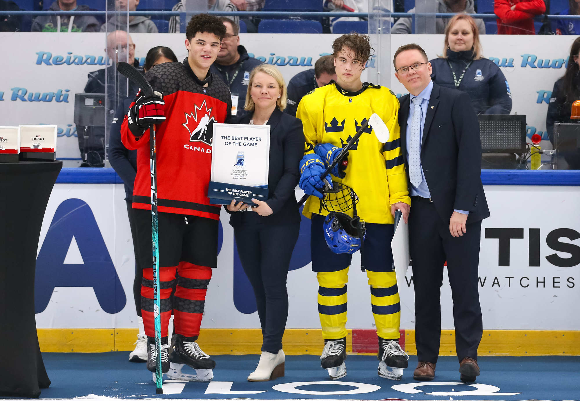 Canada jumped out to a 4-0 first period lead and led 5-1 in the second but had to defend a one-goal lead late in the game as the Swedes never went away. Canada held on for a 5-4 win and a berth in the gold medal game at the 2024 IIHF U18 World Championship.