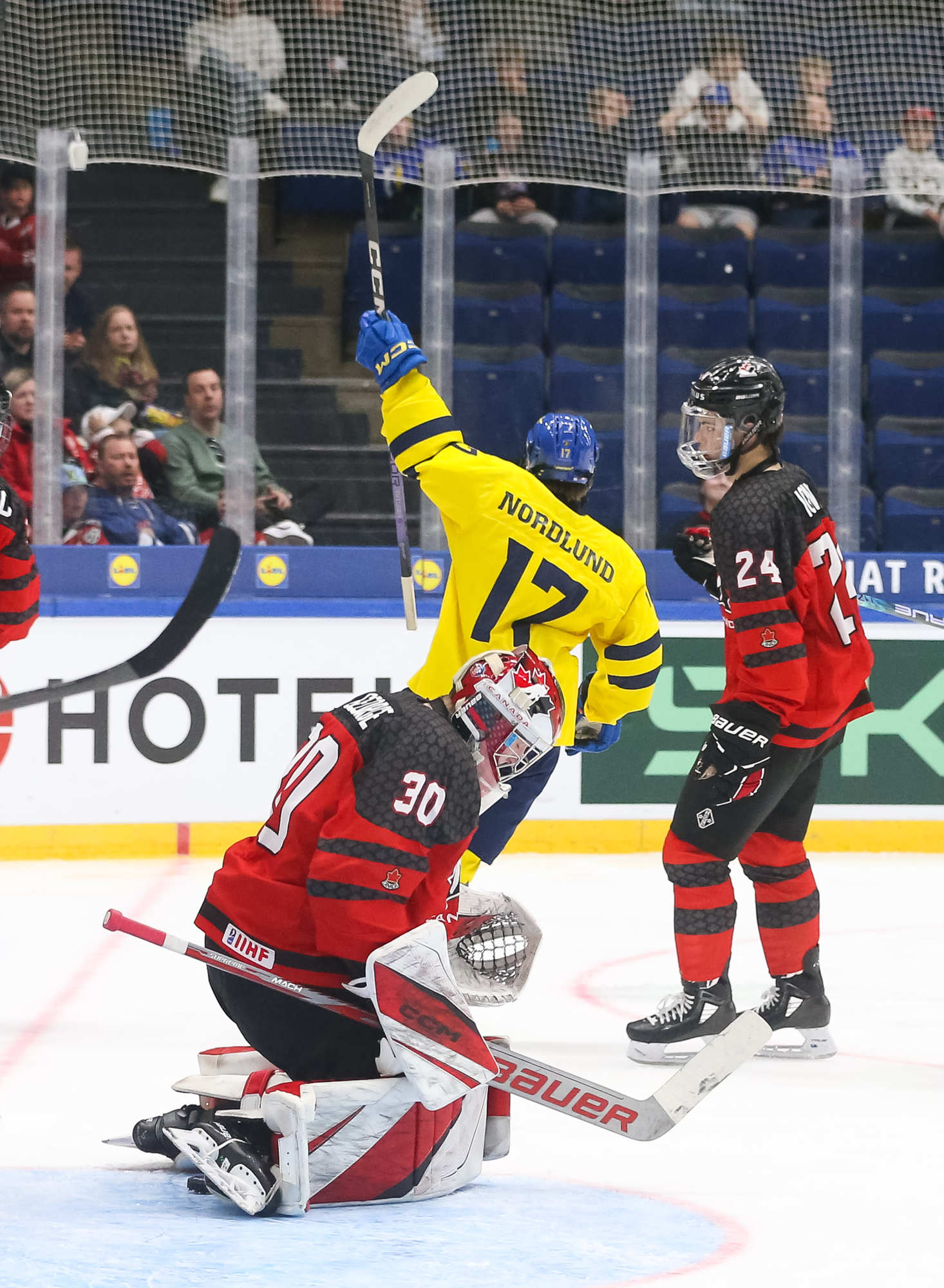 The Swedes wouldn’t go away, however. At 8:29 Nordlund played give-and-go with Alfons Freij and buried his second of the game to make it 5-2 Canada. Nordlund had a chance for the hat trick late in the second on a breakaway but George came up with another big save.