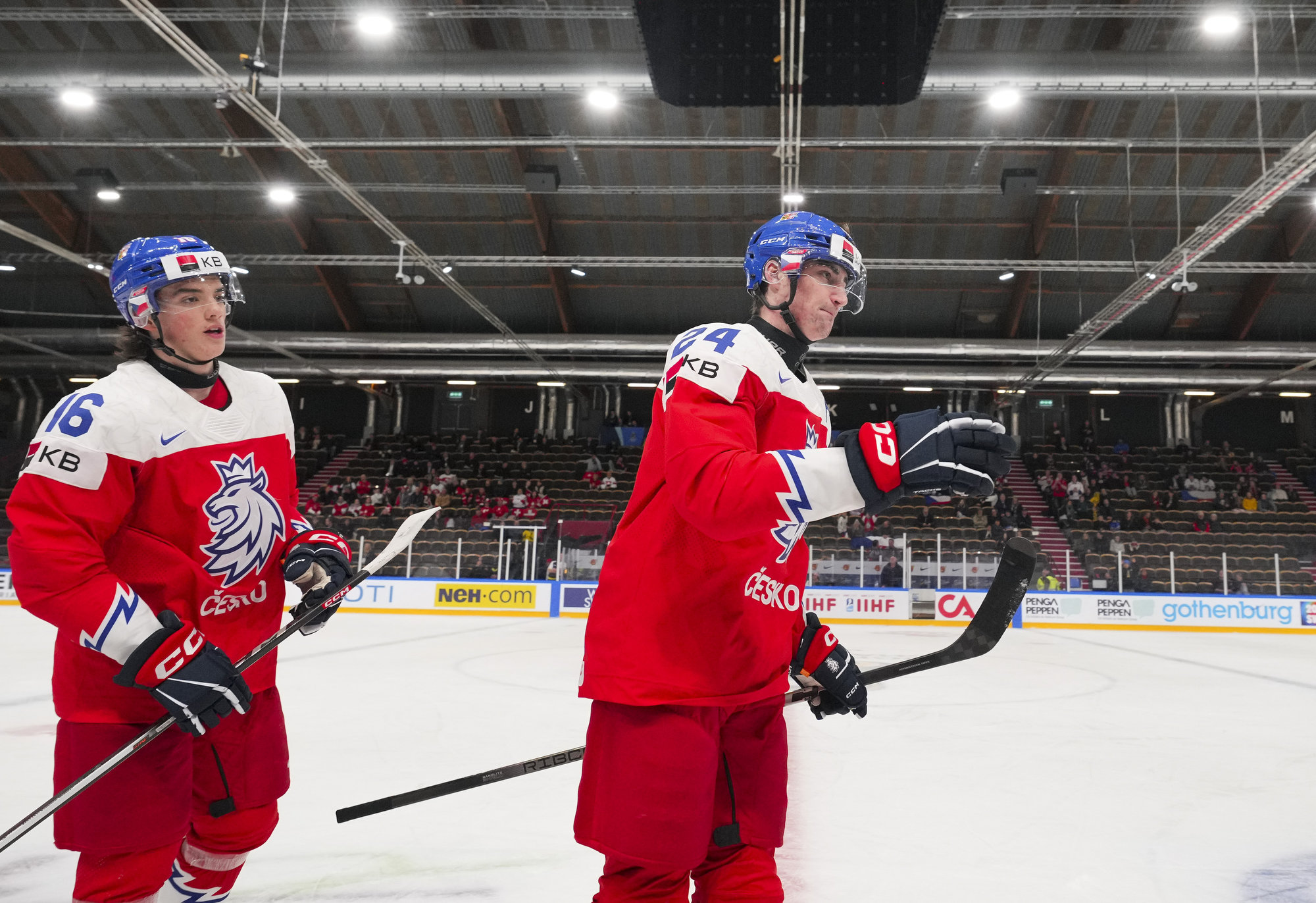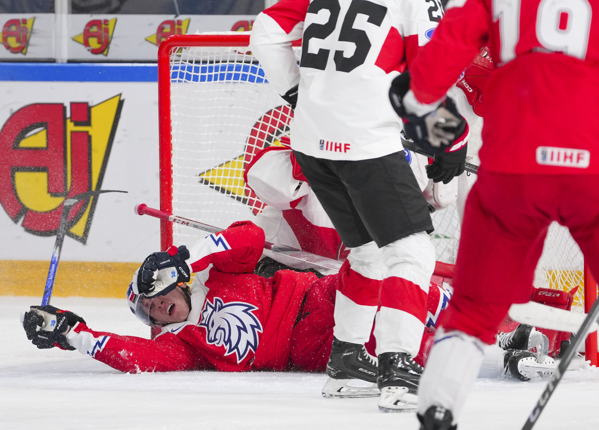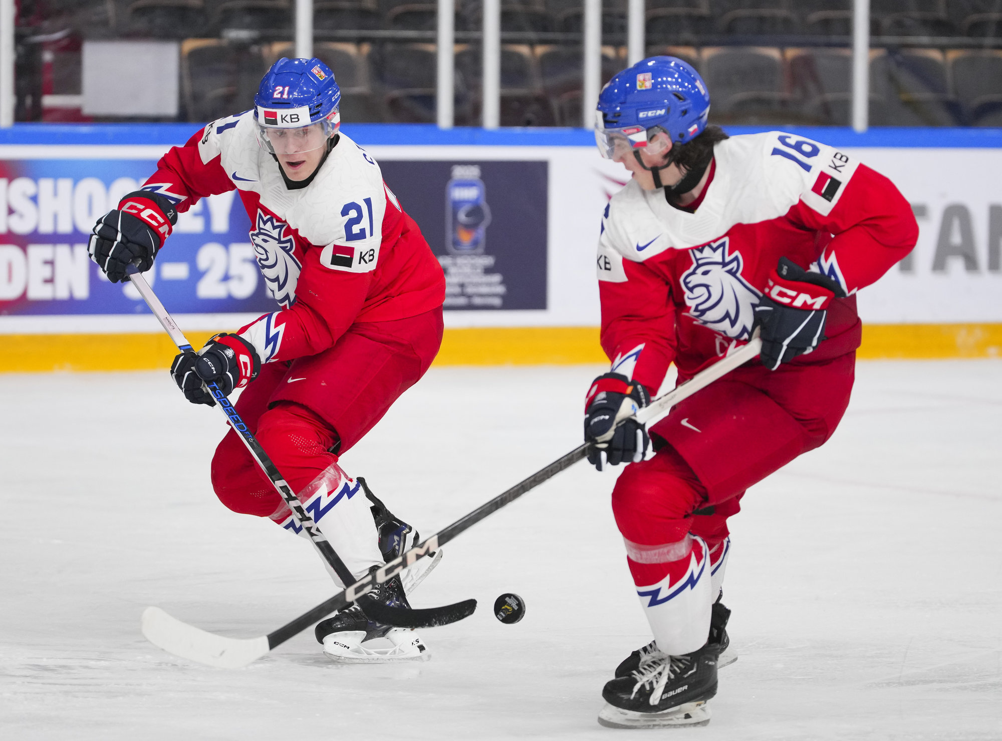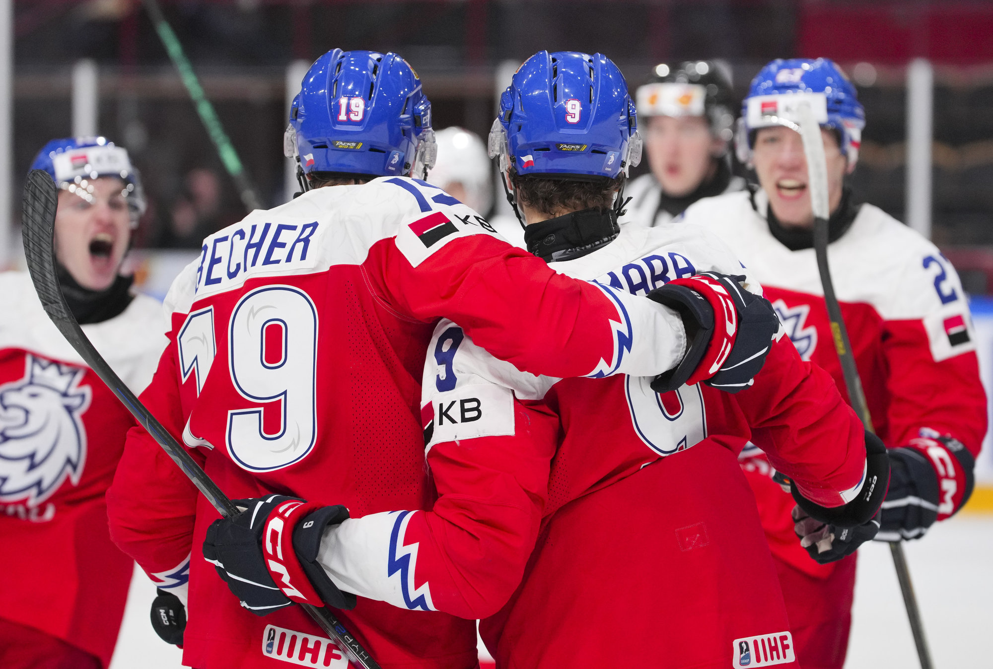 Matyas Sapovaliv (#24, right) celebrates after scoring the first Czech goal in a 4-2 win over Switzerland at the 2024 IIHF World Junior Championship.
