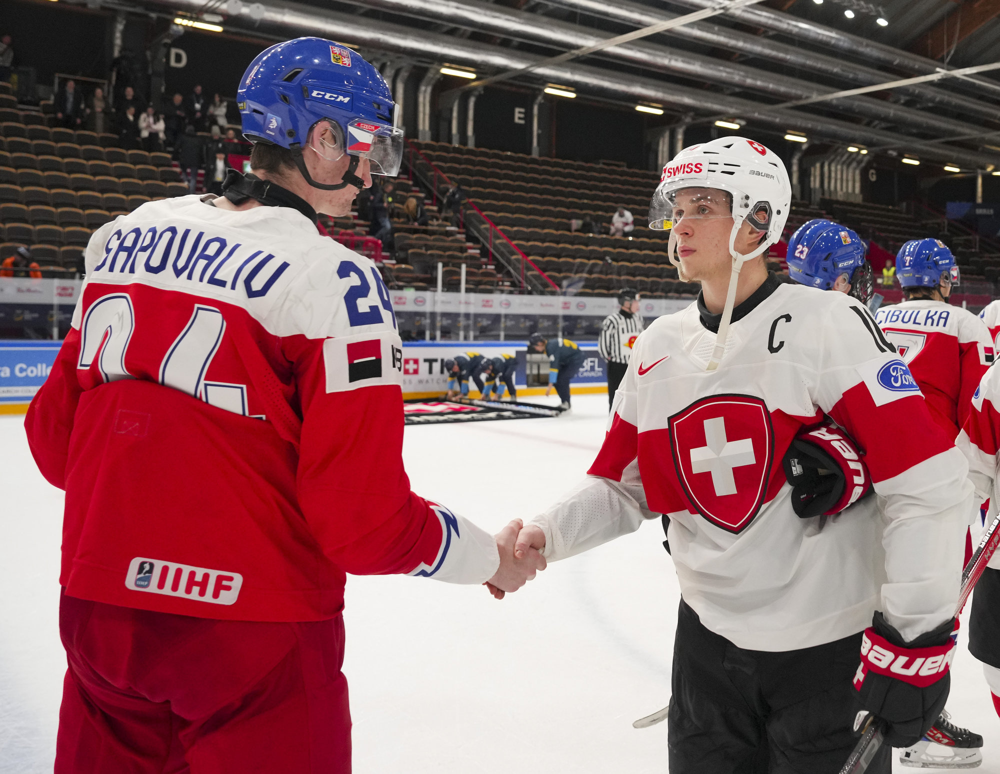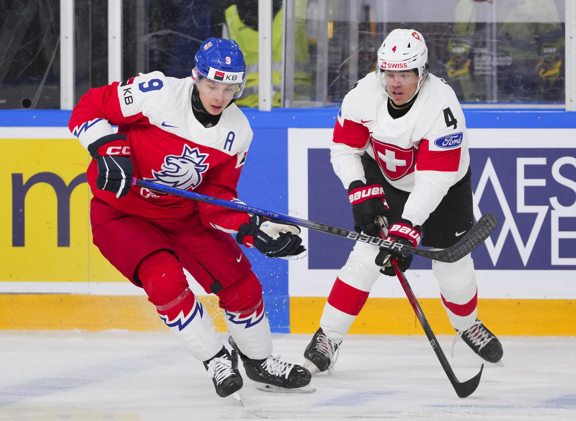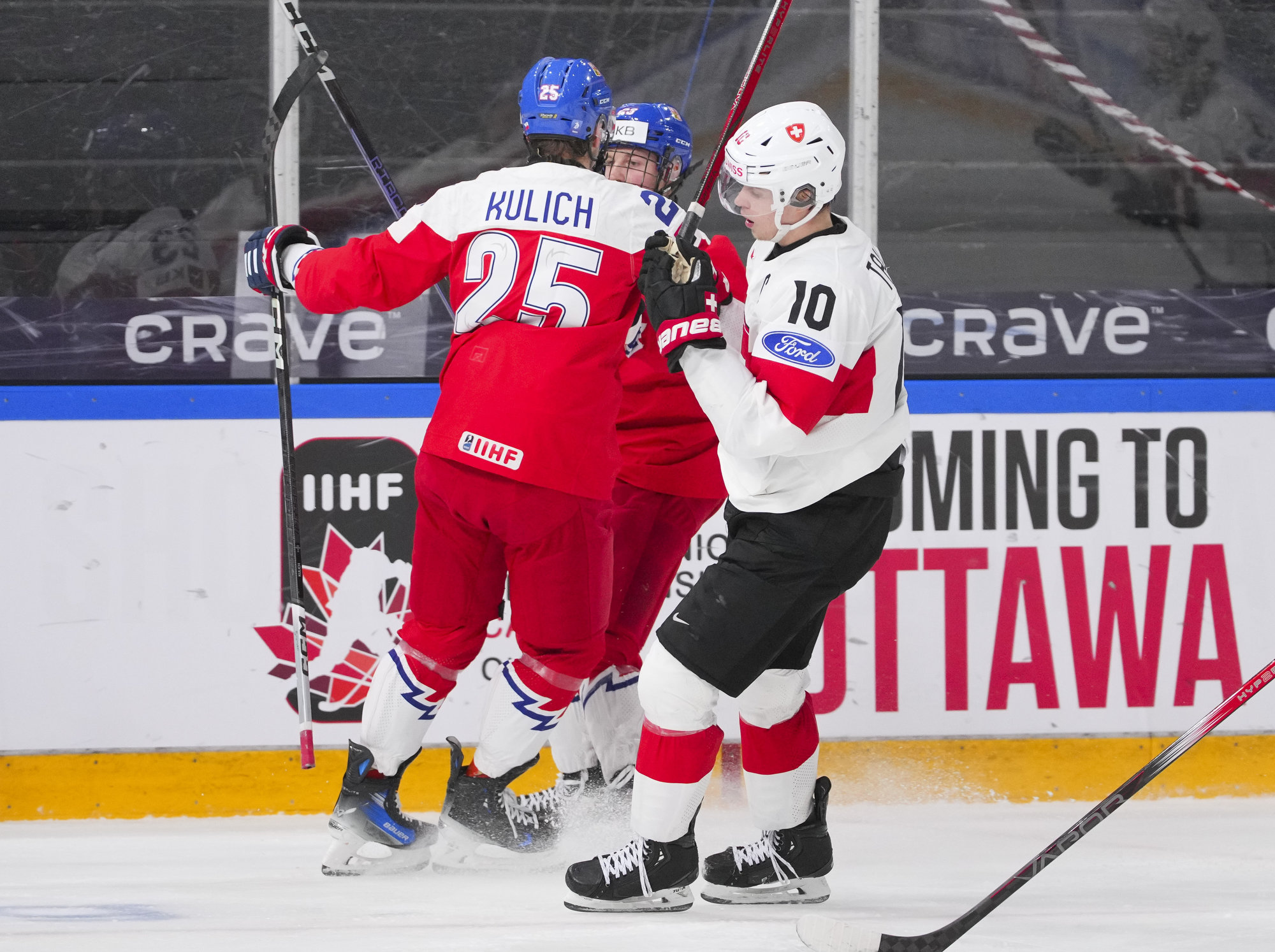 Czech assistant captain Matyas Sapovaliv opened the scoring at 12:04, putting a power-play rebound past Swiss goalie Alessio Beglieri for his third goal of the tournament.