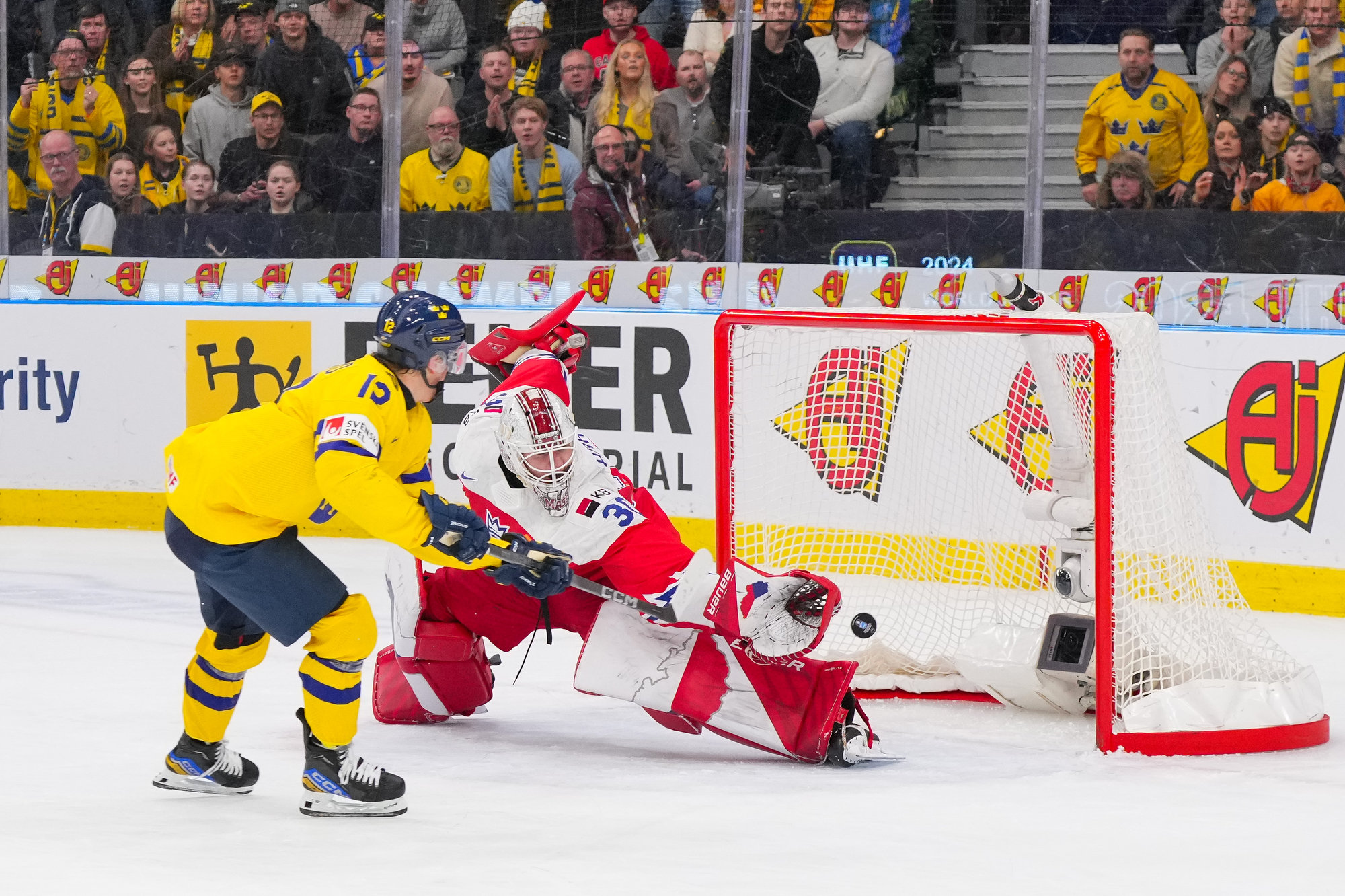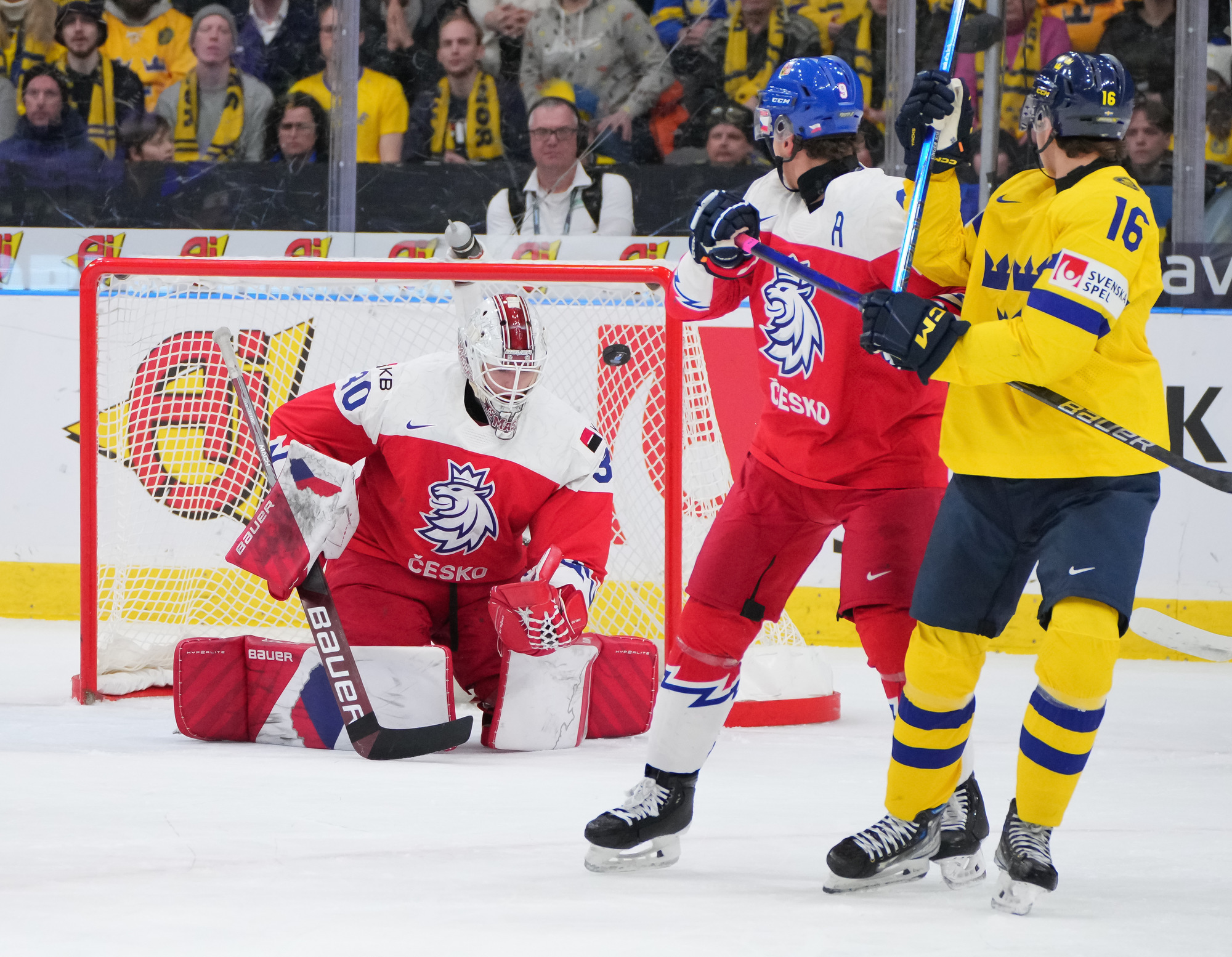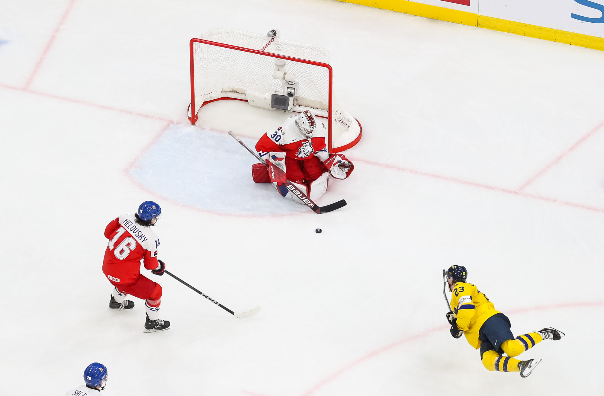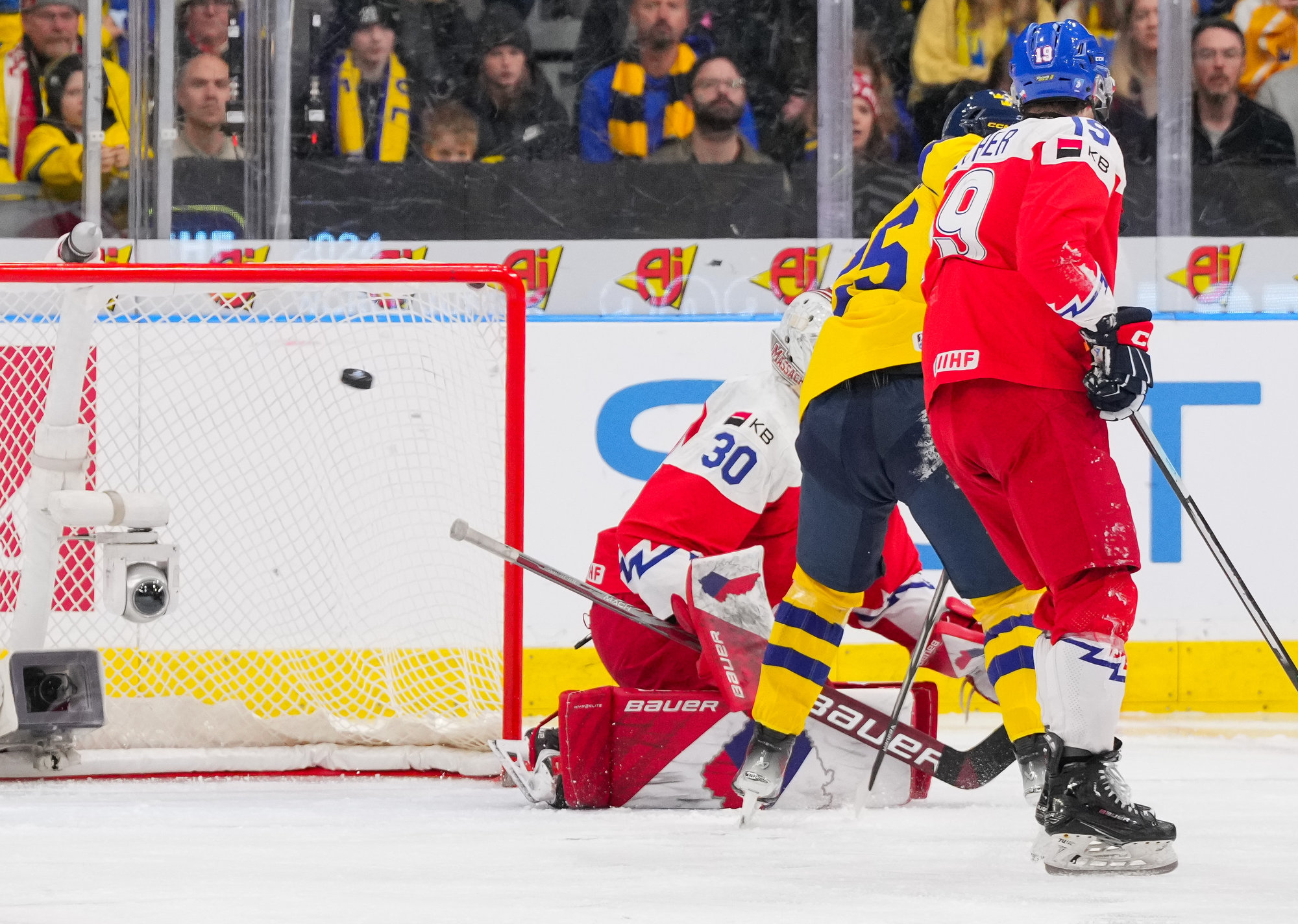 Just 16 seconds after it began, Sandin Pellikka teed up a pass for Lekkerimaki, and he wired a bullet past Hrabal from the point at 5:14. But the Swedes were only just getting started. They opened a two-goal lead at 12:00 when Lindstein fed Noah Ostlund a torpedo pass. Ostlund went in alone and beat Hrabal with a backhand over--you guessed it--the glove.