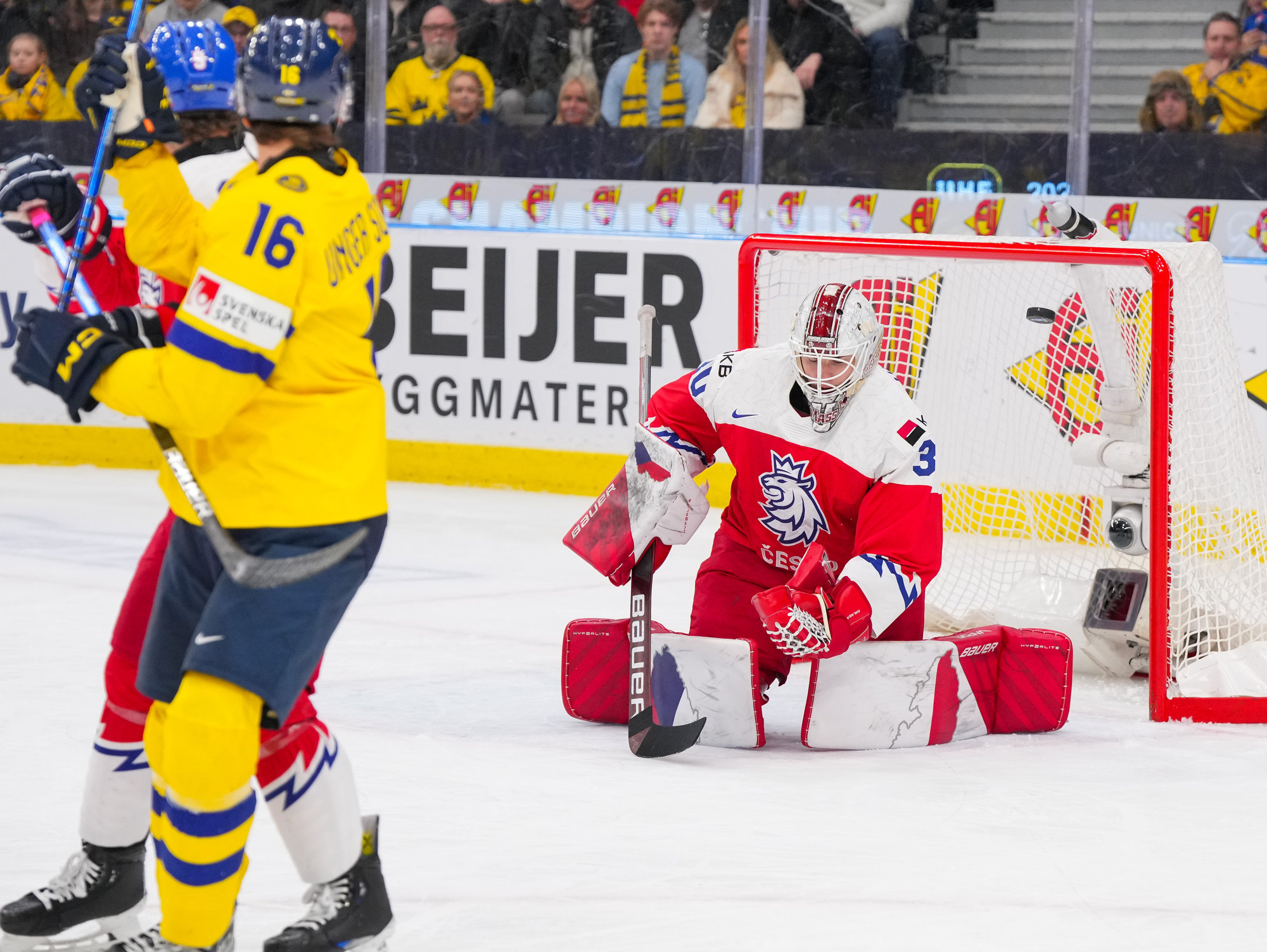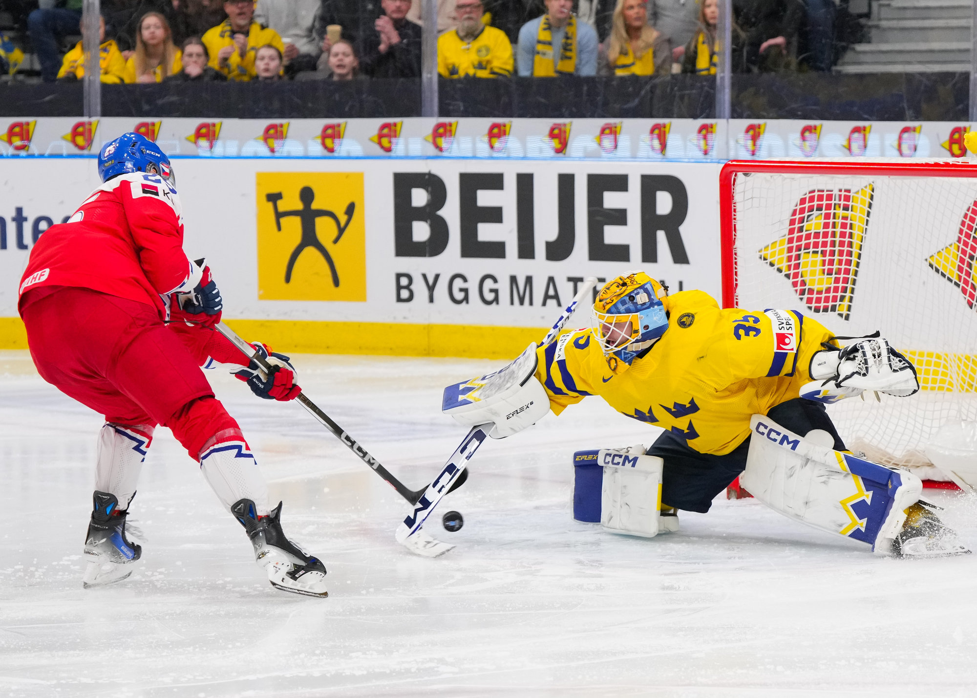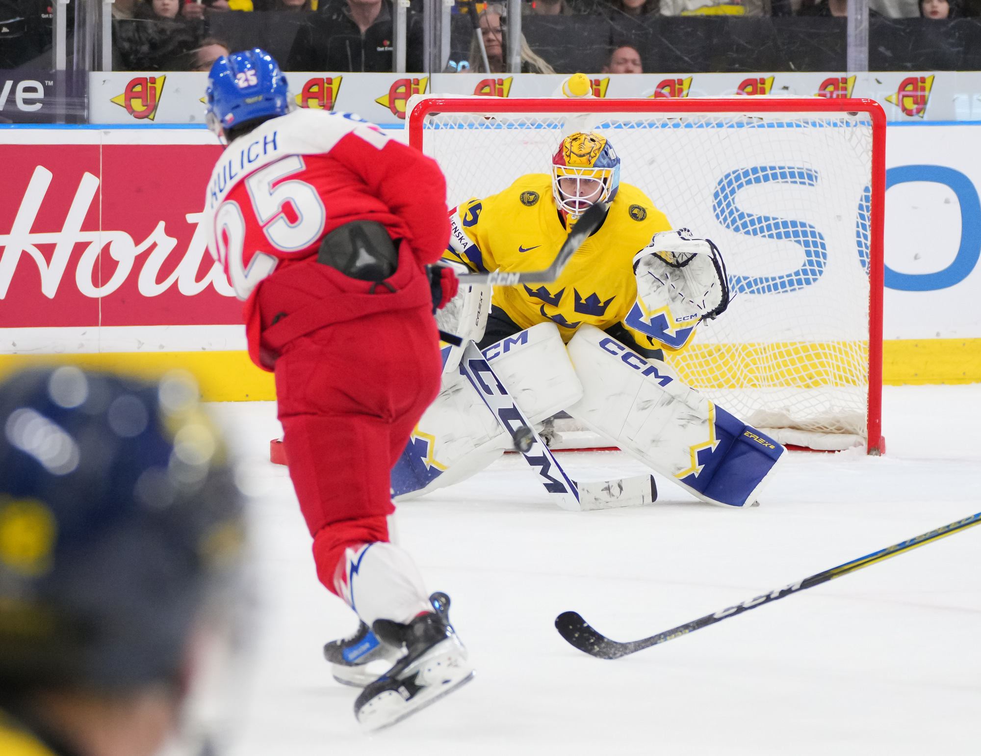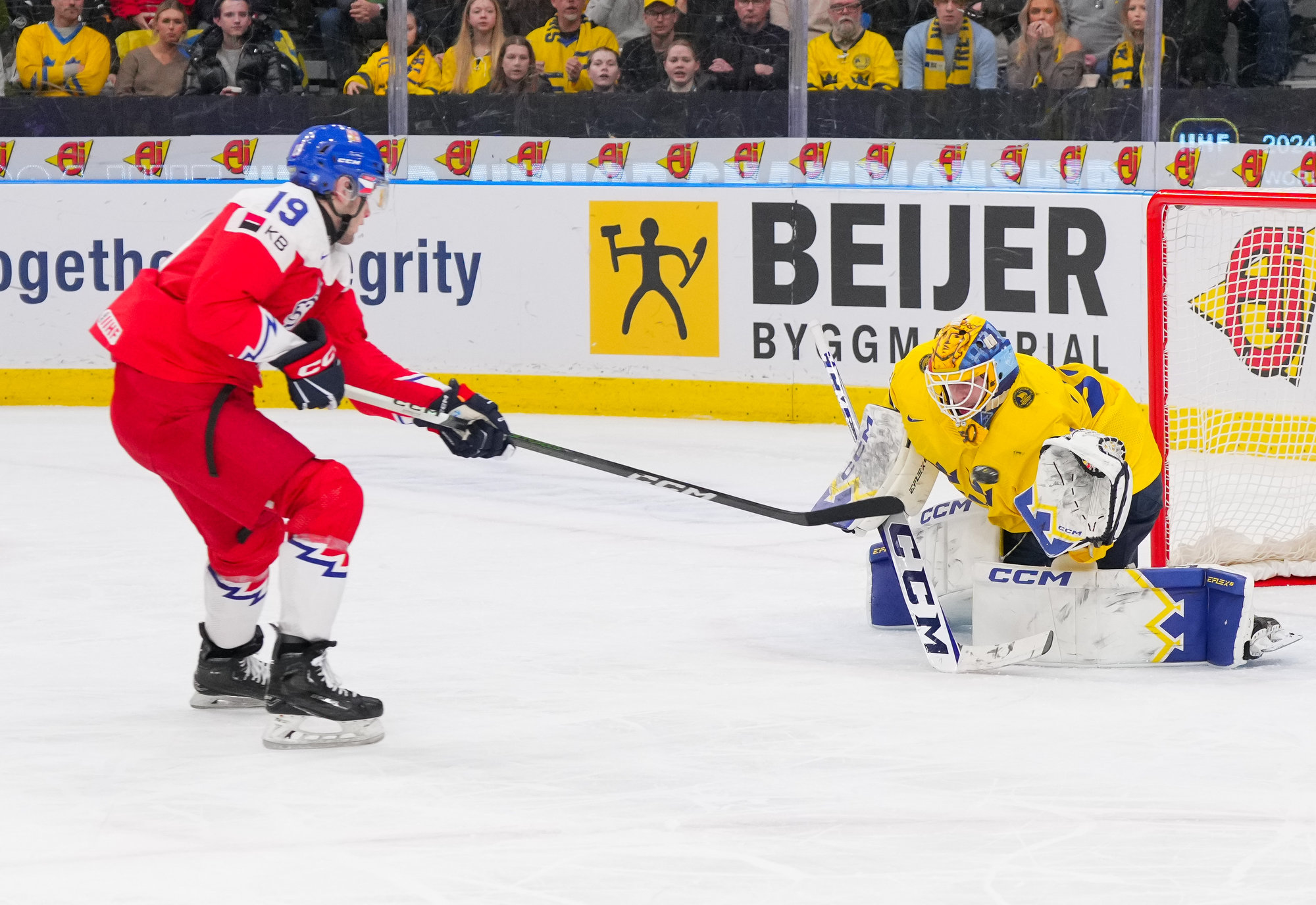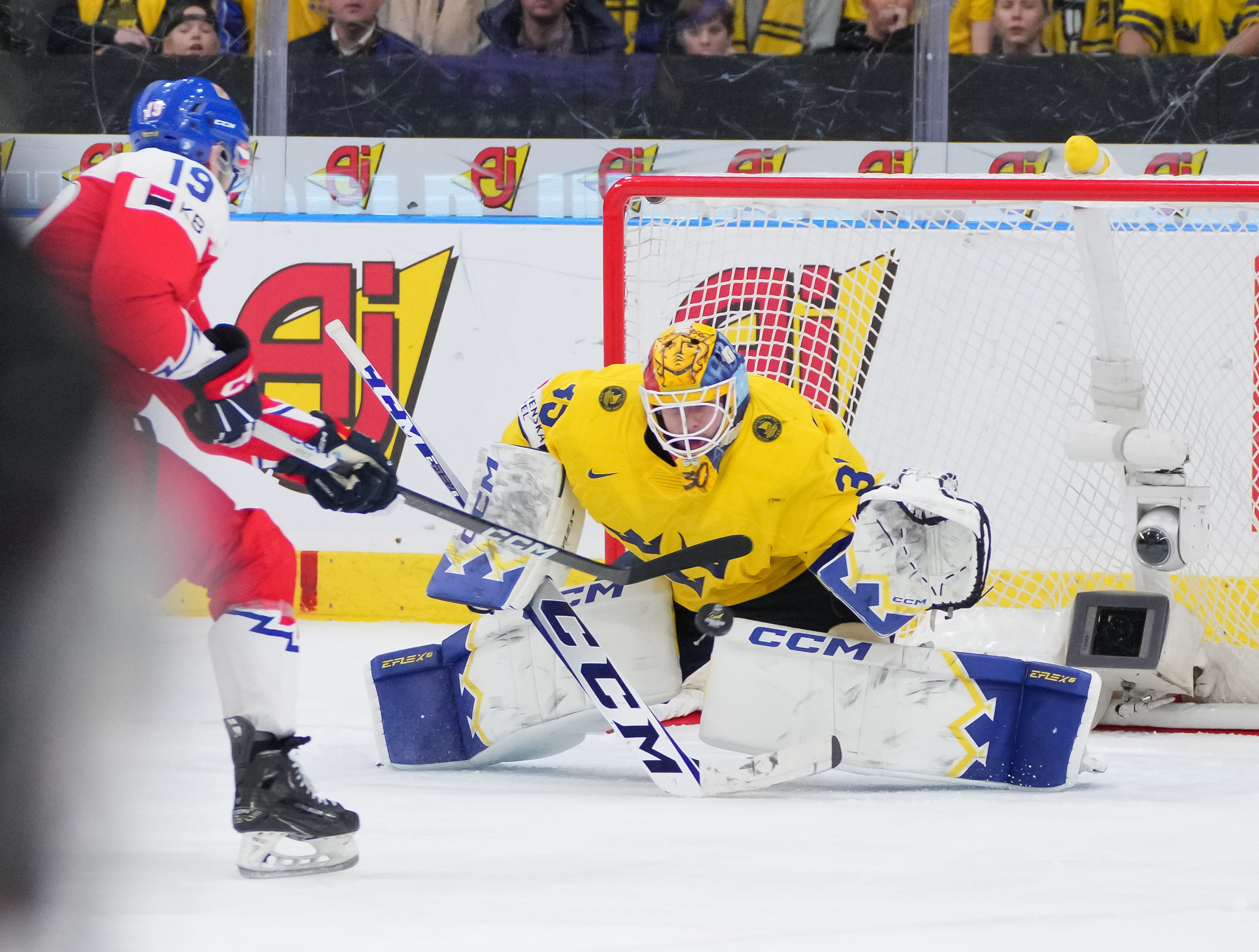Just 16 seconds after it began, Sandin Pellikka teed up a pass for Lekkerimaki, and he wired a bullet past Hrabal from the point at 5:14. But the Swedes were only just getting started. They opened a two-goal lead at 12:00 when Lindstein fed Noah Ostlund a torpedo pass. Ostlund went in alone and beat Hrabal with a backhand over--you guessed it--the glove.
