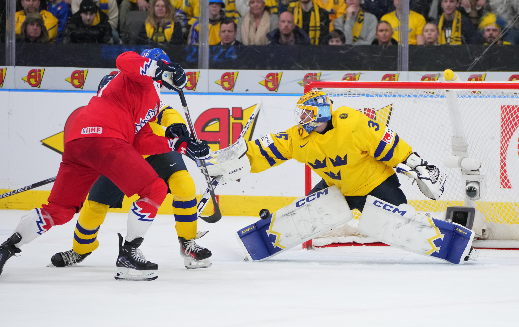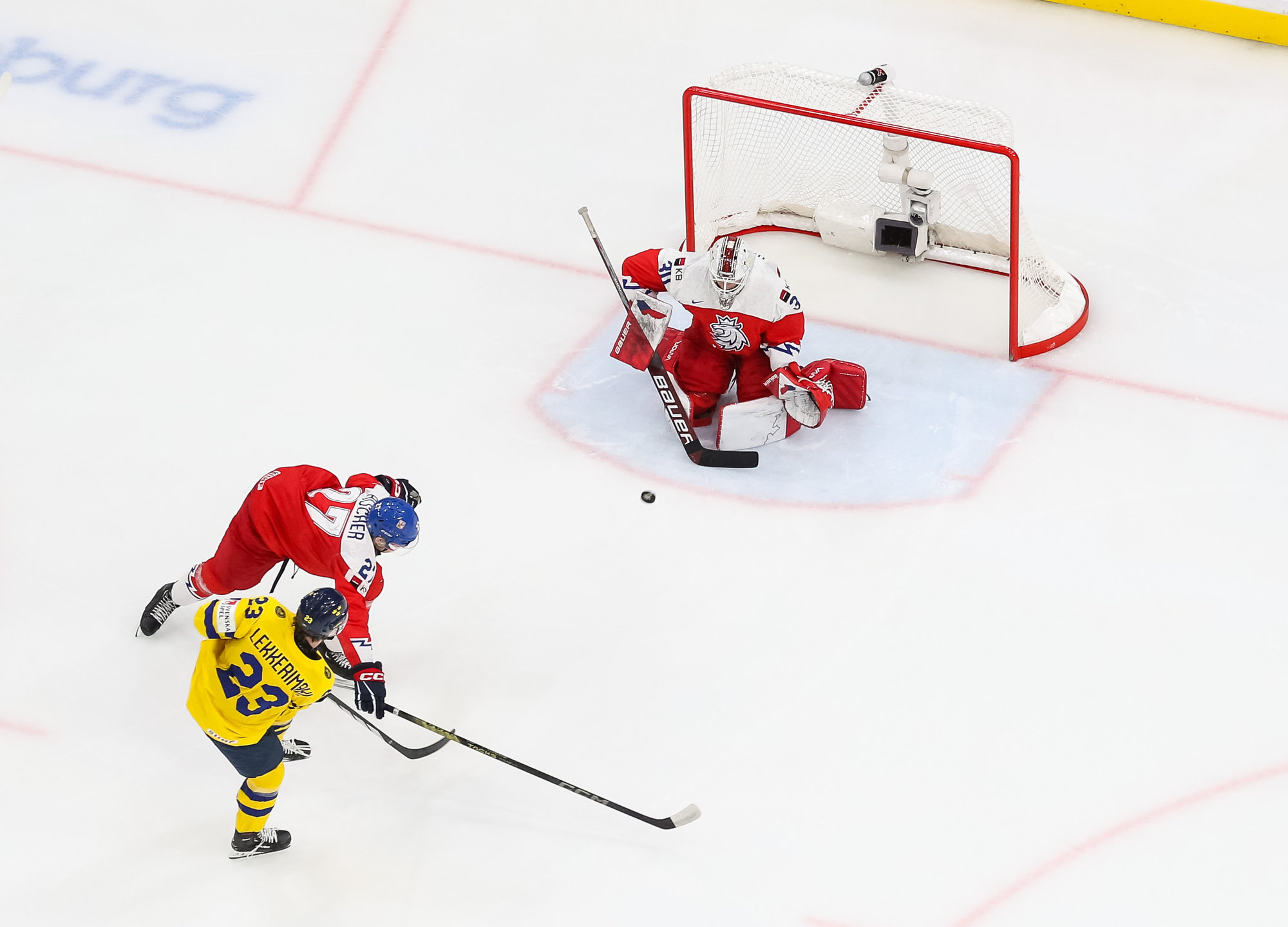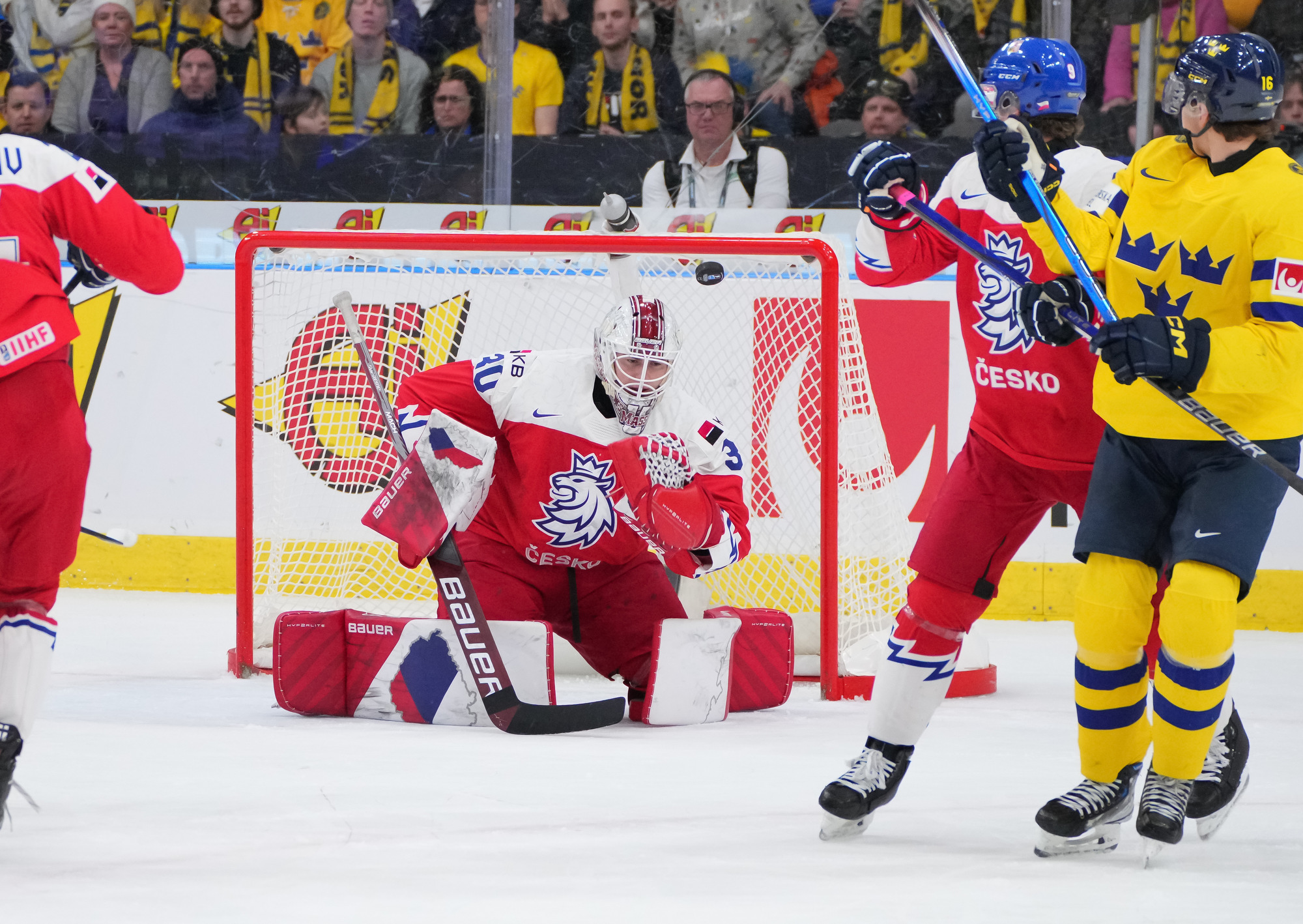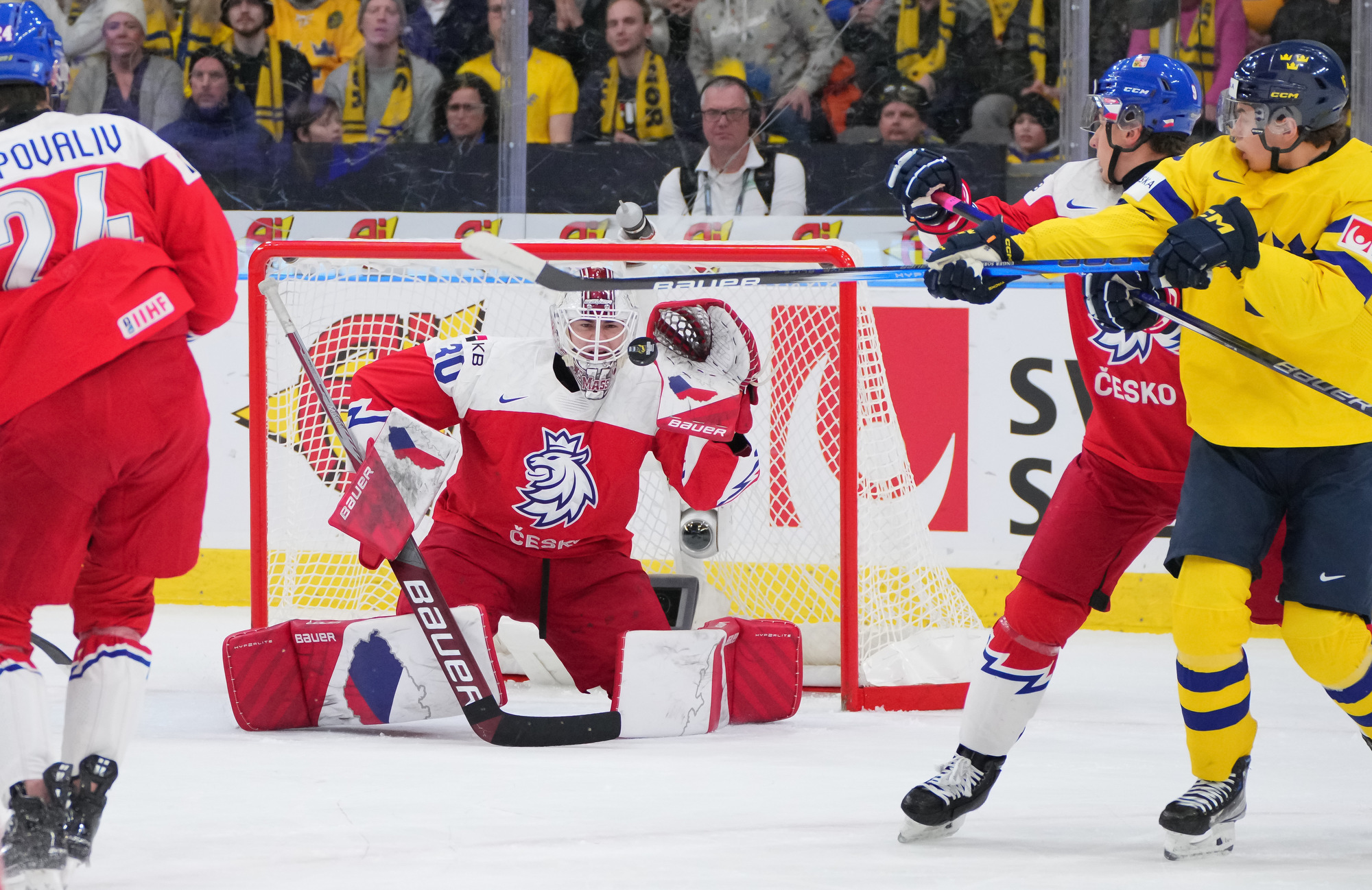 Just 16 seconds after it began, Sandin Pellikka teed up a pass for Lekkerimaki, and he wired a bullet past Hrabal from the point at 5:14. But the Swedes were only just getting started. They opened a two-goal lead at 12:00 when Lindstein fed Noah Ostlund a torpedo pass. Ostlund went in alone and beat Hrabal with a backhand over--you guessed it--the glove.