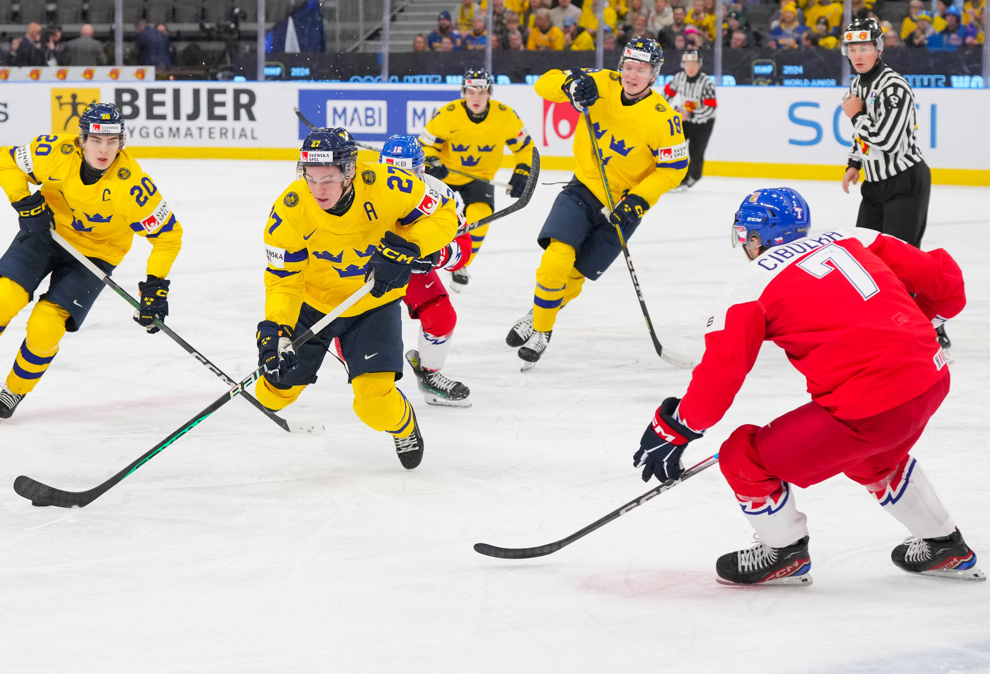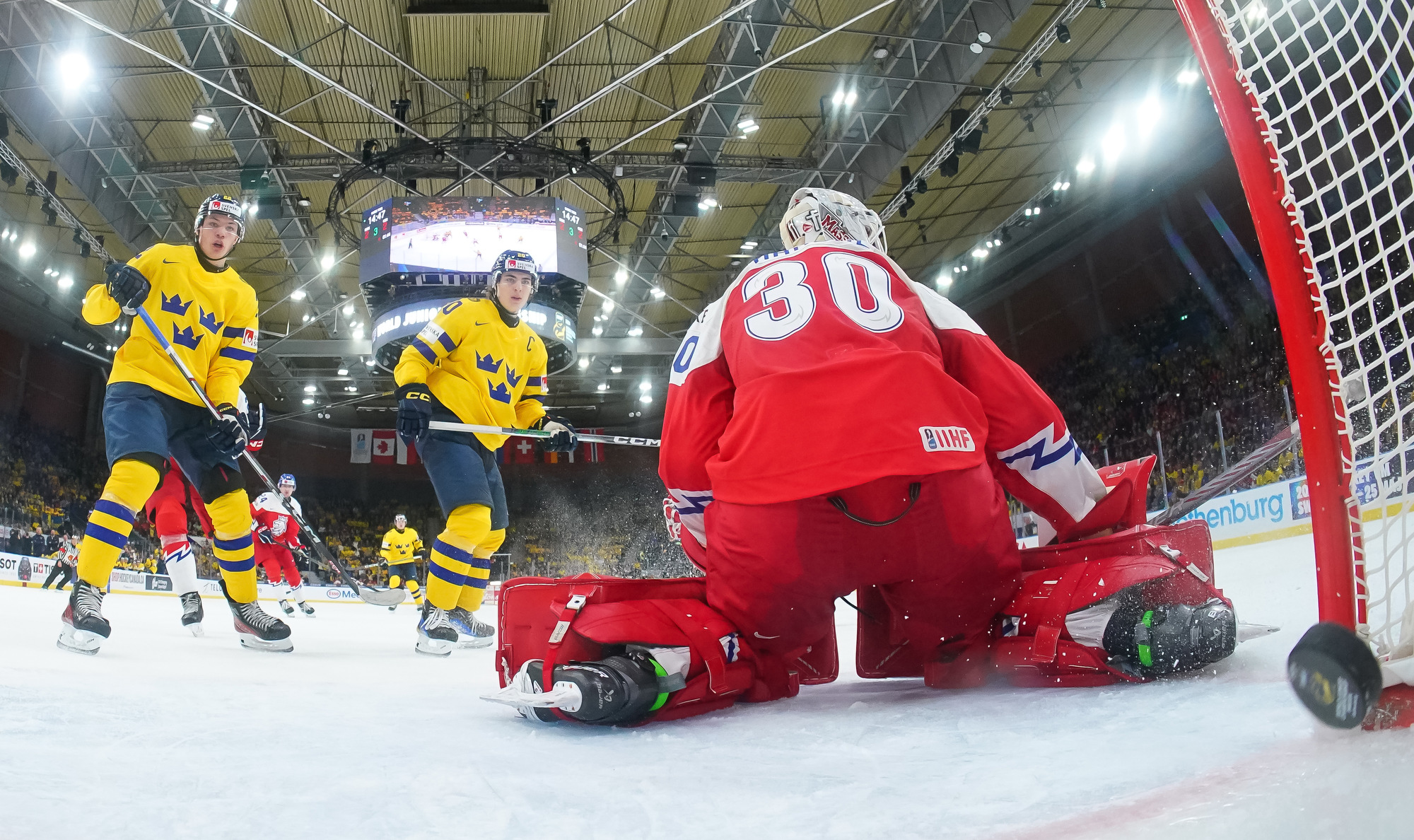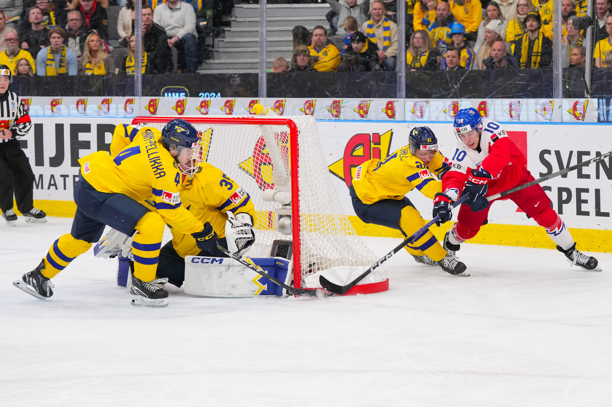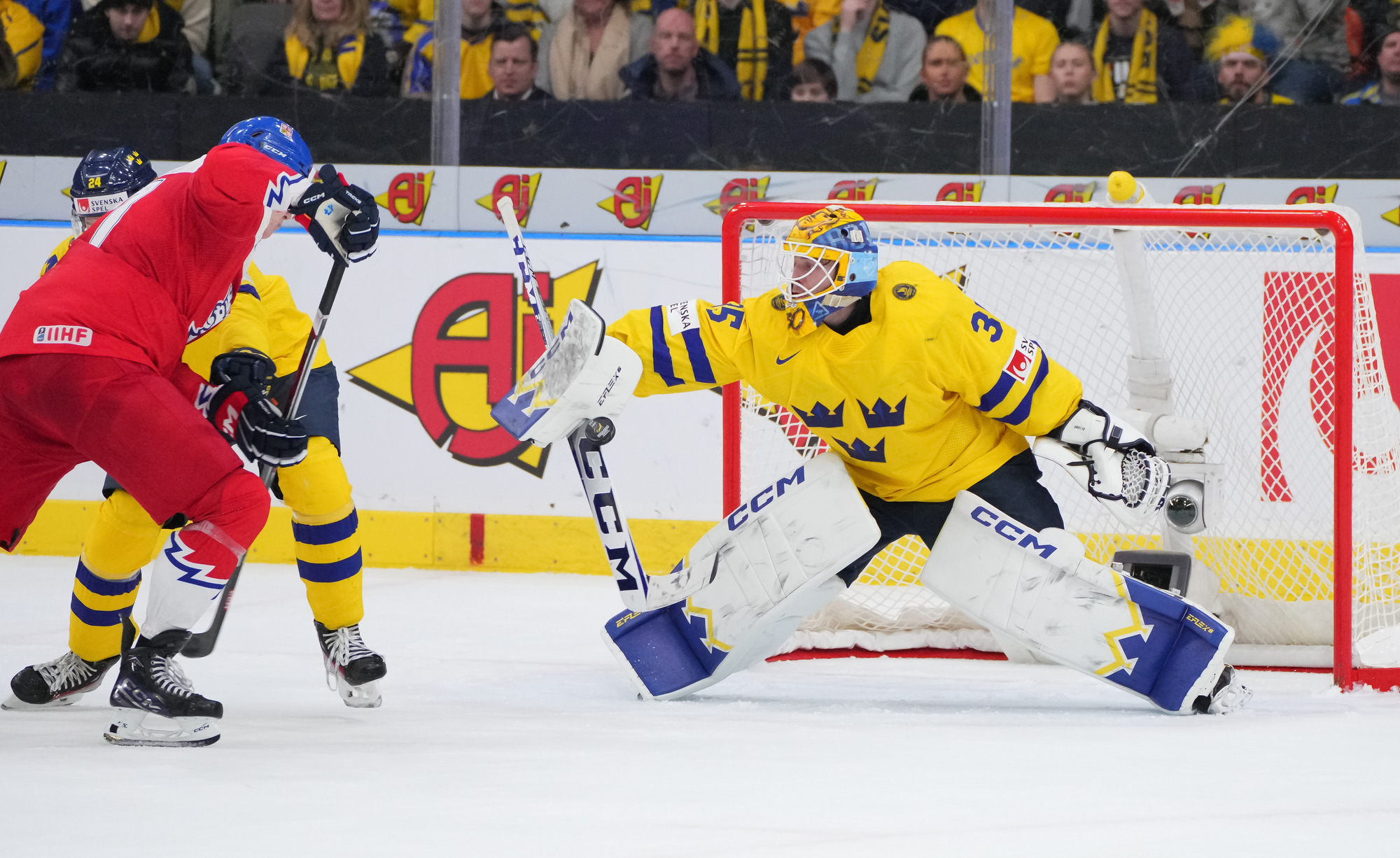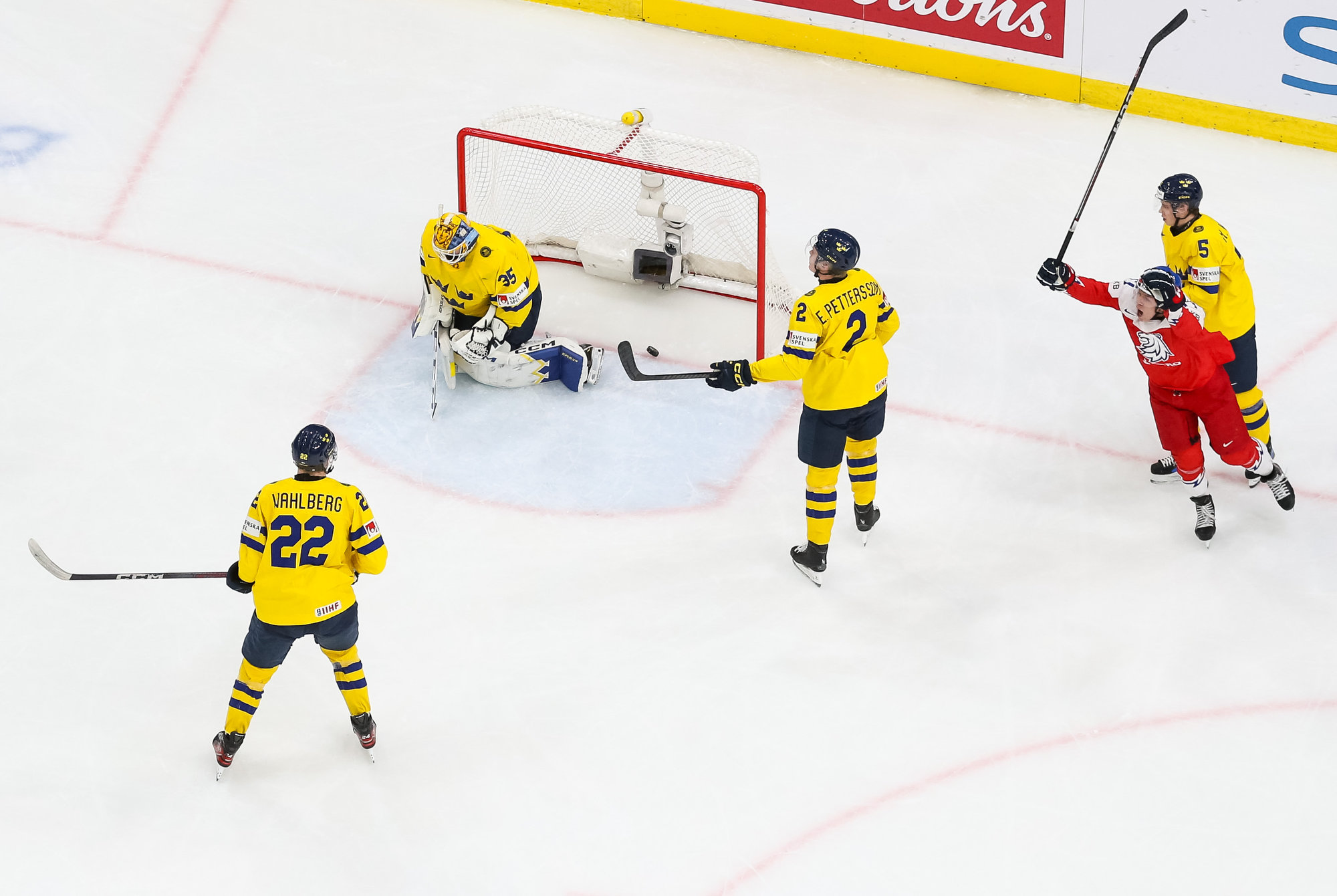 Just 16 seconds after it began, Sandin Pellikka teed up a pass for Lekkerimaki, and he wired a bullet past Hrabal from the point at 5:14. But the Swedes were only just getting started. They opened a two-goal lead at 12:00 when Lindstein fed Noah Ostlund a torpedo pass. Ostlund went in alone and beat Hrabal with a backhand over--you guessed it--the glove.