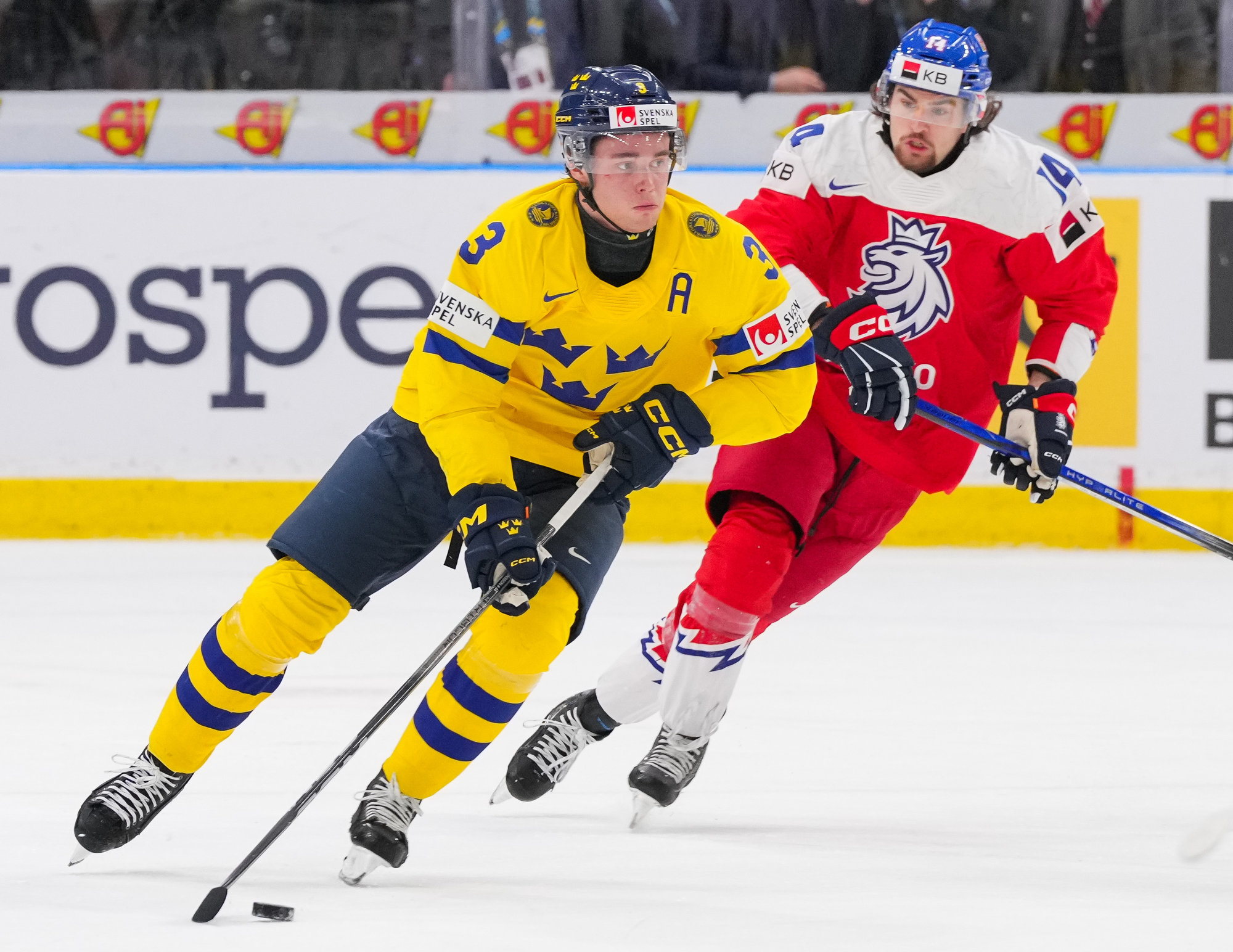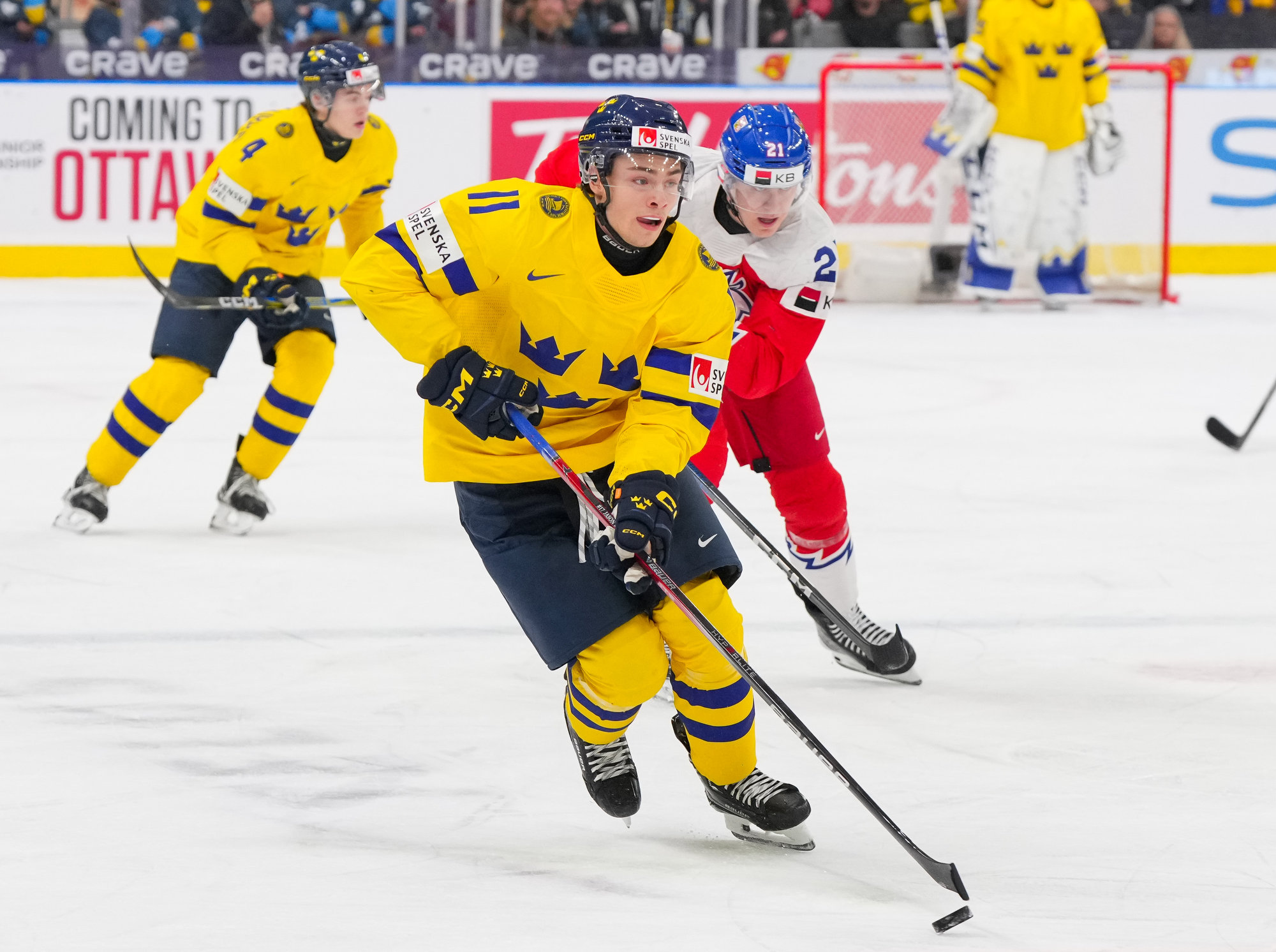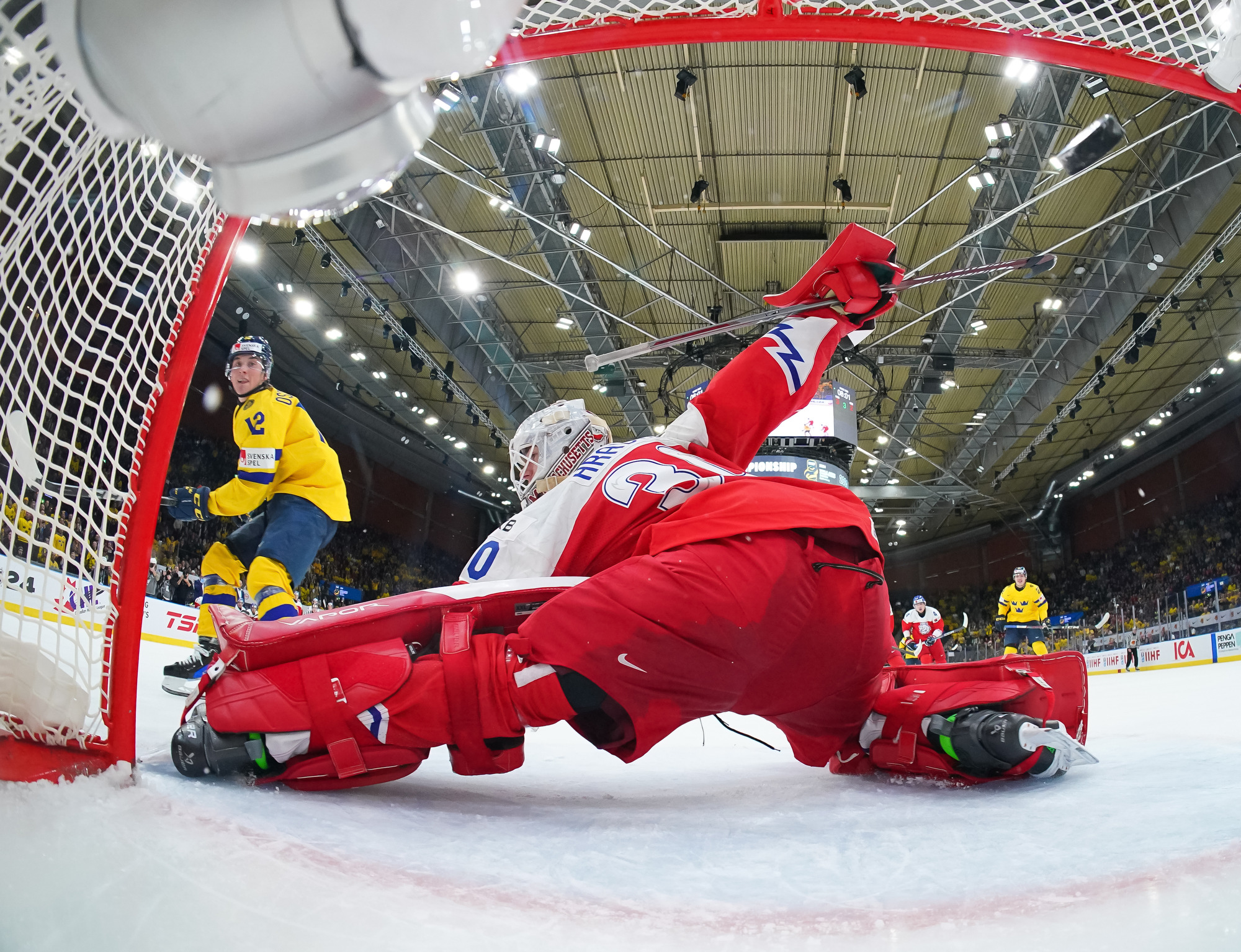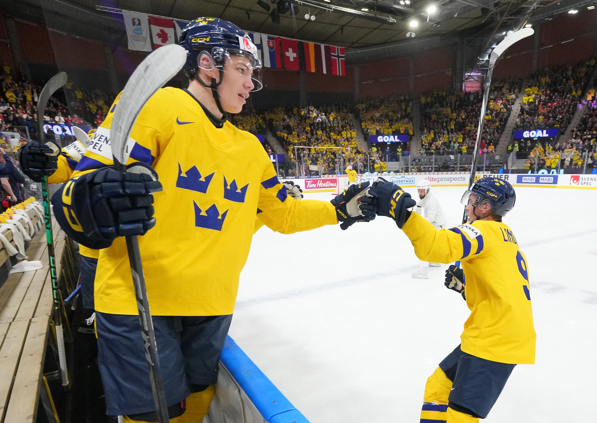 Just 16 seconds after it began, Sandin Pellikka teed up a pass for Lekkerimaki, and he wired a bullet past Hrabal from the point at 5:14. But the Swedes were only just getting started. They opened a two-goal lead at 12:00 when Lindstein fed Noah Ostlund a torpedo pass. Ostlund went in alone and beat Hrabal with a backhand over--you guessed it--the glove.