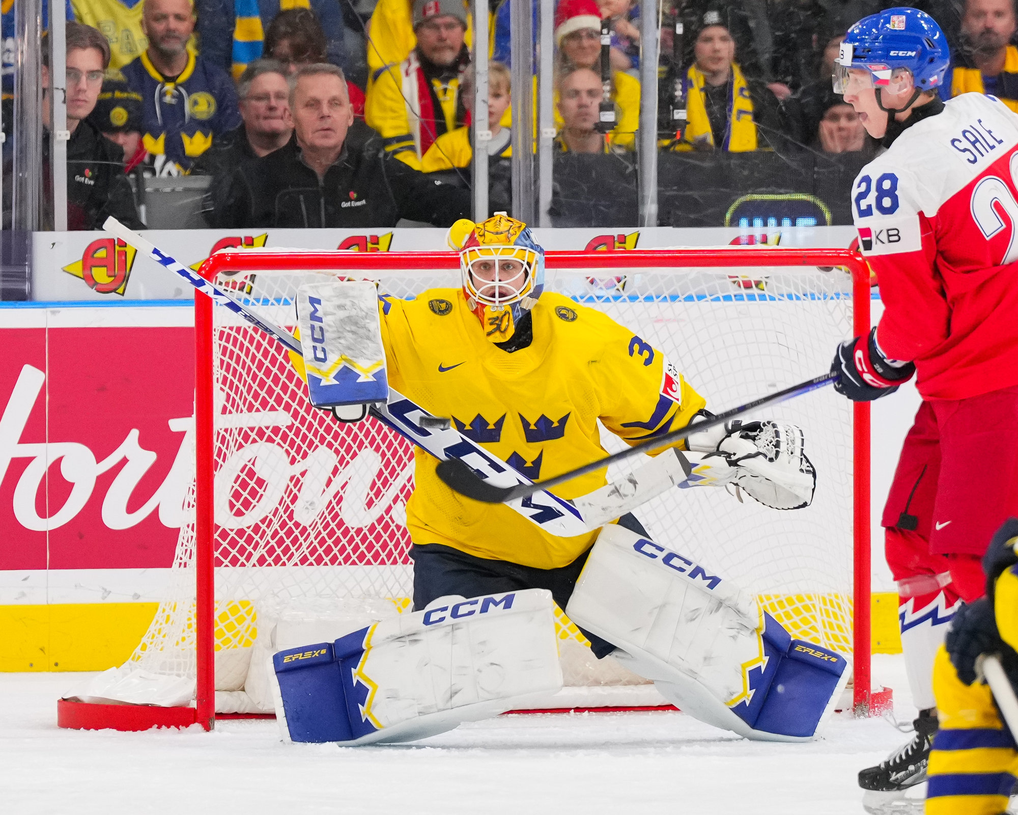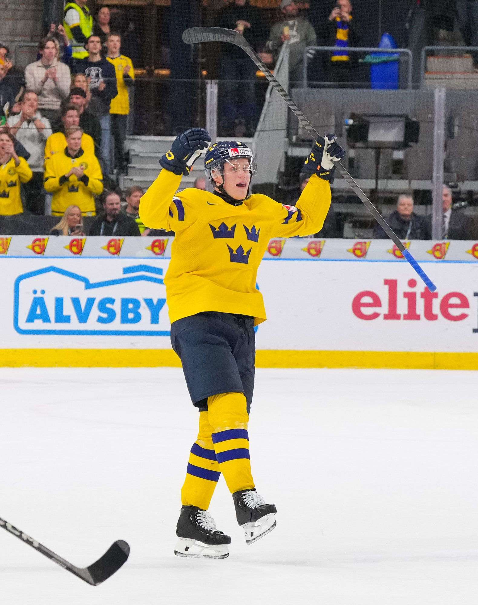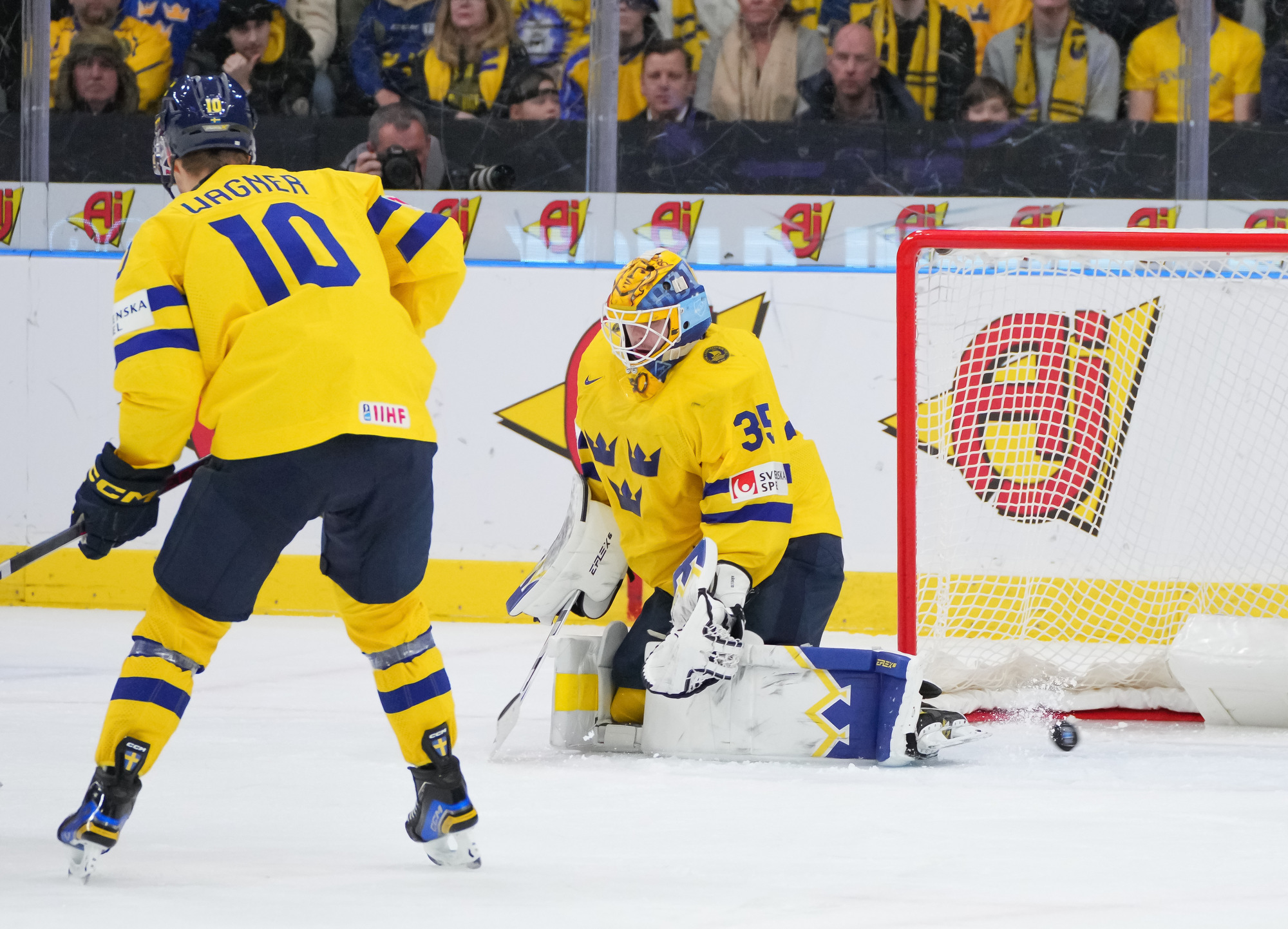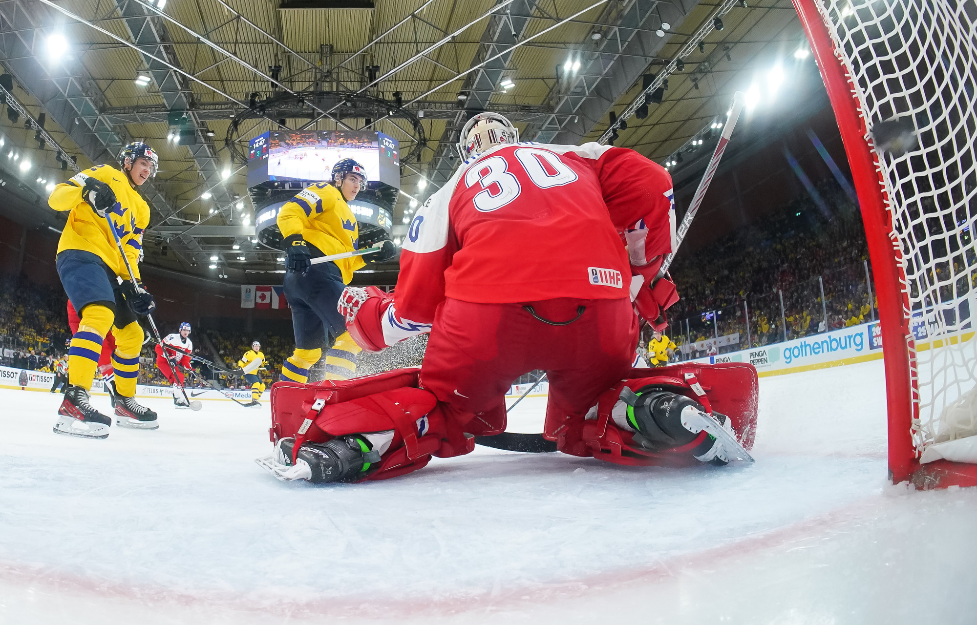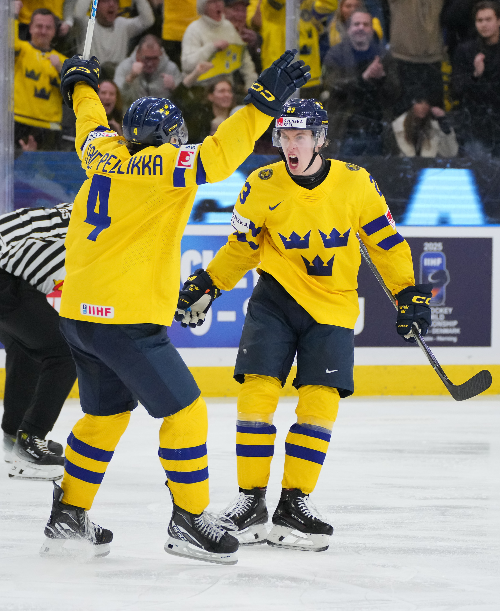 The second was a rollicking, wide-open affair that started with Sverige claiming their first lead. Axel Sandin Pellikka took a quick shot from the point that beat Hrabal over the glove in pretty much the same spot he flubbed Lindstein’s shot.