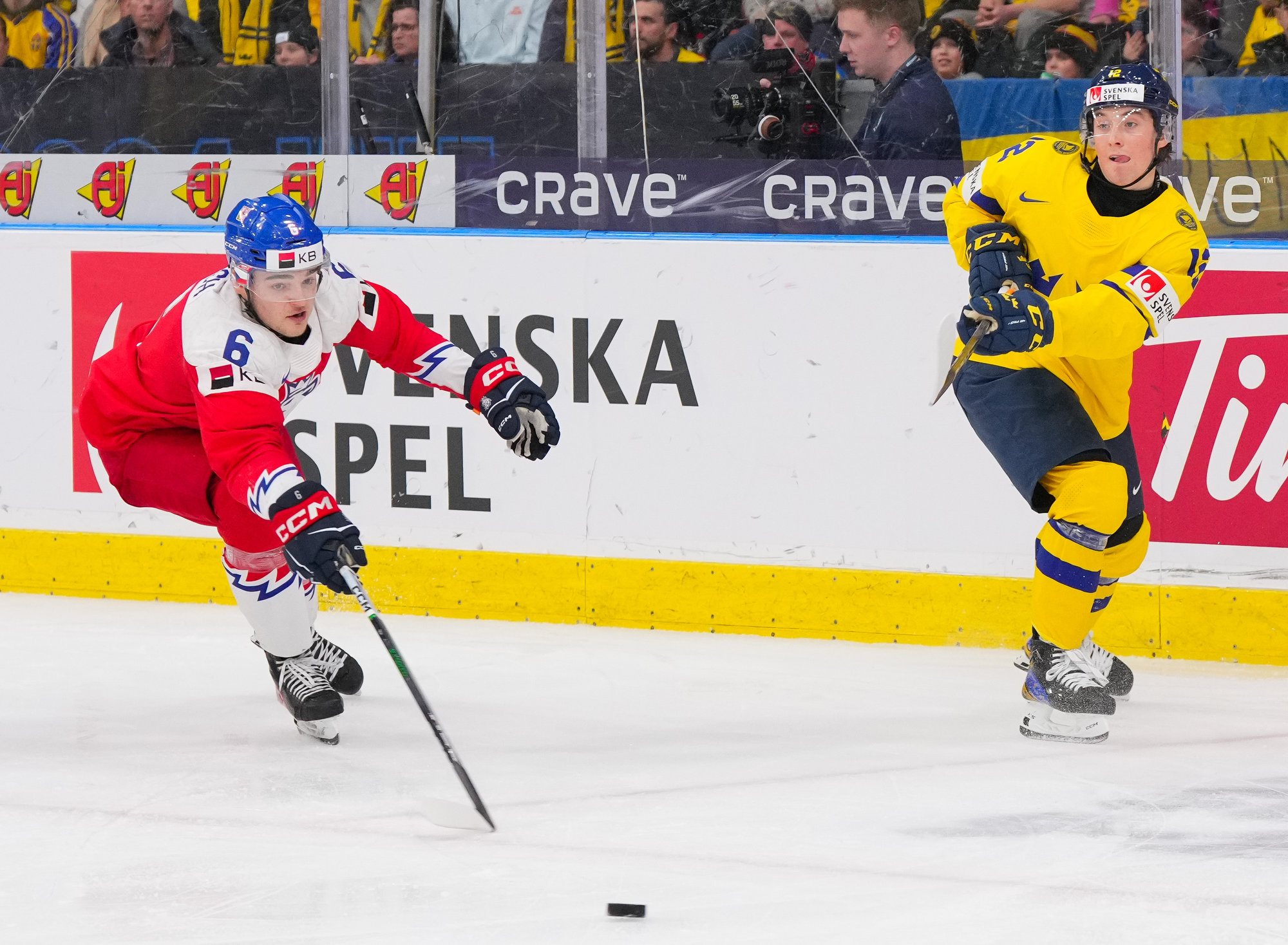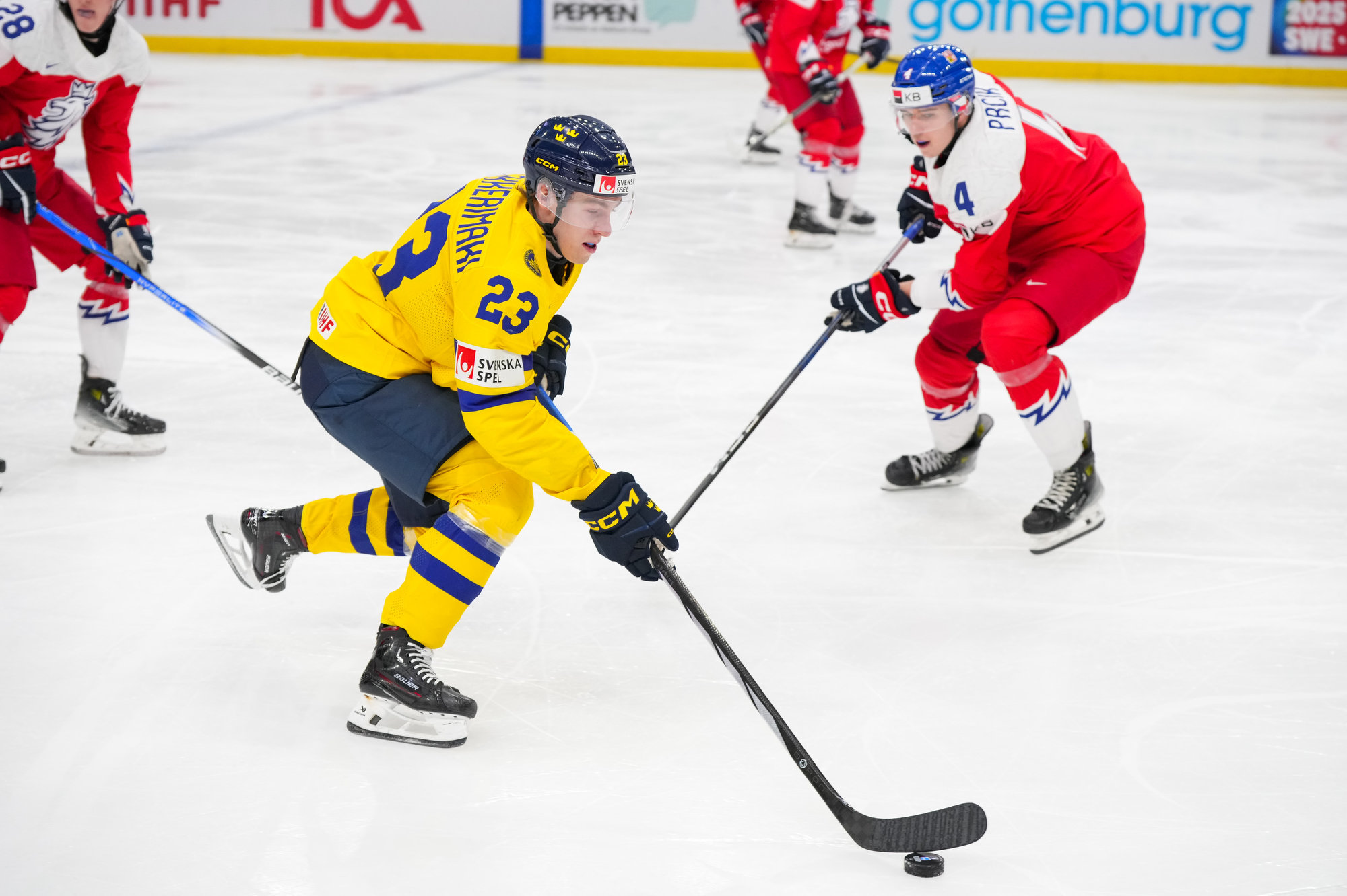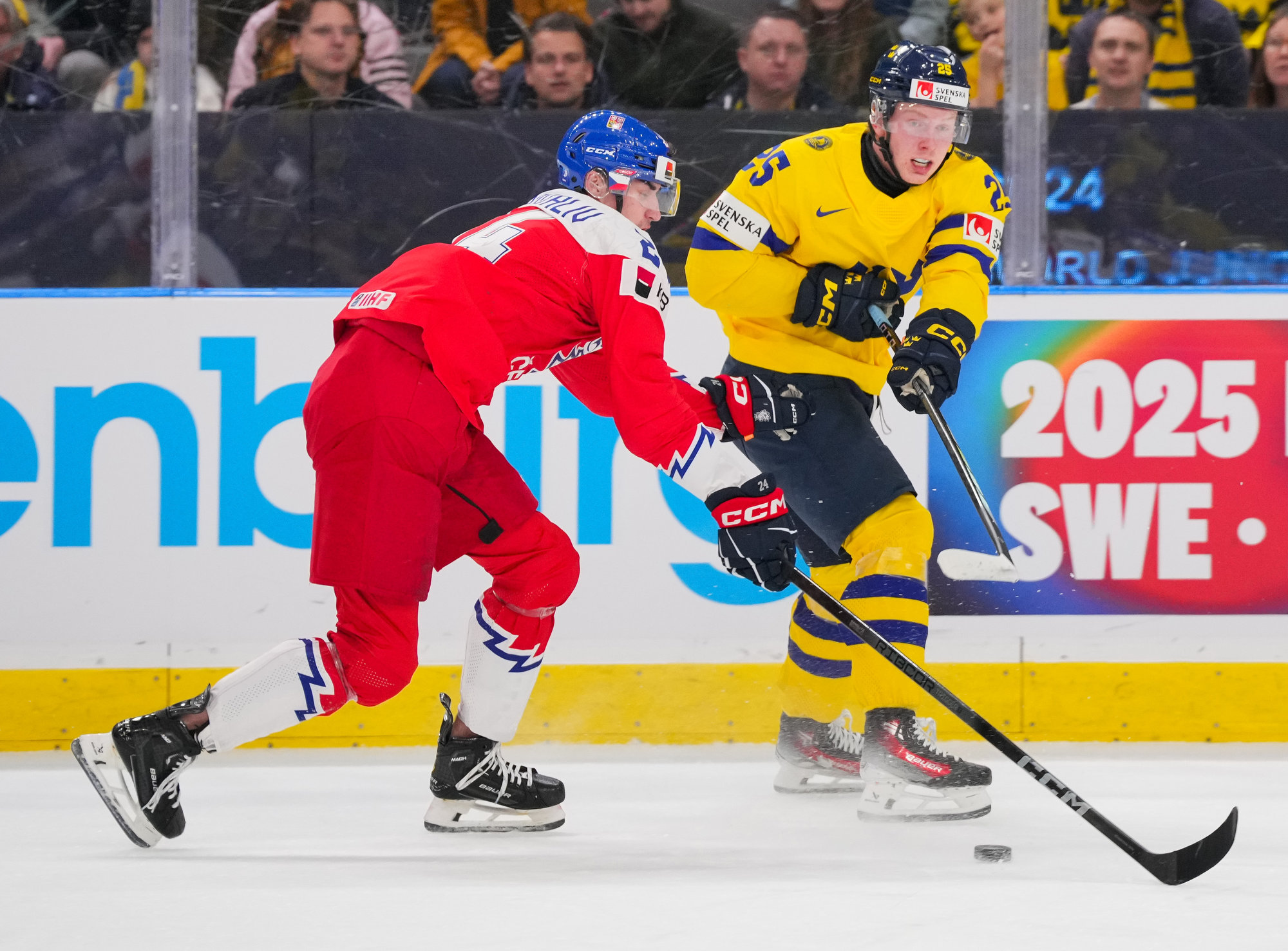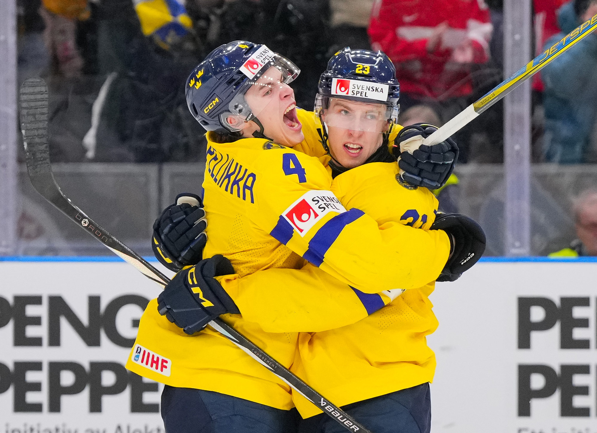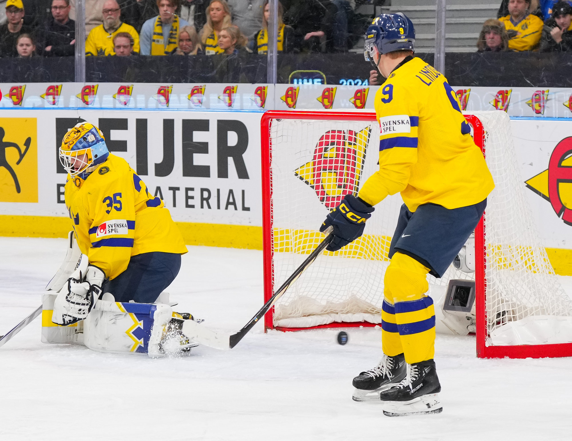 The second was a rollicking, wide-open affair that started with Sverige claiming their first lead. Axel Sandin Pellikka took a quick shot from the point that beat Hrabal over the glove in pretty much the same spot he flubbed Lindstein’s shot.