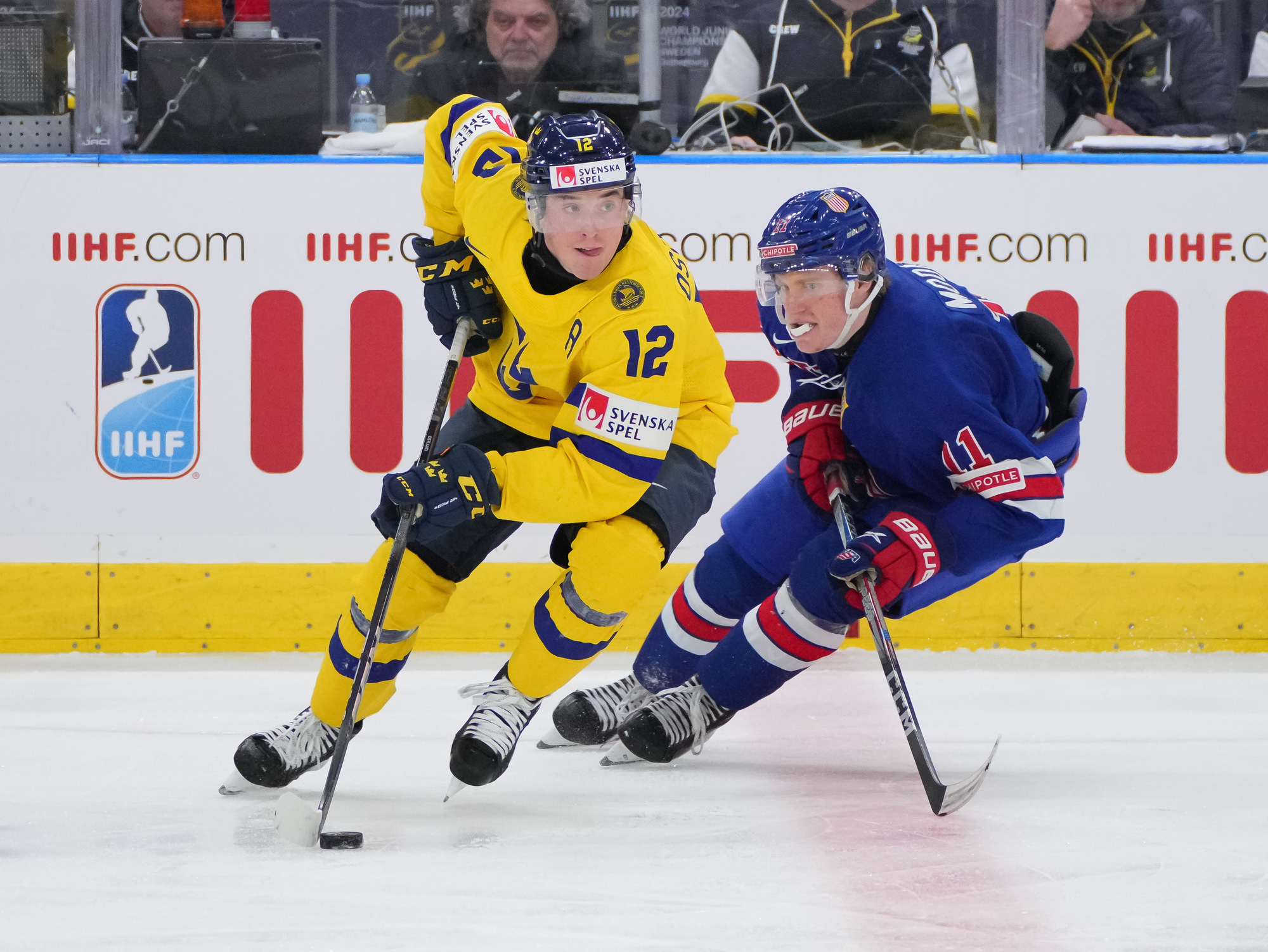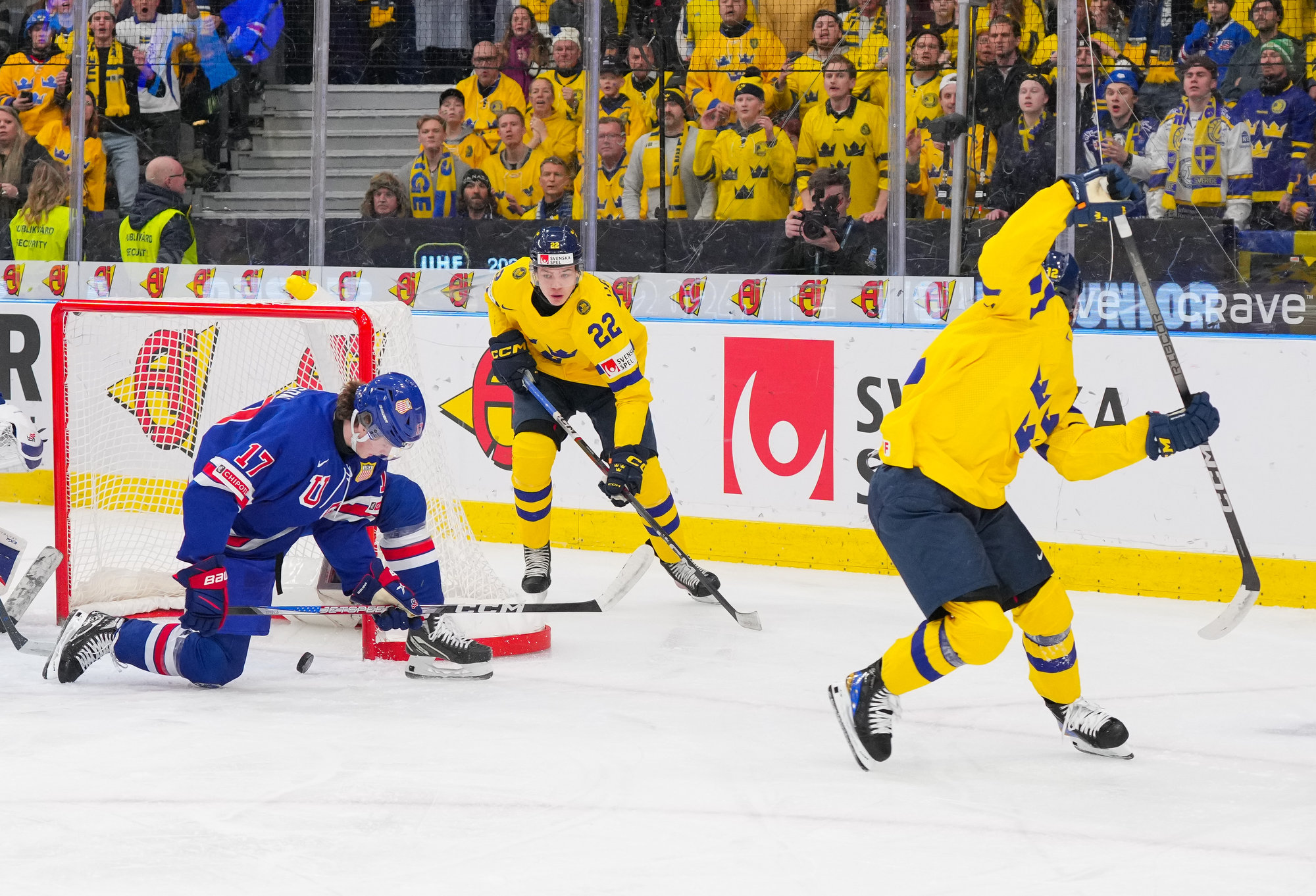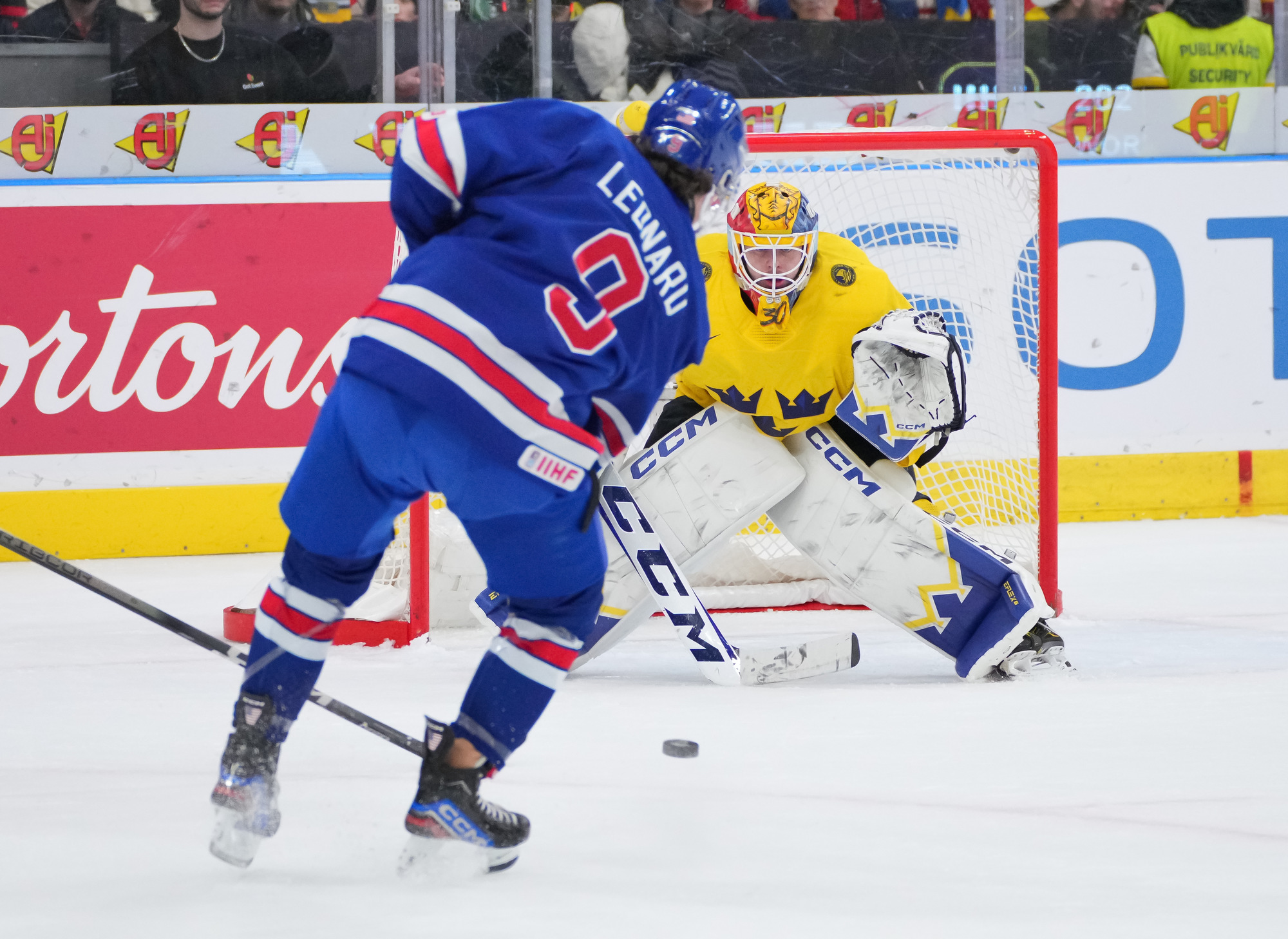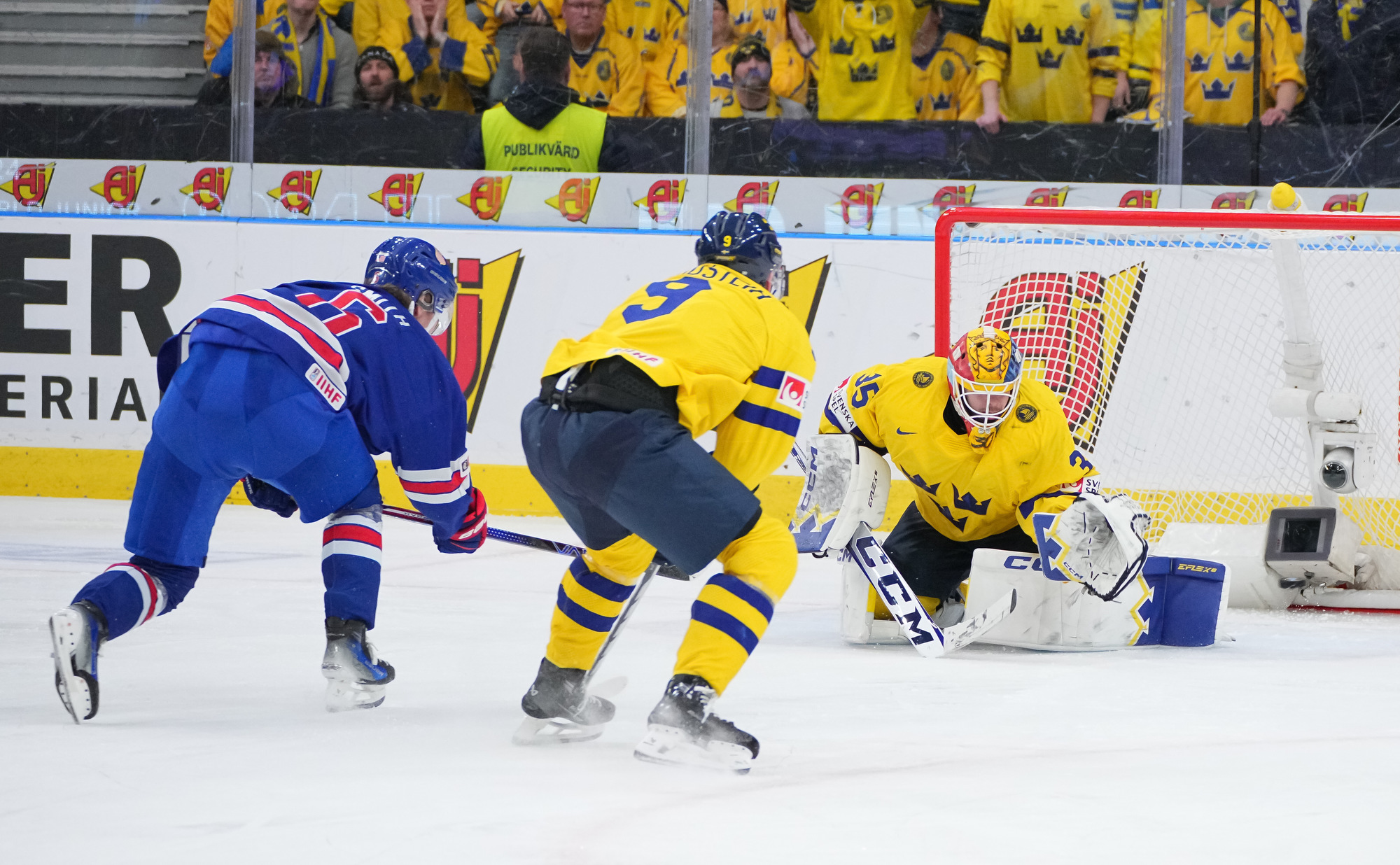 Making matters worse, Ostlund took a double minor for high sticking midway through the period, and although the Swedish penalty killers were flawless, it killed four more minutes off the clock for the U.S. Soon after he came out, Ostlund hit the post, and then he was beaten in his own end to the puck by Ryan Leonard, who converted the play with a nice shot at 16:12, more or less sealing the victory.