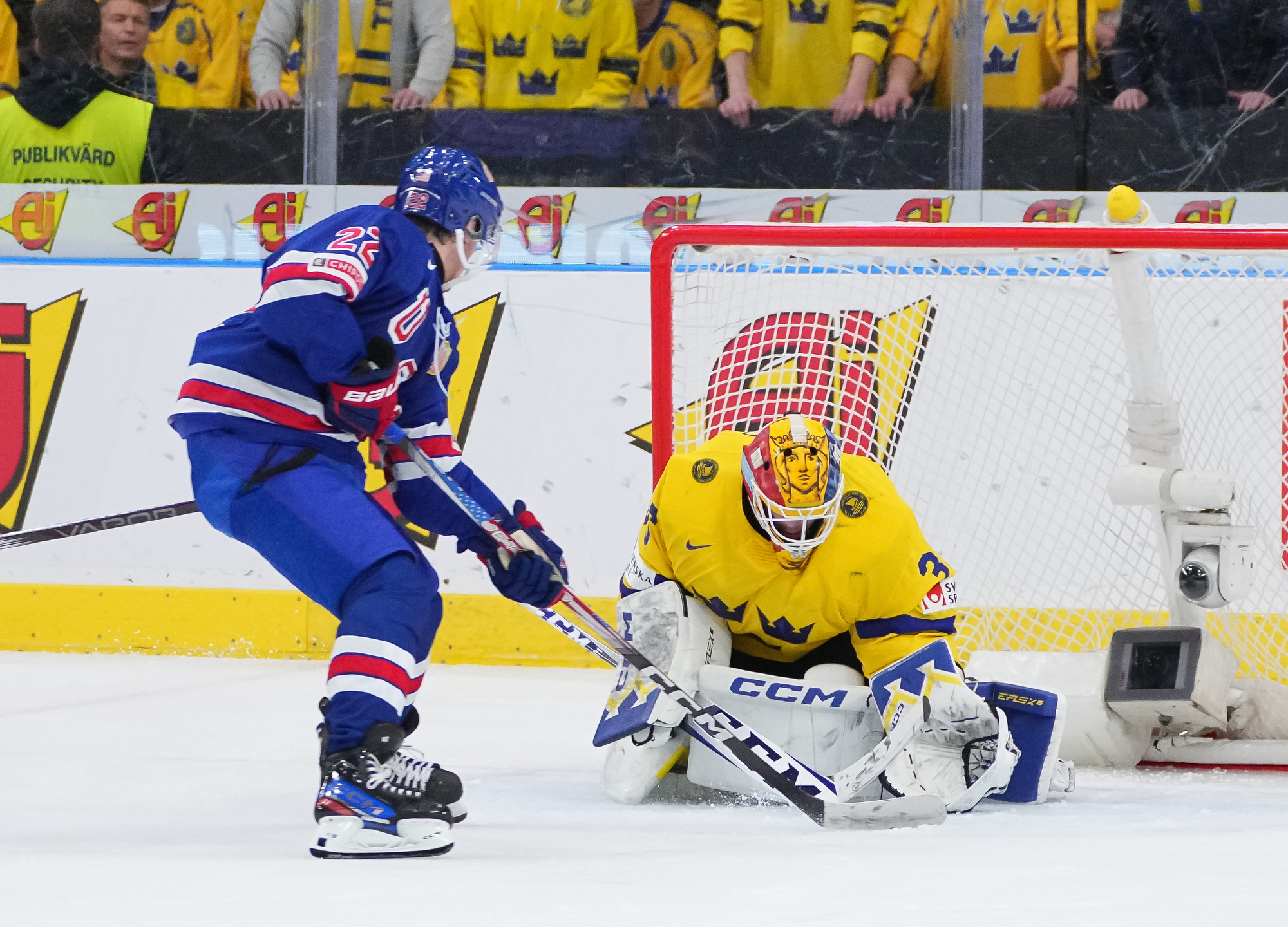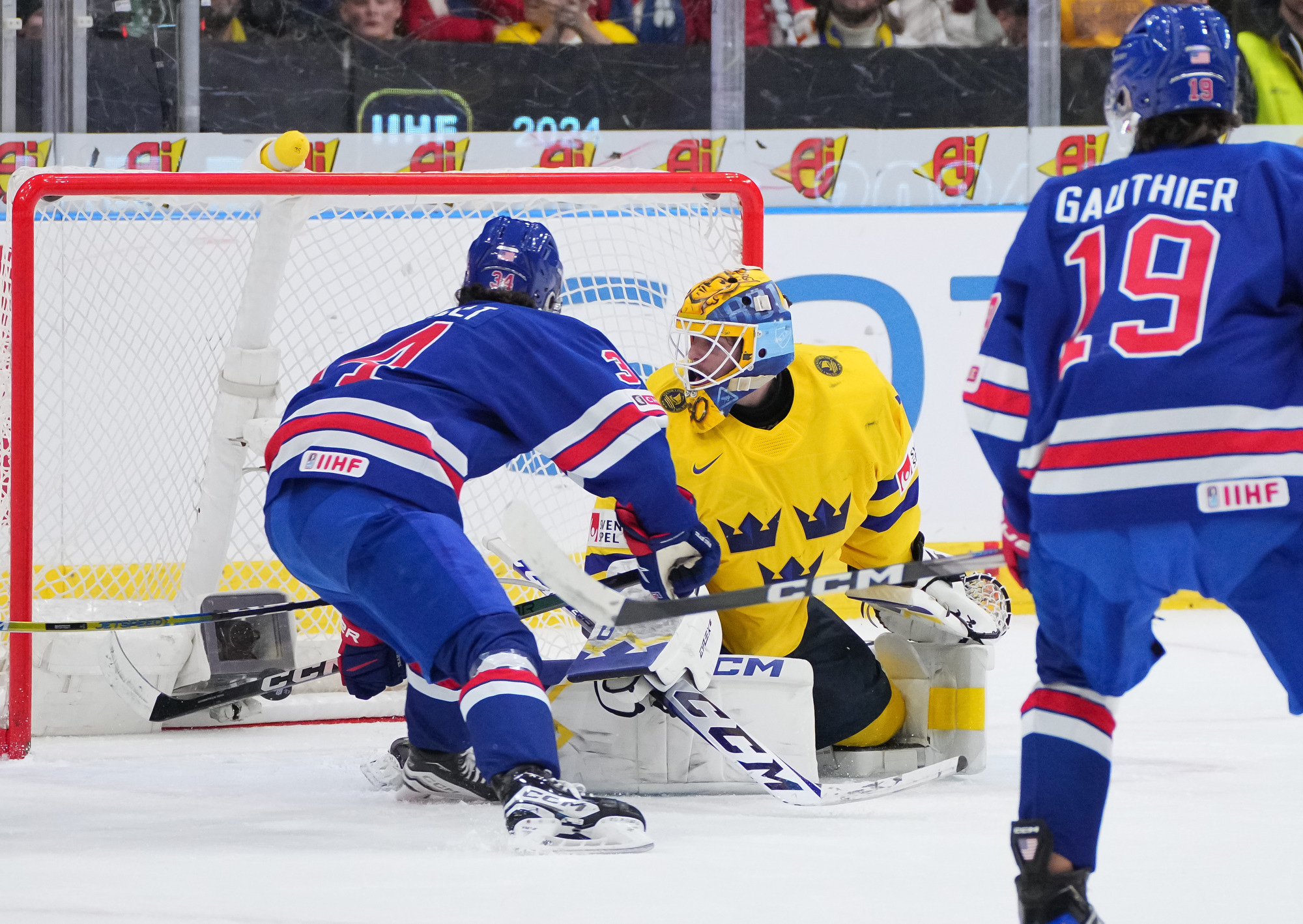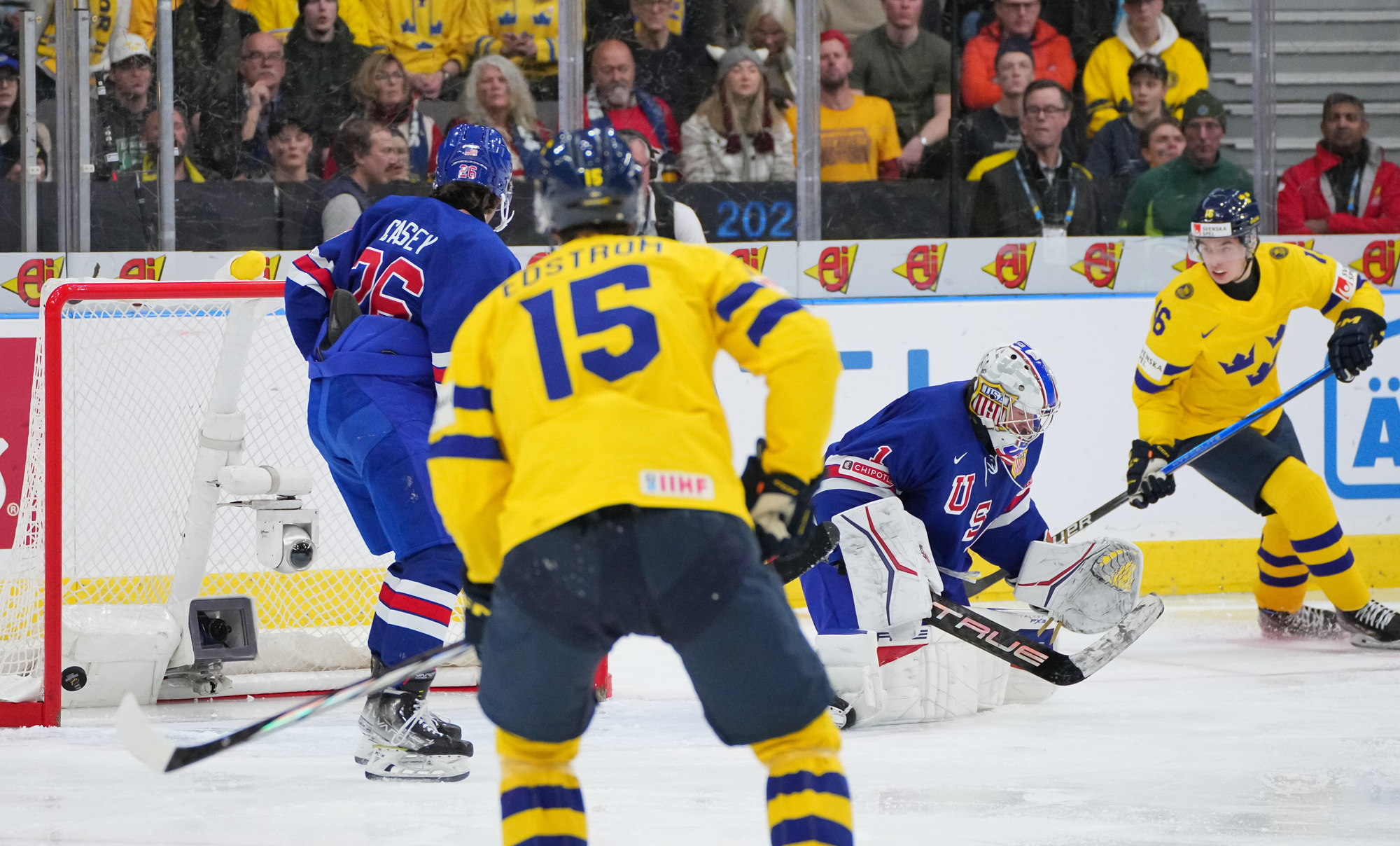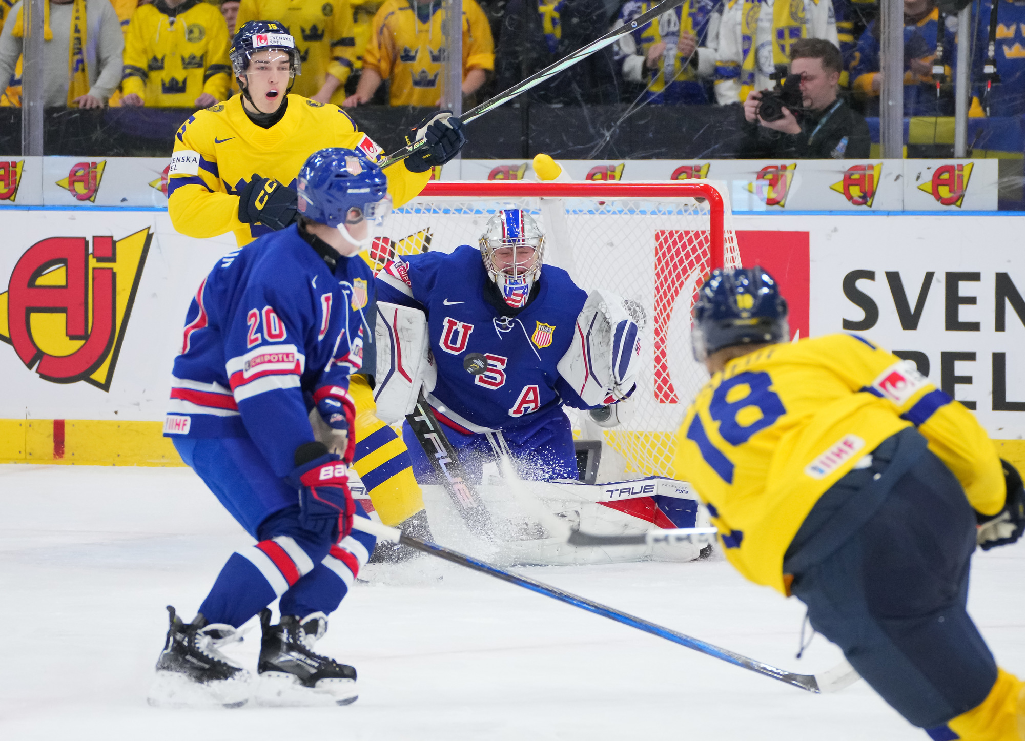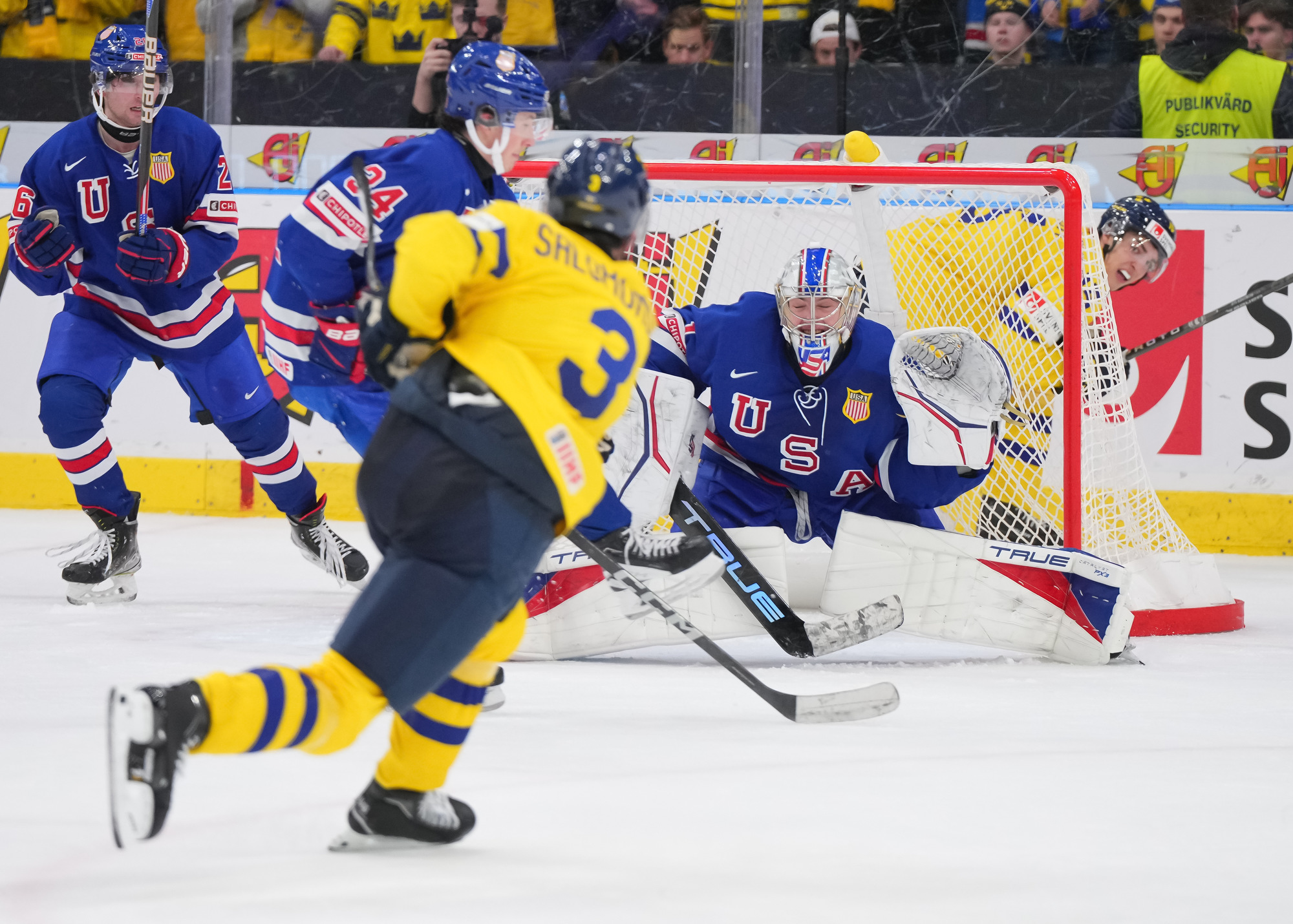 The game started cautiously, but Sweden started to assert itself and had the puck in the U.S. end for several extended stretches, but they misfired too often and ended up not testing Augustine to any great degree. Their best player was Noah Ostlund, who had three terrific chances. But he fired high and wide on the first, didn’t get much wood on a backhand between his legs on the second, and was stopped by Augustine after a great move on the third.