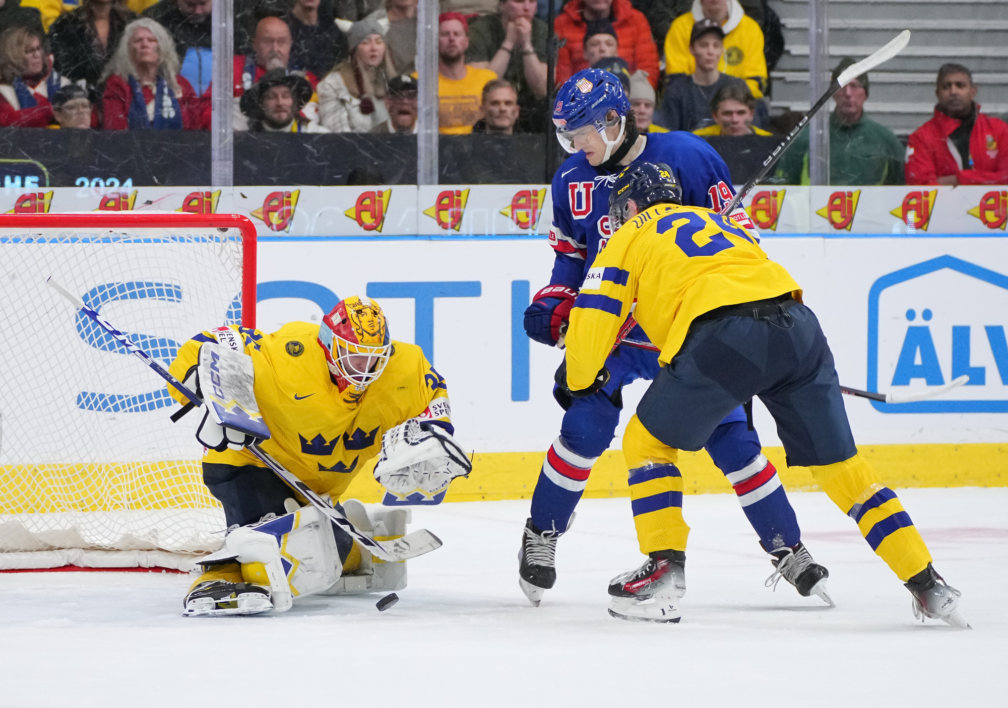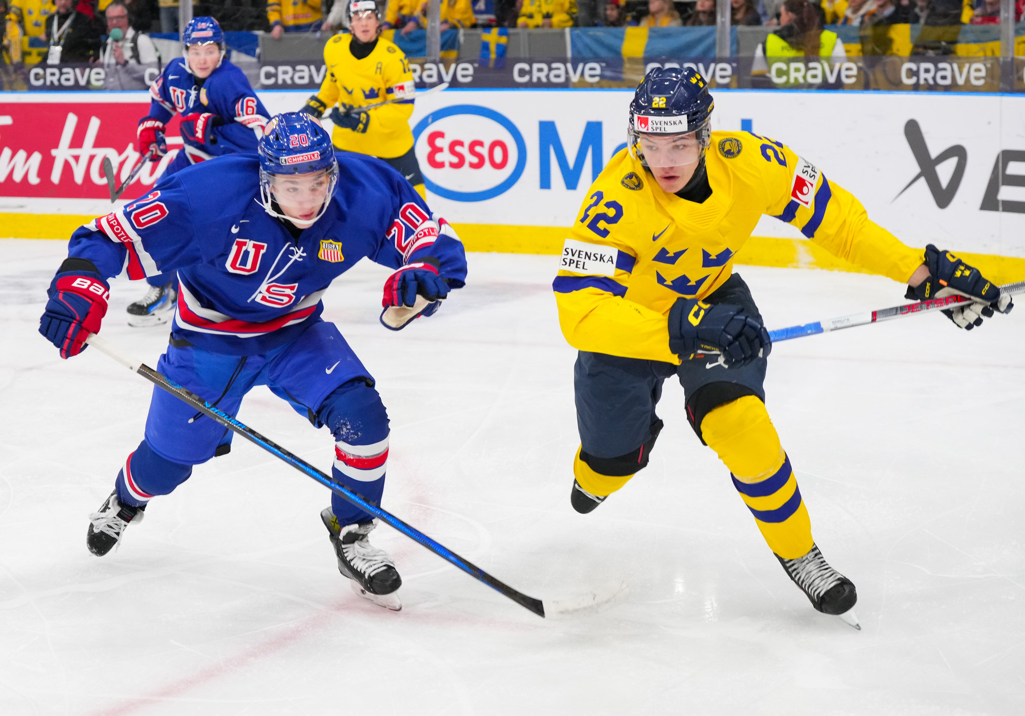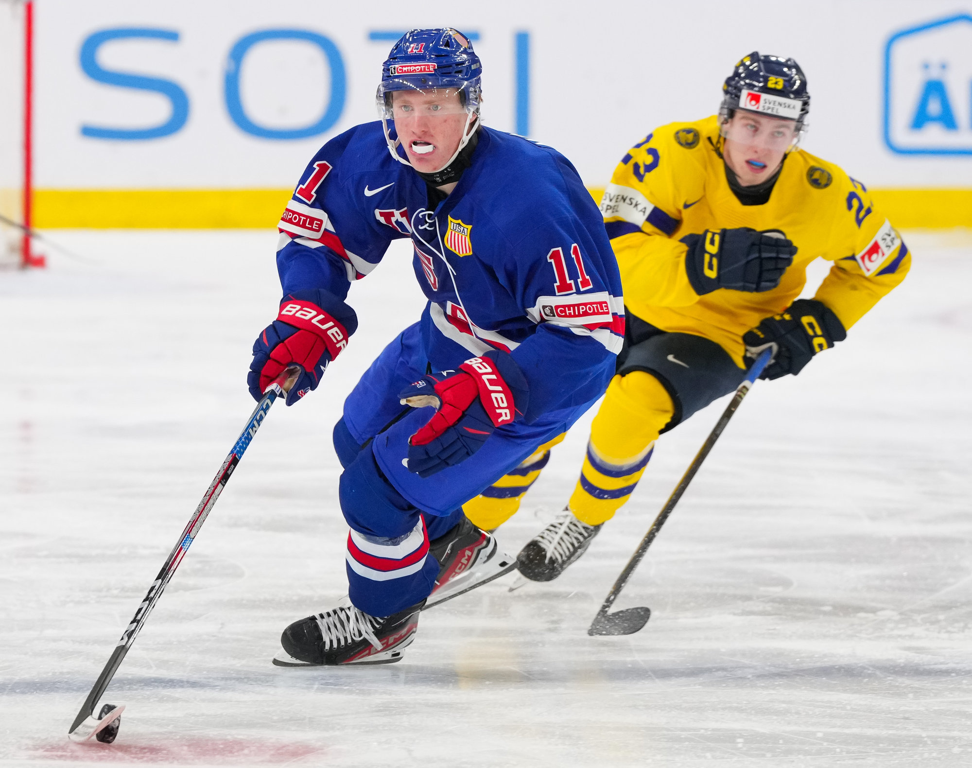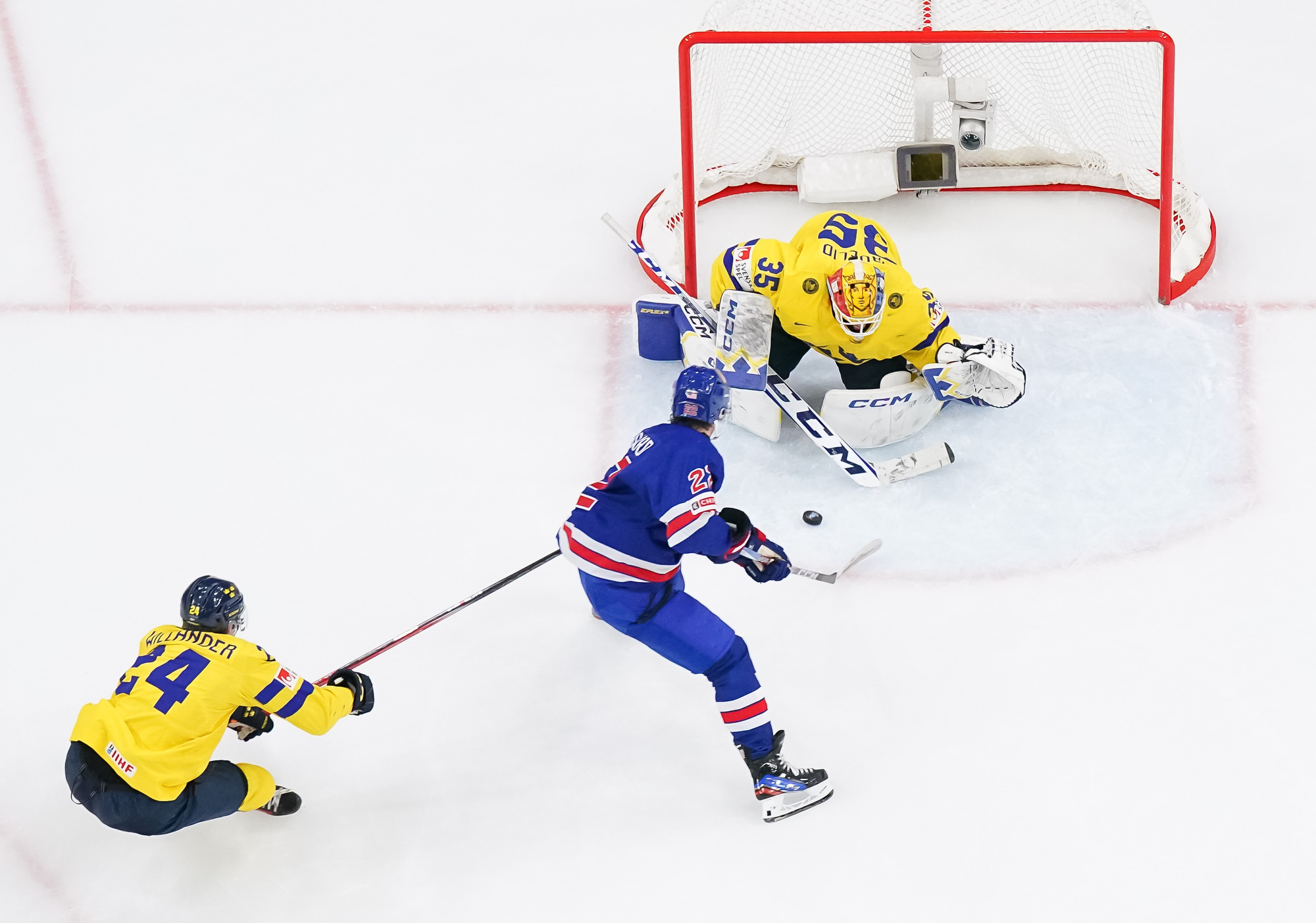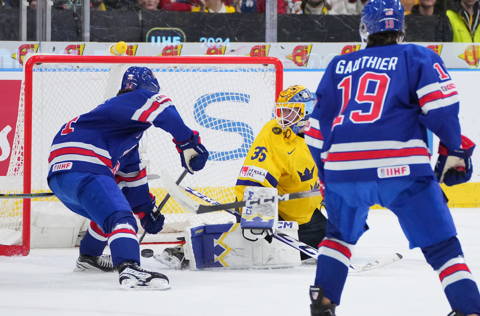 The game started cautiously, but Sweden started to assert itself and had the puck in the U.S. end for several extended stretches, but they misfired too often and ended up not testing Augustine to any great degree. Their best player was Noah Ostlund, who had three terrific chances. But he fired high and wide on the first, didn’t get much wood on a backhand between his legs on the second, and was stopped by Augustine after a great move on the third.