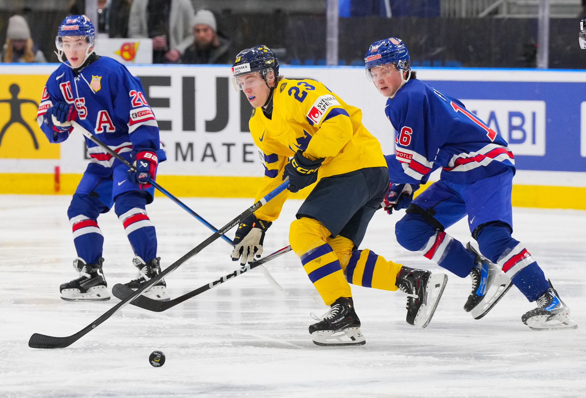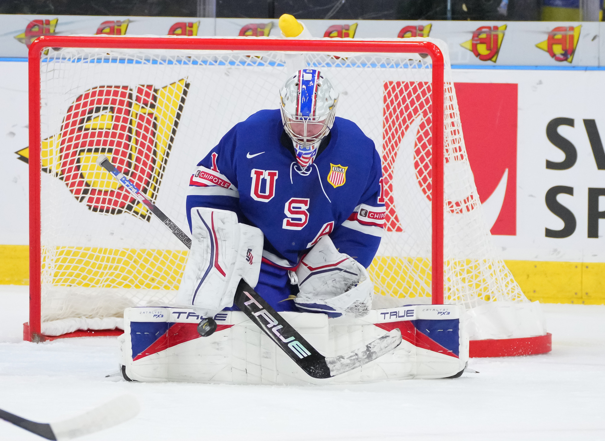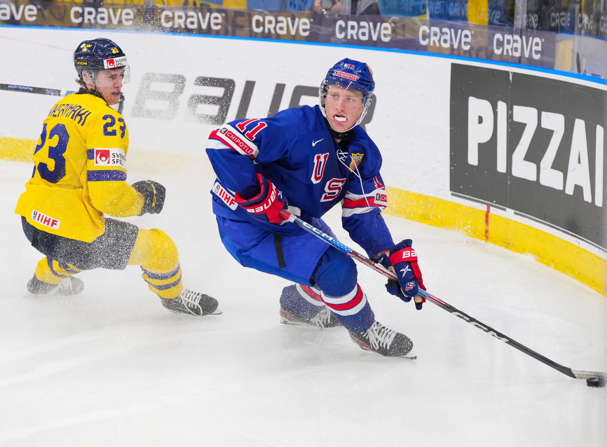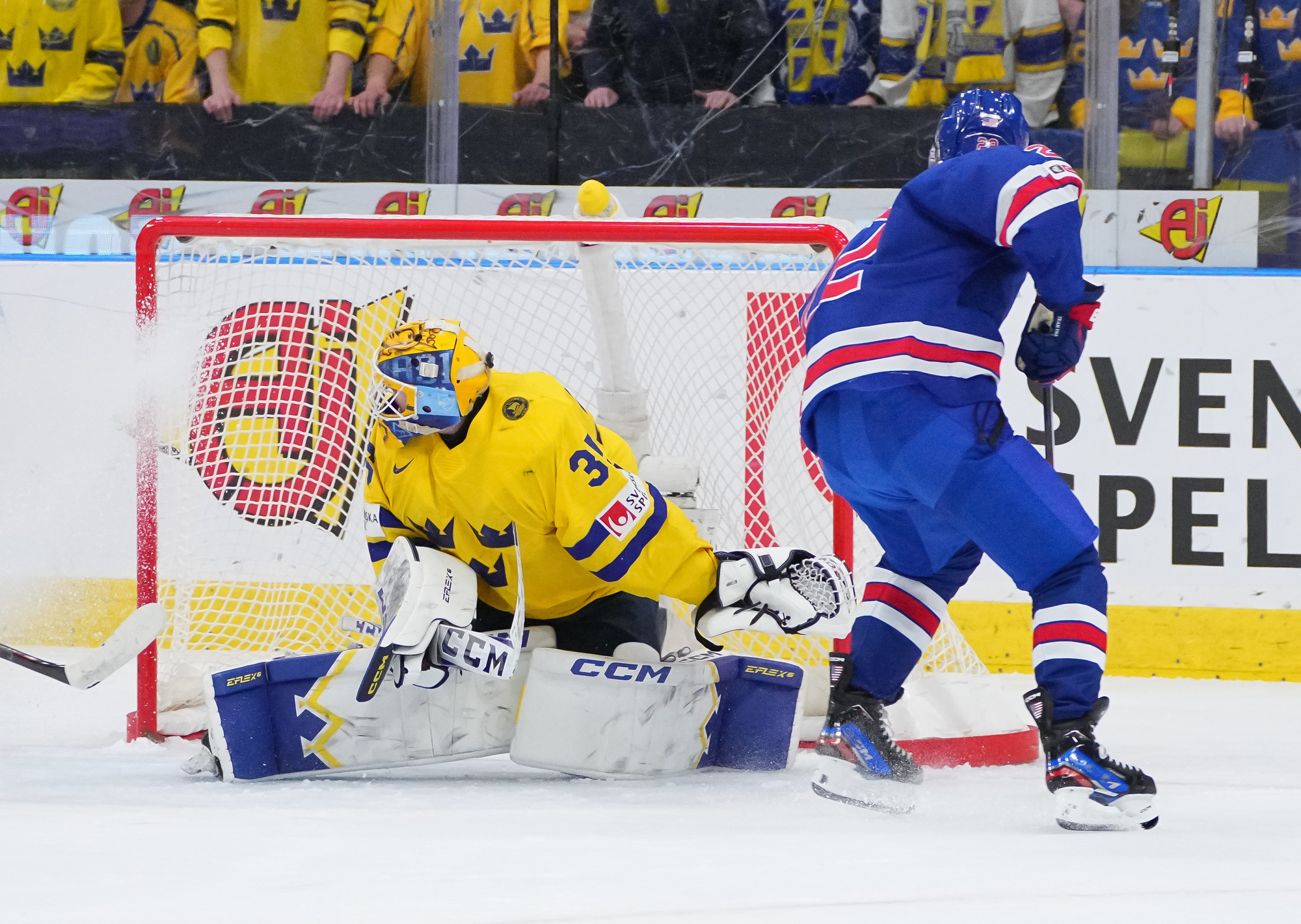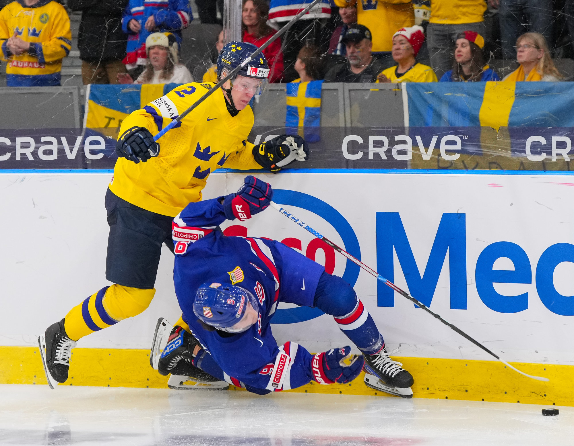 The game started cautiously, but Sweden started to assert itself and had the puck in the U.S. end for several extended stretches, but they misfired too often and ended up not testing Augustine to any great degree. Their best player was Noah Ostlund, who had three terrific chances. But he fired high and wide on the first, didn’t get much wood on a backhand between his legs on the second, and was stopped by Augustine after a great move on the third.