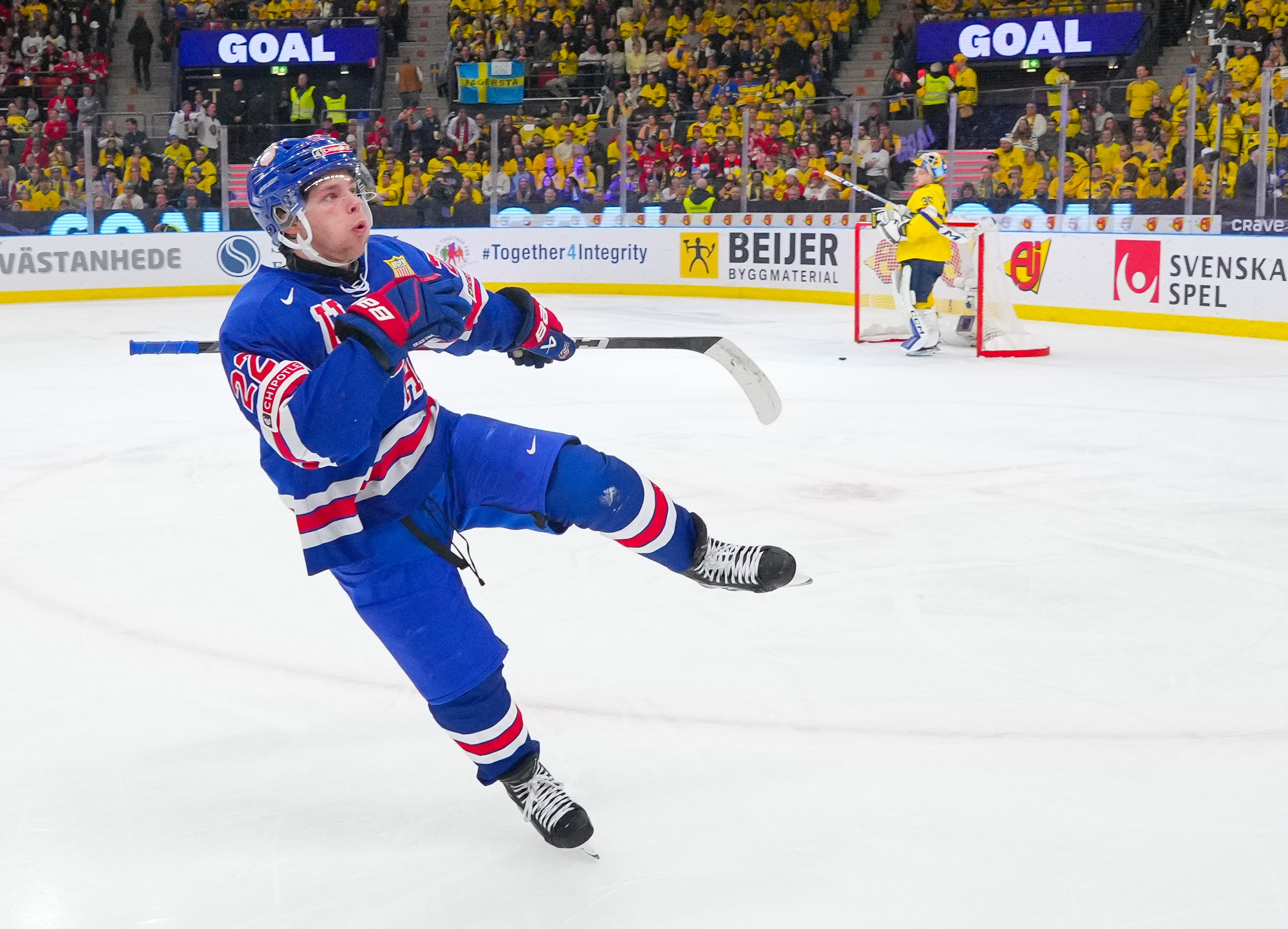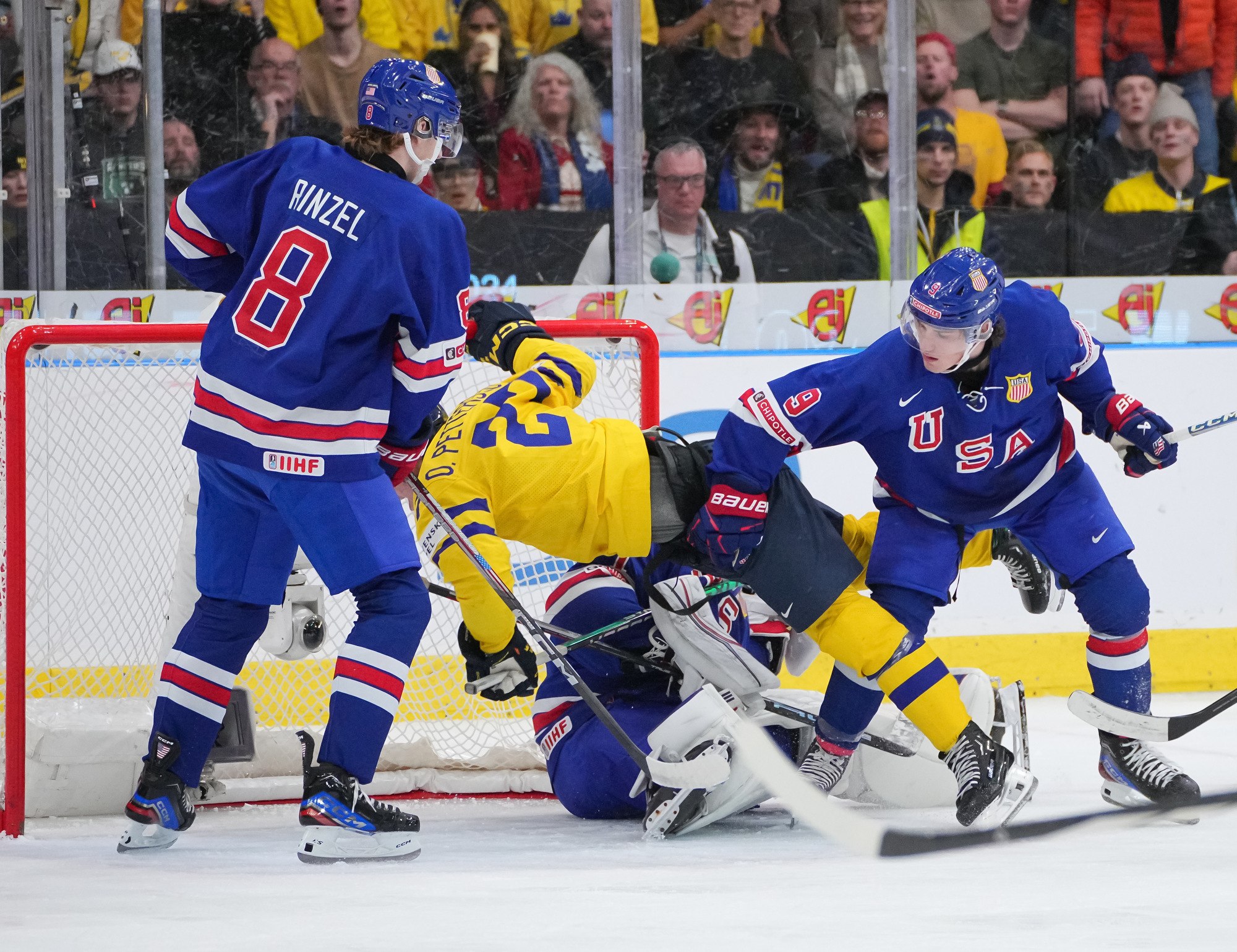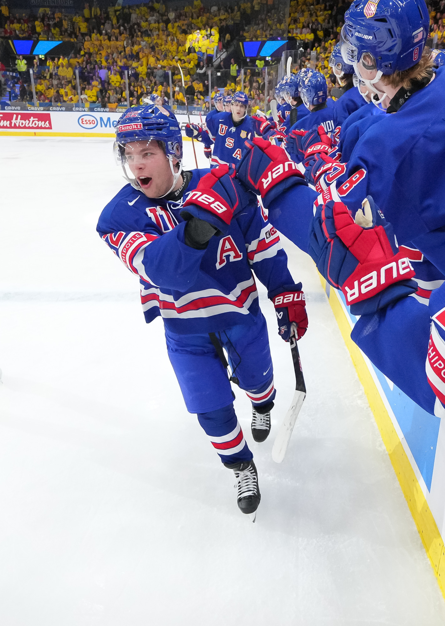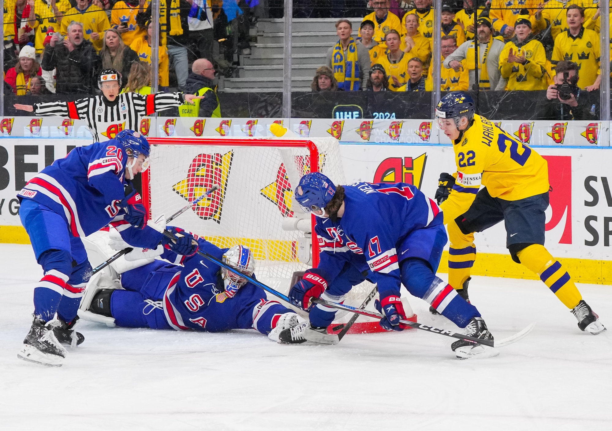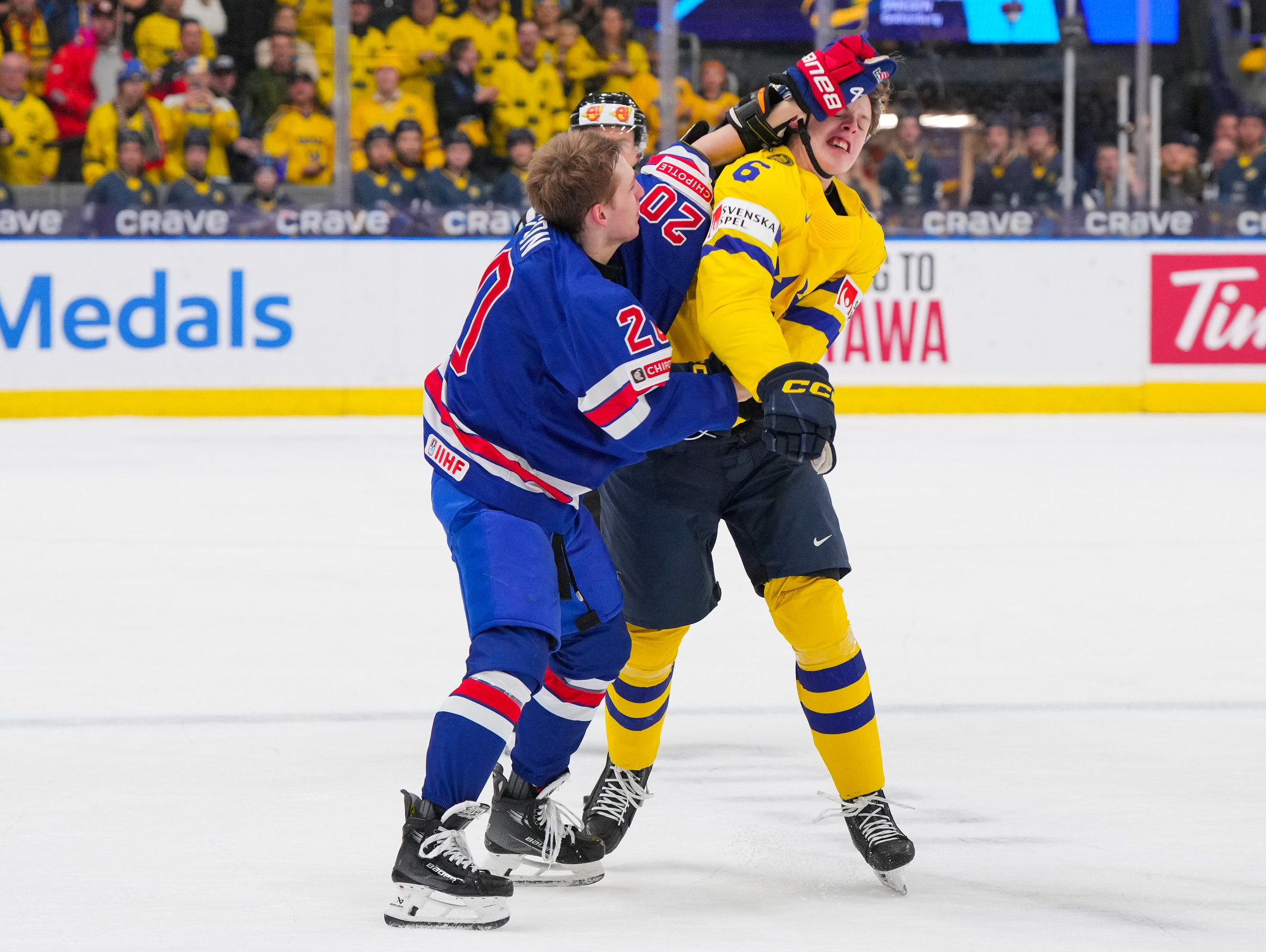 The game started cautiously, but Sweden started to assert itself and had the puck in the U.S. end for several extended stretches, but they misfired too often and ended up not testing Augustine to any great degree. Their best player was Noah Ostlund, who had three terrific chances. But he fired high and wide on the first, didn’t get much wood on a backhand between his legs on the second, and was stopped by Augustine after a great move on the third.
