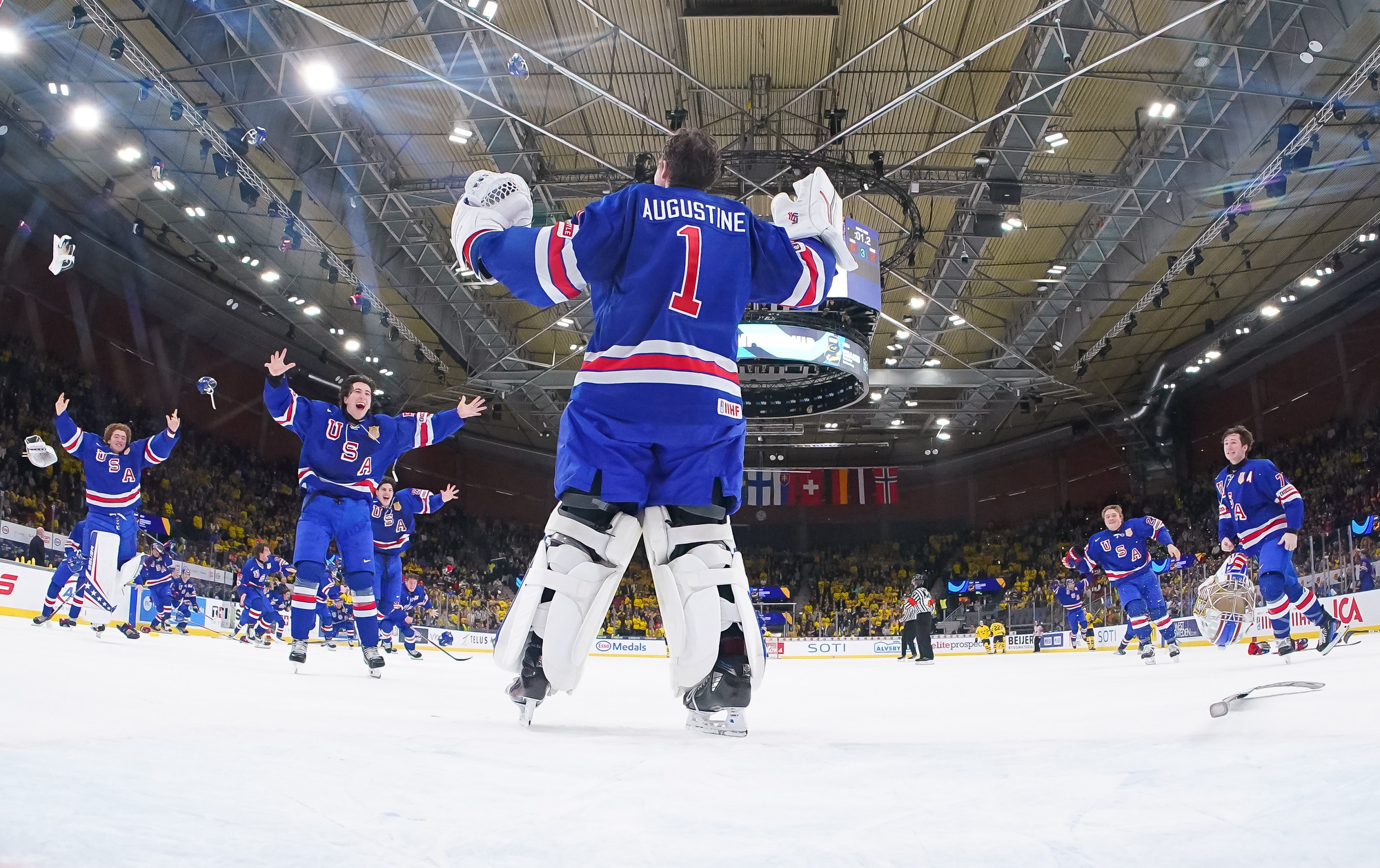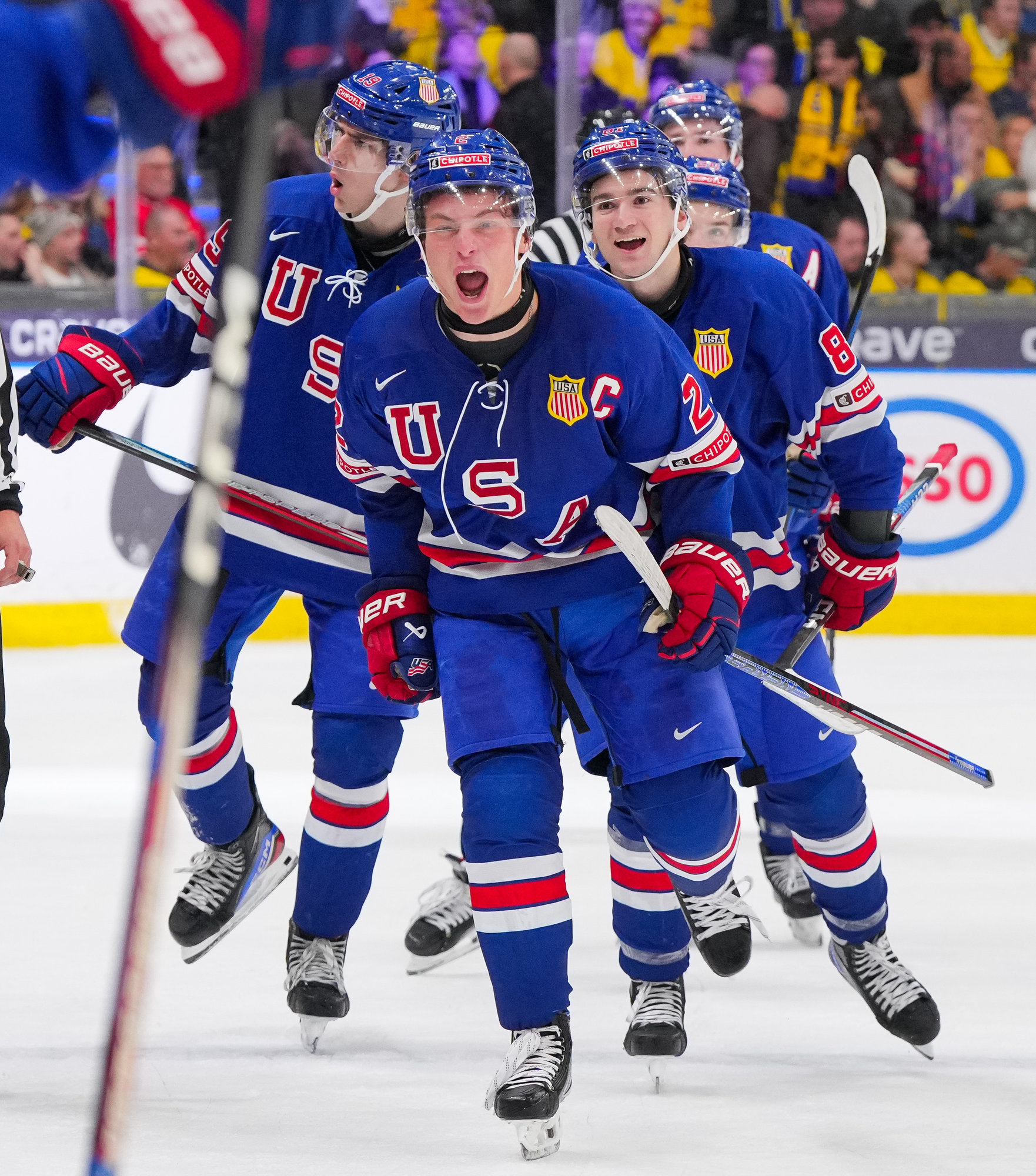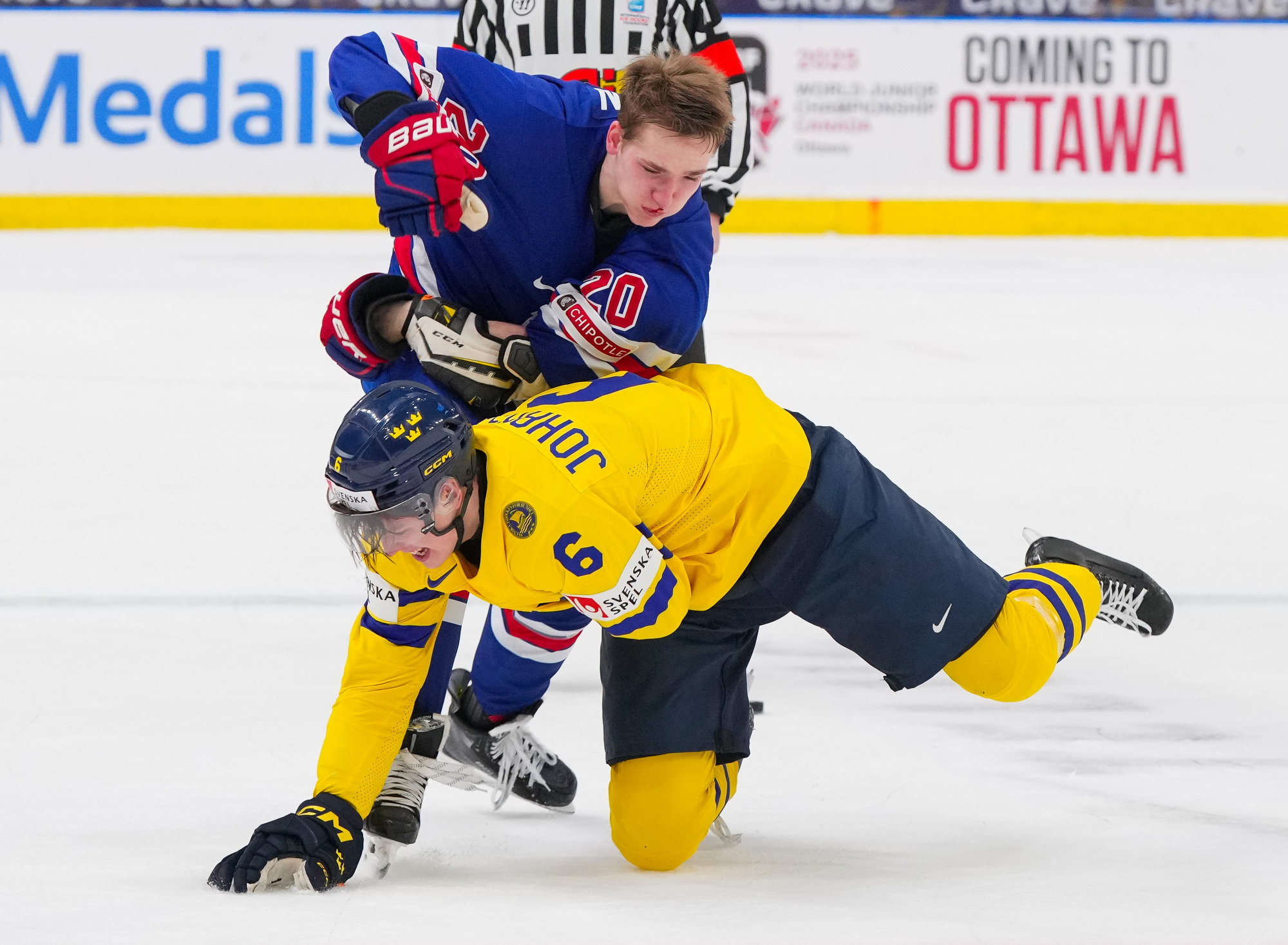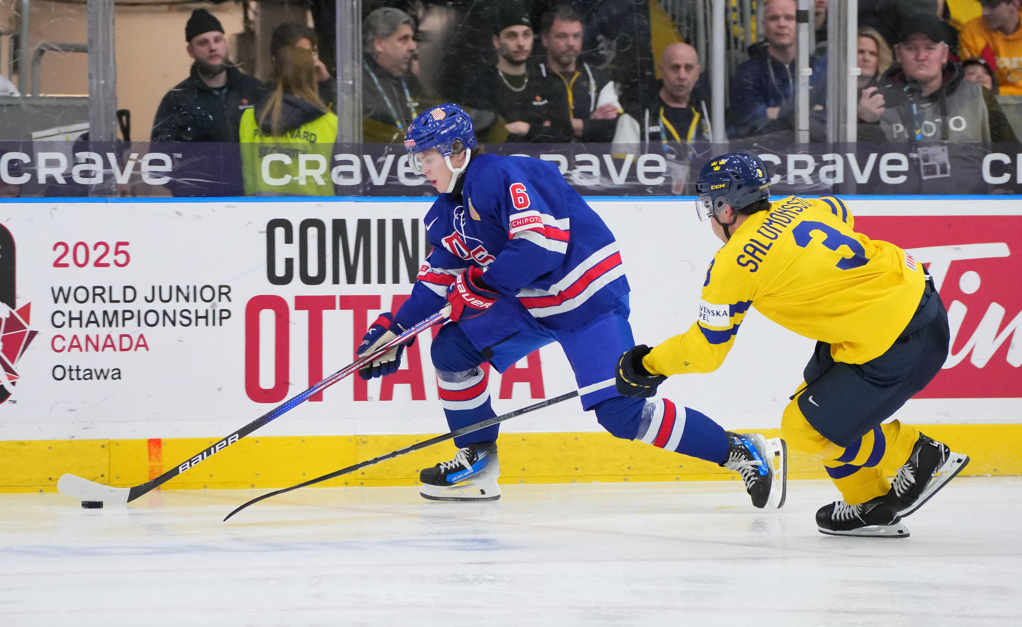 The game started cautiously, but Sweden started to assert itself and had the puck in the U.S. end for several extended stretches, but they misfired too often and ended up not testing Augustine to any great degree. Their best player was Noah Ostlund, who had three terrific chances. But he fired high and wide on the first, didn’t get much wood on a backhand between his legs on the second, and was stopped by Augustine after a great move on the third.