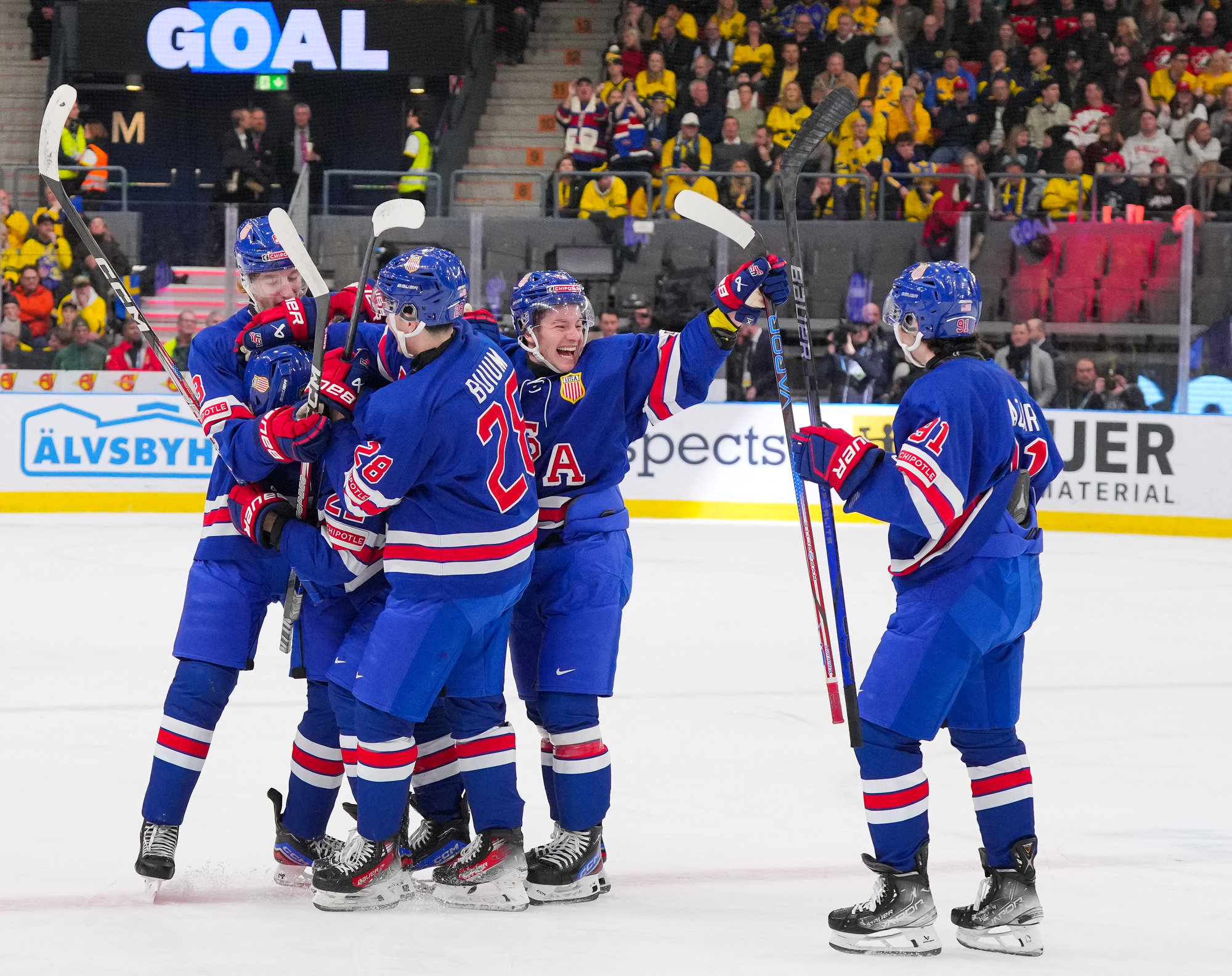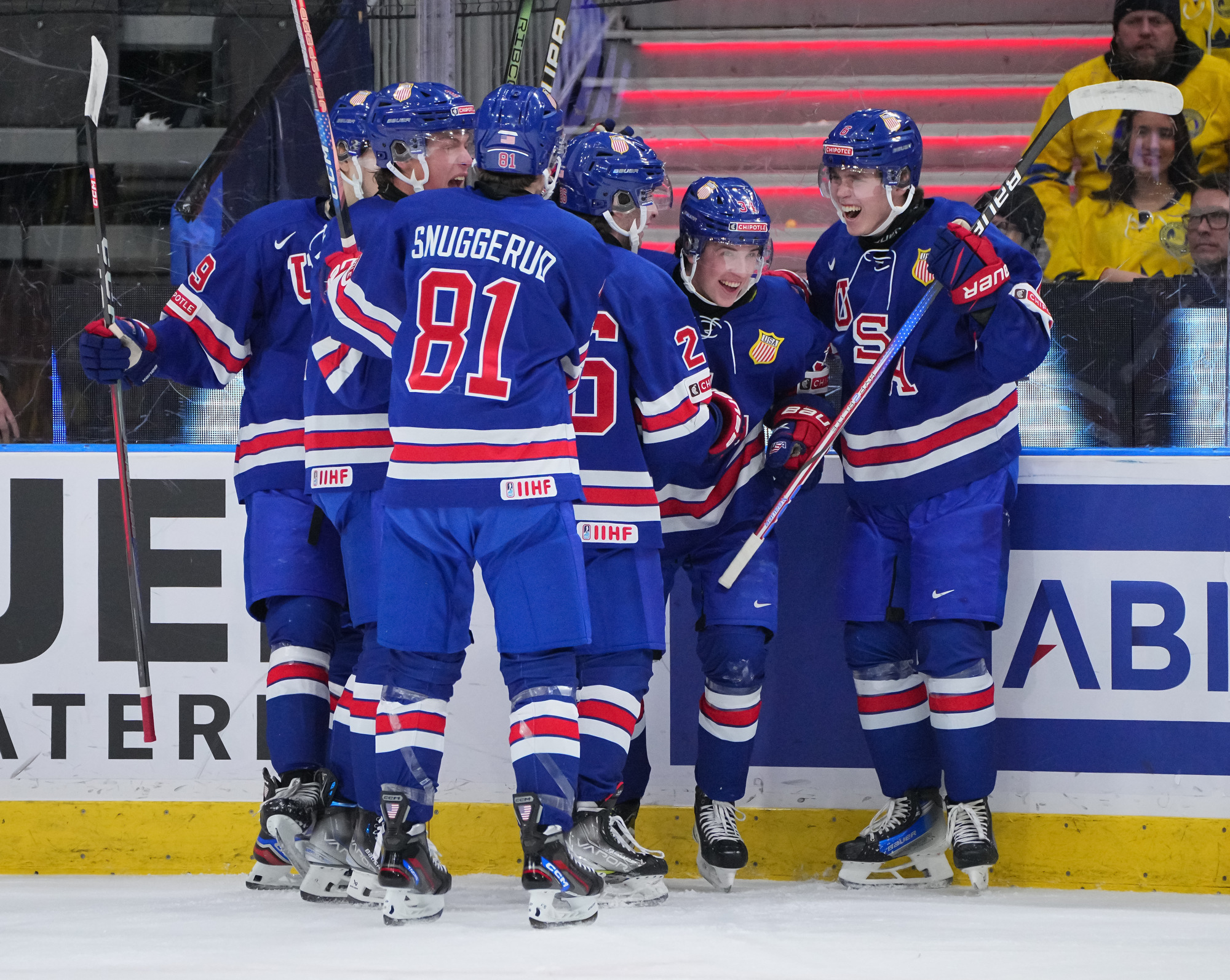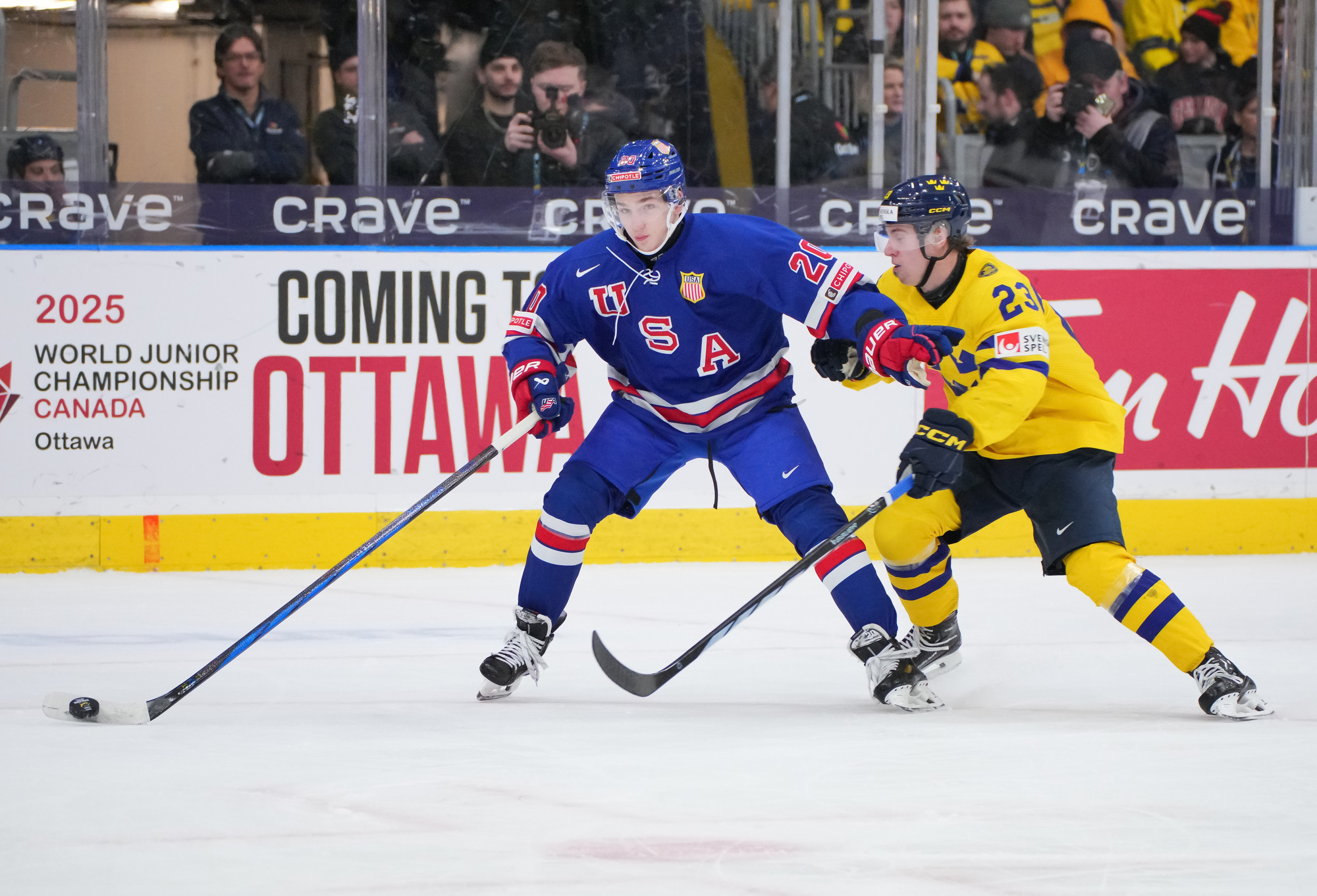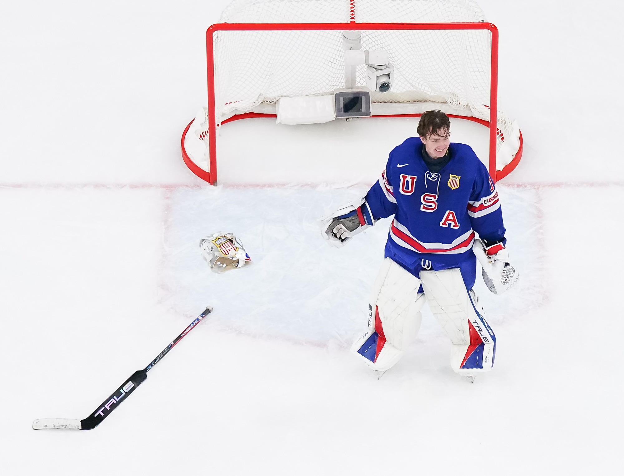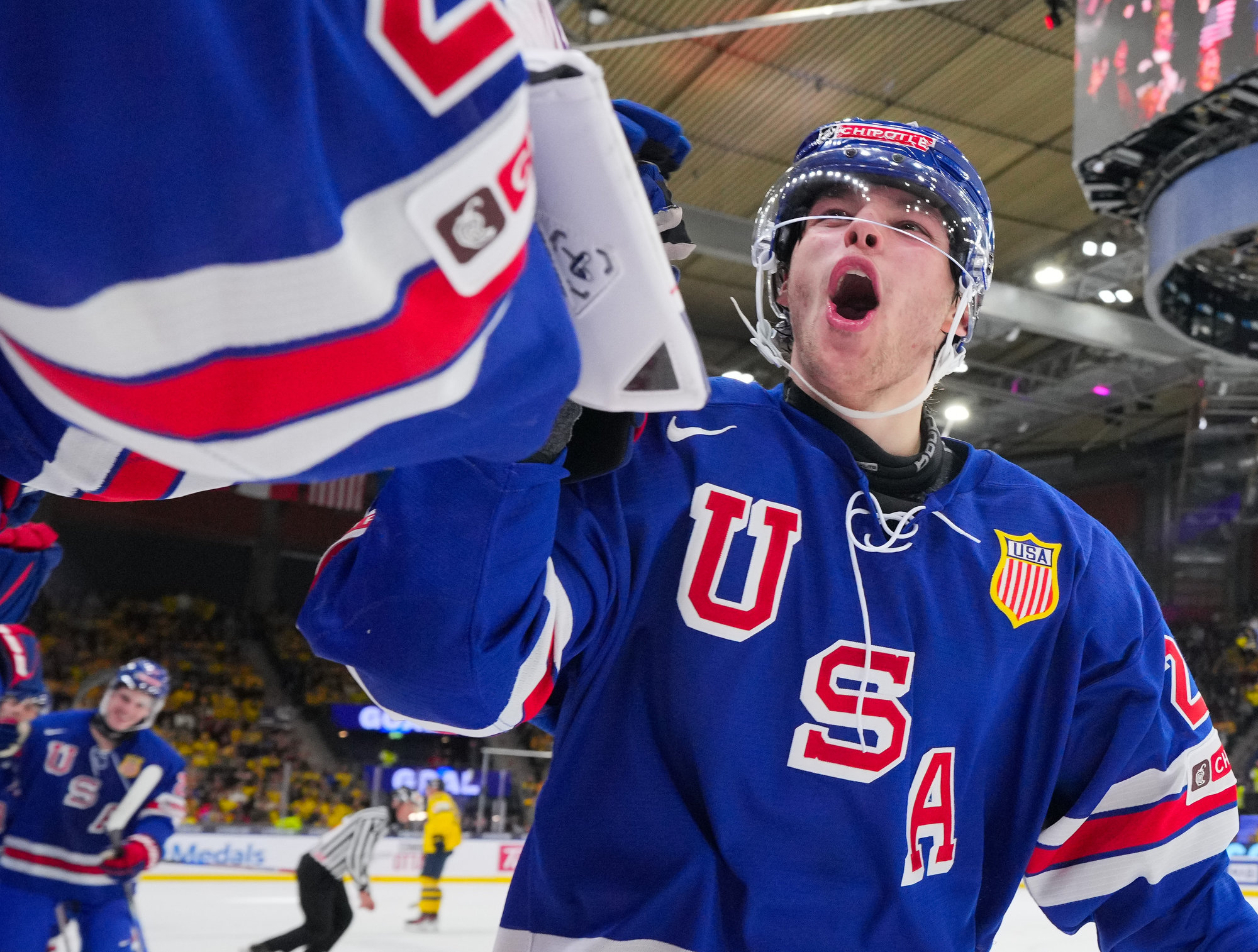 The game started cautiously, but Sweden started to assert itself and had the puck in the U.S. end for several extended stretches, but they misfired too often and ended up not testing Augustine to any great degree. Their best player was Noah Ostlund, who had three terrific chances. But he fired high and wide on the first, didn’t get much wood on a backhand between his legs on the second, and was stopped by Augustine after a great move on the third.