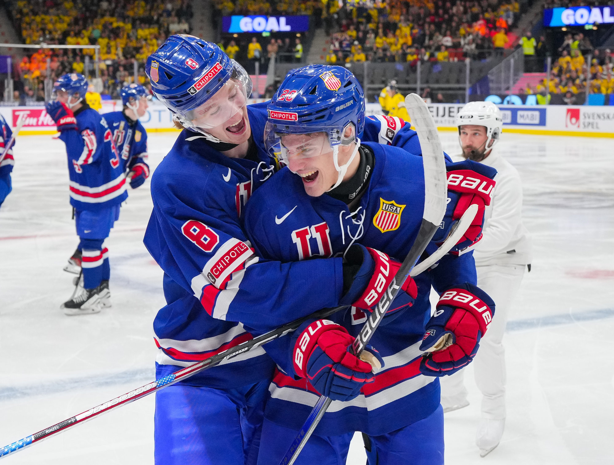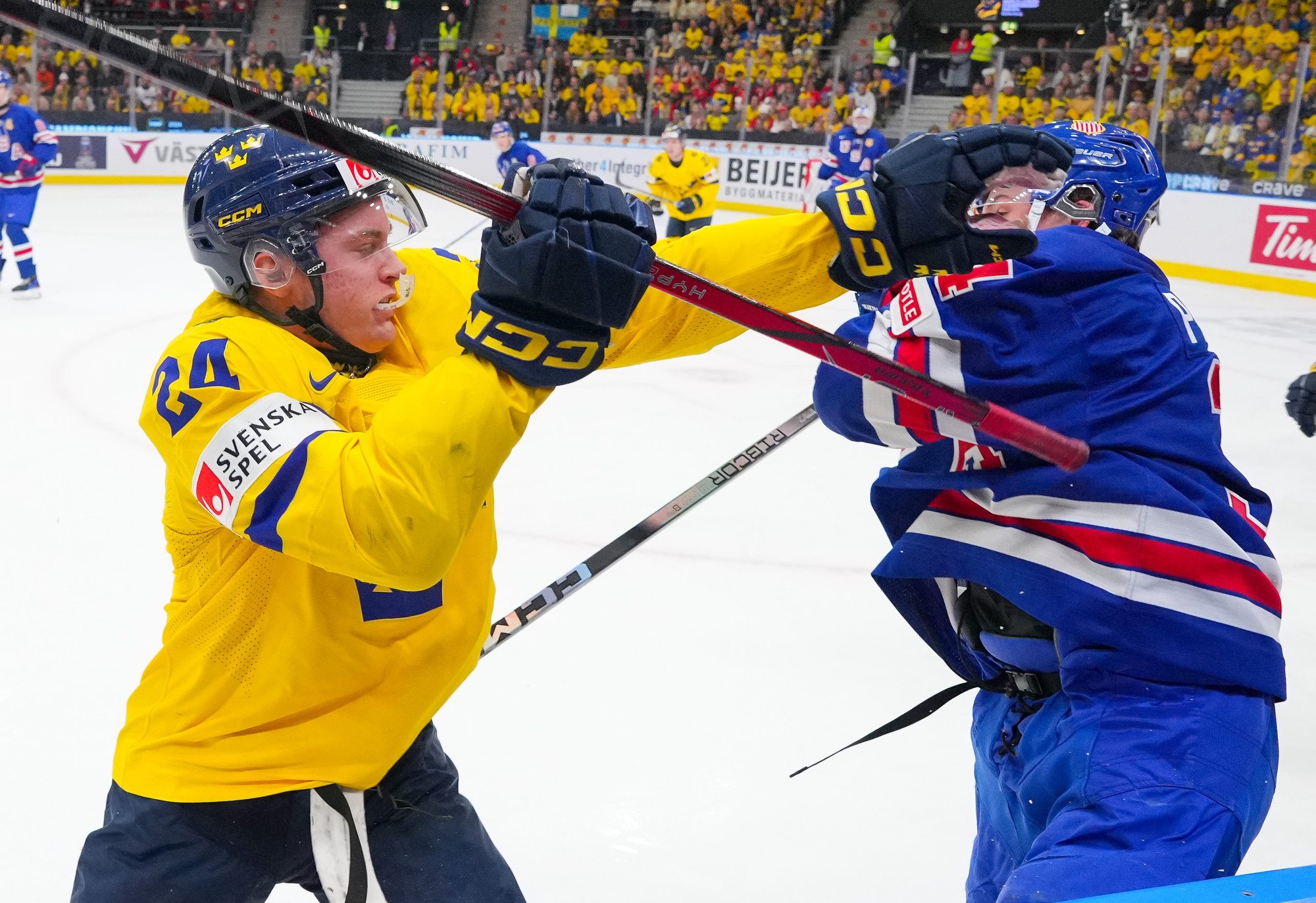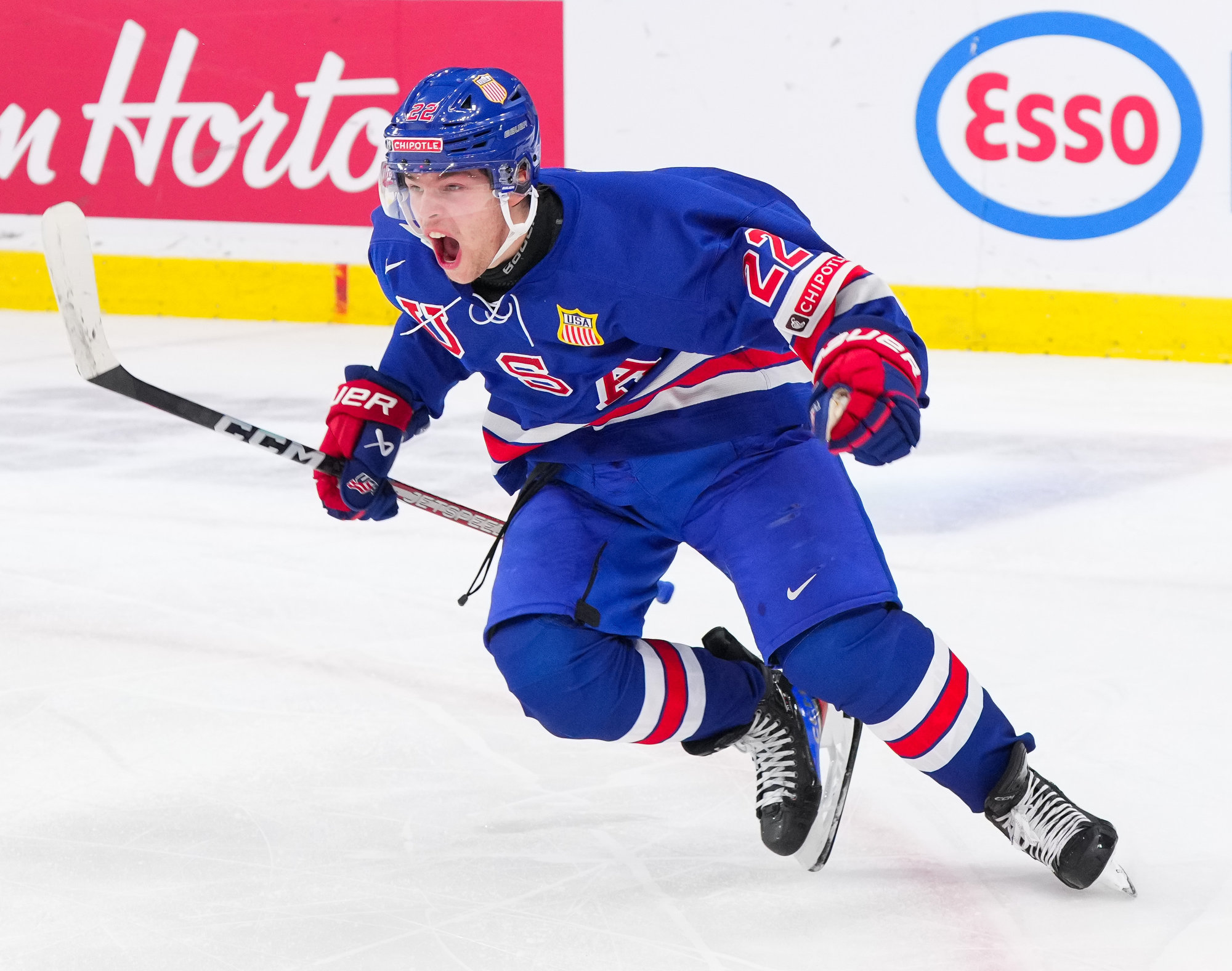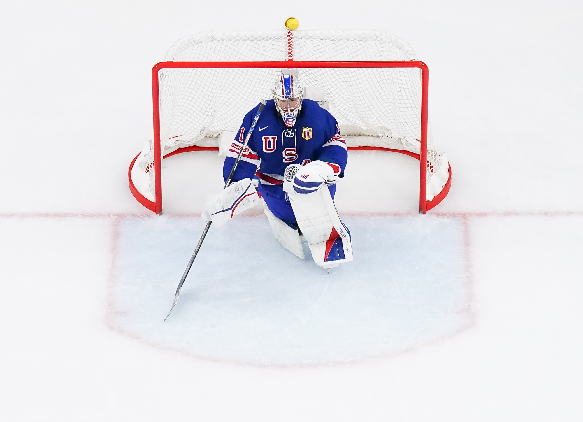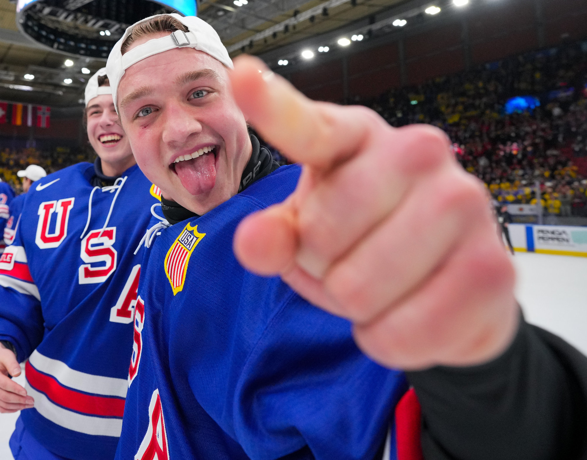 The game started cautiously, but Sweden started to assert itself and had the puck in the U.S. end for several extended stretches, but they misfired too often and ended up not testing Augustine to any great degree. Their best player was Noah Ostlund, who had three terrific chances. But he fired high and wide on the first, didn’t get much wood on a backhand between his legs on the second, and was stopped by Augustine after a great move on the third.