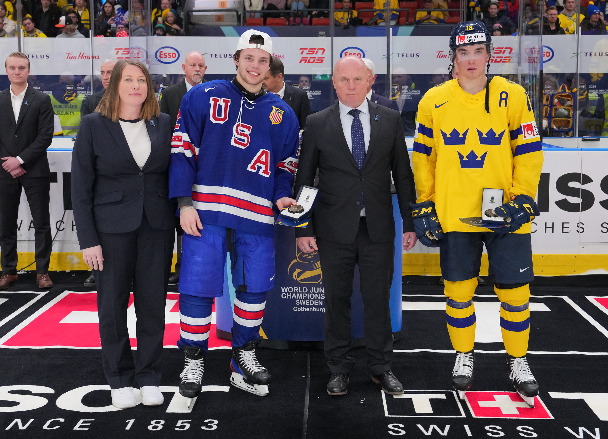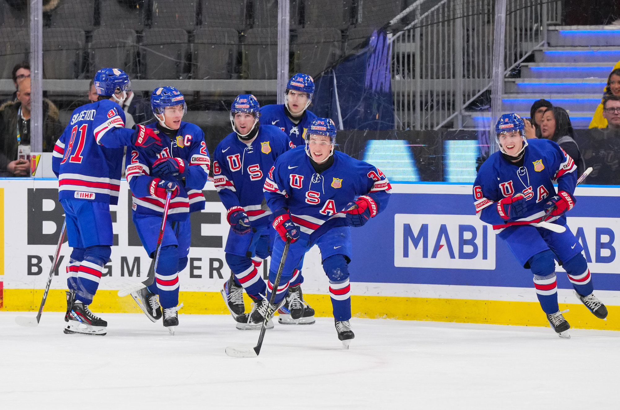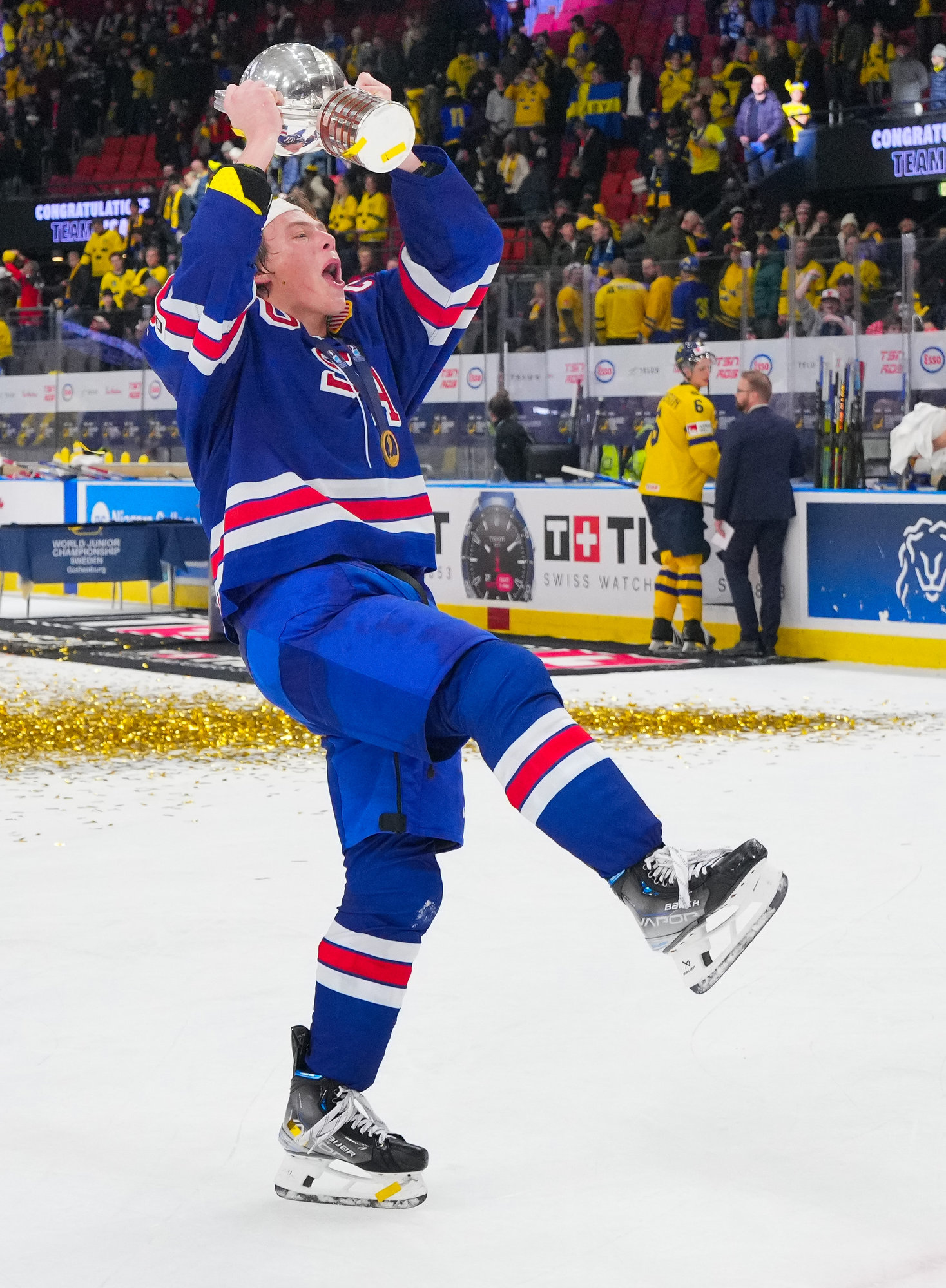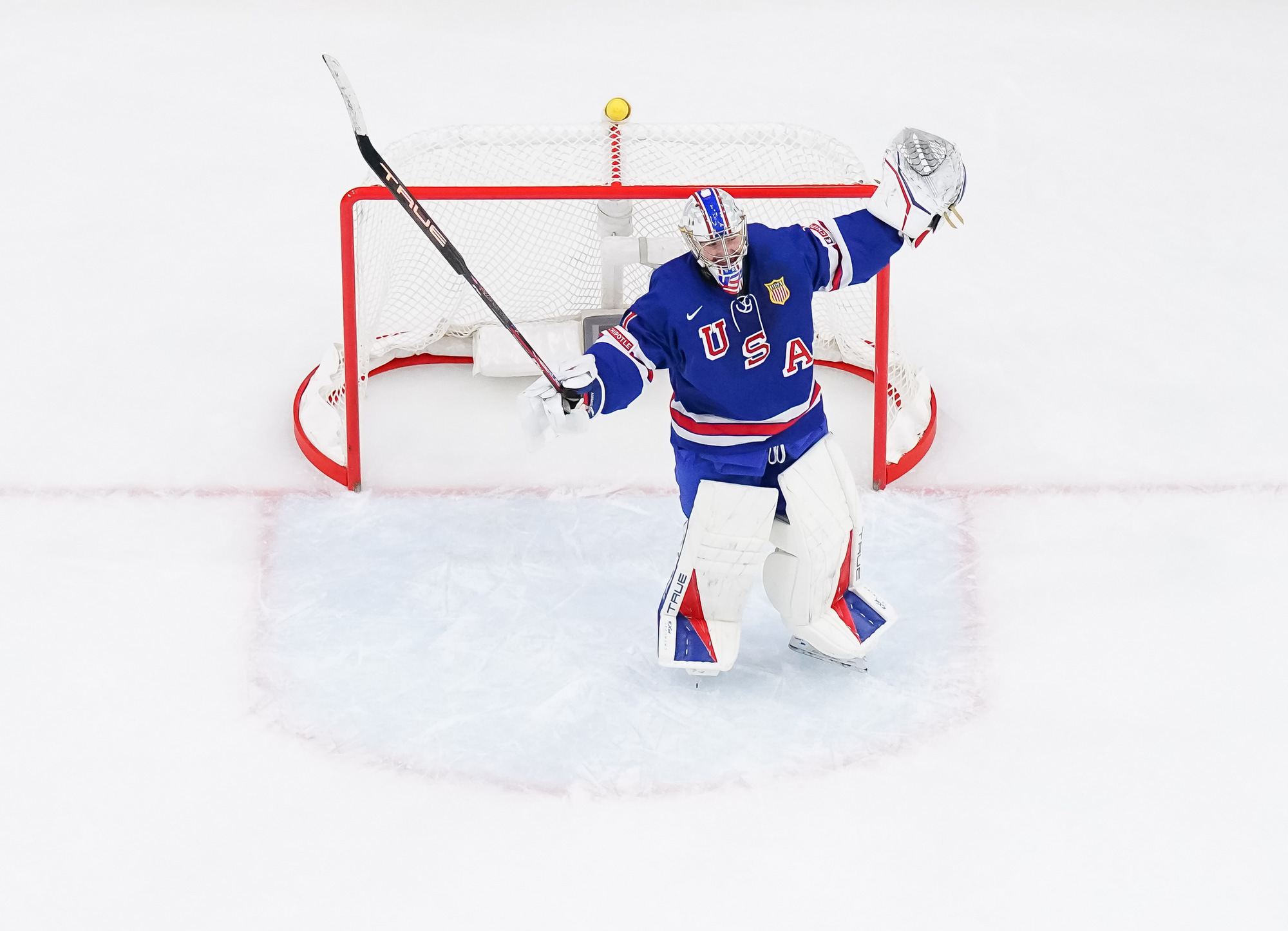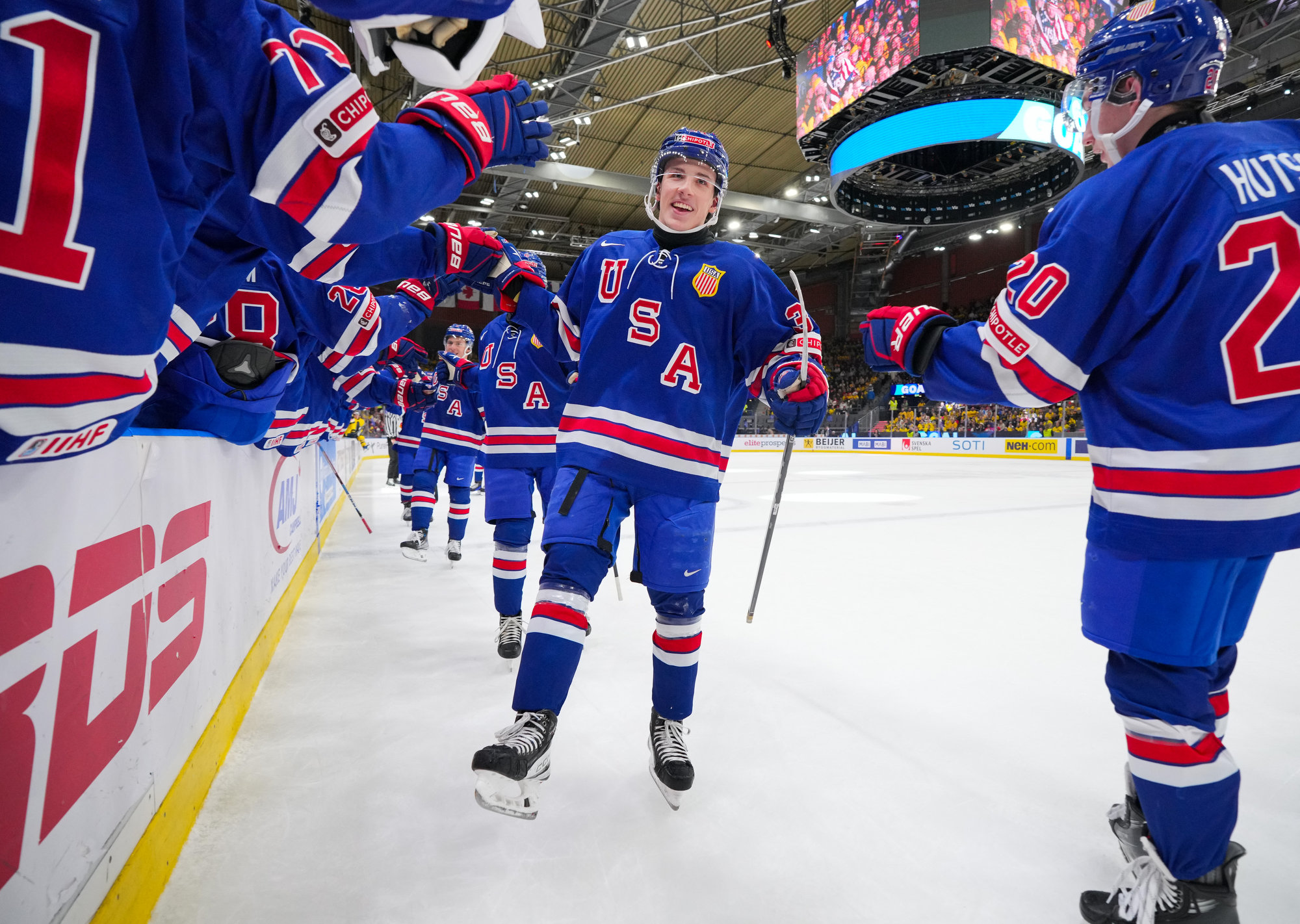The game started cautiously, but Sweden started to assert itself and had the puck in the U.S. end for several extended stretches, but they misfired too often and ended up not testing Augustine to any great degree. Their best player was Noah Ostlund, who had three terrific chances. But he fired high and wide on the first, didn’t get much wood on a backhand between his legs on the second, and was stopped by Augustine after a great move on the third.