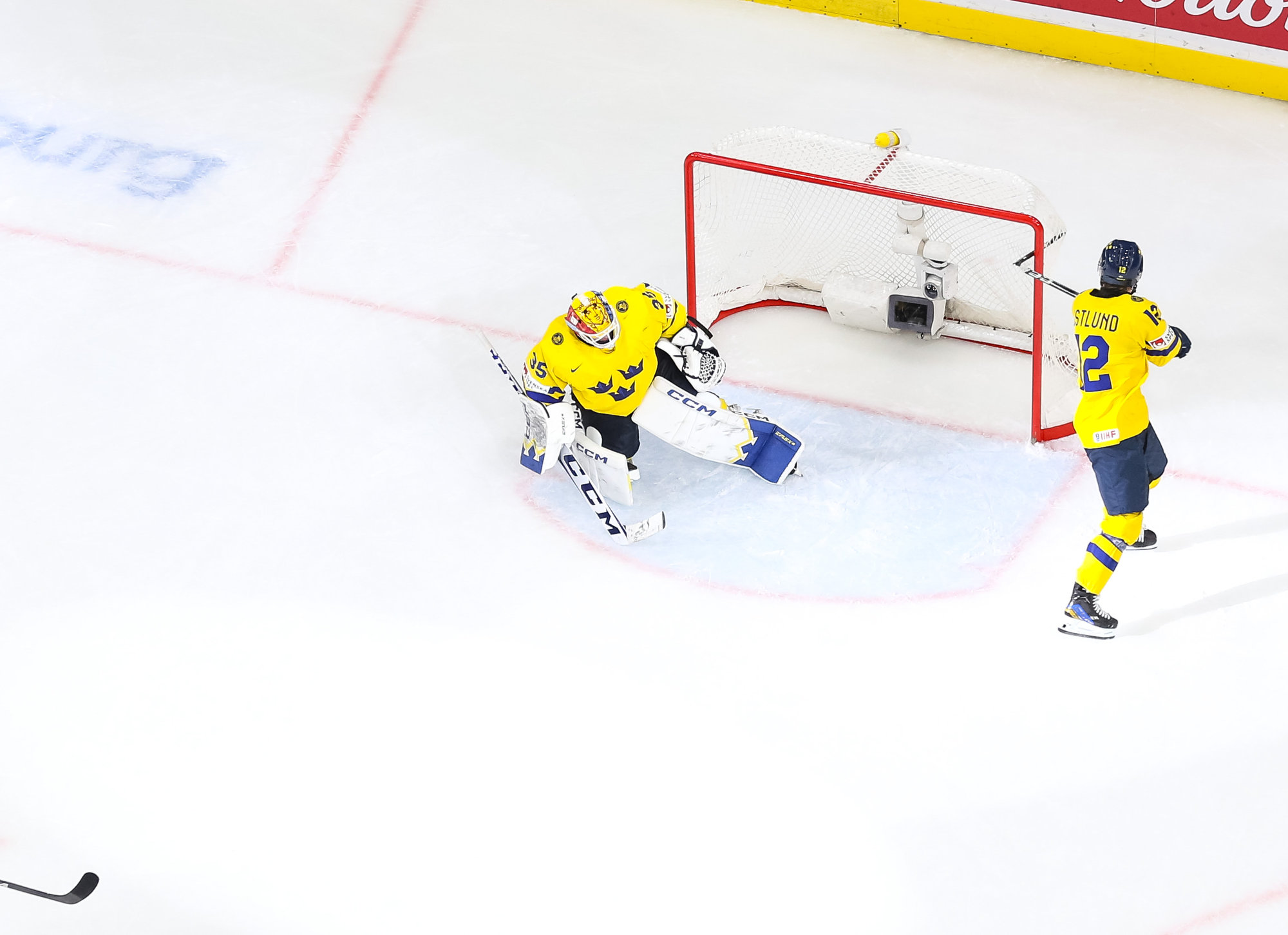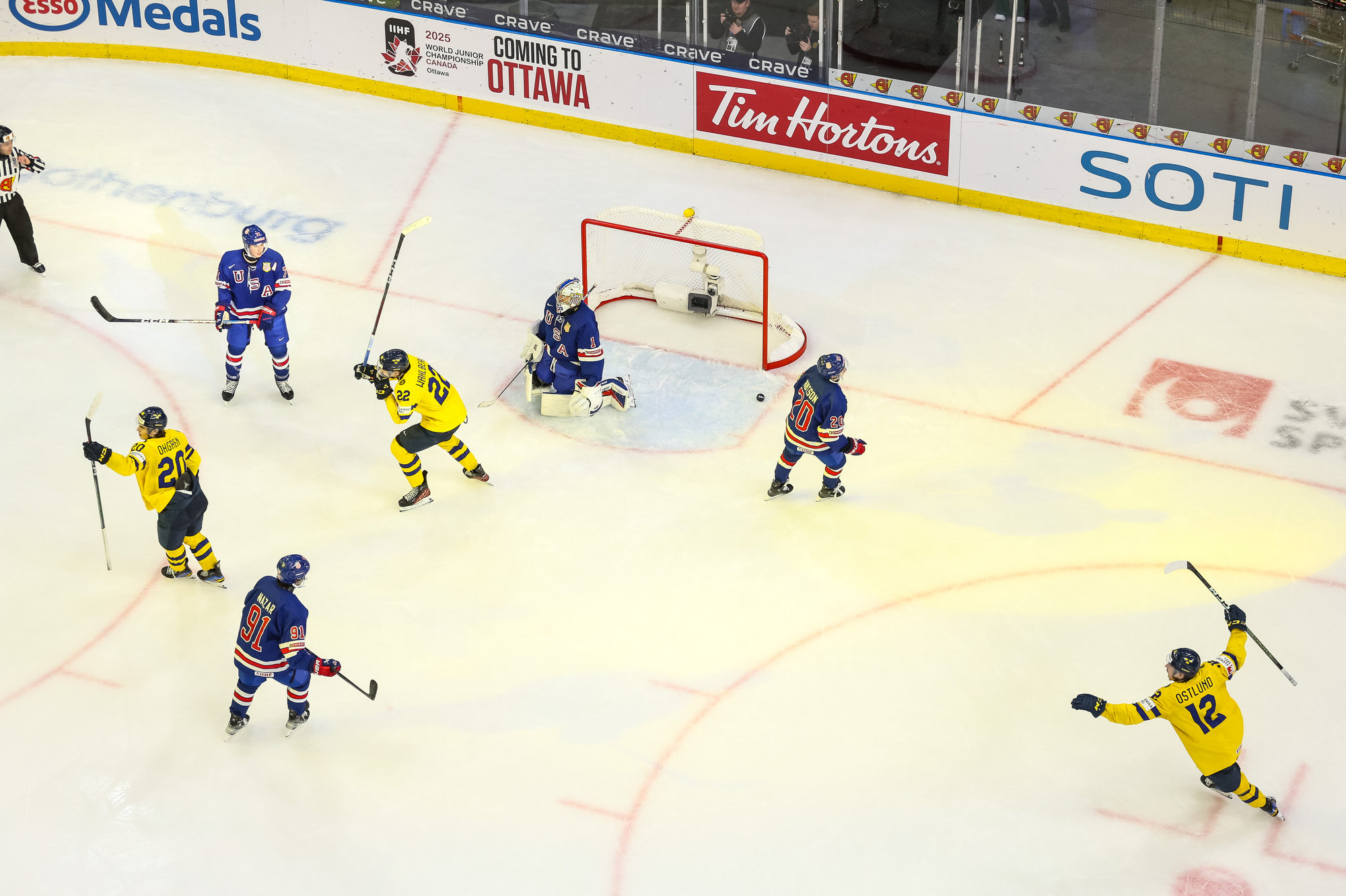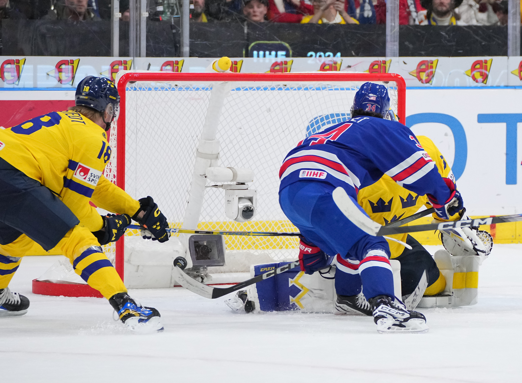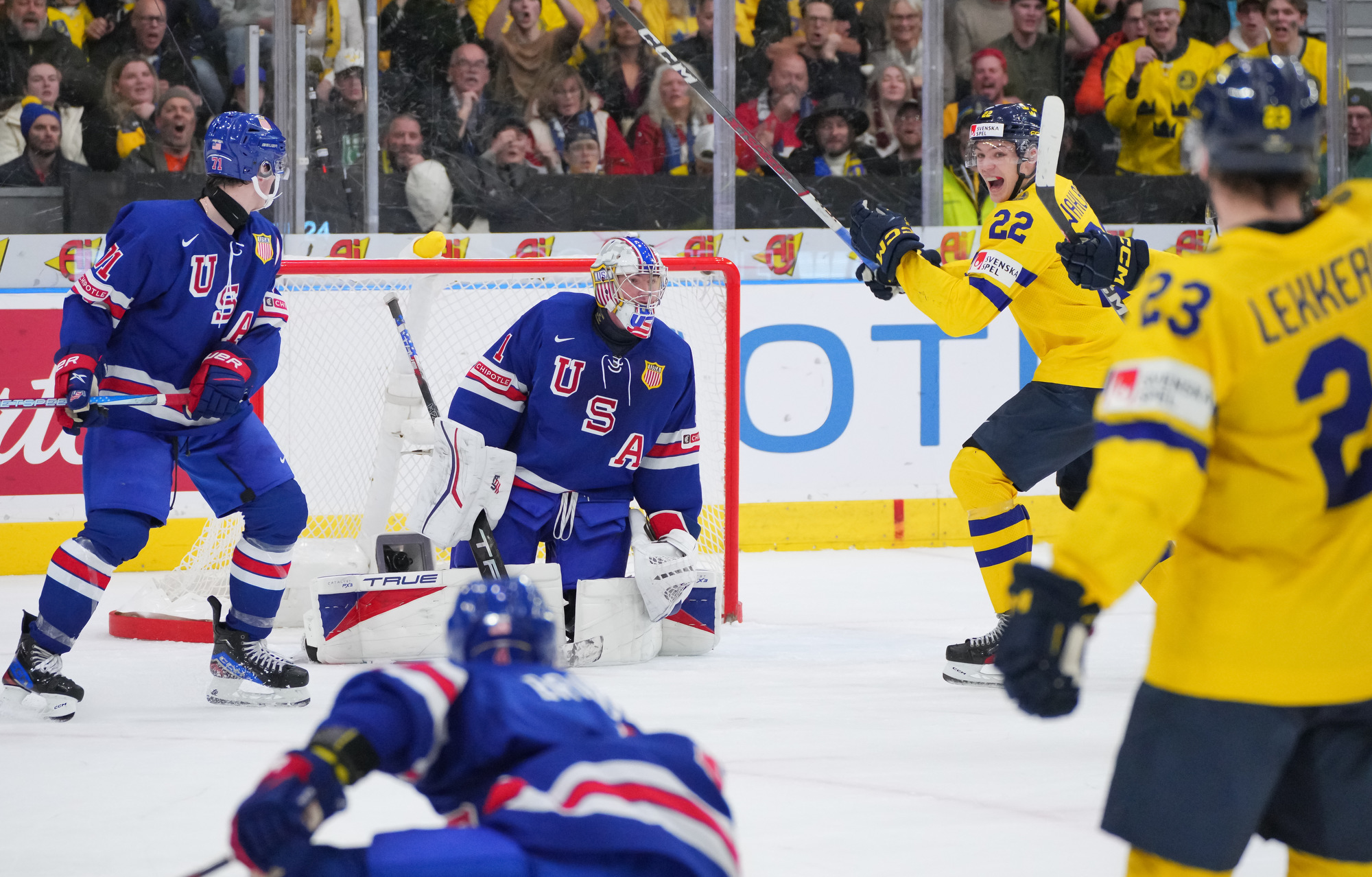 Sweden got a desperately needed goal before the end of the period, though. Working the power play, Jonathan Lekkerimaki blasted a high point shot past Augustine with only 5.2 seconds left on the clock, a motivating goal if ever there was one.
