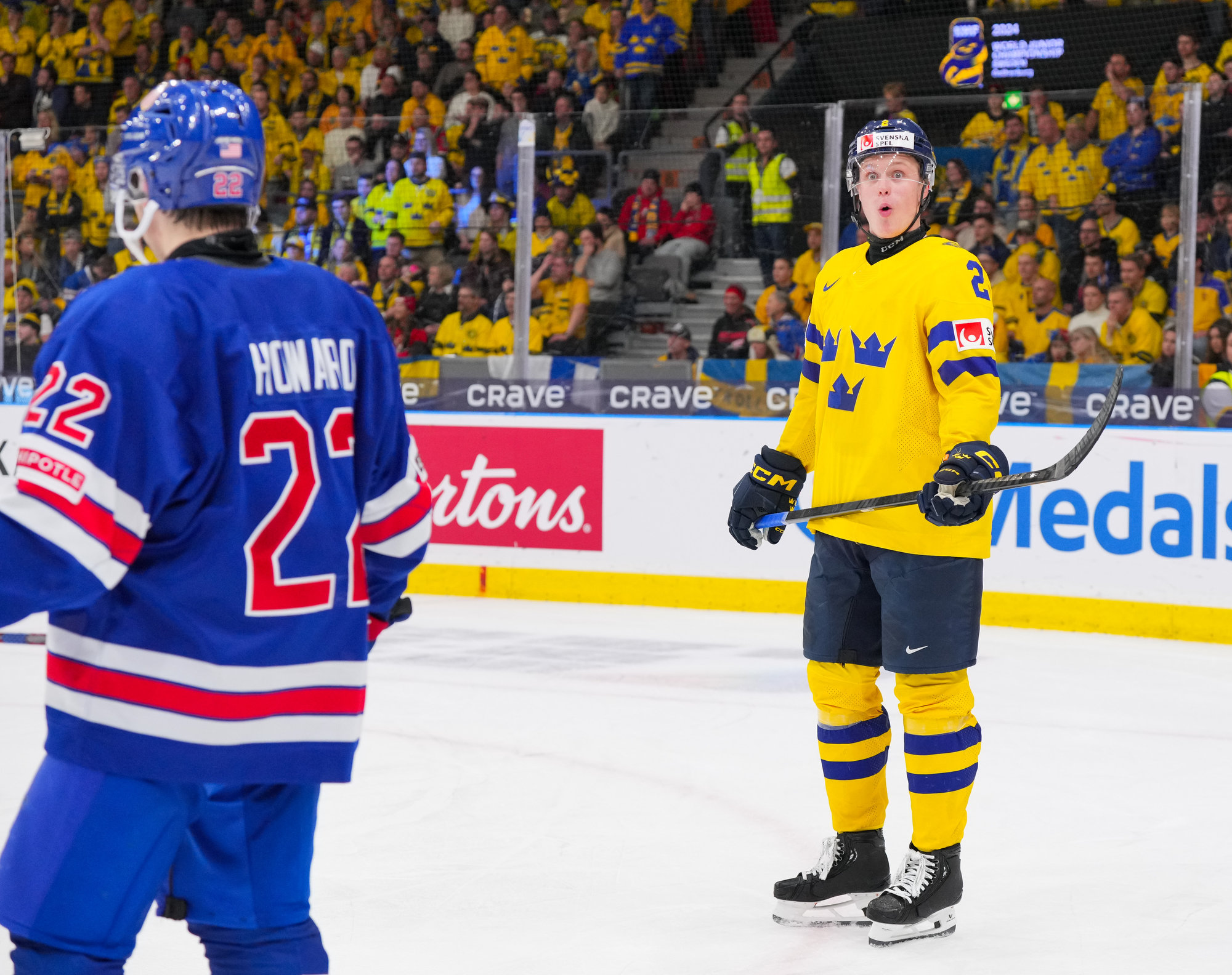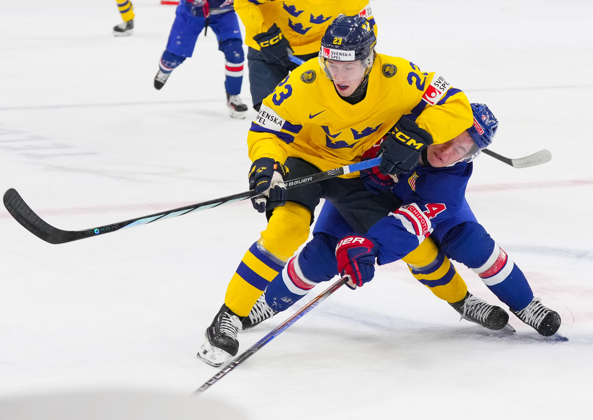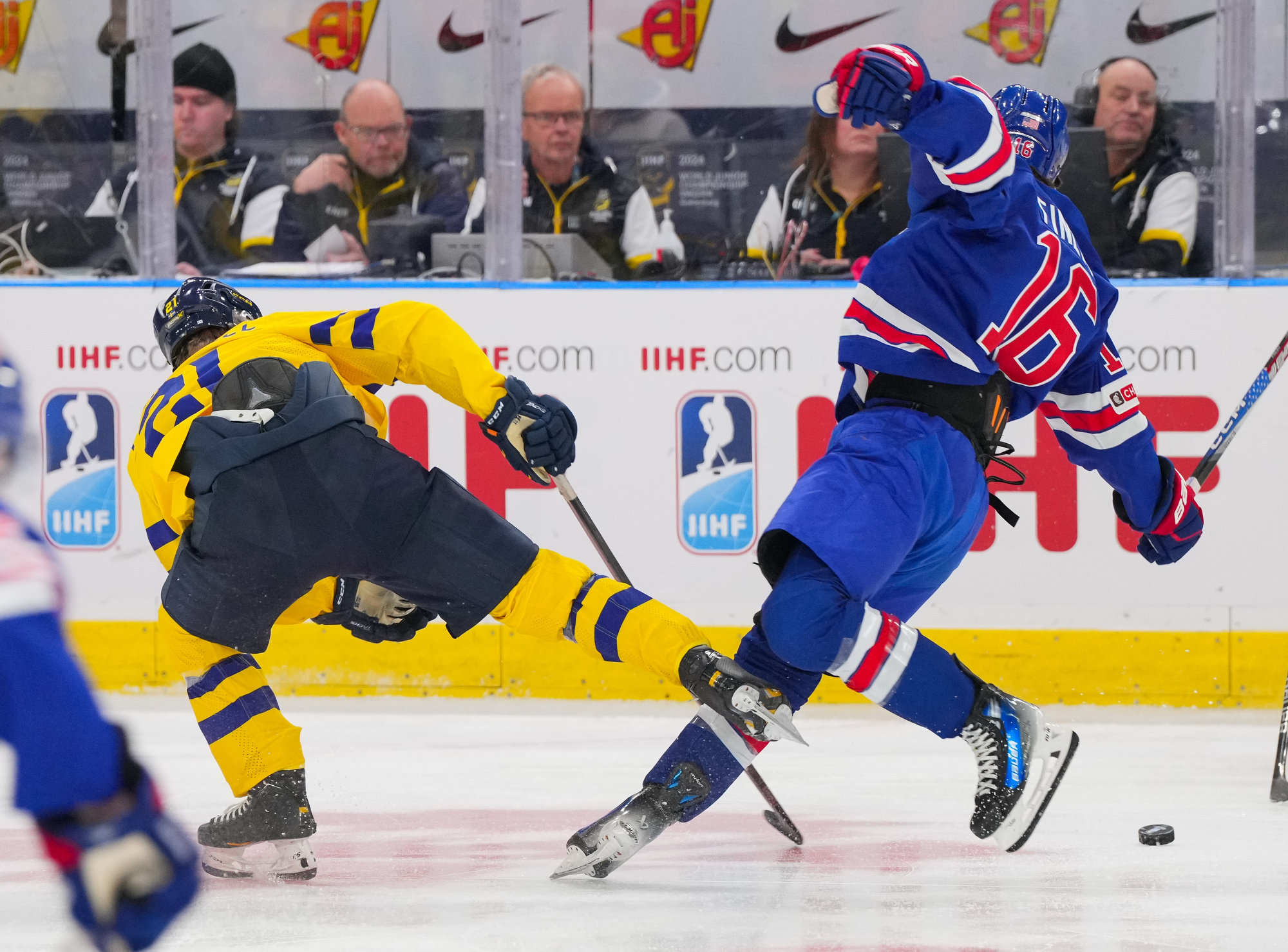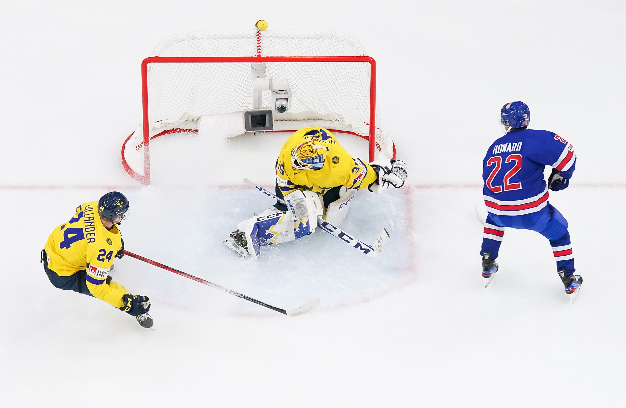 The Americans were utterly brilliant on the counter-attack, springing a man as soon as they got possession in their own end. Will Smith created a partial breakaway through speed and hard work, but he shot wide. But on another counter, Isaac Howard corralled a clearing along the boards when a Swedish defender had turned the wrong way. Howard went in alone and slid the puck between Havelid’s pads at 9:24 to restore the Americans’ lead.
