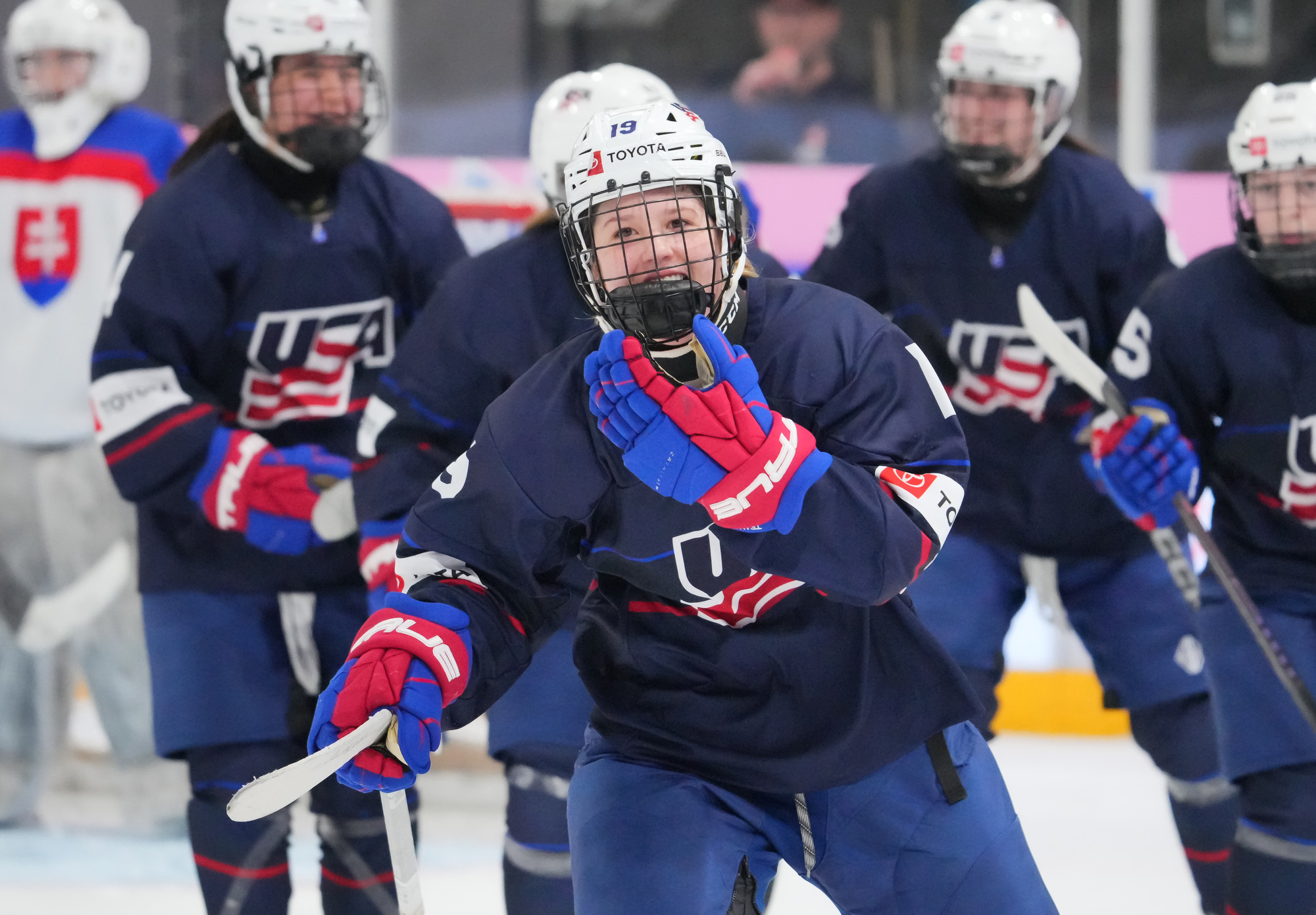 The U.S. racked up six third-period goals to defeat gutsy Slovakia 7-1 in its opener on Sunday. Captain Maggie Scannell scored the go-ahead goal 32 seconds into the final frame.