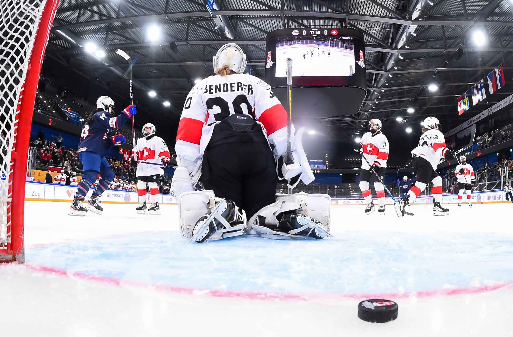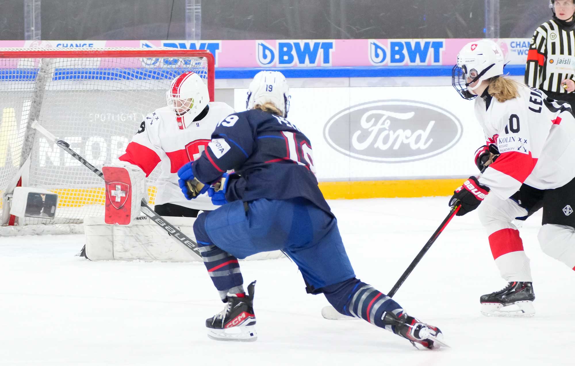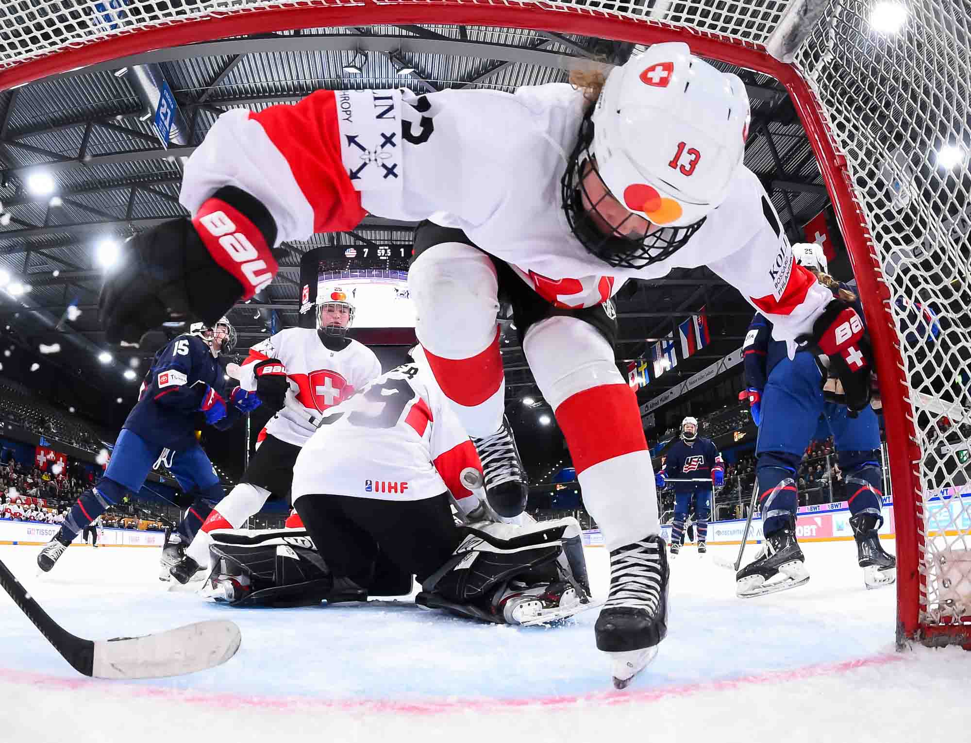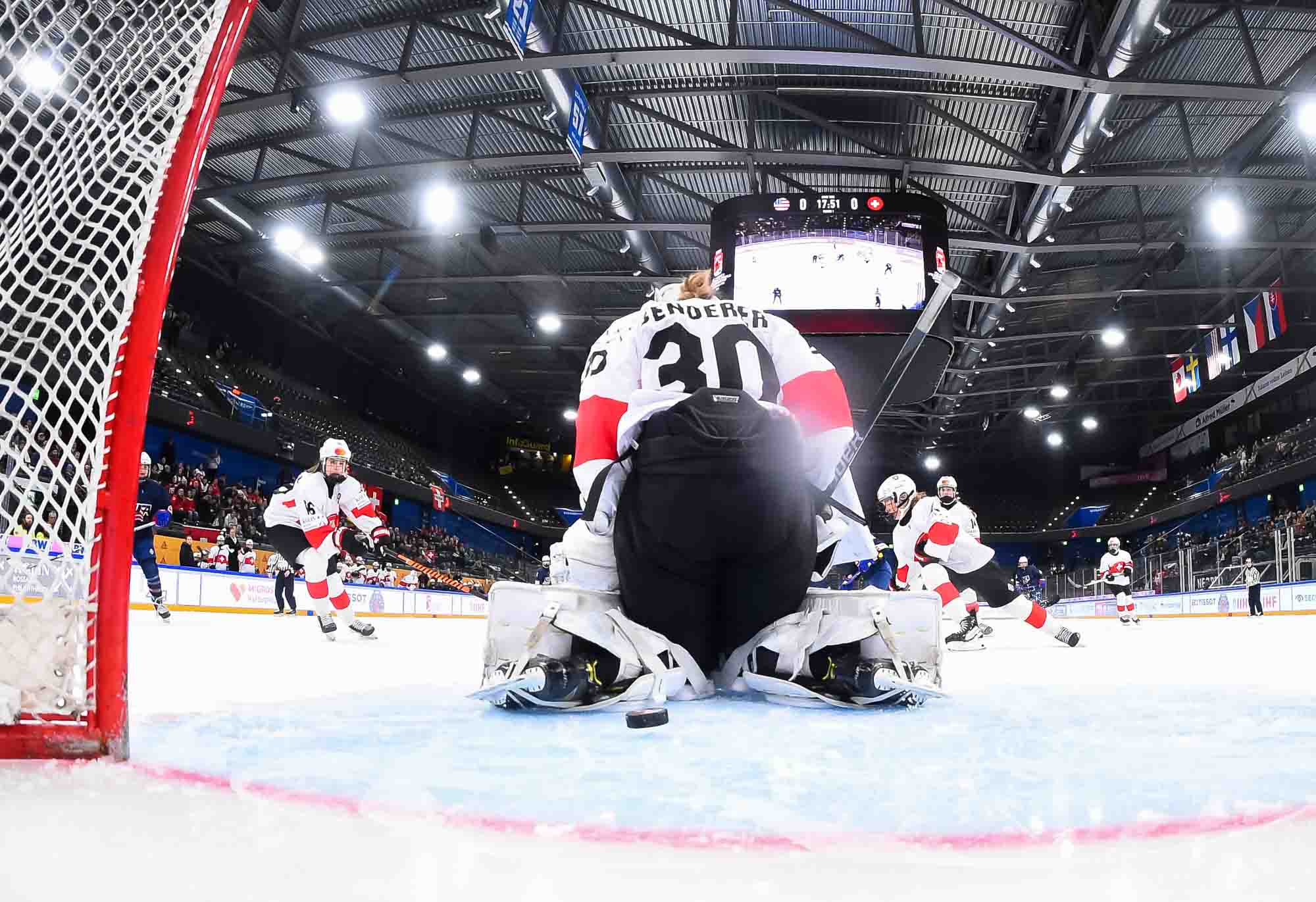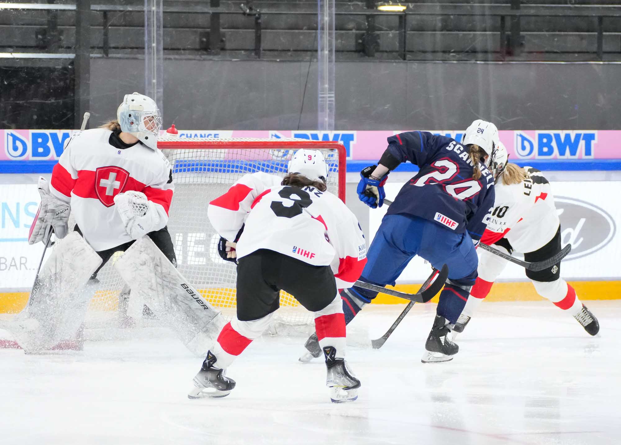 During Switzerland’s first power play, assistant captain Ivana Wey rang one off the post, the closest the hosts would come to getting on the board in the opening stanza.