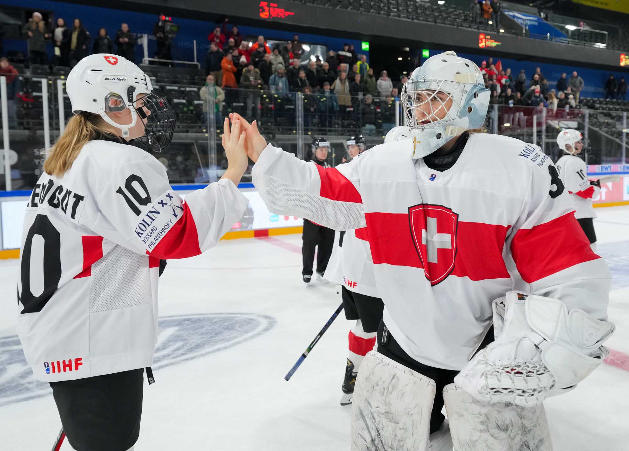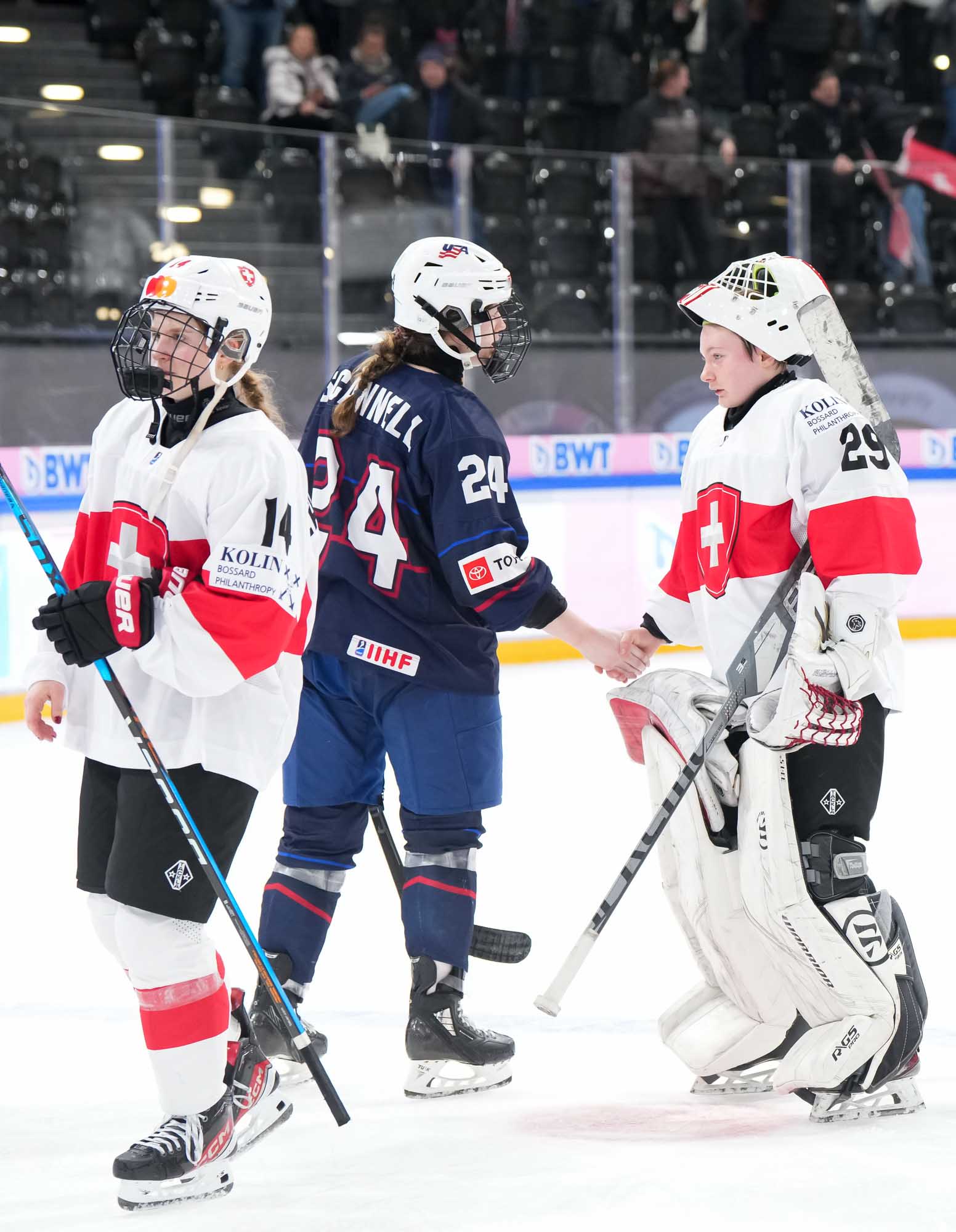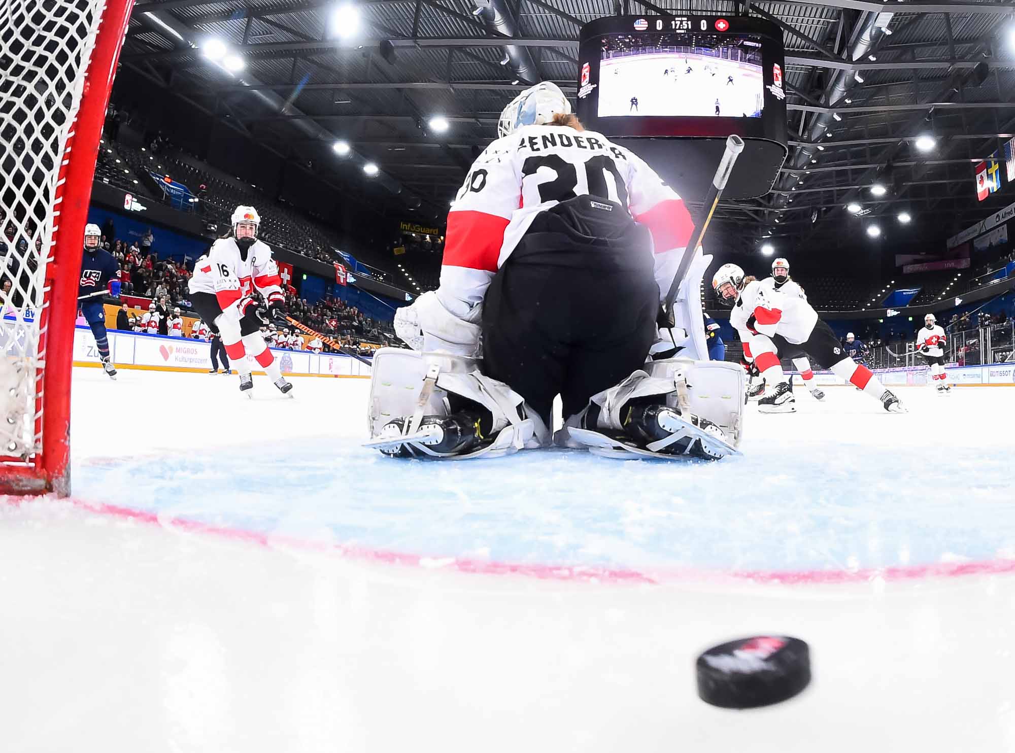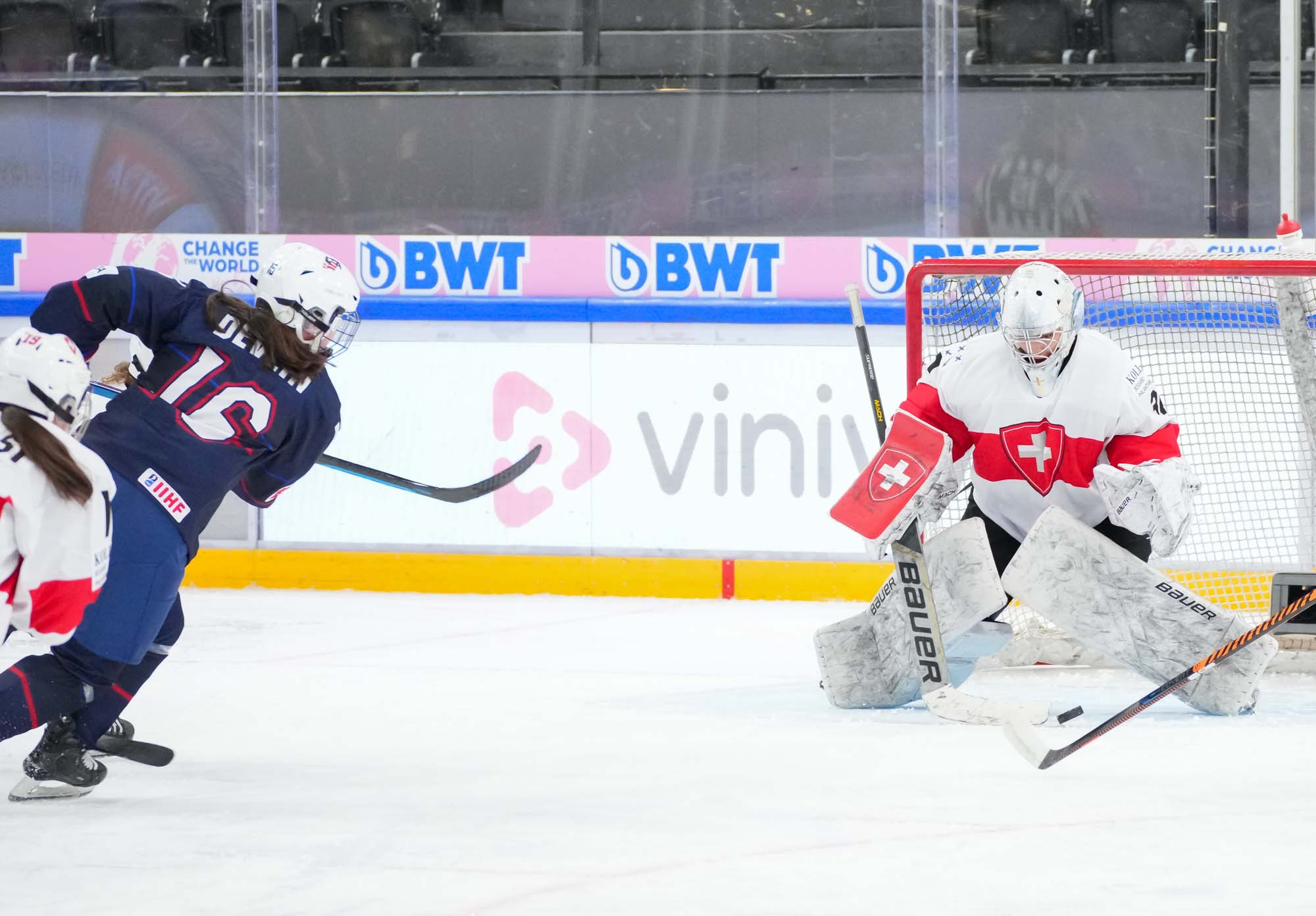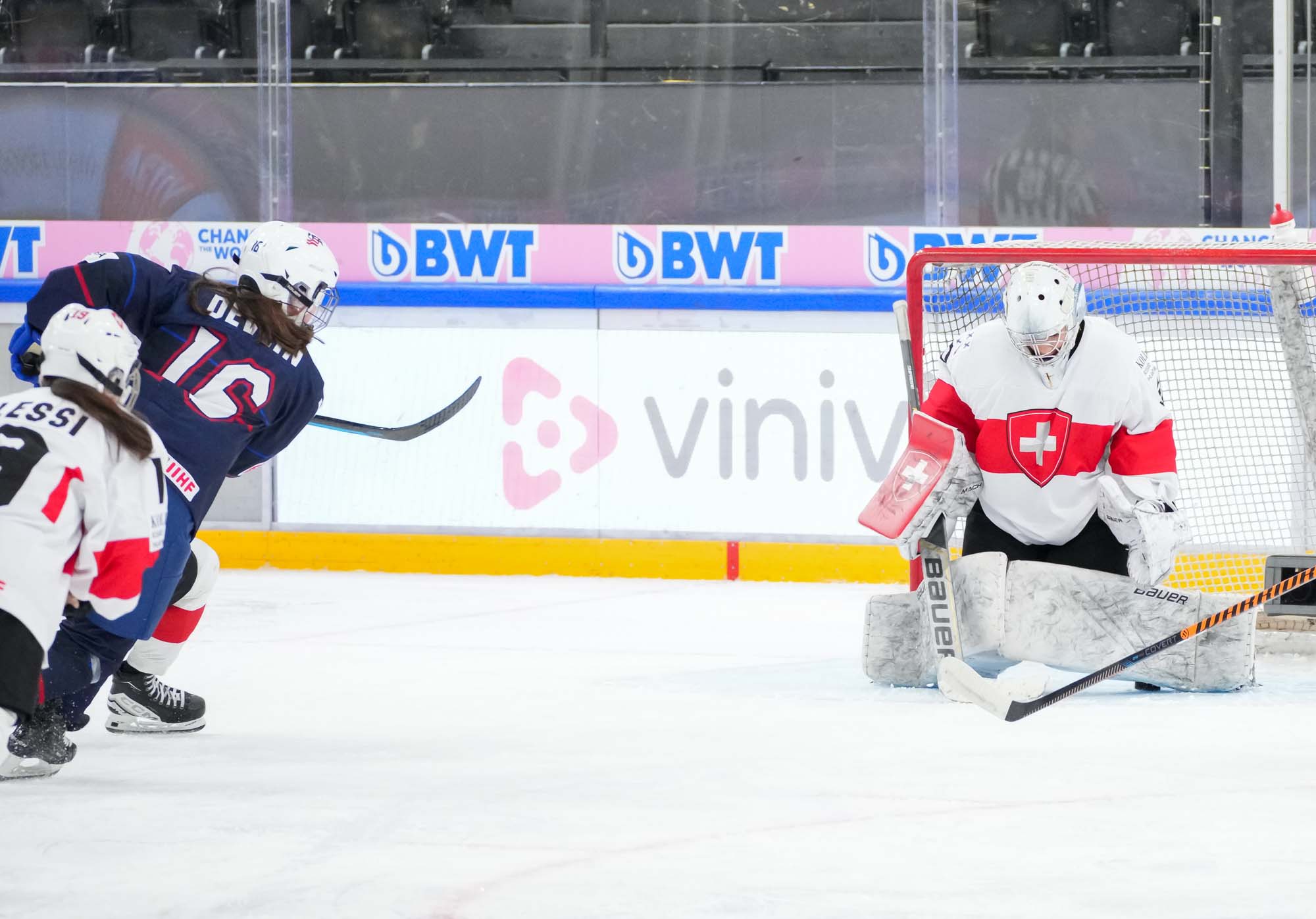 During Switzerland’s first power play, assistant captain Ivana Wey rang one off the post, the closest the hosts would come to getting on the board in the opening stanza.