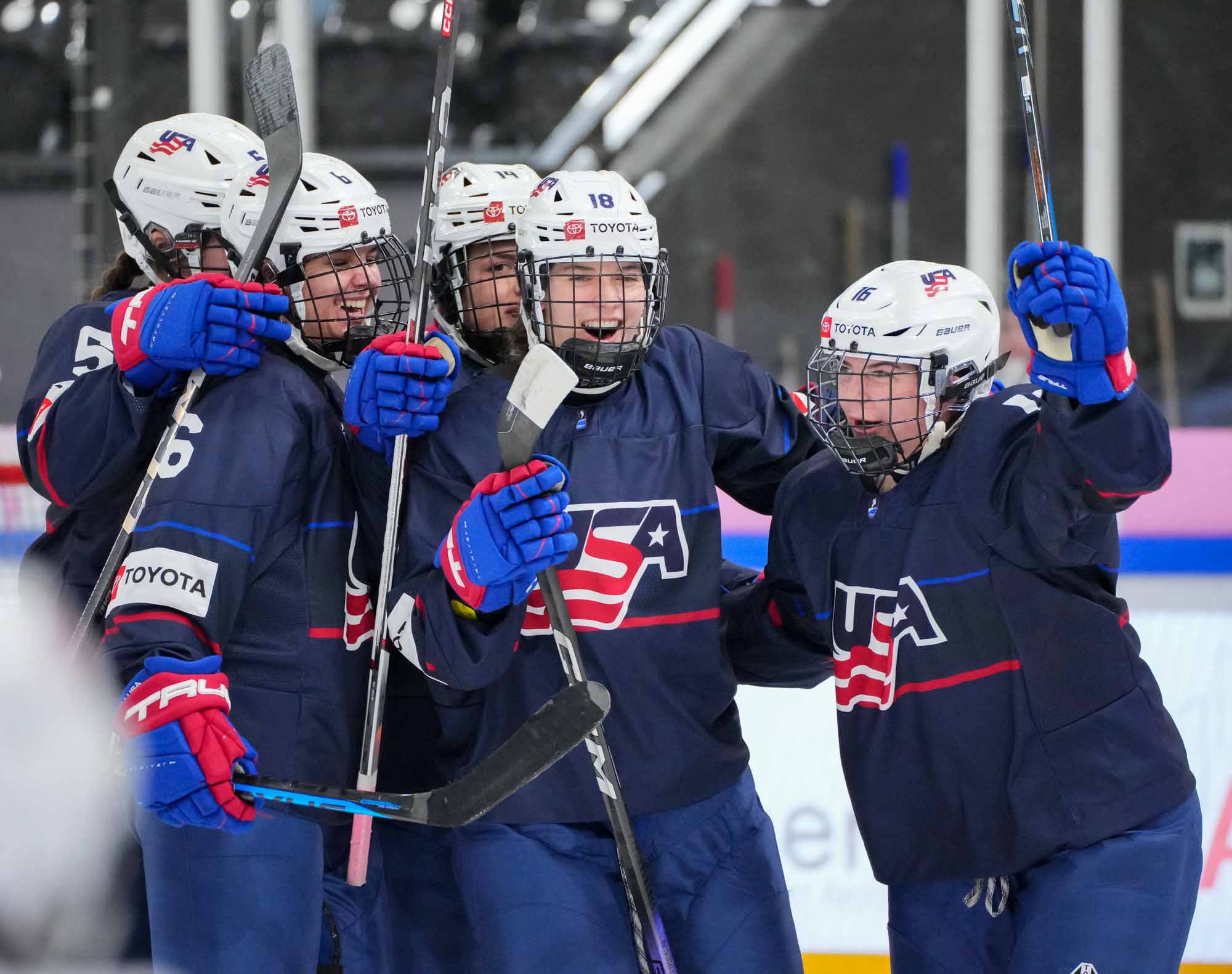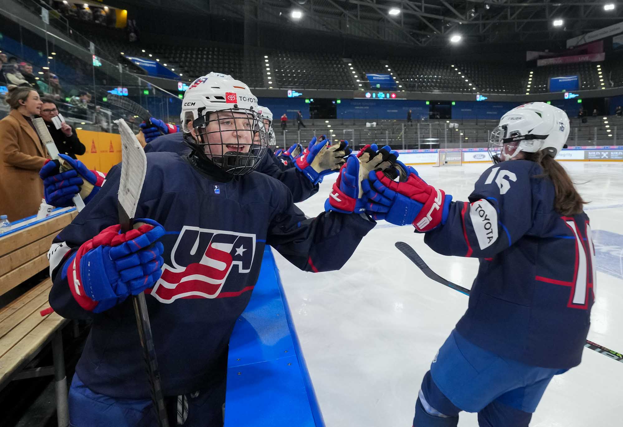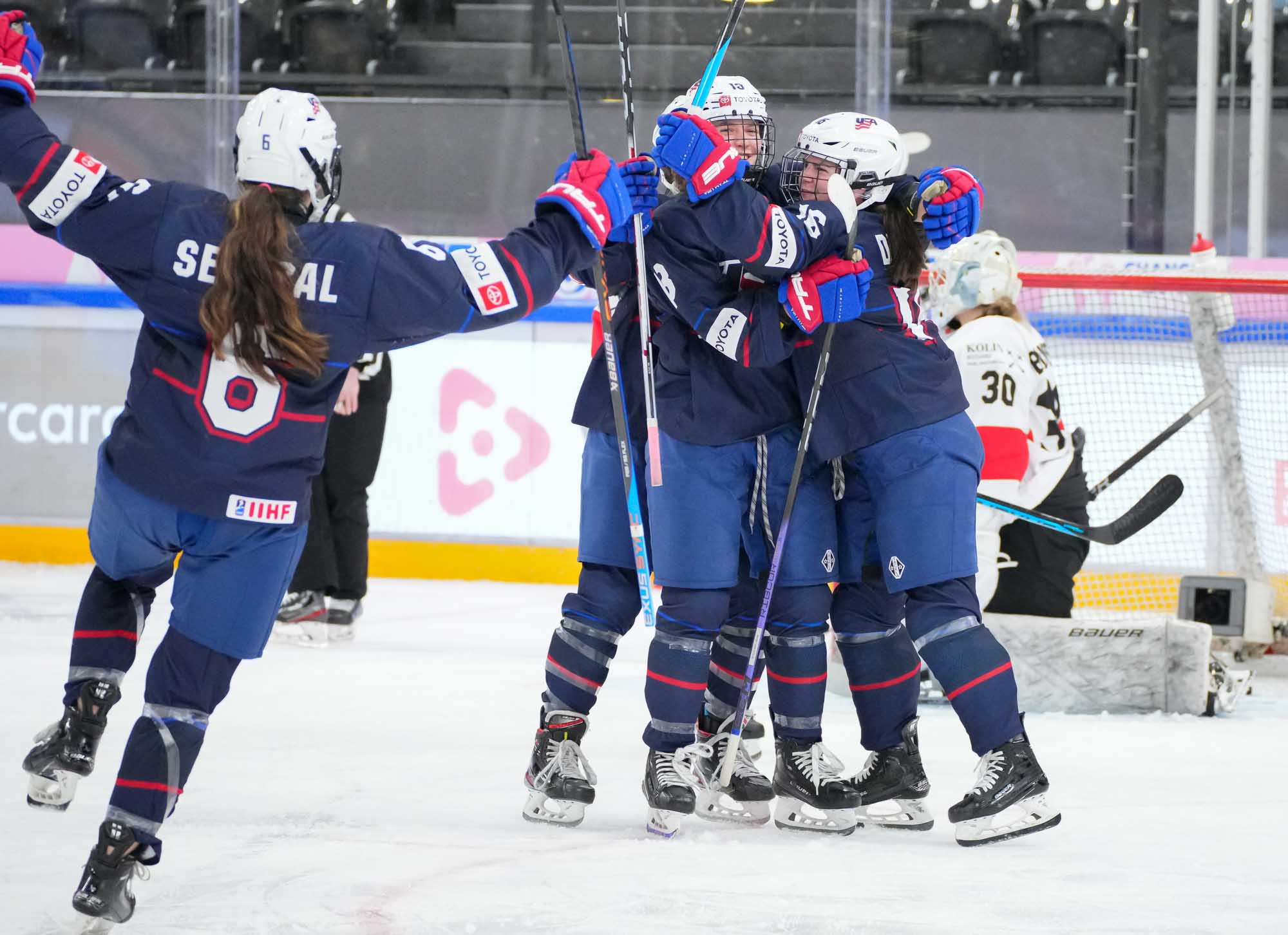 The U.S. celebrates after Alanna Devlin's opening goal against Switzerland in an 8-1 win at the 2024 IIHF Ice Hockey U18 Women's World Championship.