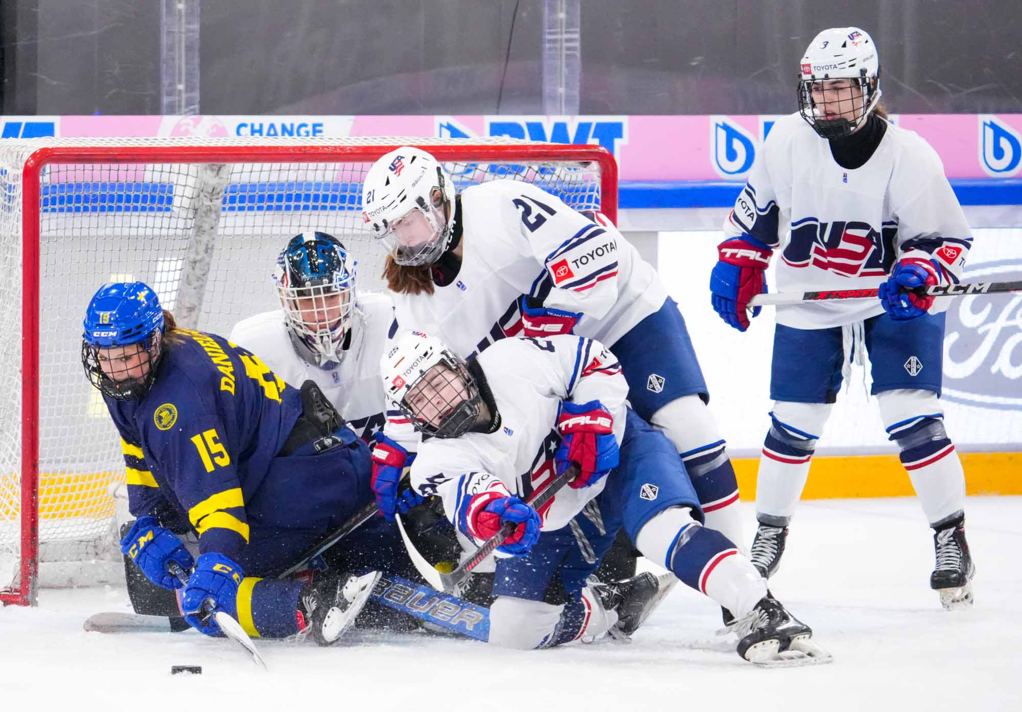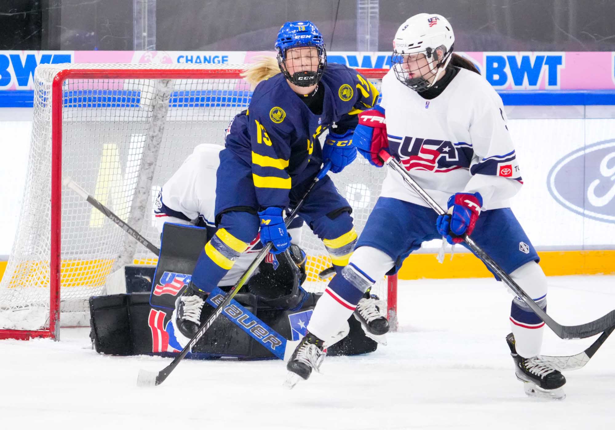 Kassidy Carmichael put the game out of reach with a high glove-side snipe at 18:03. Tempers began to flare now, and a shoving match sent the U.S.'s Macy Rasmussen and Sweden's Emilia Bergby Hallbeck off with coincidental minors.